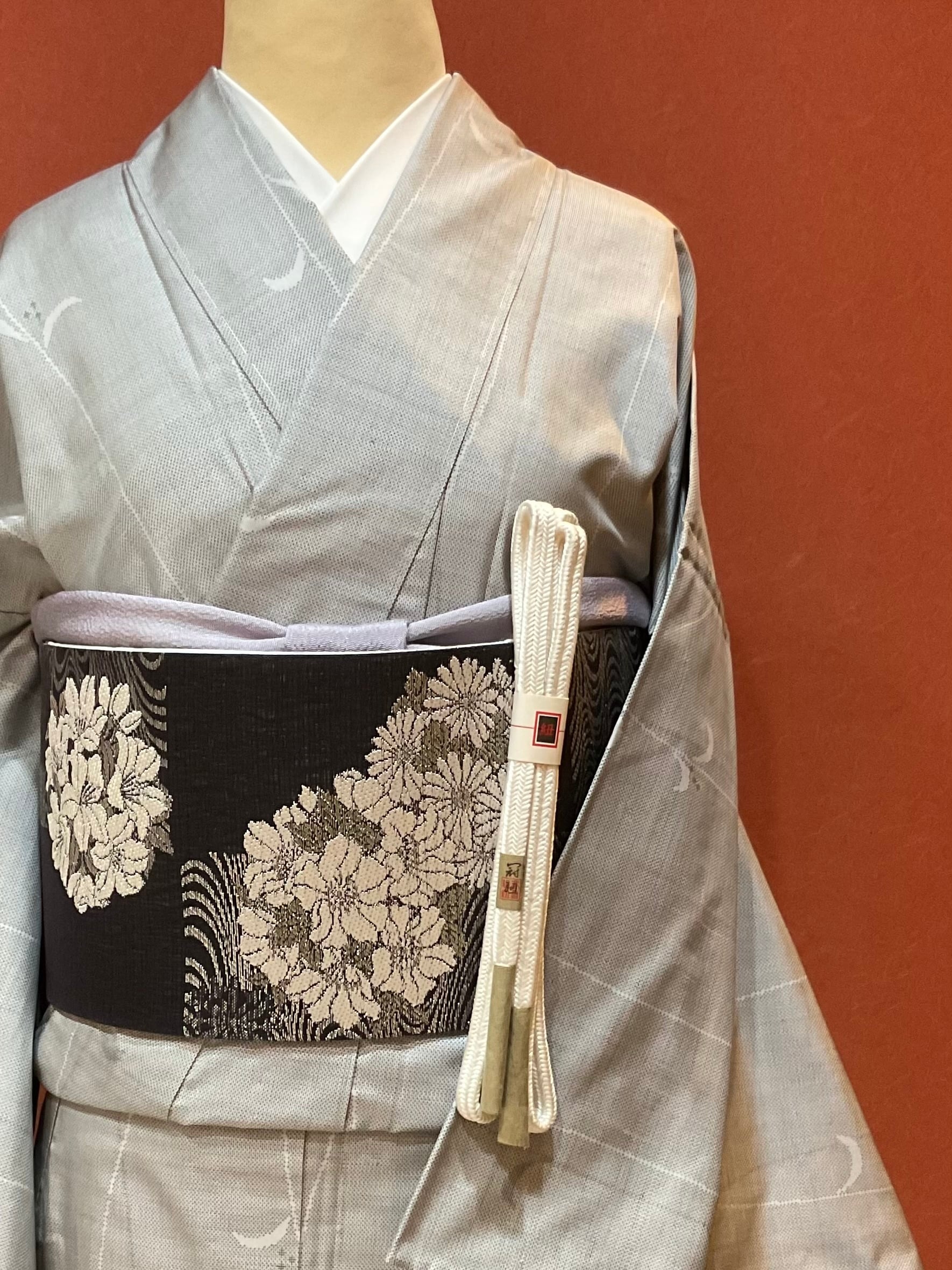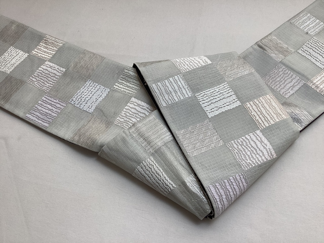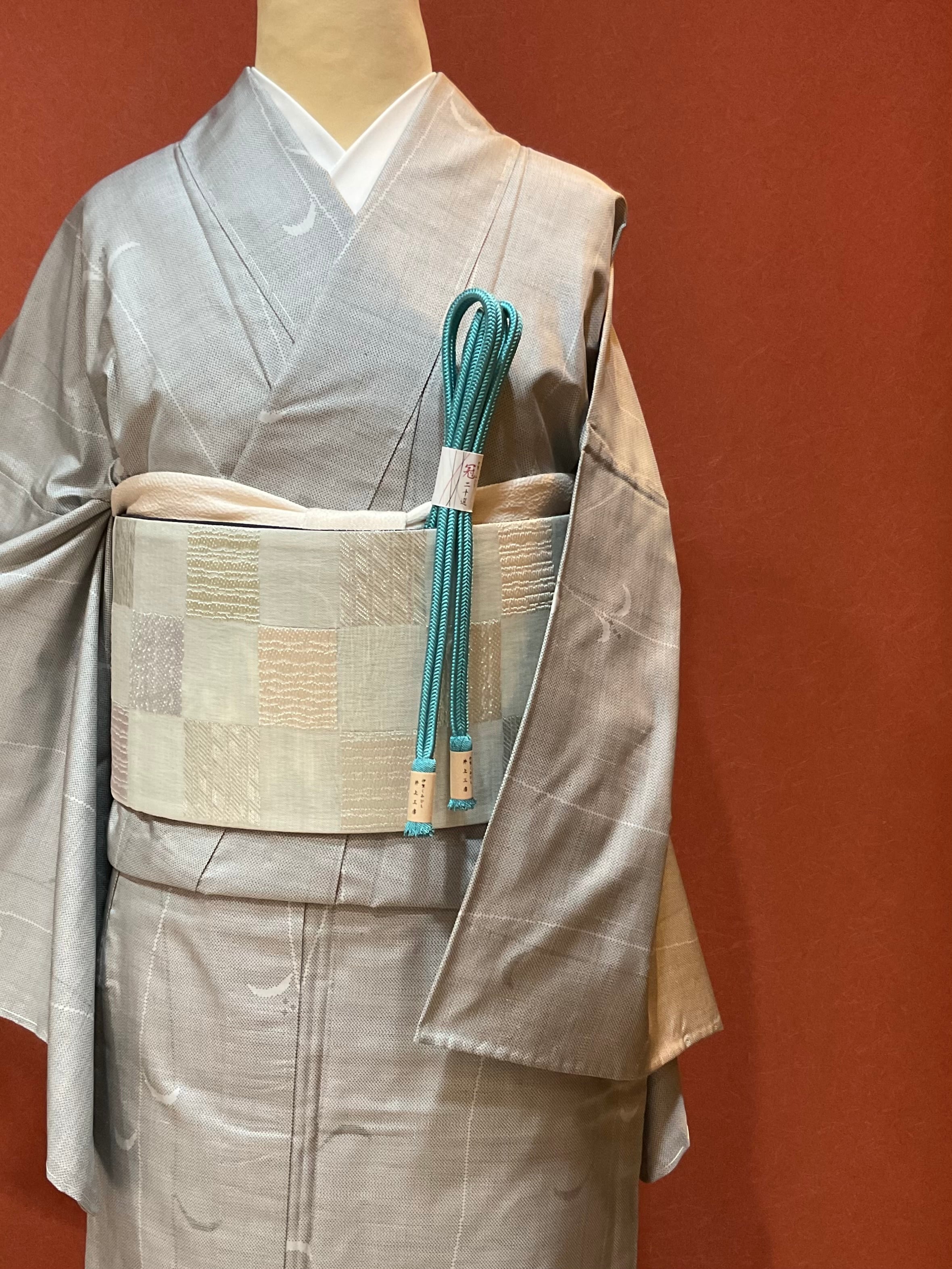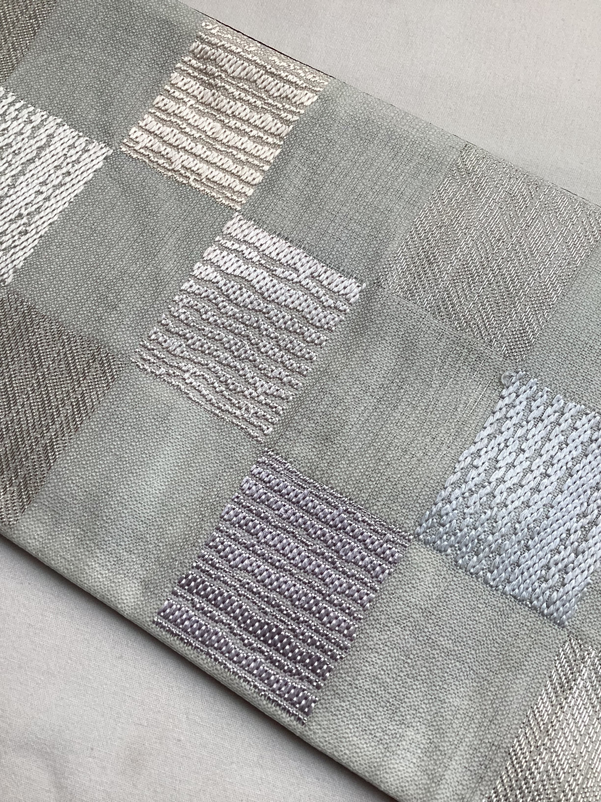 大変使い勝手の良い半巾帯のご紹介です。両面リバーシブルでお使いいただけ、どちらの面も大変コーディネートしやすいお柄となっております。また、薄手の部分的にやや透け感のある織地を使用し、軽やかな仕上がりとなっておりますので、真夏以外の3シーズンお締めいただけます。更に、銀糸の控えめな煌めきがございますので、カジュアルになり過ぎず、きちんと感のある装いが叶います。着用の負担が軽く気軽にお使いいただけて、上品な着姿を演出出来るおすすめののお品です。