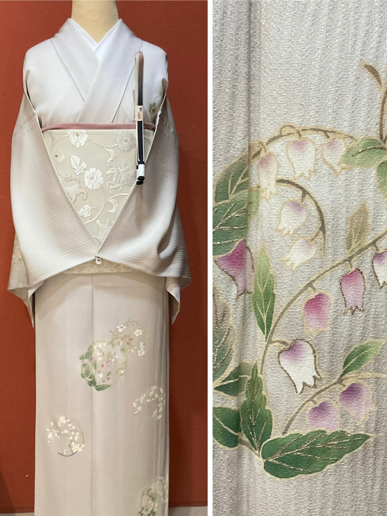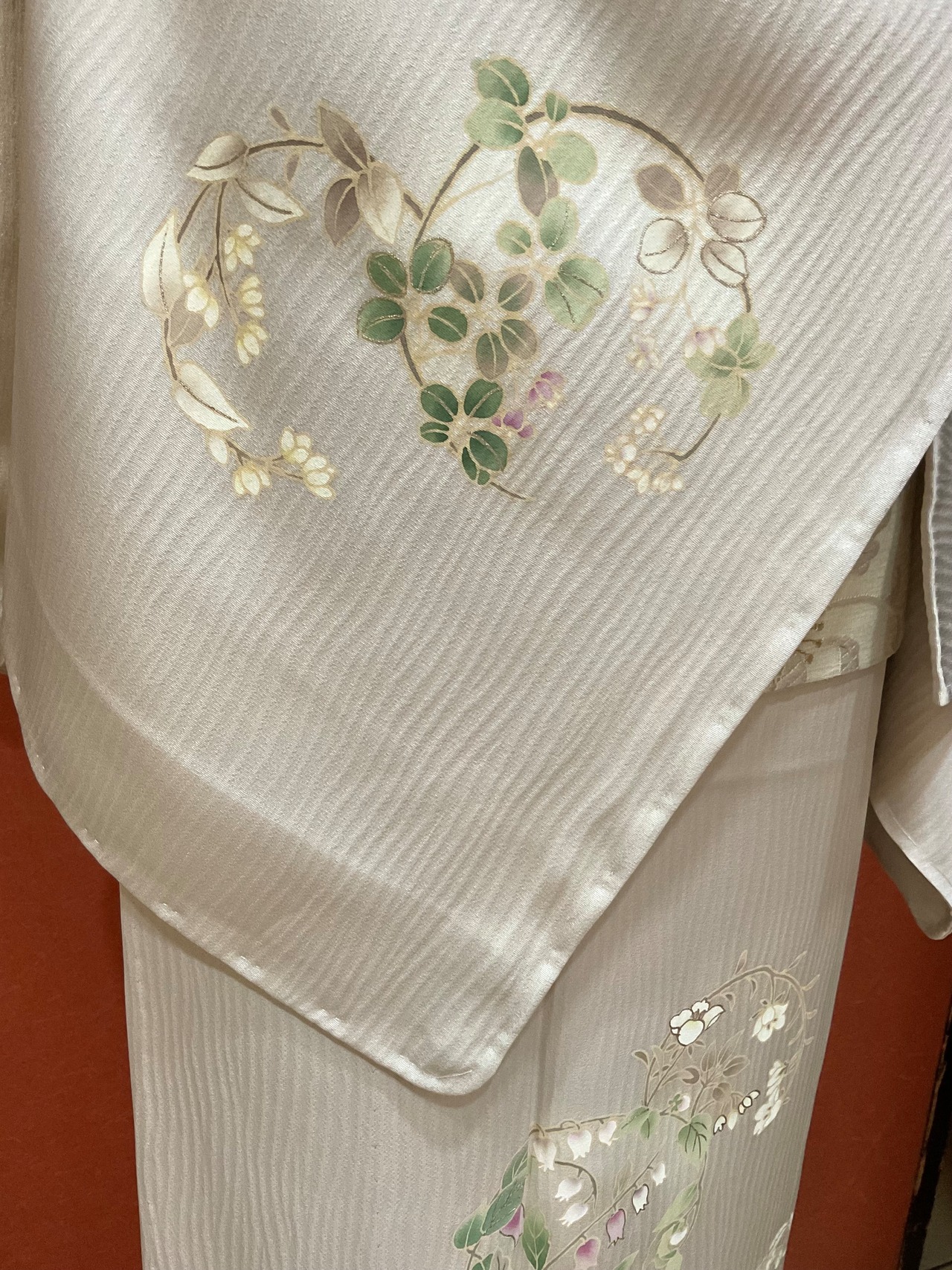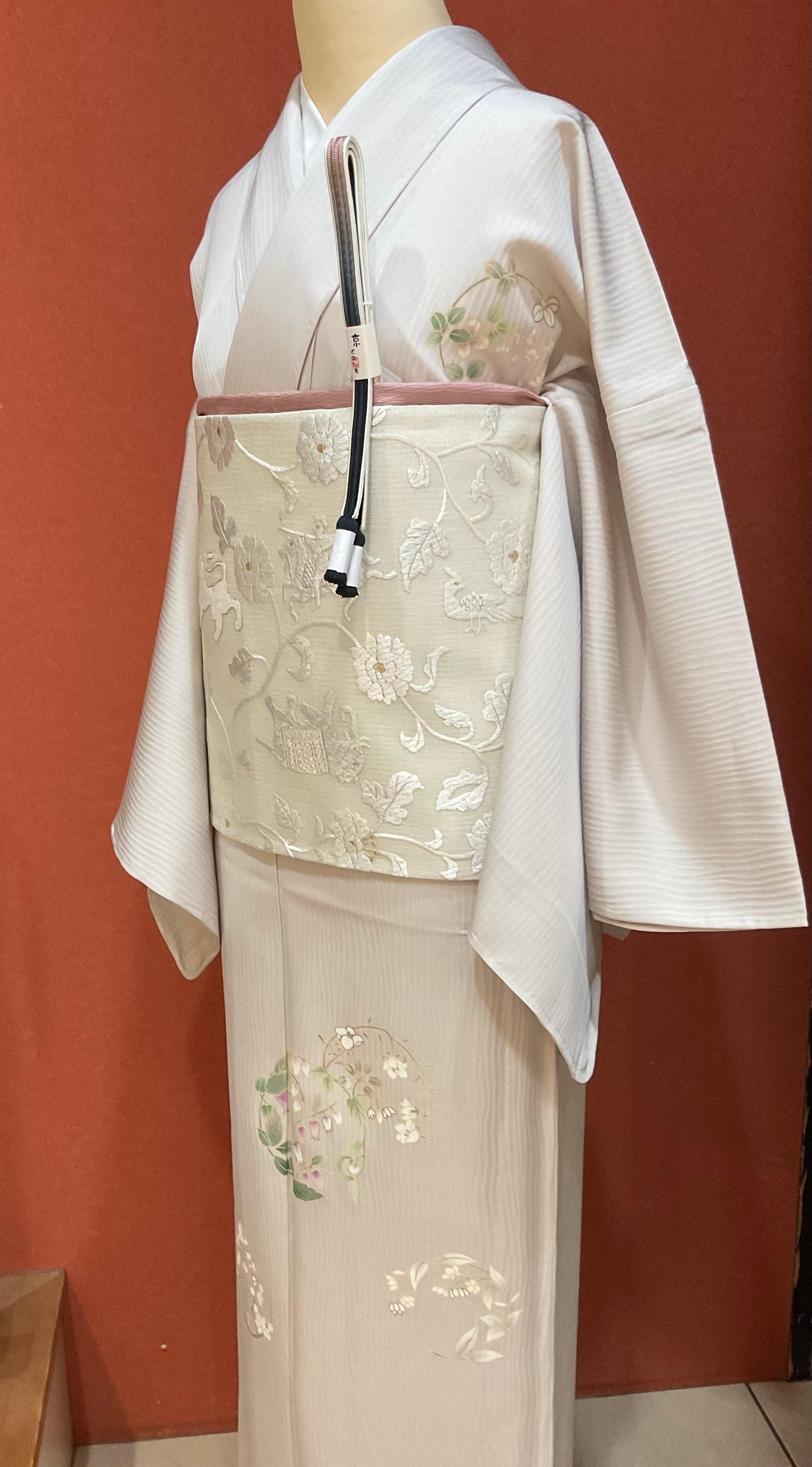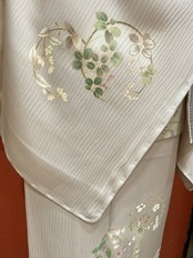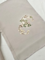 上前には鈴蘭でしょうか、可憐な小花の丸紋が描かれています。大袈裟過ぎない控えめな印象の附下げは、観劇やお茶会、お稽古ごとの発表会など幅広いシーンで重宝いたします。近年は6月を待たずに着用する機会も多い単衣きもの、お探しの方へおすすめいたします。