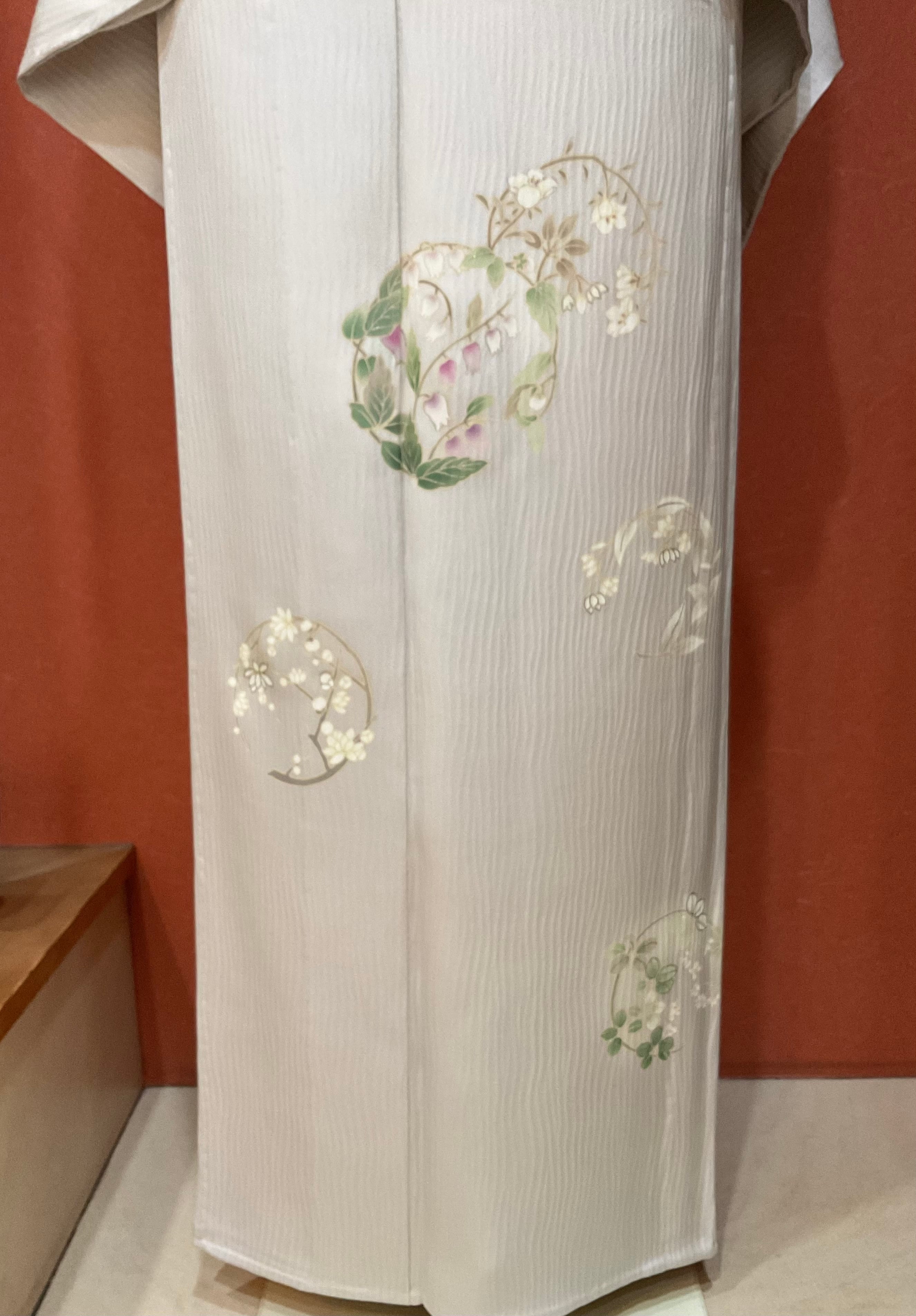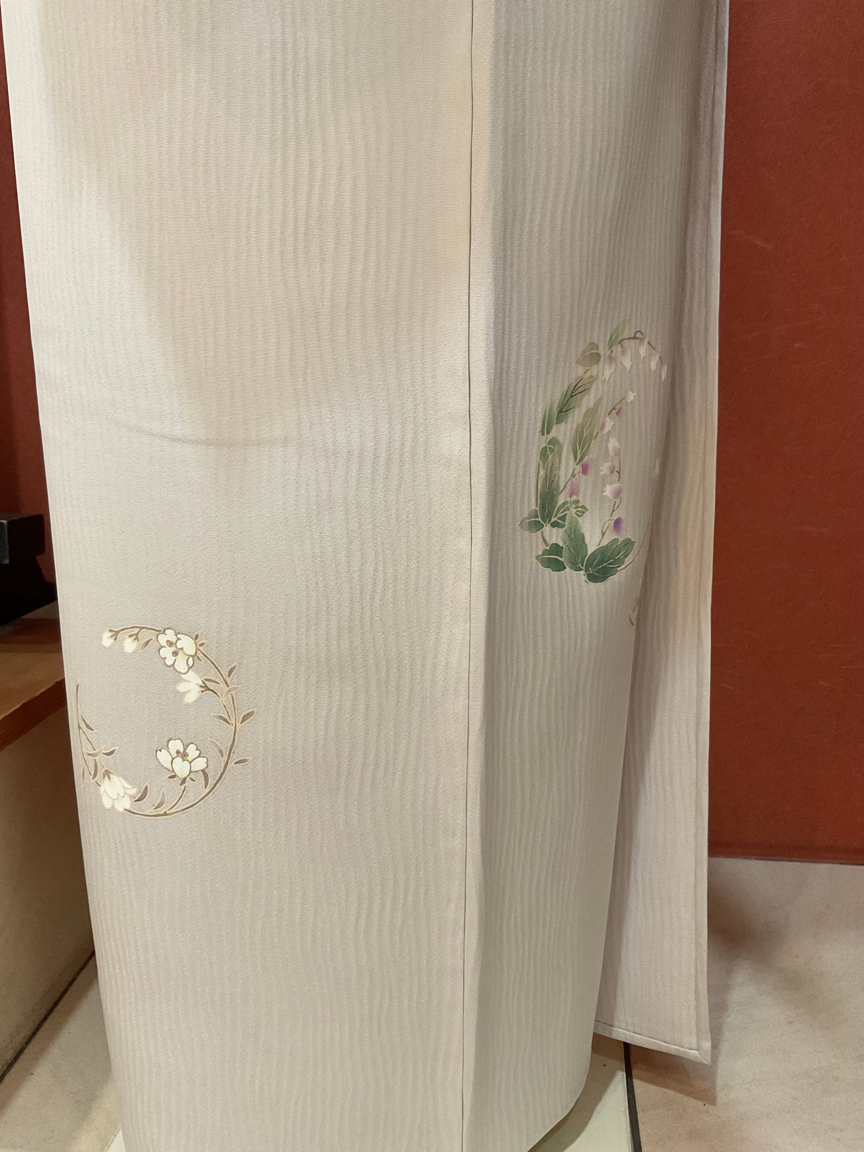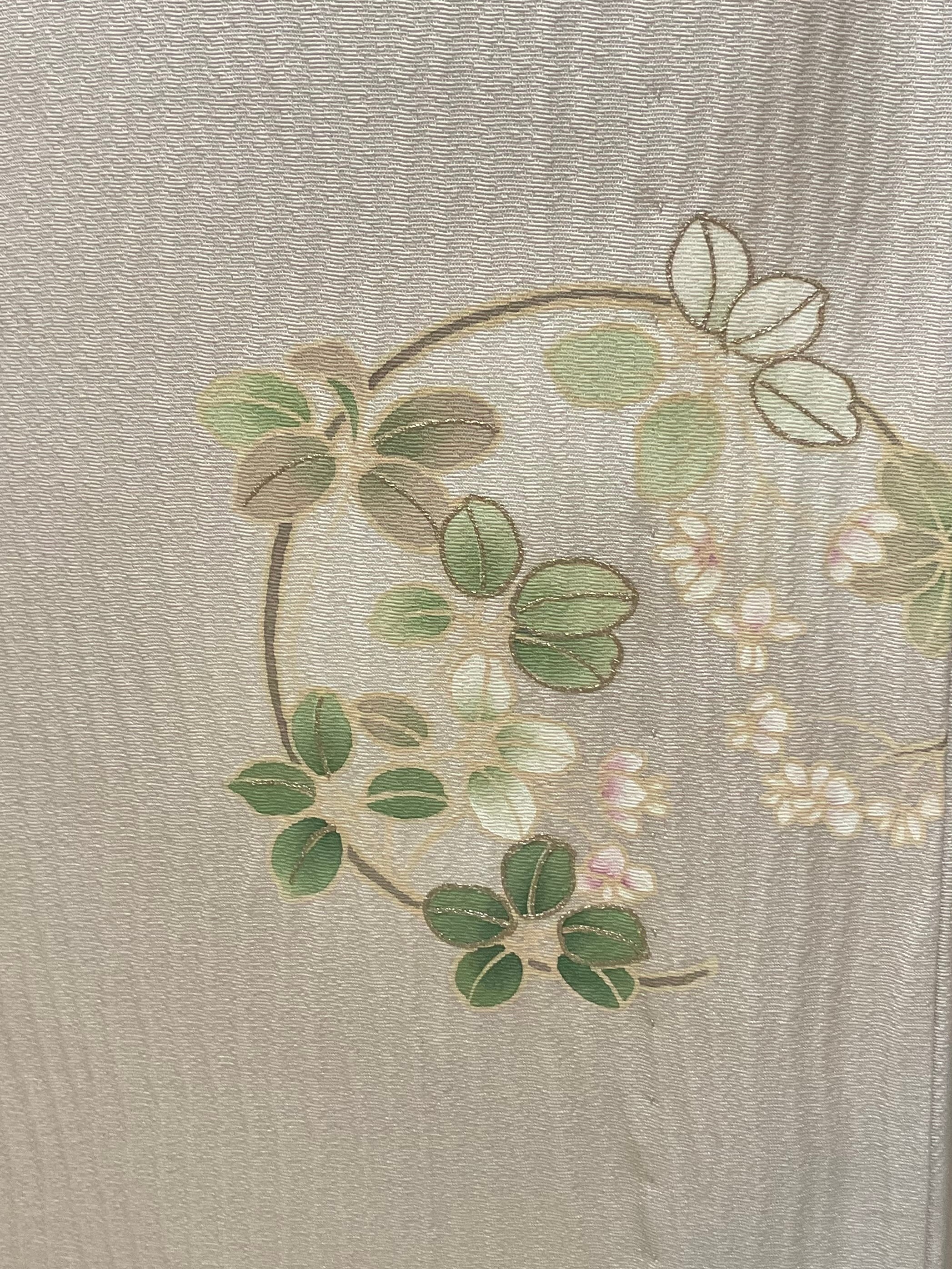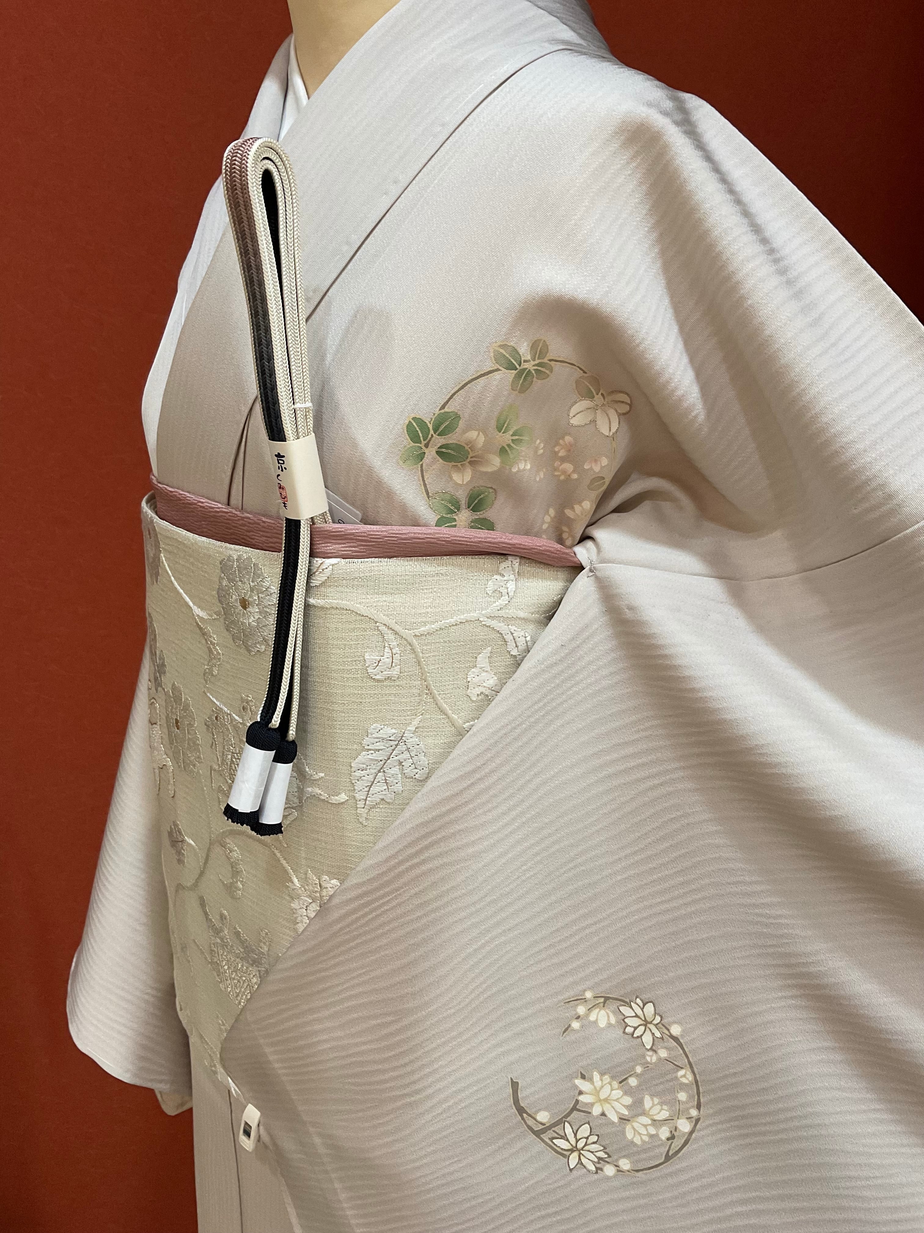 杢目のような凹凸ある極淡い灰桜色地のさらりとした絹地に品良く花丸文様が散らしてある附下です。