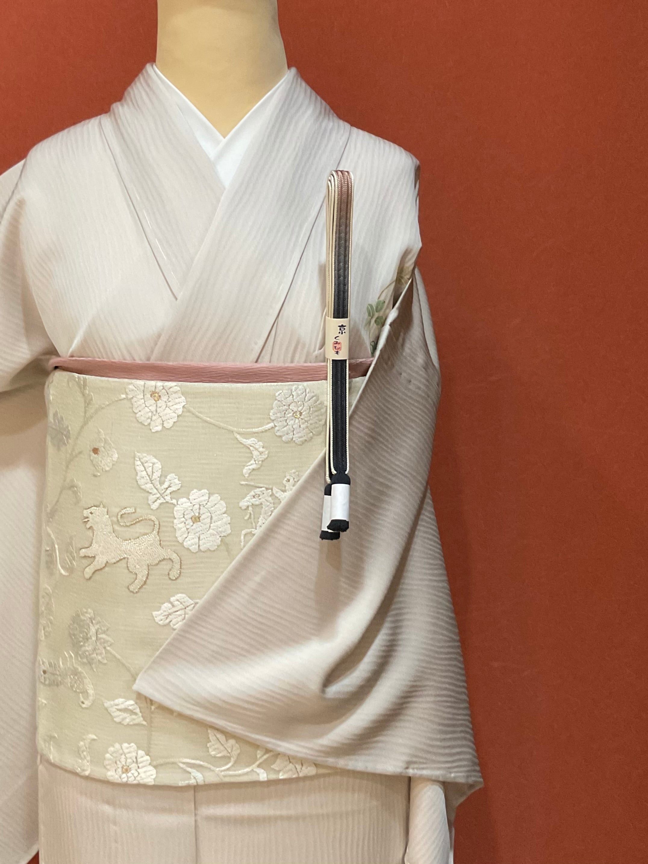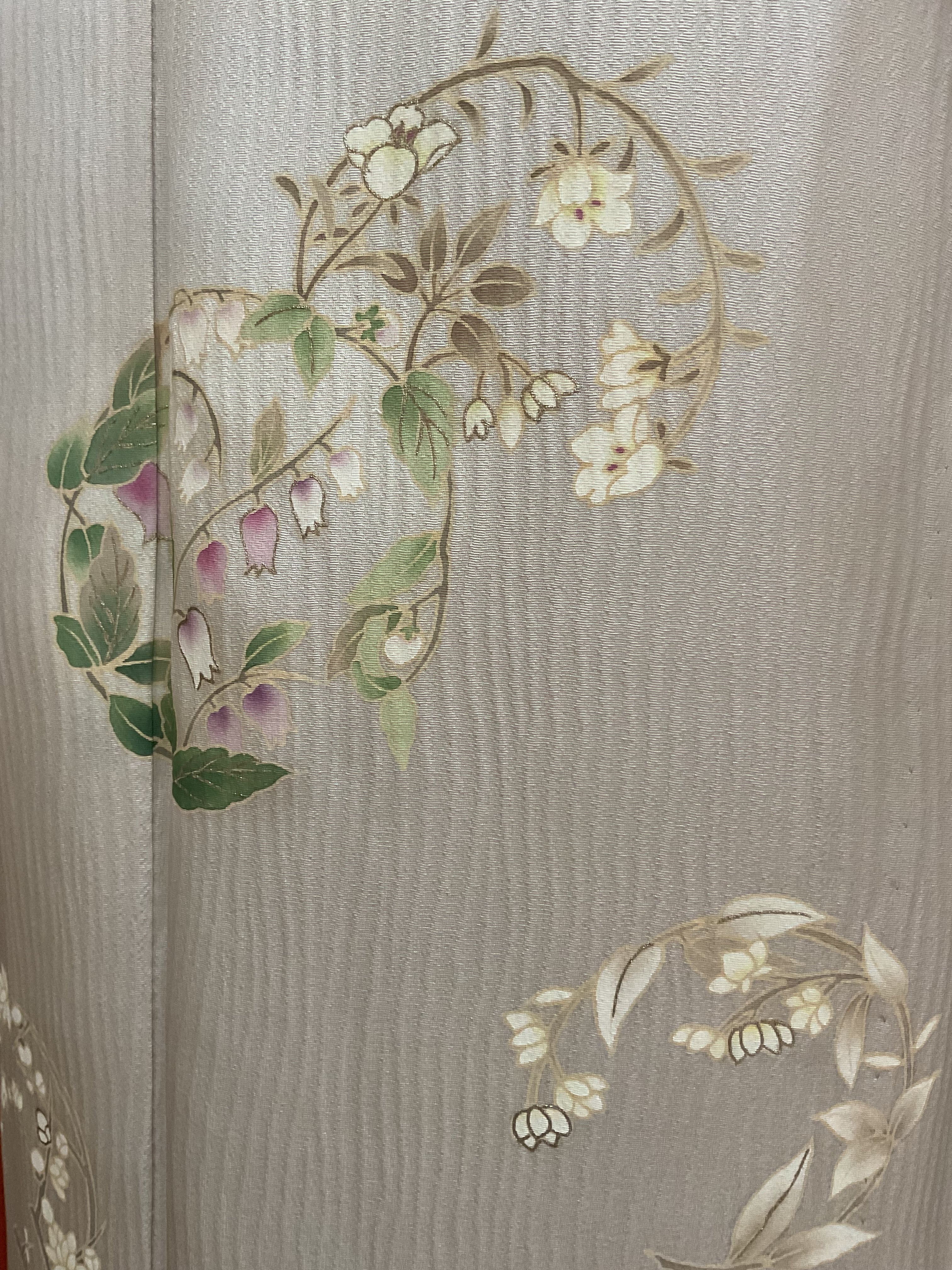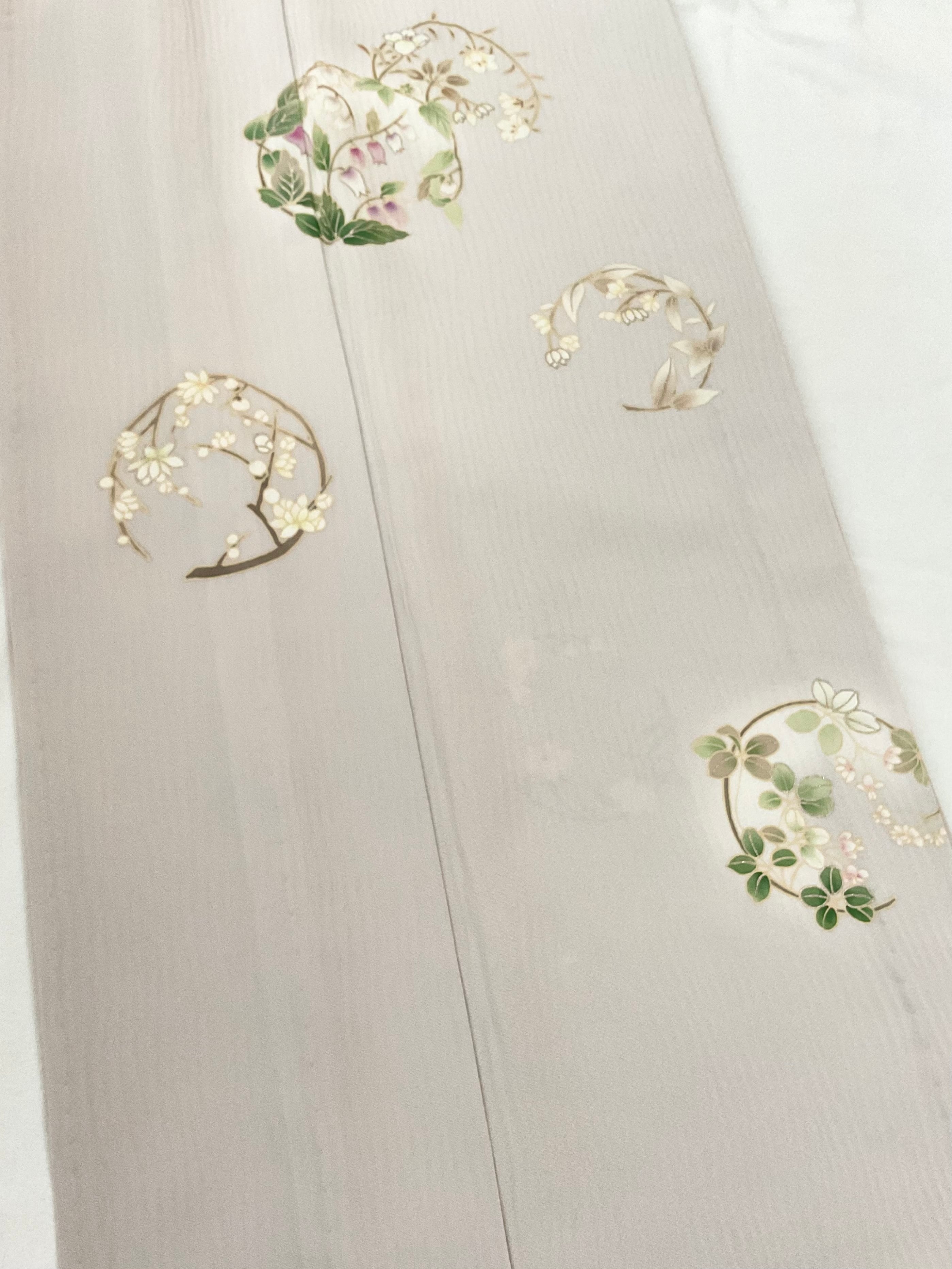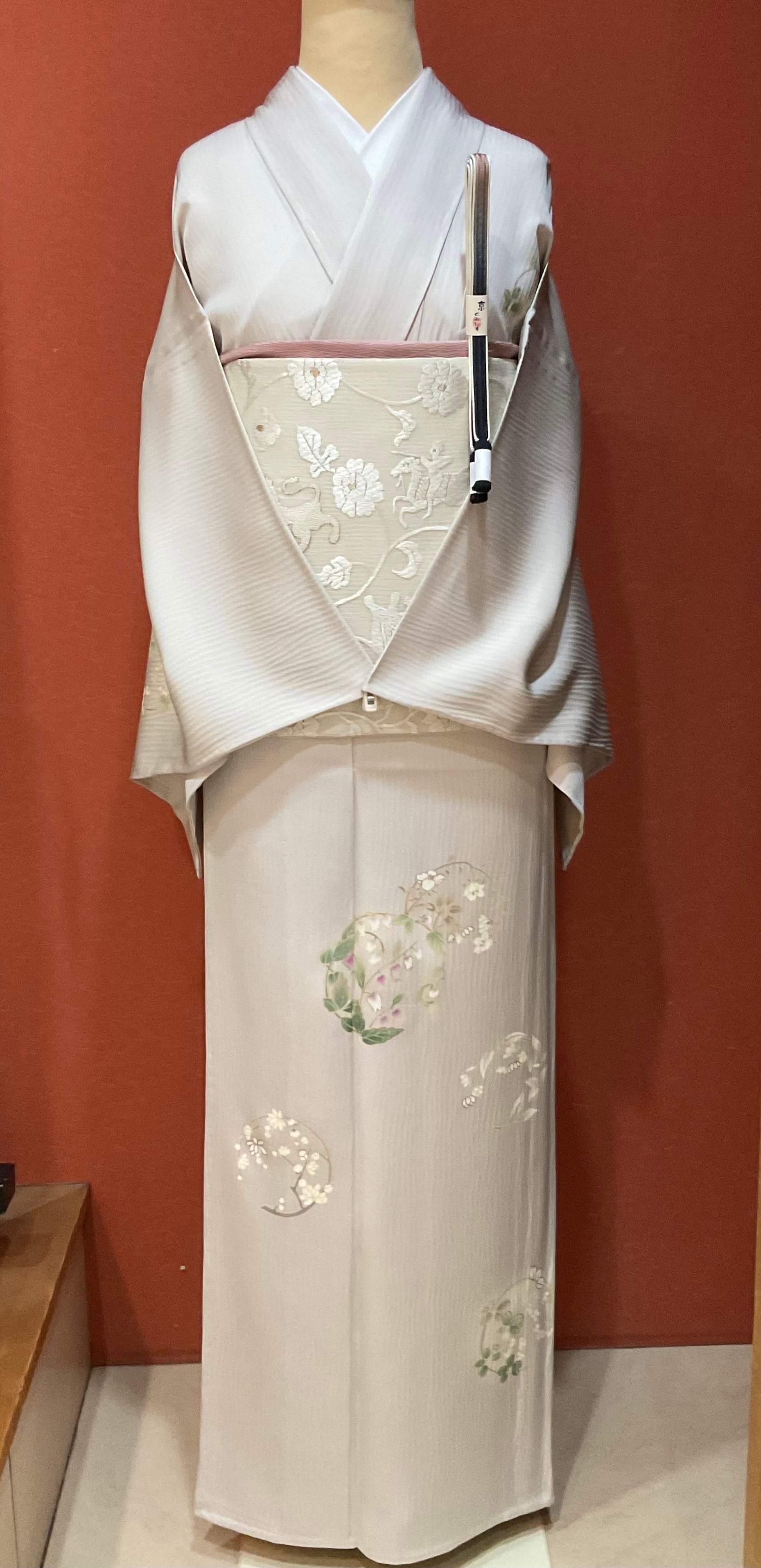 杢目のような凹凸ある極淡い灰桜色地のさらりとした絹地に品良く花丸文様が散らしてある附下です。