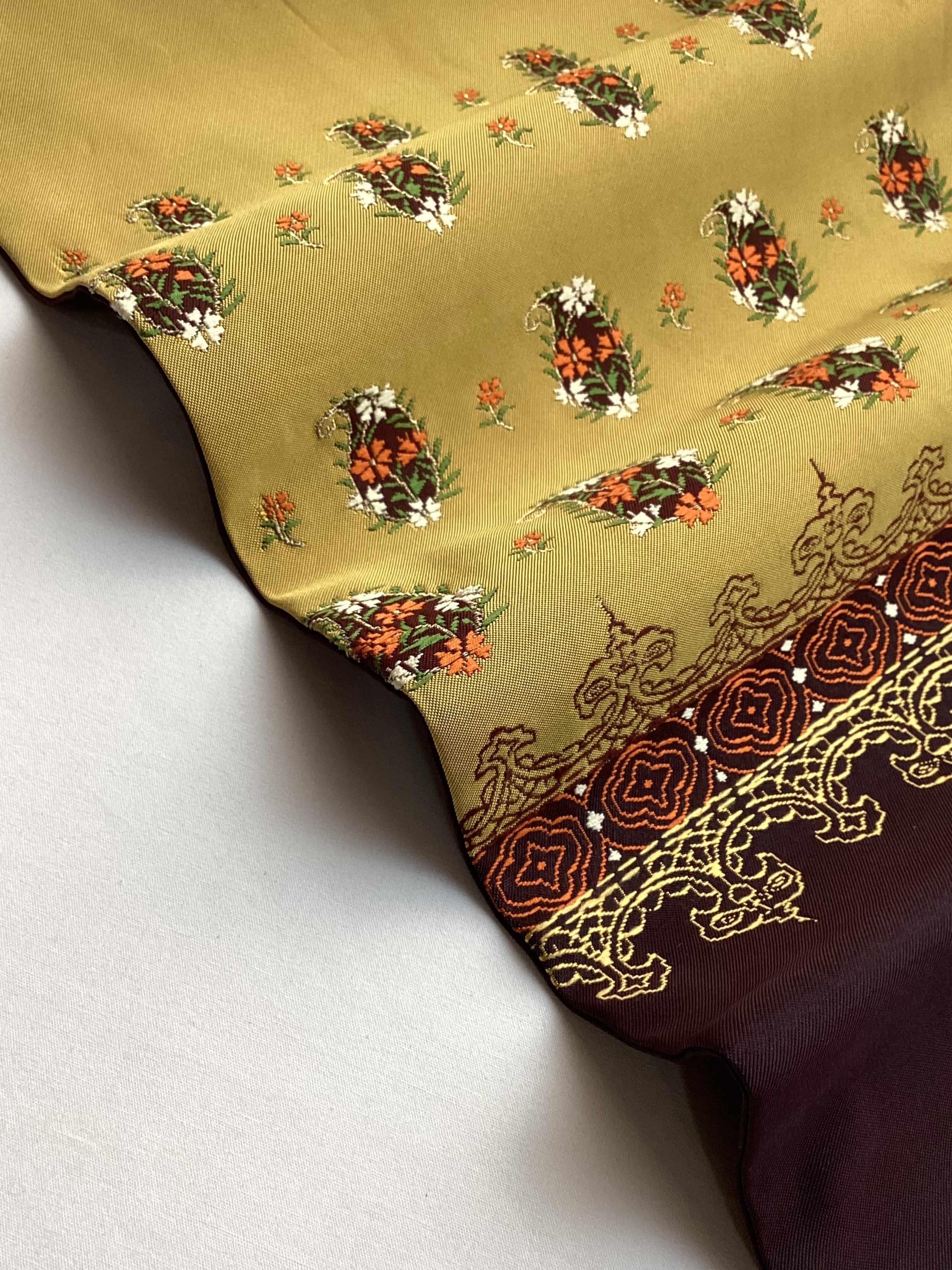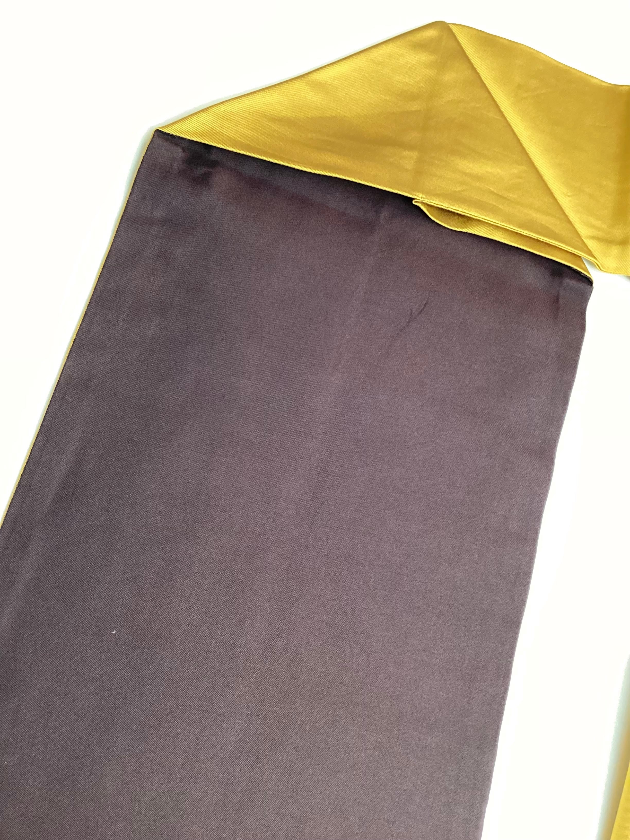 光沢感のある艶やかな黄色にペイズリーや草花の文様が異国情緒を感じさせる九寸なごや帯です。タレの焦茶色が後ろ姿をスッキリと見せてくれ、メリハリのあるお色目なので、装いに個性を添えてくれます。帯をアクセントにした大人のカジュアルコーデにおすすめいたします。