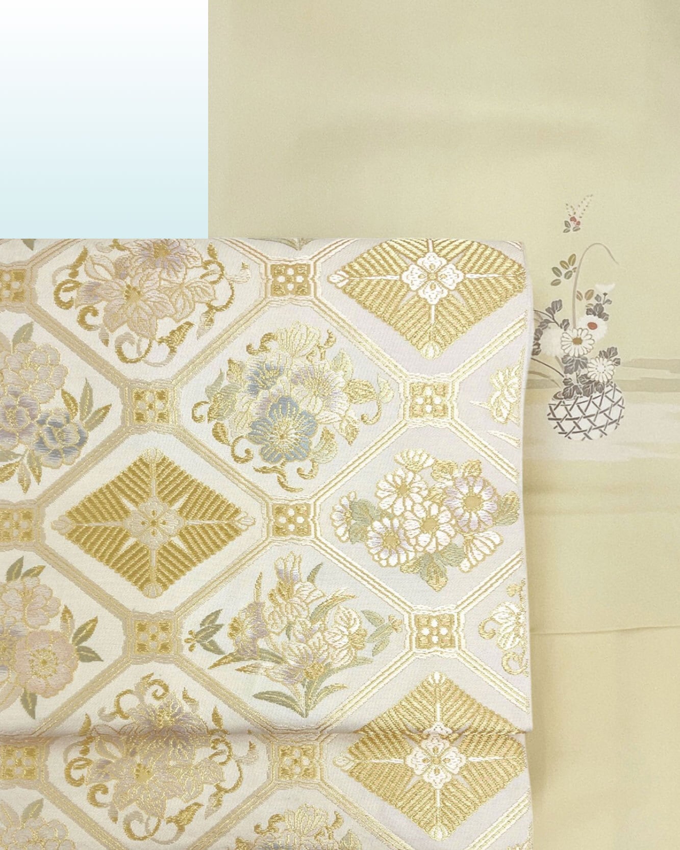 やわらかな色調の中に金の輝きが映え、訪問着や付下げ、色無地などに合わせて、結婚式や式典、パーティーなどフォーマルな場に好ましい一枚です。