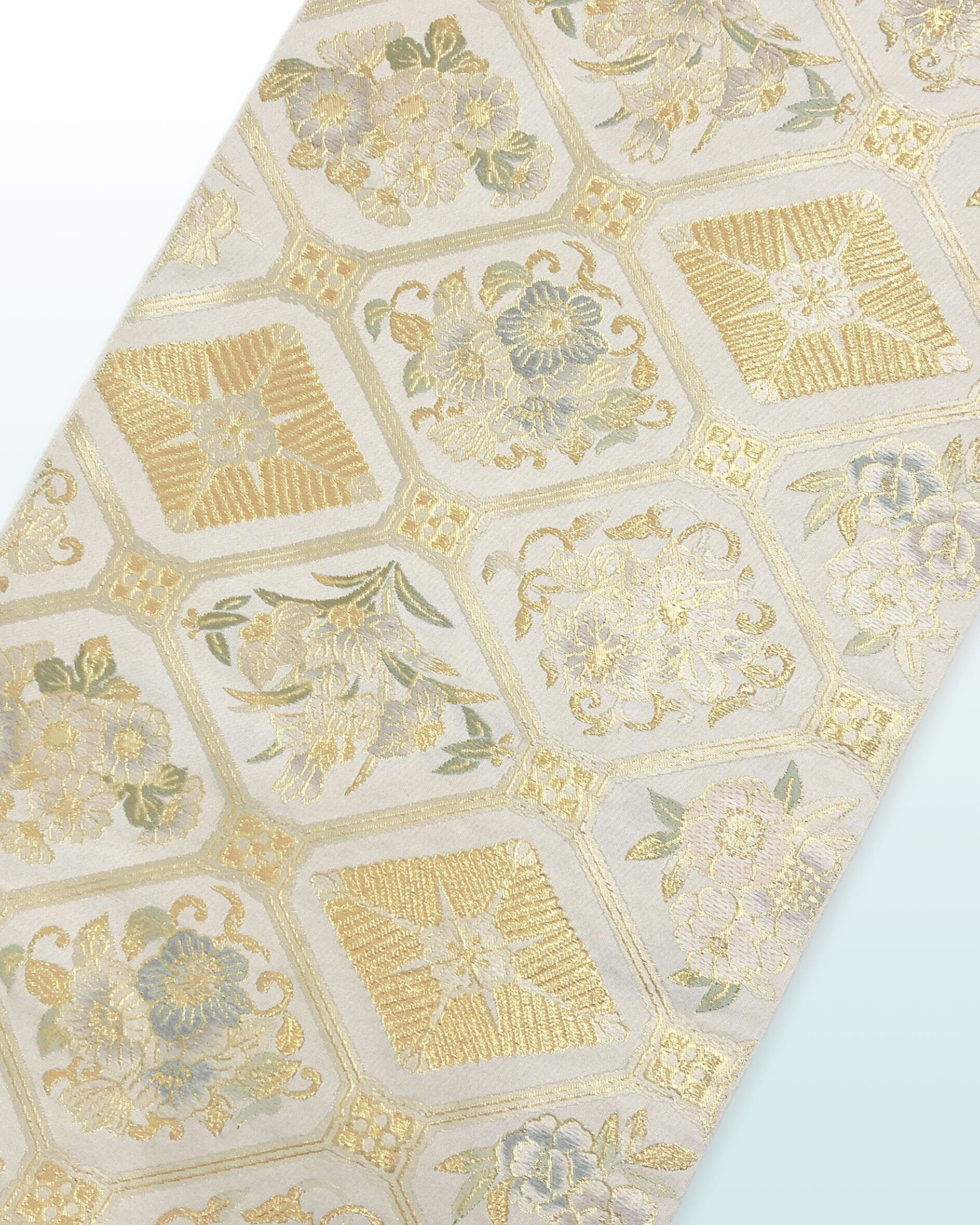 上品なクリーム地に、格天井文様をあしらった格調高い袋帯です。