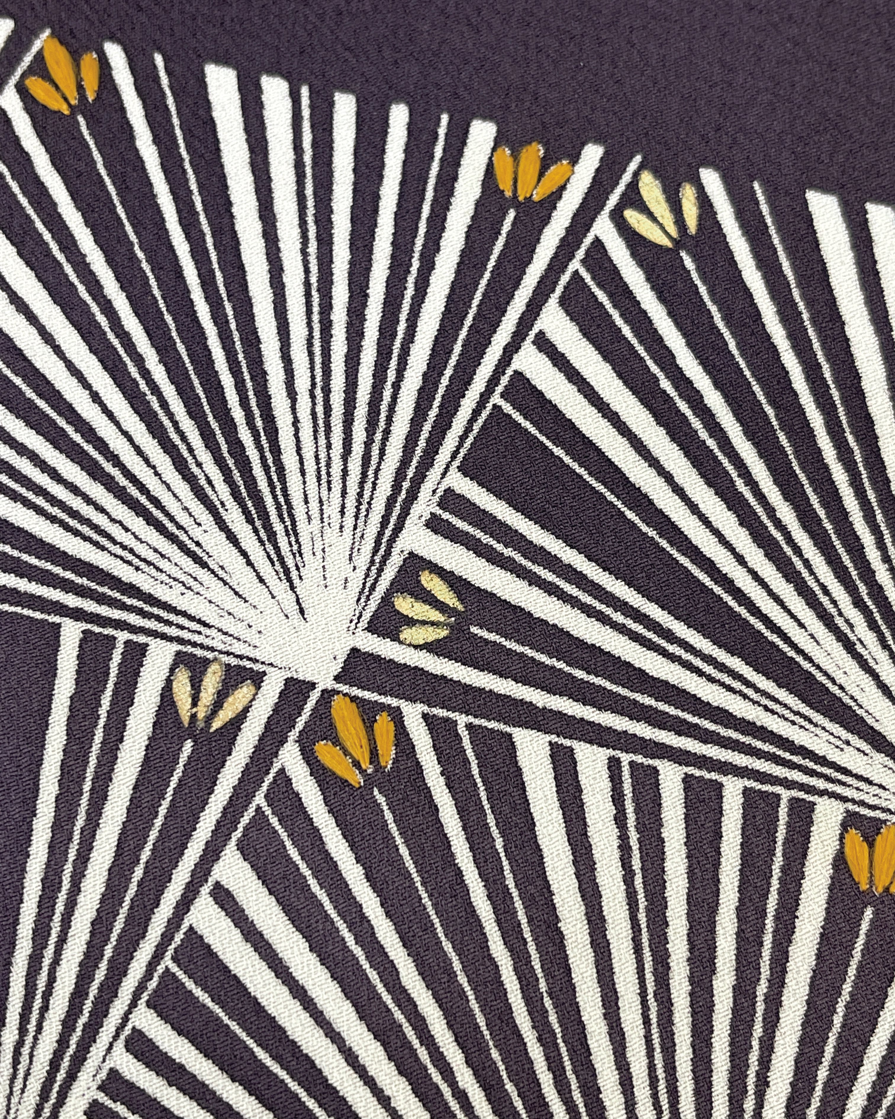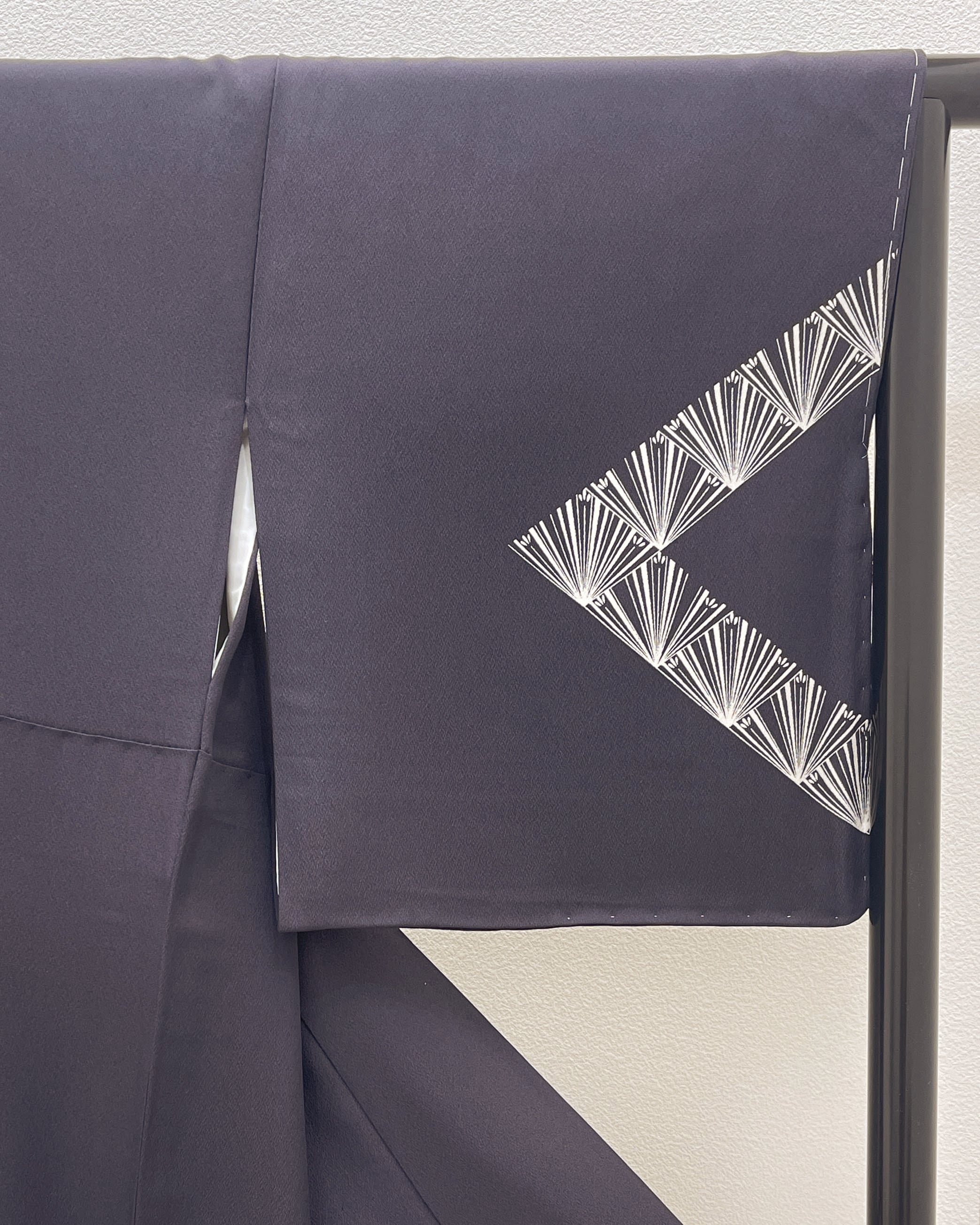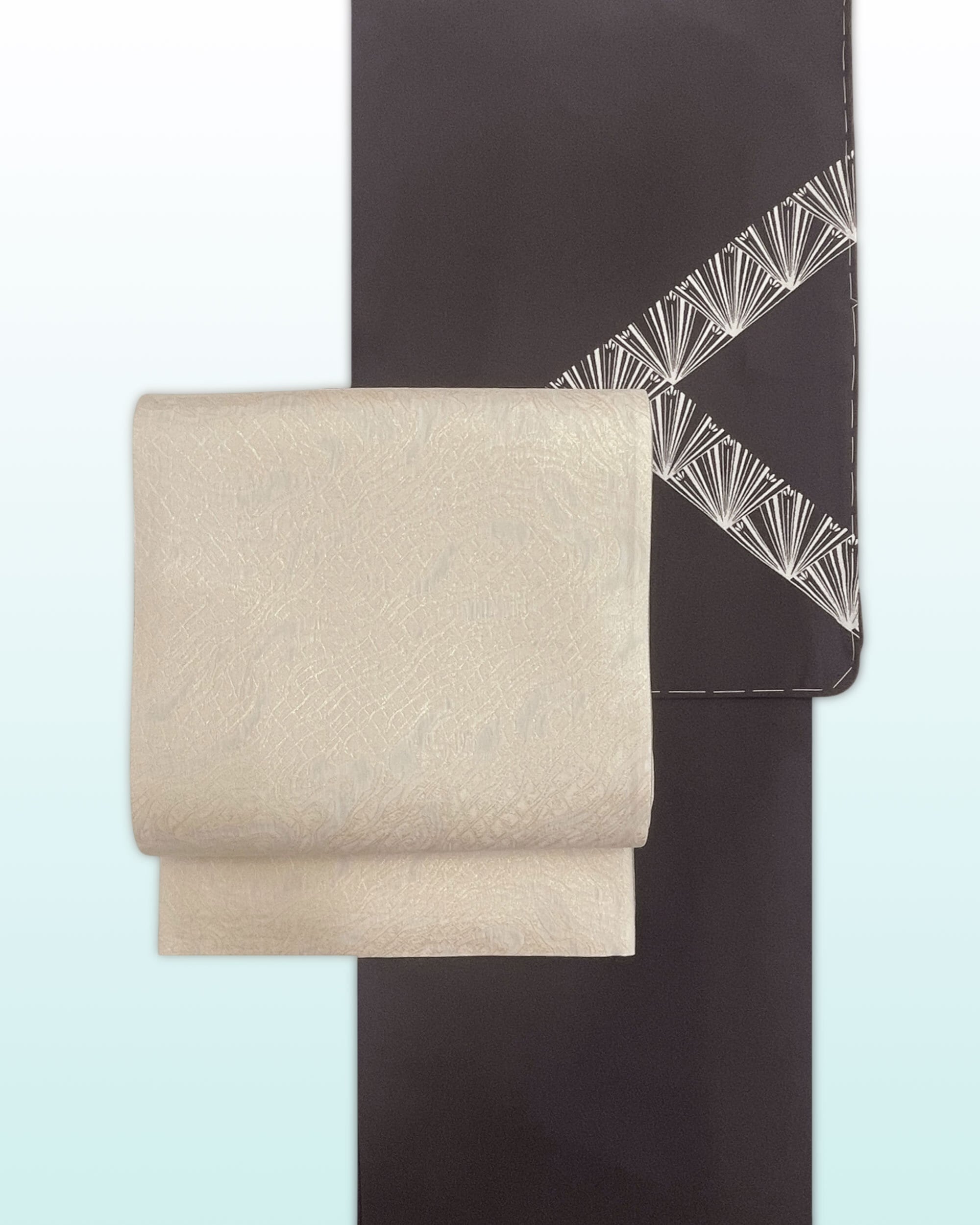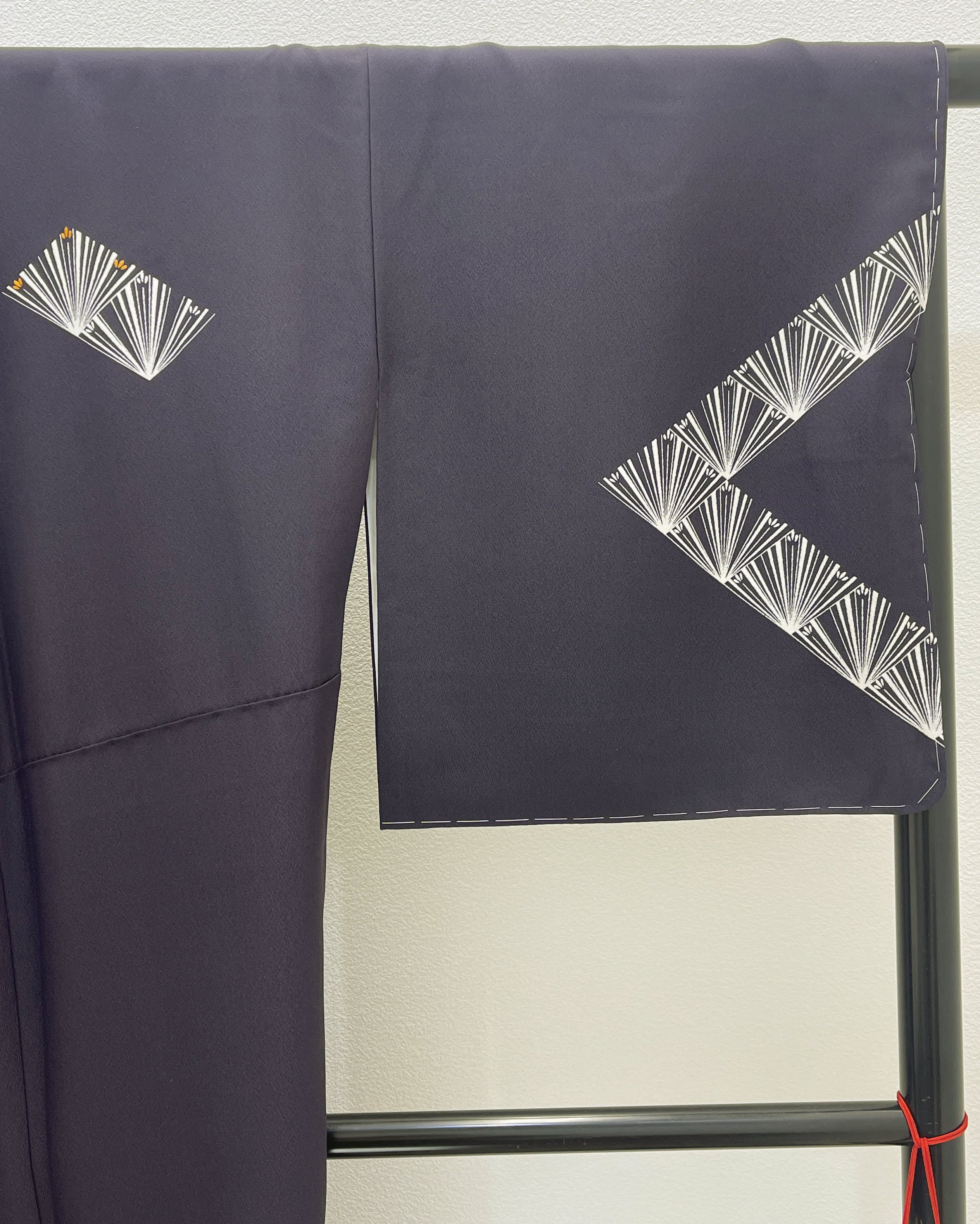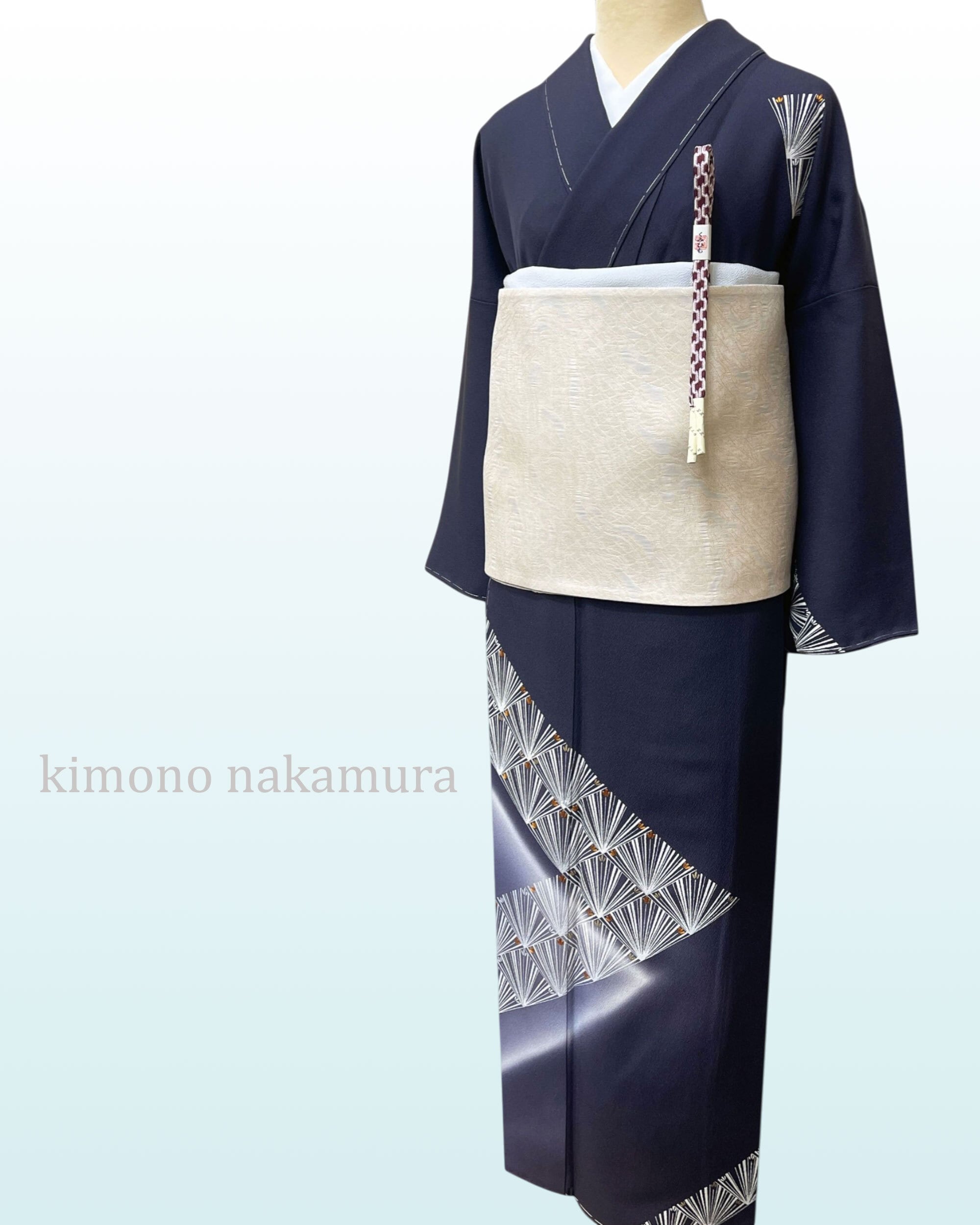 若松を末広のようにデザインした一枚で、お慶びのお席や観劇などのお席にお召しいただきたいお品です。
