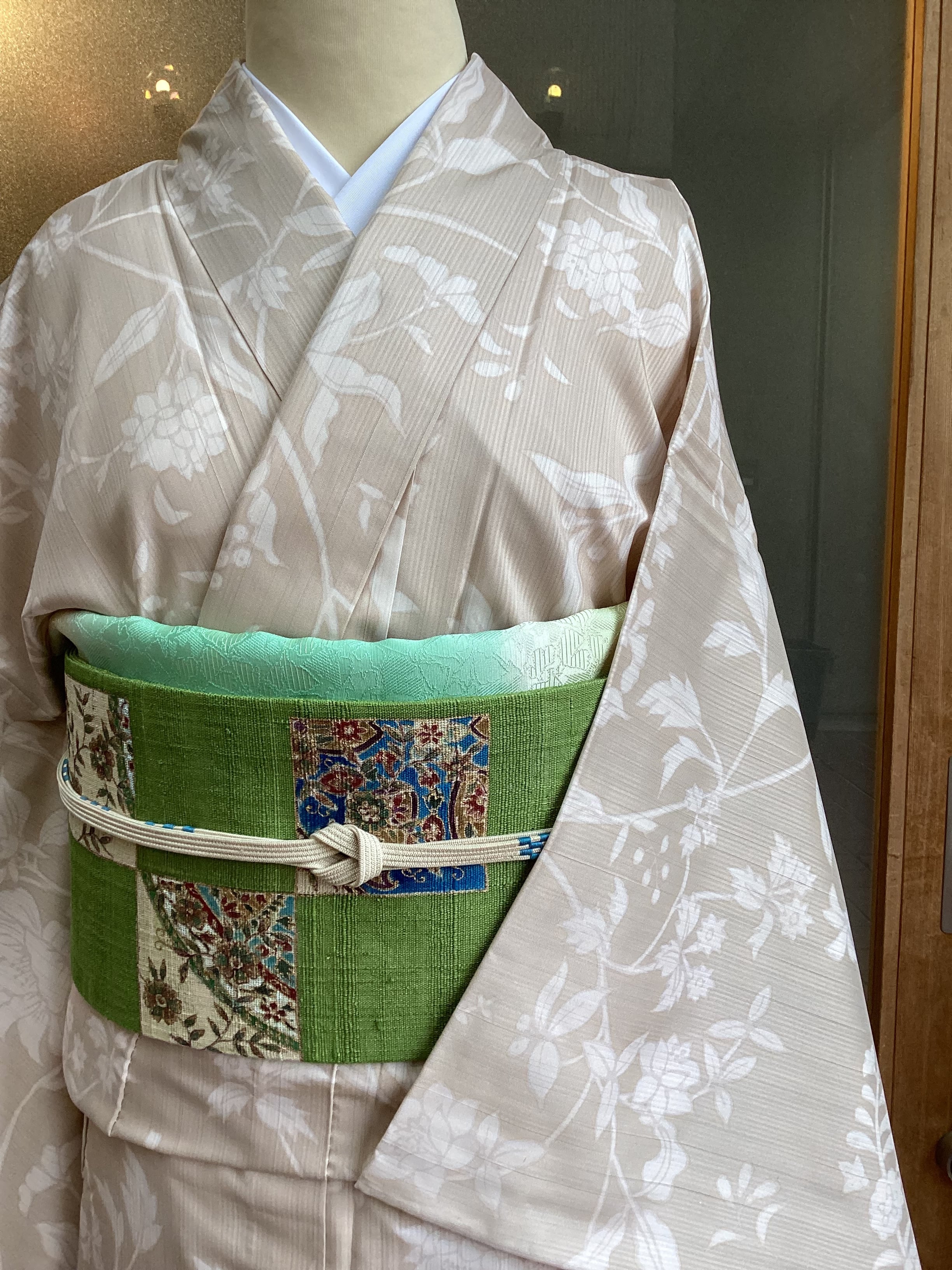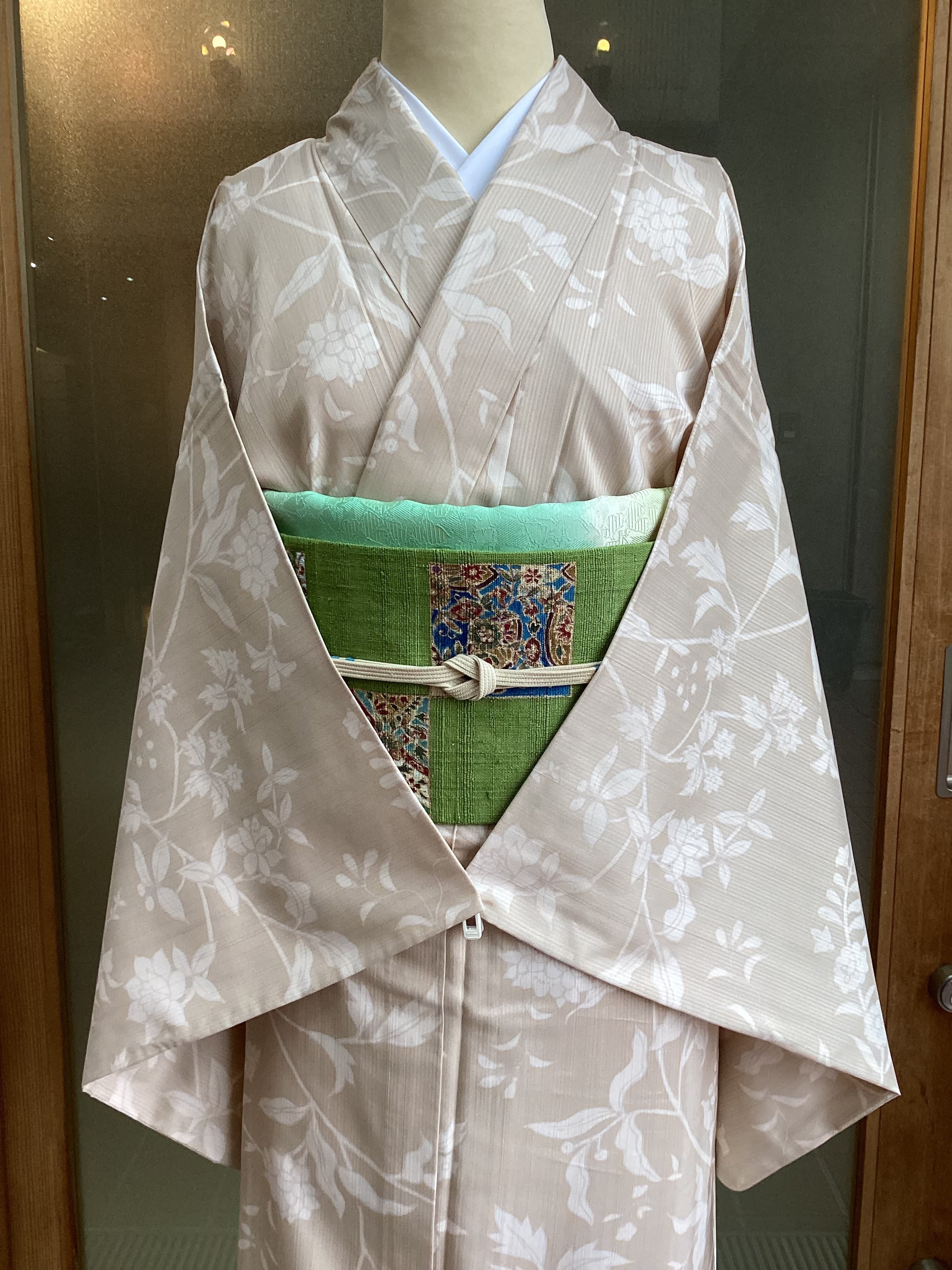 ピンクベージュのニュアンスカラーに曲線の柔らかな大きめのボタニカル文様が染め抜かれた小紋きものです。薄っすらとピンクを感じる優しいお色目は顔映りを明るくしてくれます。程よい大人の甘さを感じる小紋を花柄のワンピースを着る感覚で気軽にお召しになってお出掛け下さい。お単衣にはもってこいの滑らかな手触りの生地感です。