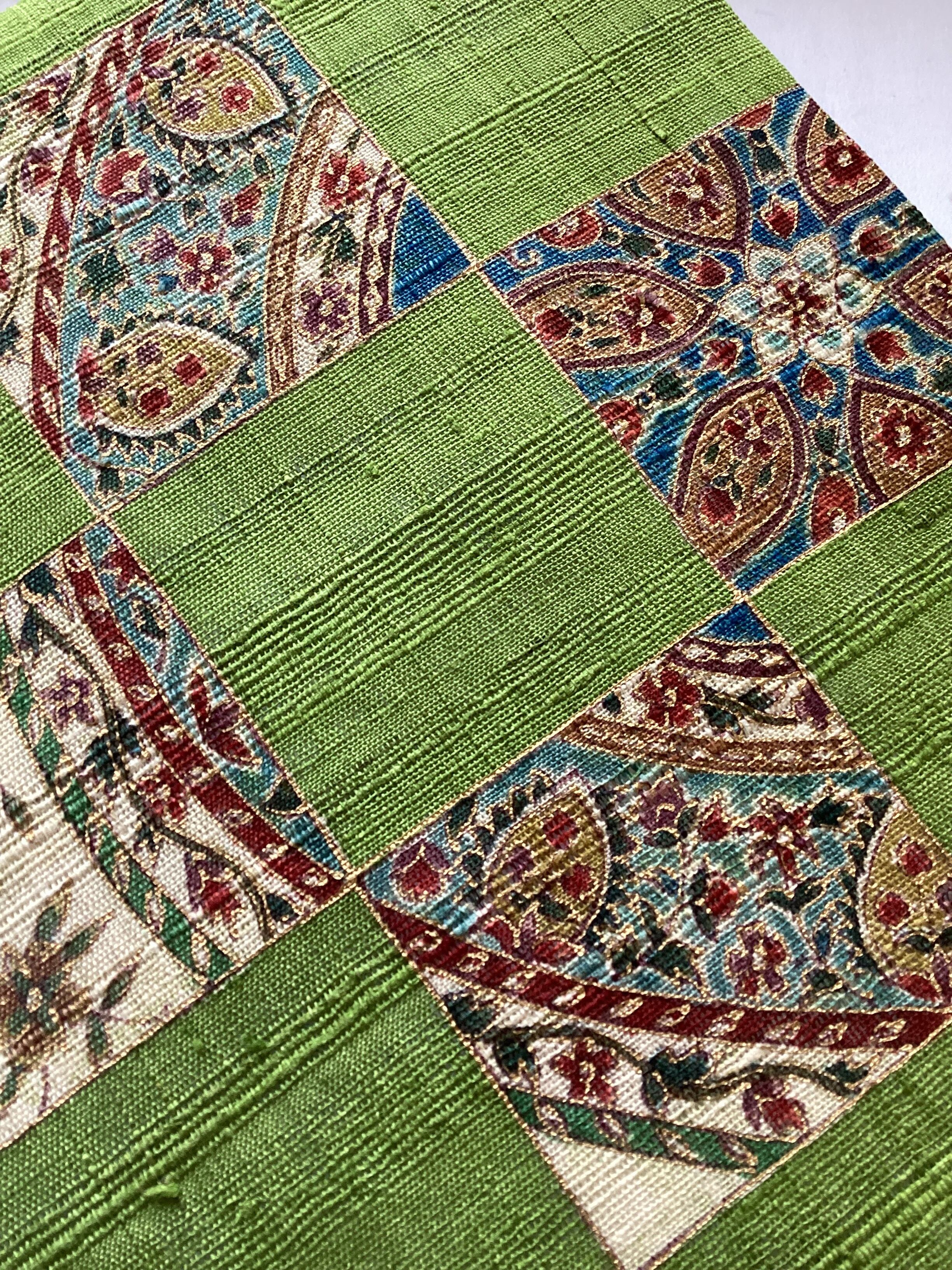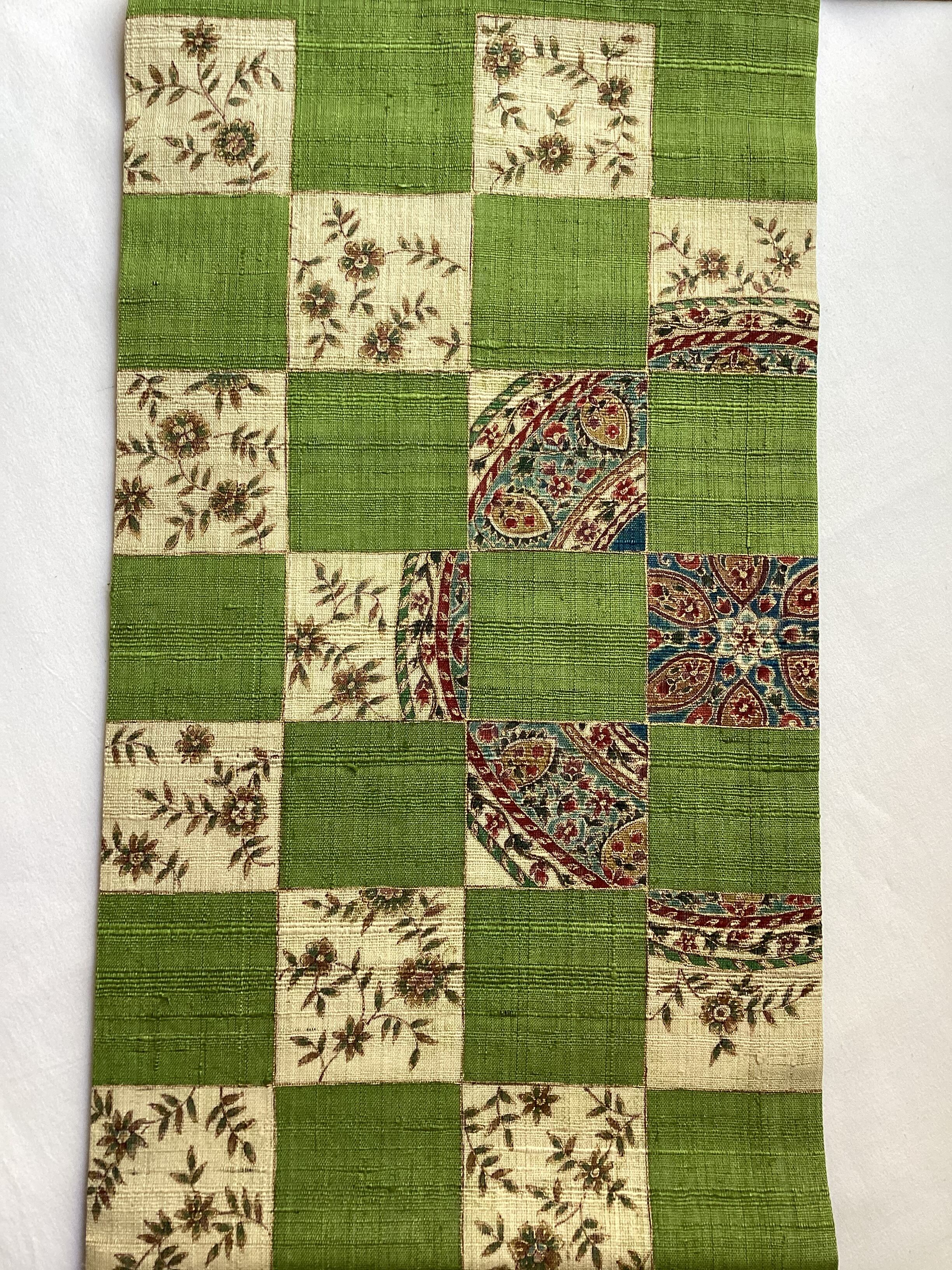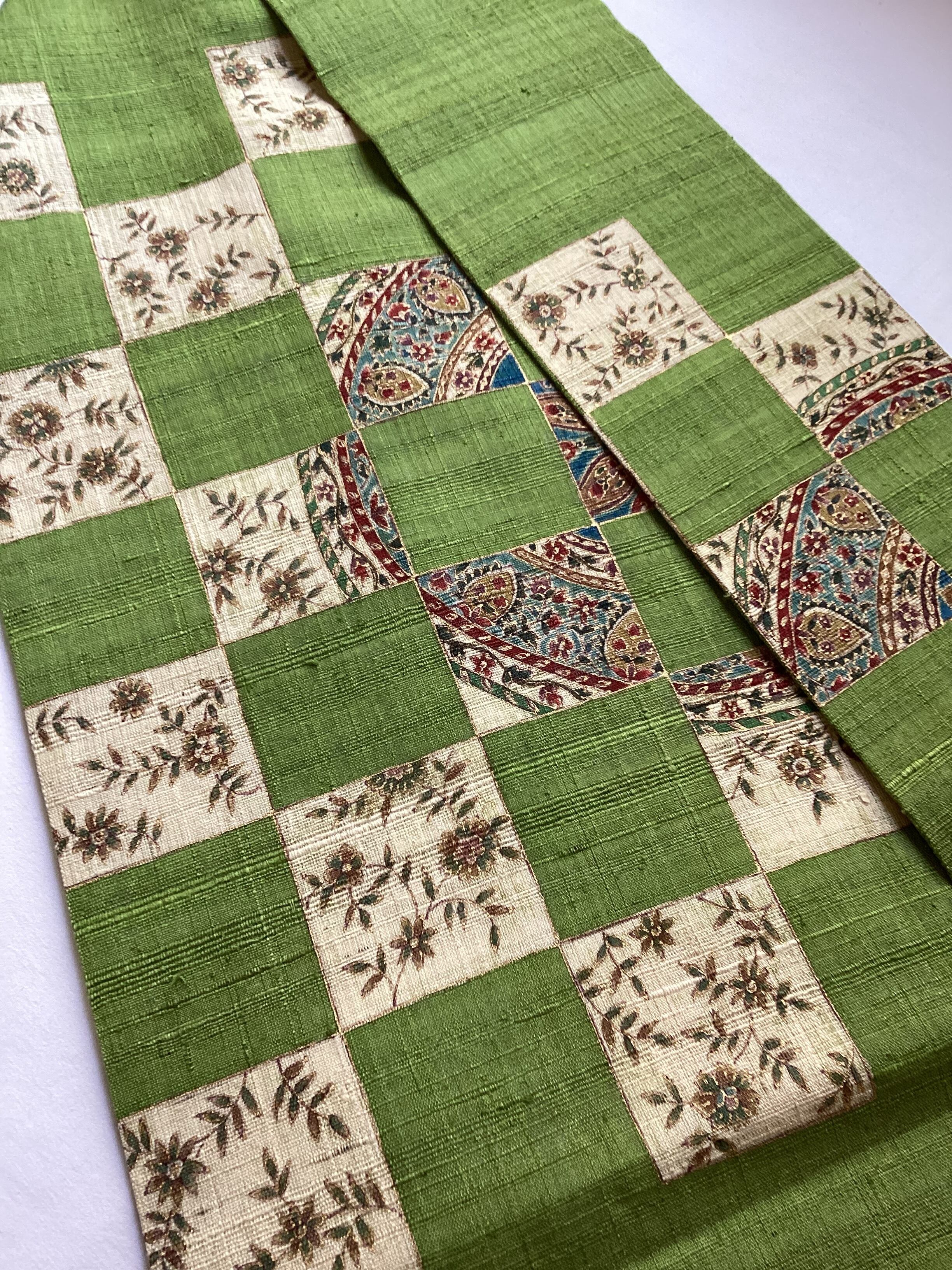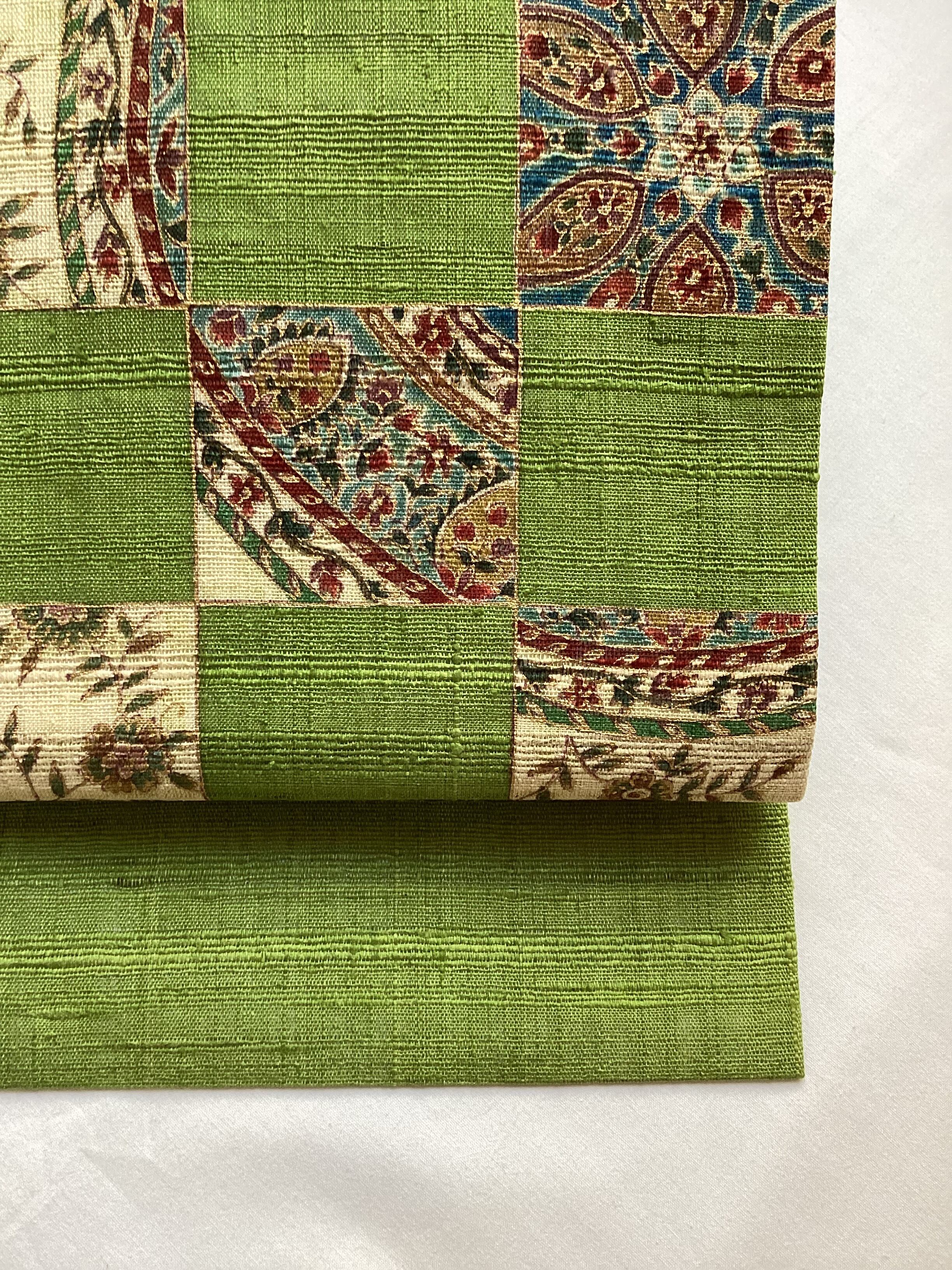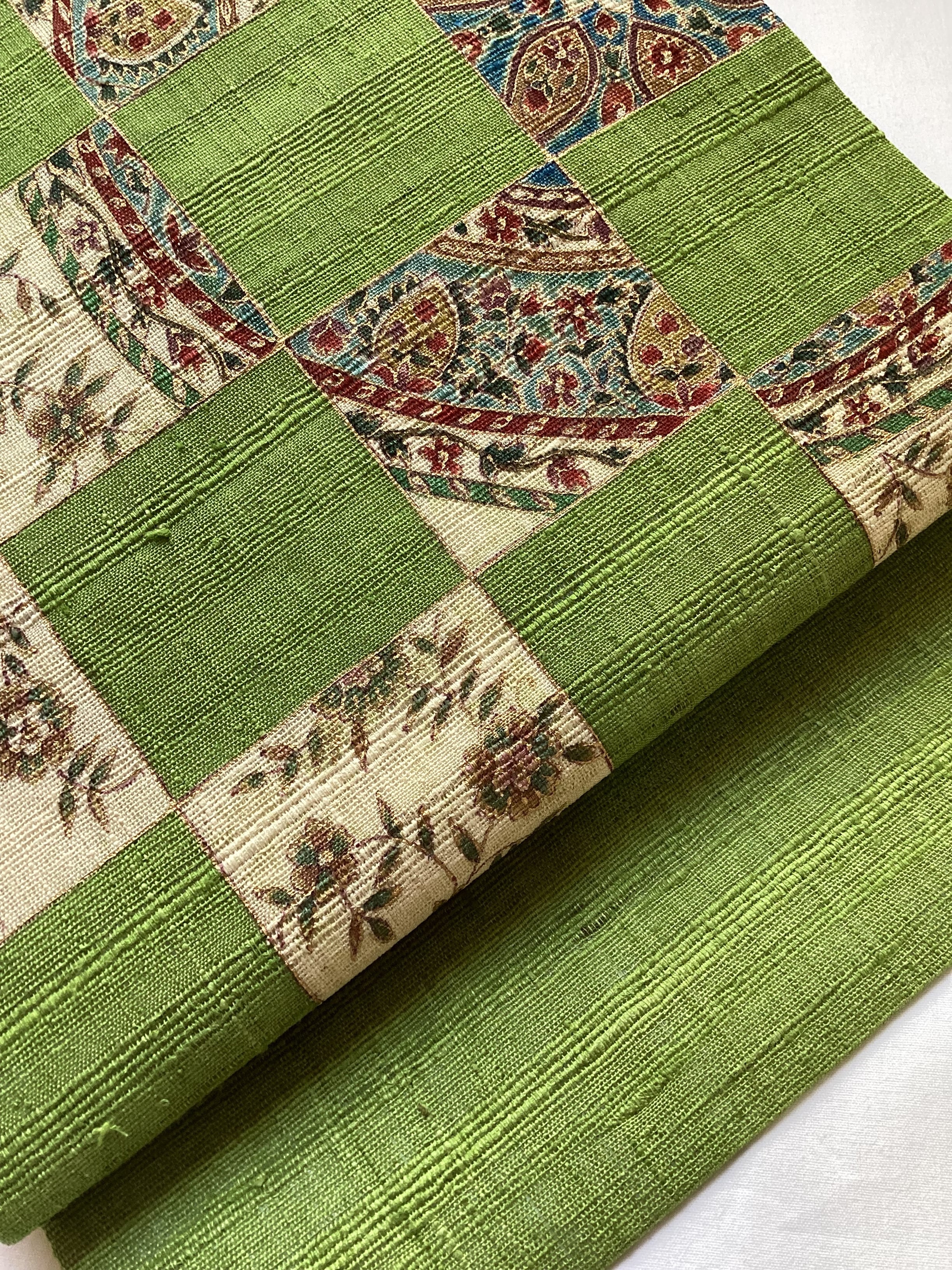 黄緑色地市松に鏡裏文【大浦紫山】紬なごや帯260409-2(リユース品)