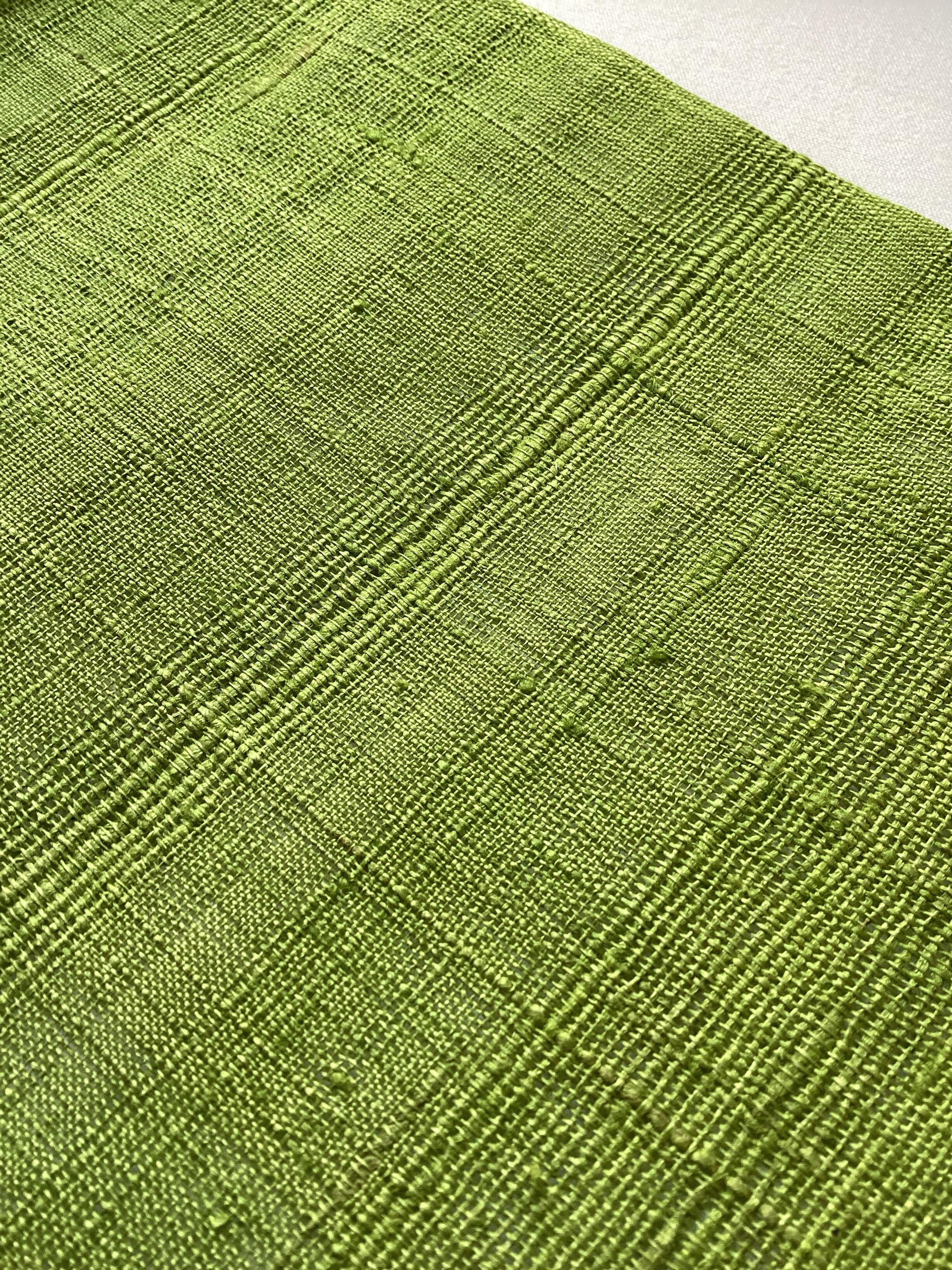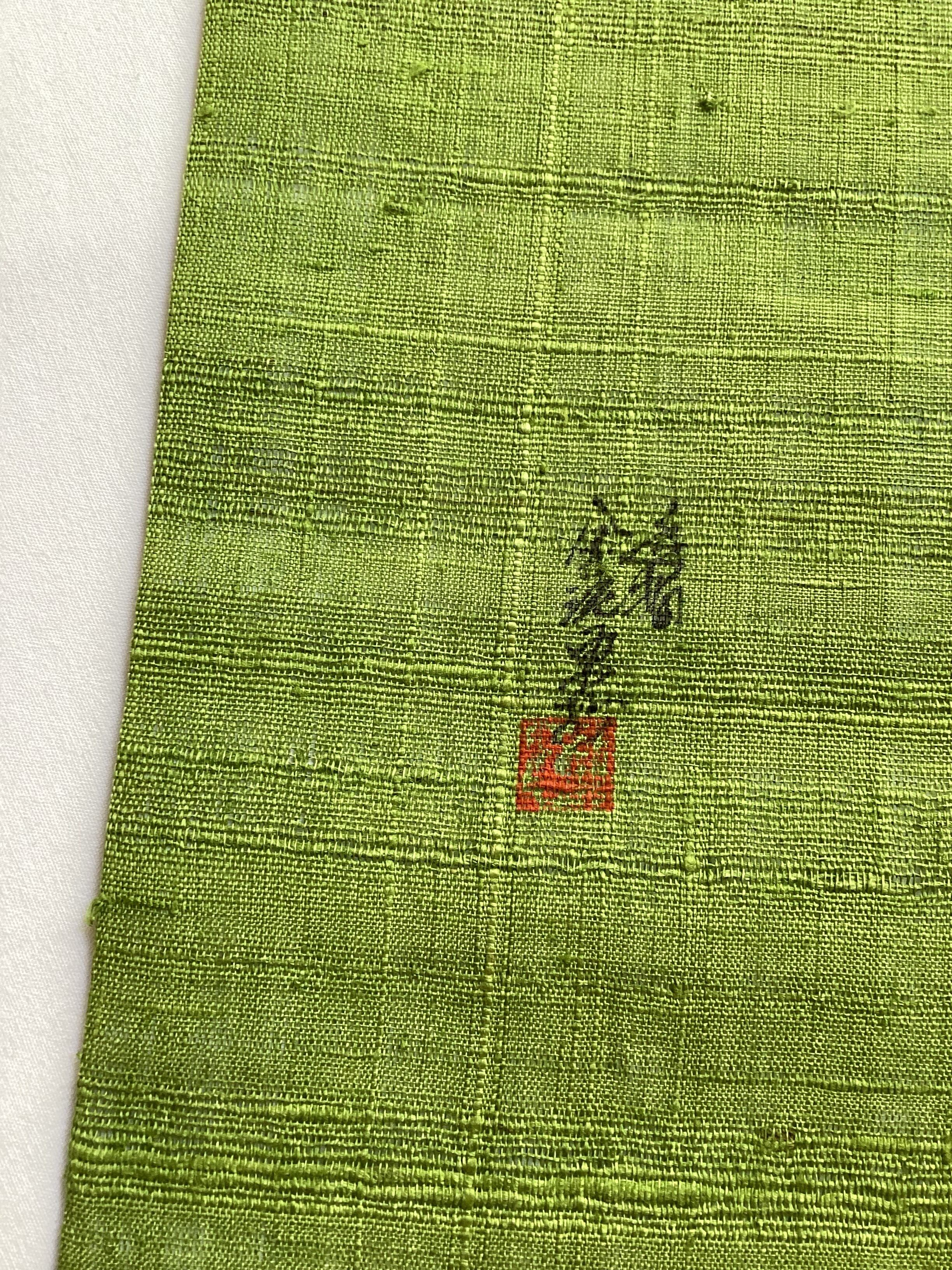 太い不揃いな紬糸を用いてざっくりと織り上げた素朴な織地の上に【大浦紫山】特有の金泥更紗の繊細な文様が描かれた九寸なごや帯です。苔色の鮮やかな黄緑色がパッと目を引いて、江戸更紗を極めた作者による手描き友禅の細やかな仕事が光る印象的な逸品です。コーディネートのアクセントにいかがでしょうか。