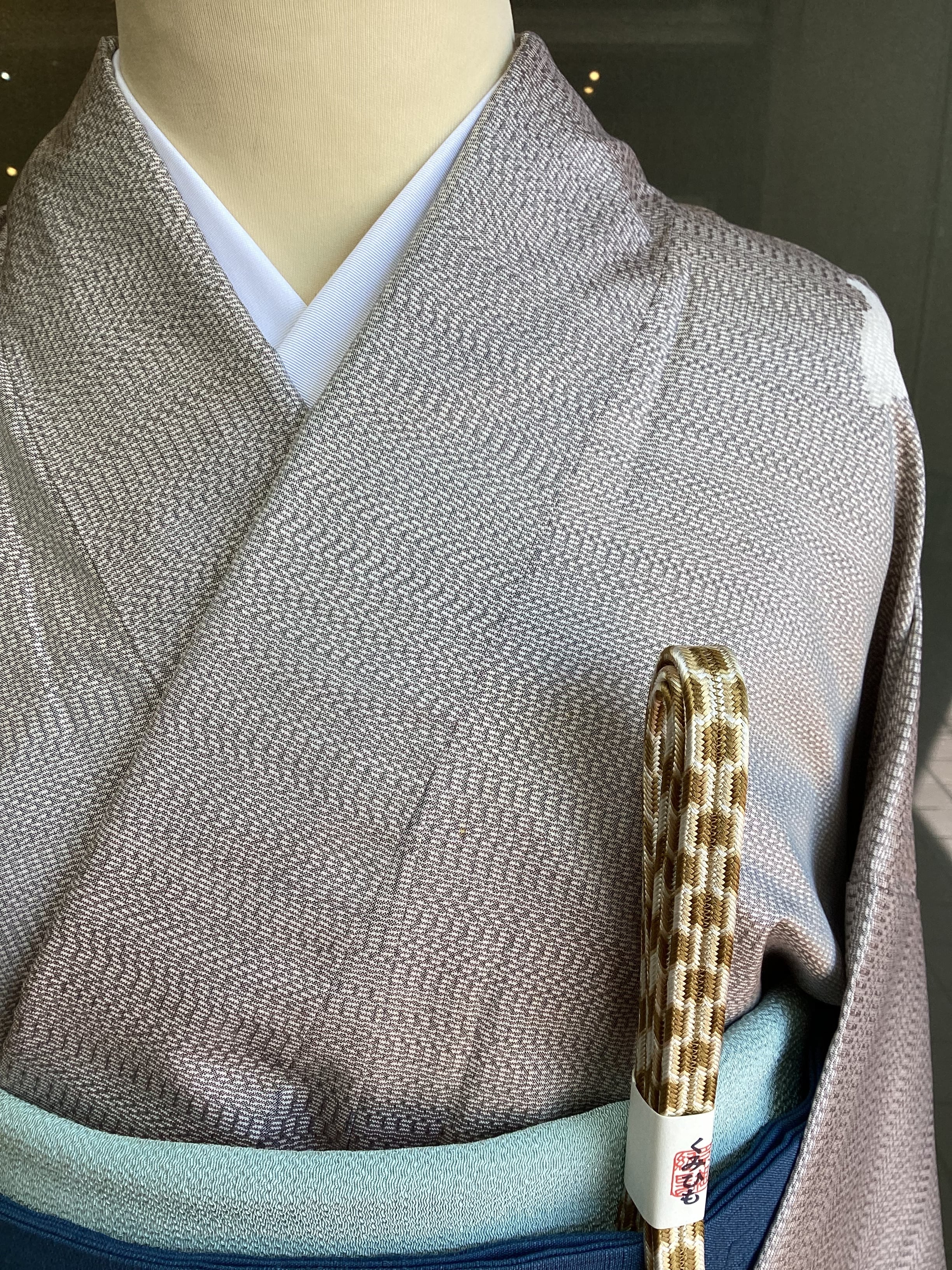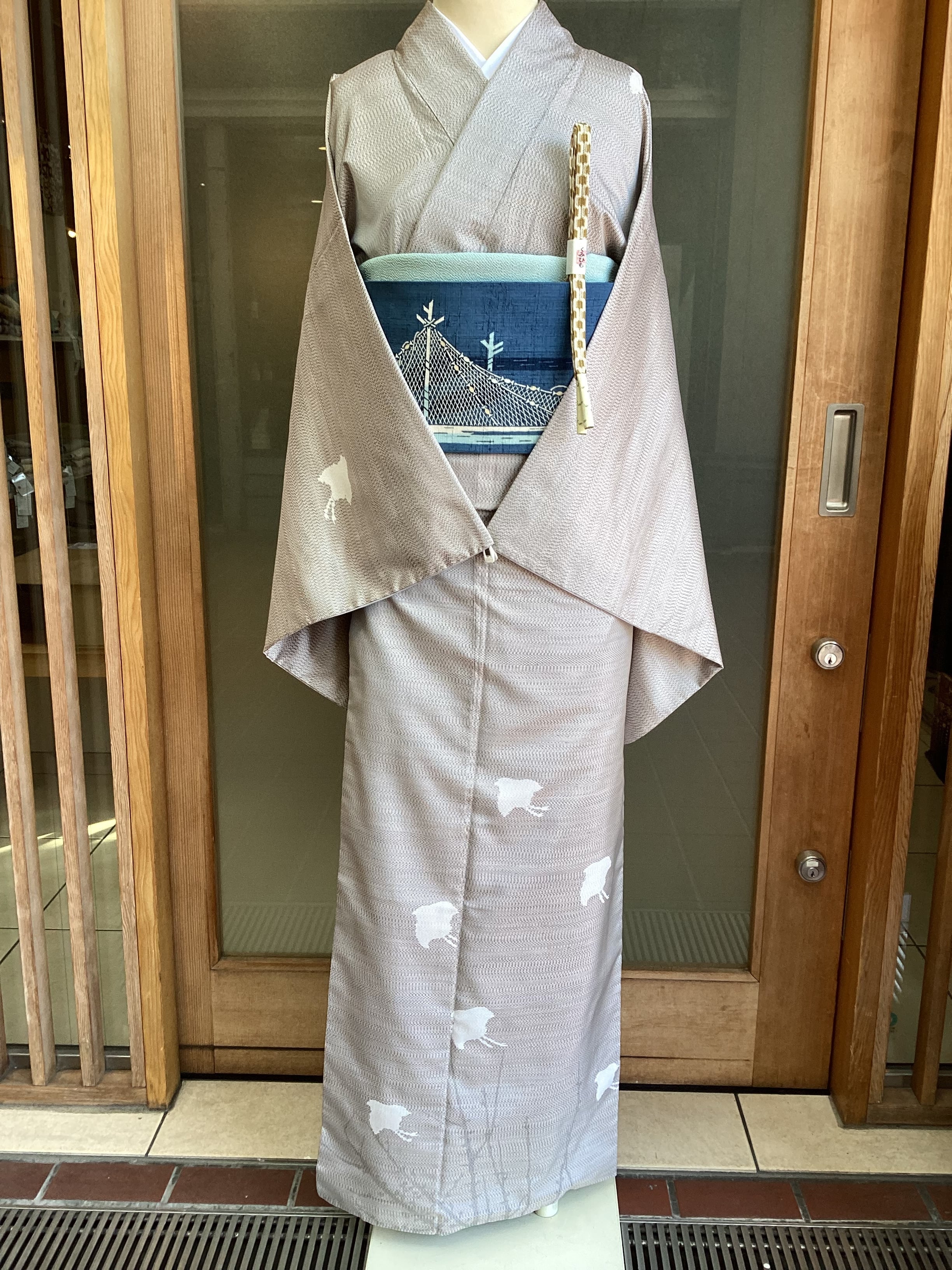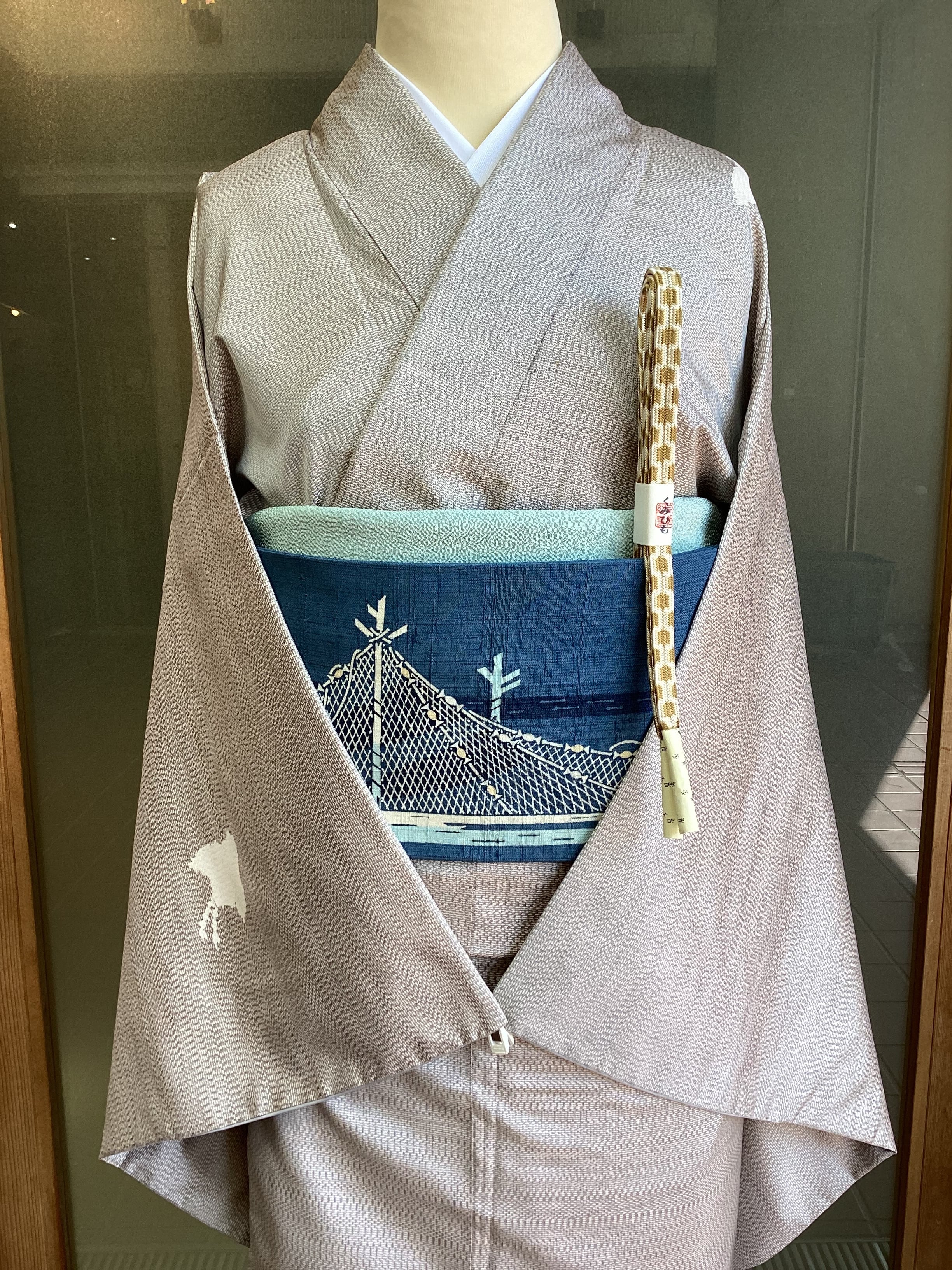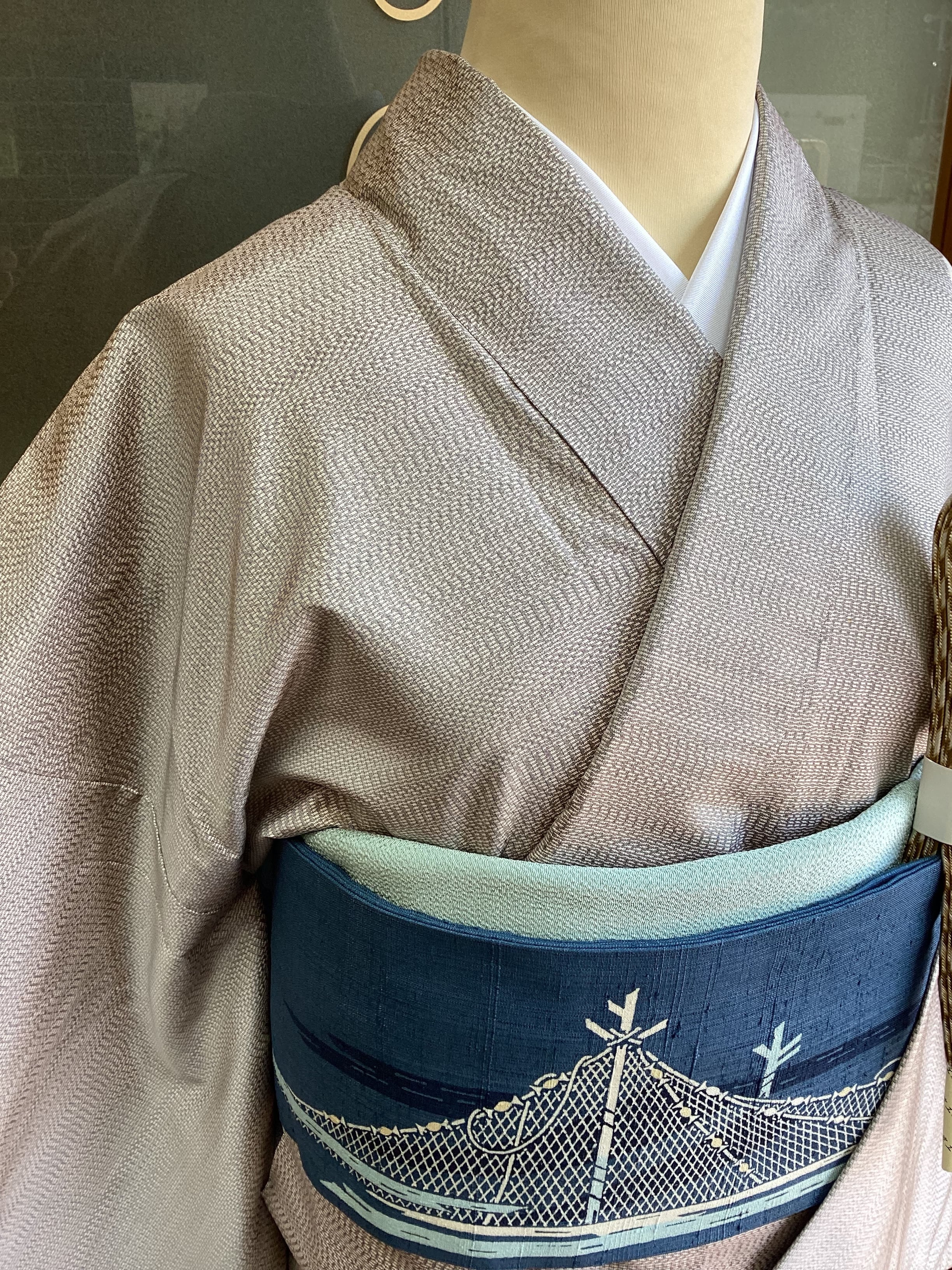つるりとした手触りで光沢があり、軽い【大島紬】と思われる袷のきものです。証紙はございません。遠目には無地のように見えるベースの織地は、極細の絹糸で大変緻密な幾何学文様が織り上げられており、近づくとその複雑な文様が浮かび上がって見えてきます。飛び立つ千鳥が附下柄で配置された、風情のあるおきものです。今回は、網干文様のなごや帯を合わせてみました。日本の水辺の風景の人の営みや鳥たち、音や風、臭いなど、想像力を掻き立てられるのも、きものの魅力ですね。身丈、裄丈、身幅が十分にございます。ゆったりトールサイズをお探しの方はいかがでしょうか。