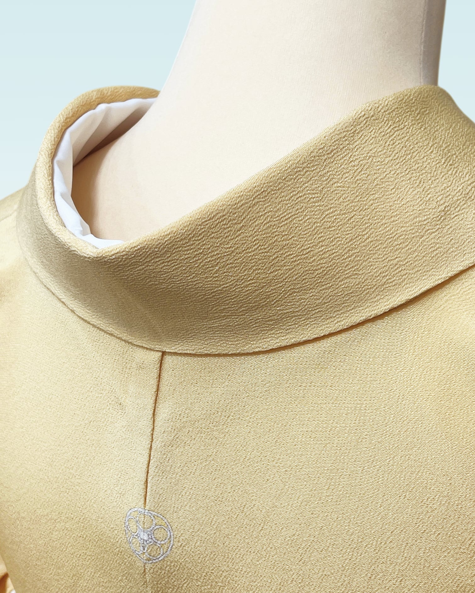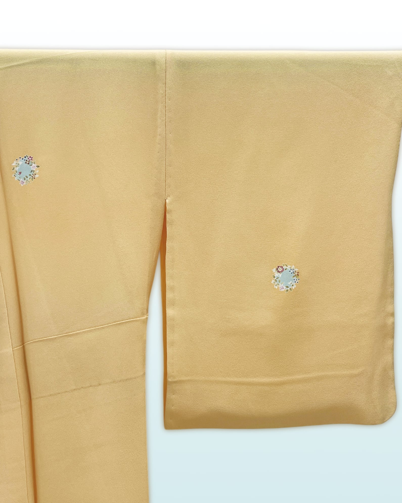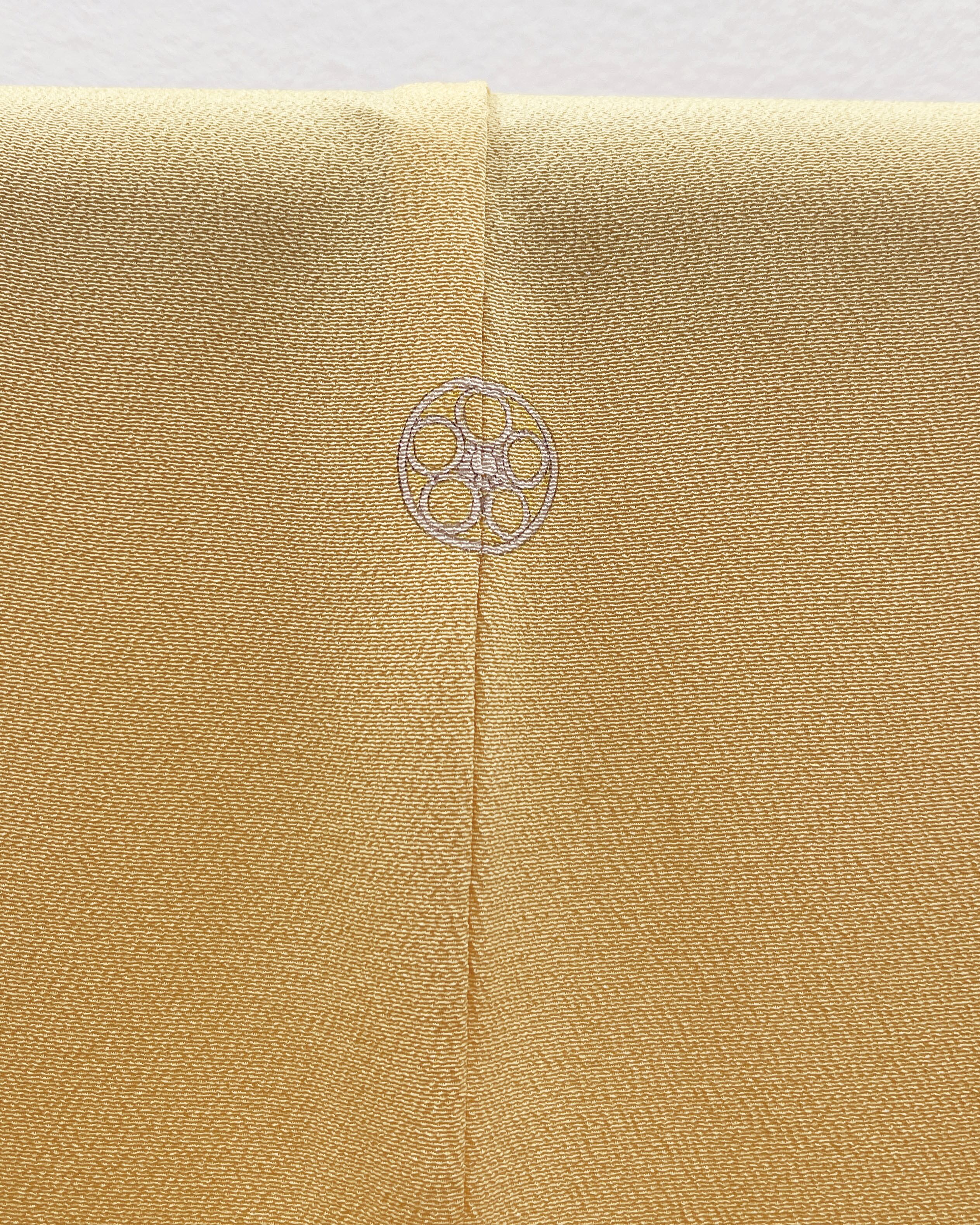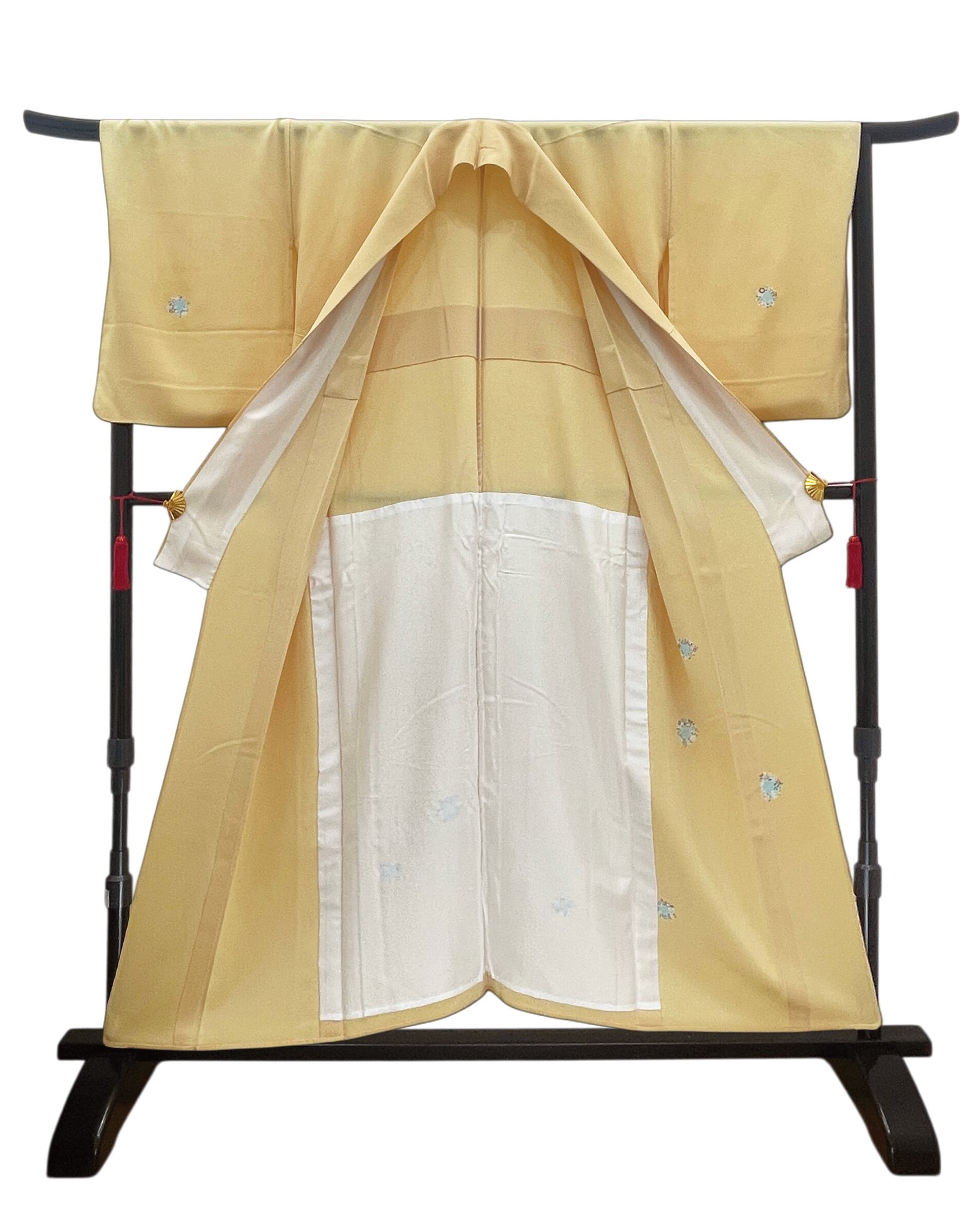 今回ご紹介させていただくお単衣は、淡い黄色に愛らしい小花丸文が散りばめられた付け下げです。