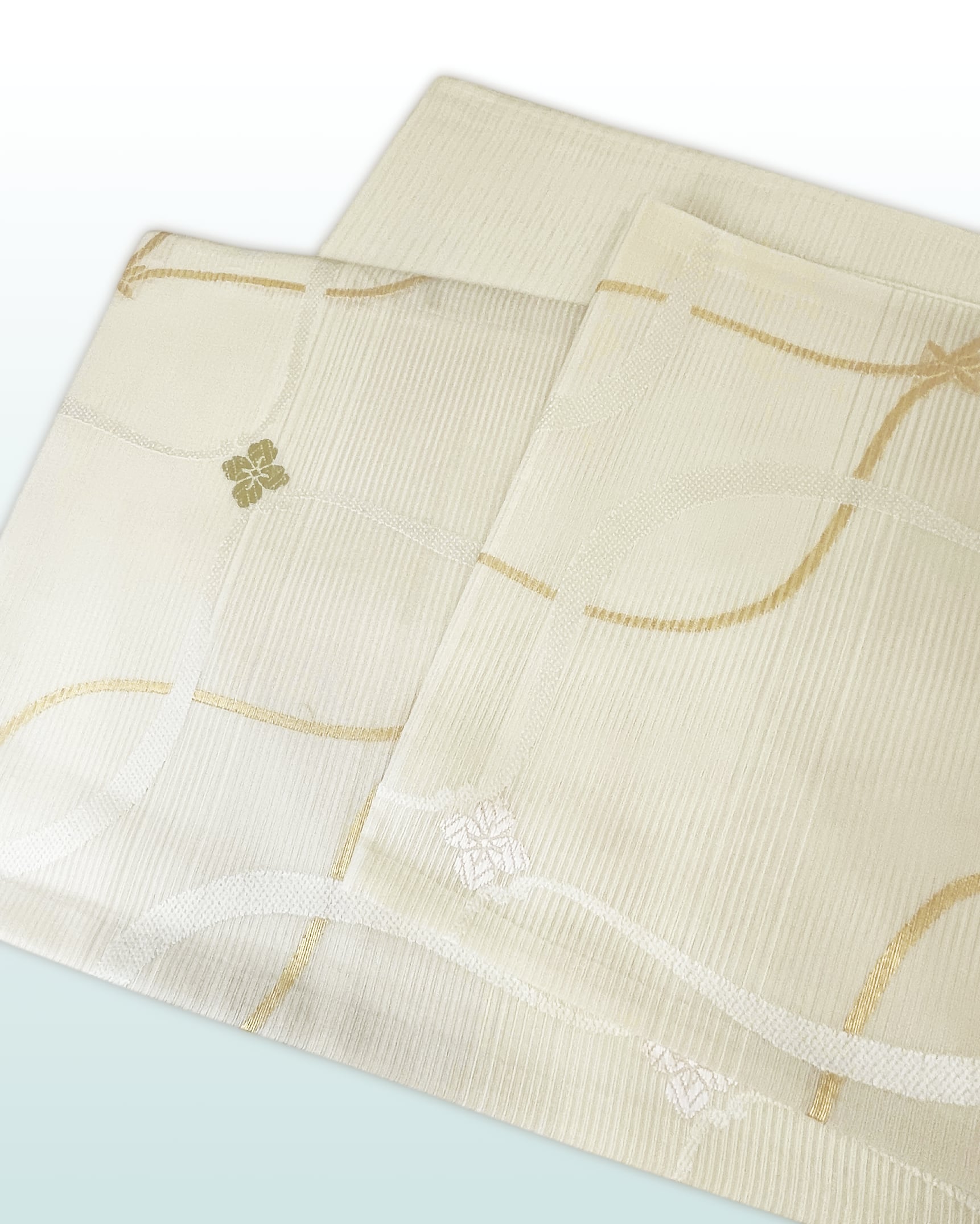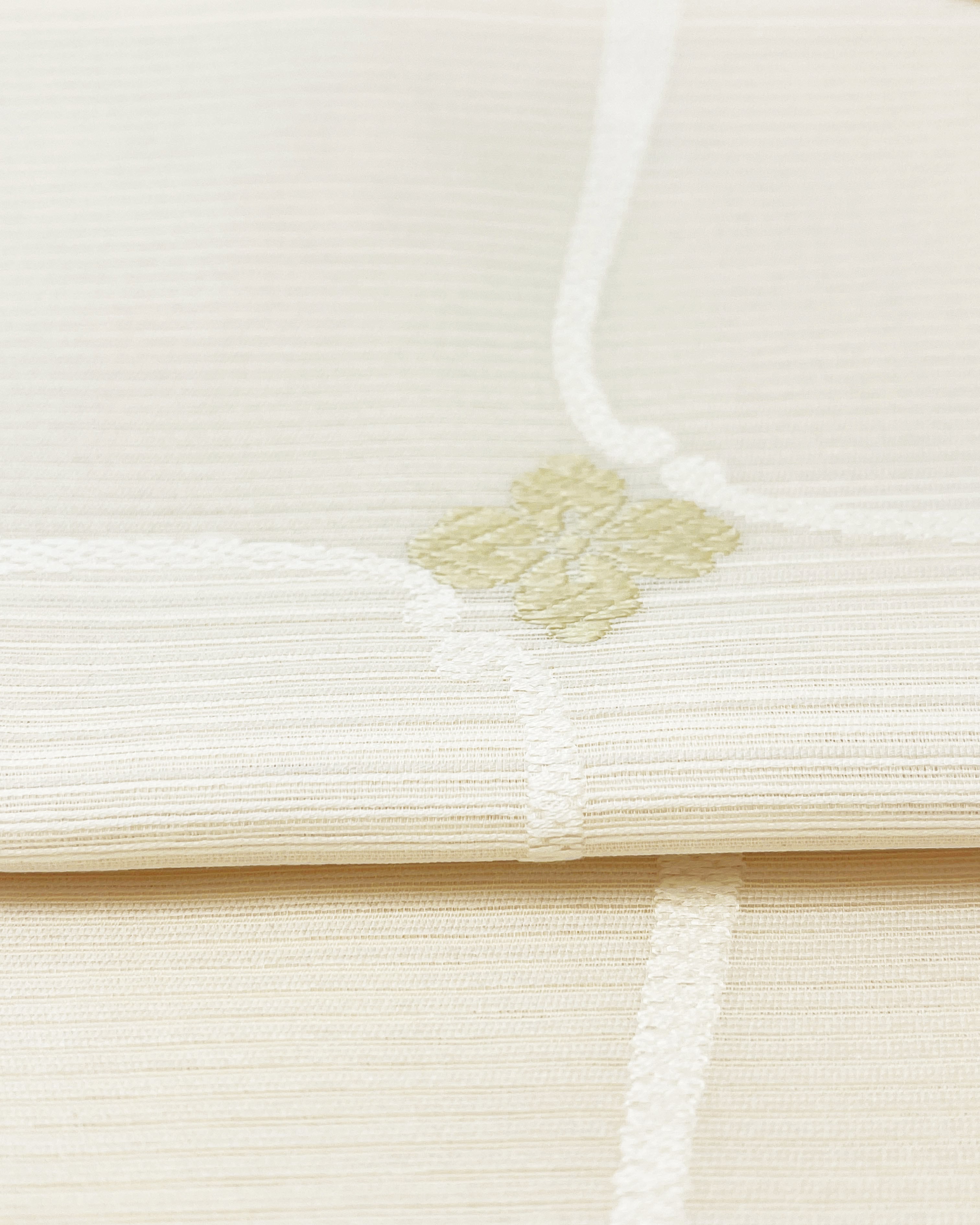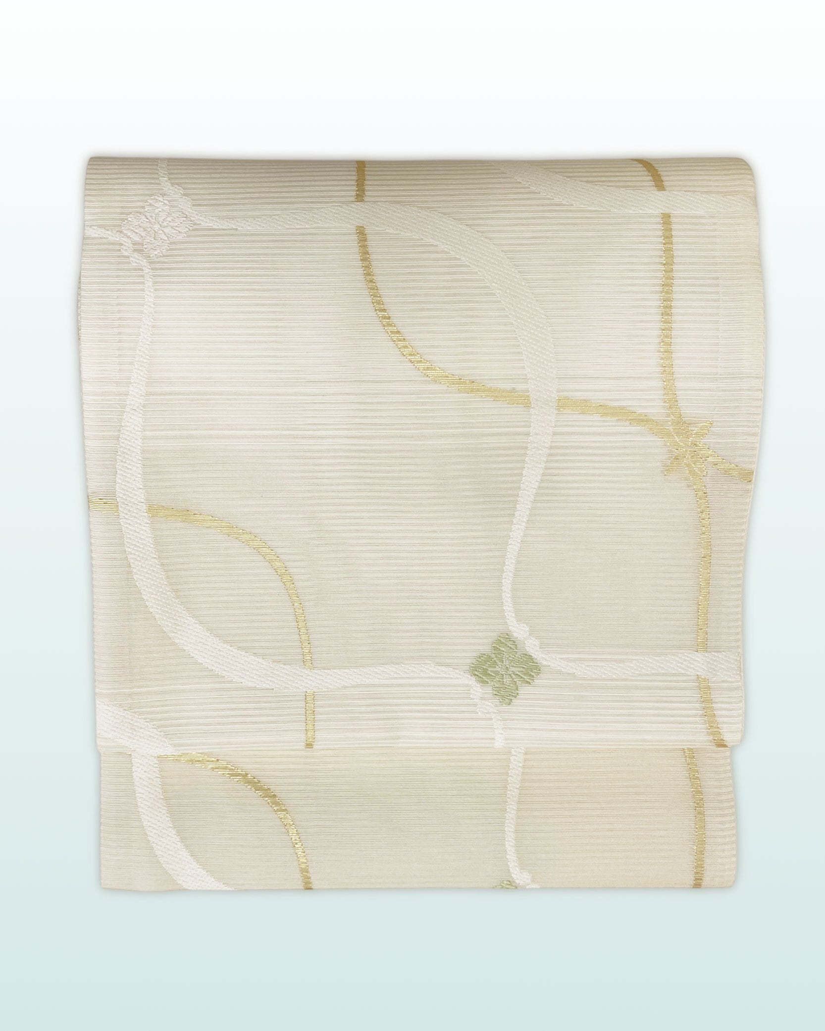 生成の夏地に白や金糸、淡い緑糸を織り込んだ夏の袋帯です。夏素材ですがカジュアルからフォーマルまでさまざまなシーンでお使いいただけます。