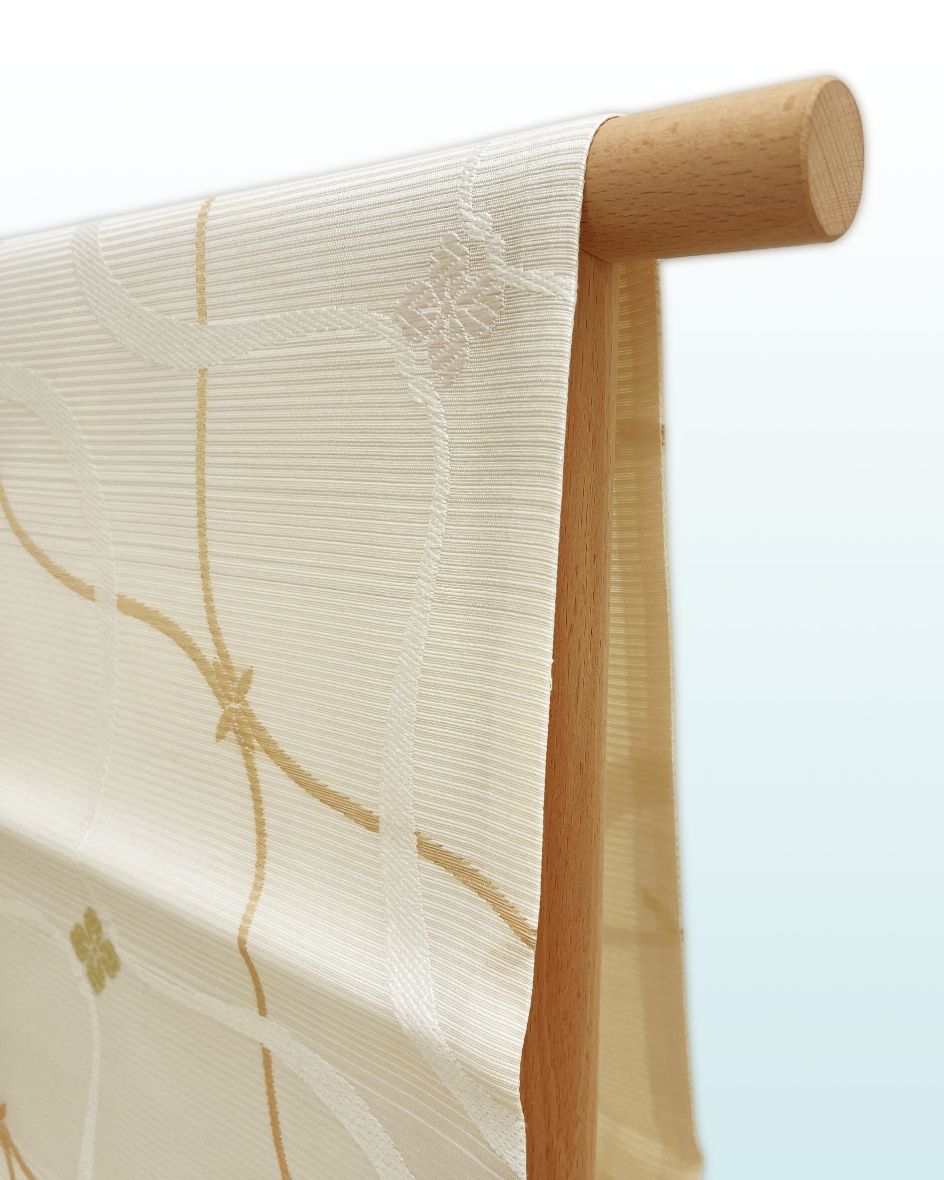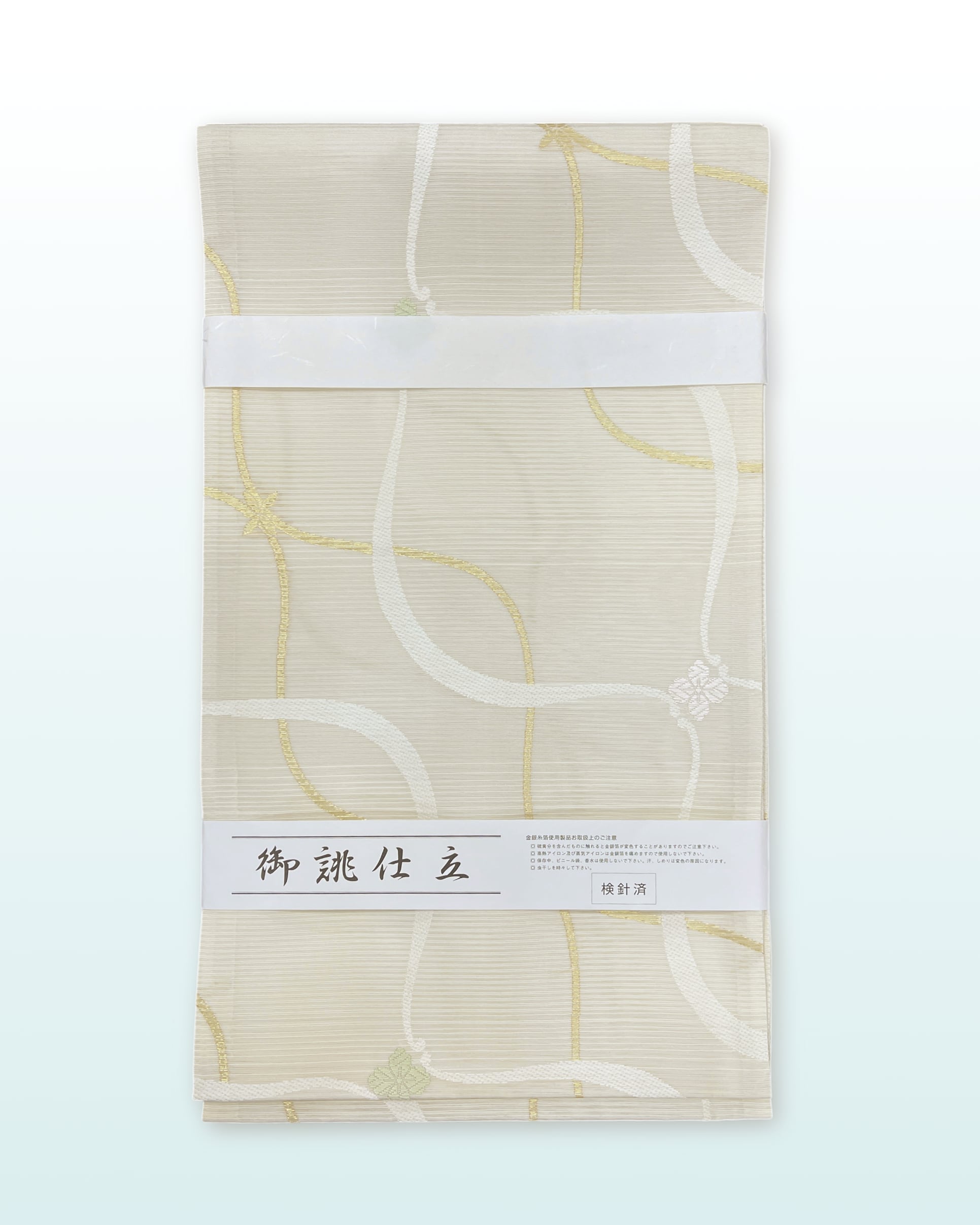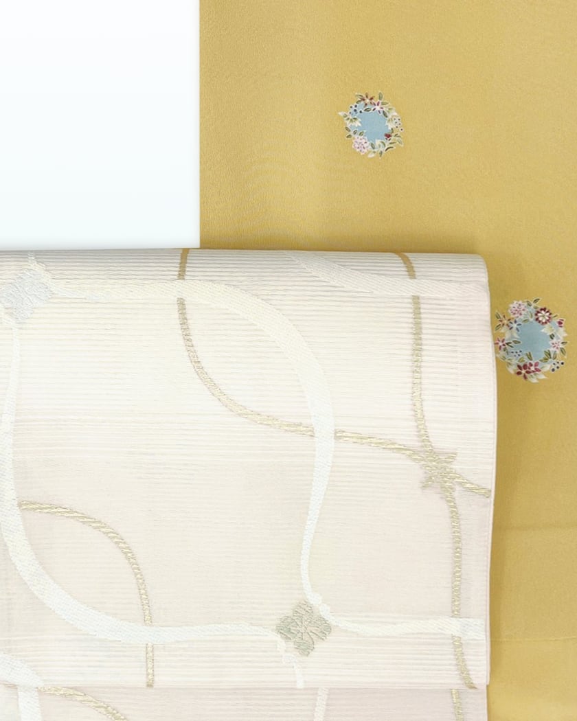 生成の夏地に白や金糸、淡い緑糸を織り込んだ夏の袋帯です。夏素材ですがカジュアルからフォーマルまでさまざまなシーンでお使いいただけます。