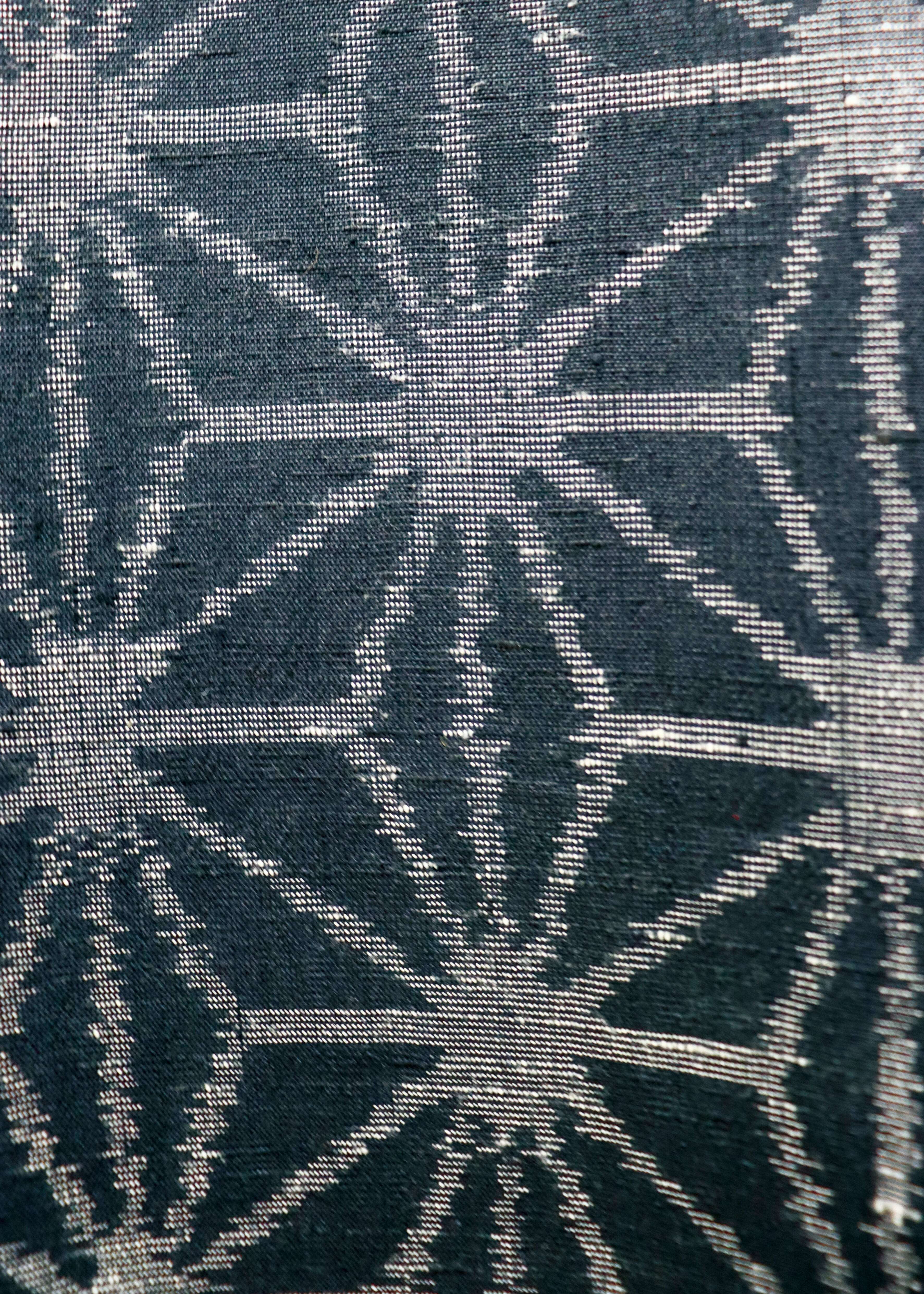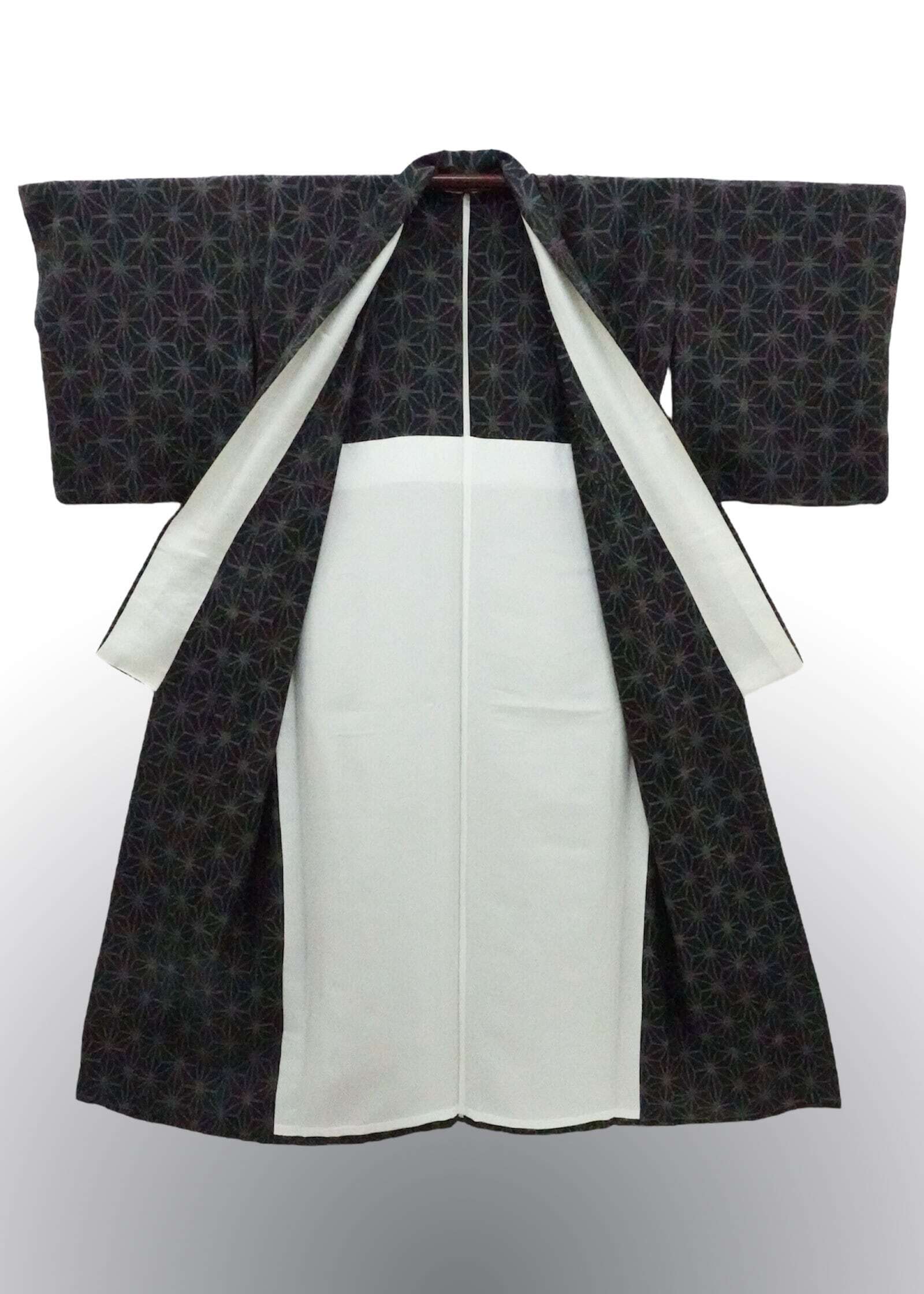 結城ちぢみは結城紬の織りの一種で、横糸に強撚糸(強く撚りをかけた糸)を用いることで、湯通し・糊付け処理後に表面に細かな凹凸(シボ)が生まれるさらりとした風合いが特徴です。結城紬が「軽くて暖かい」のに対し、結城縮は「軽くて涼やか」で、単衣(ひとえ)の着物として単衣の時期に好まれます。今回ご紹介するのは大きな麻の葉柄を持つ濃紺のちぢみです。重厚な中に繊細さを併せ持つ品格のある紬です。