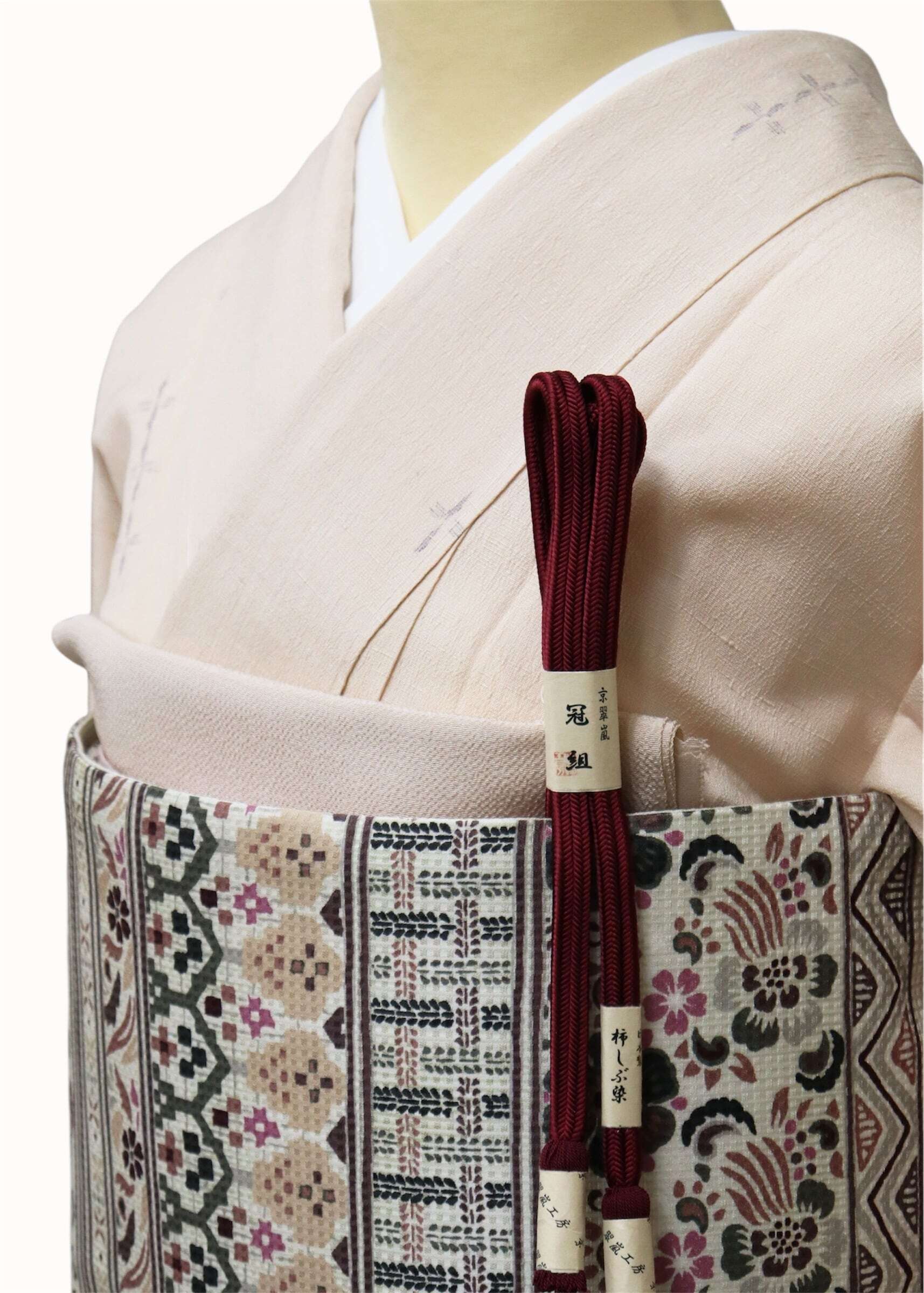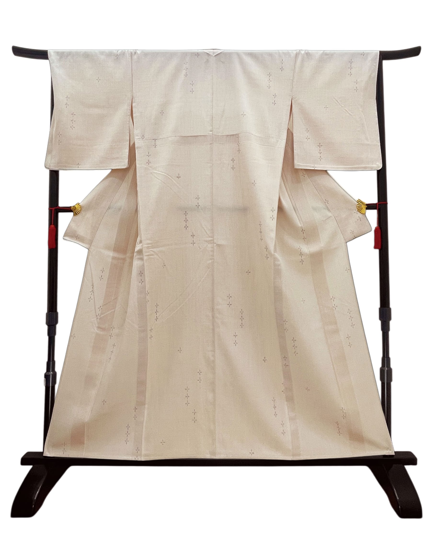 結城市を代表する織元さんである奥順の結城ちぢみです。デリケートなクリームピンクに非常に上品な十字絣が織り込まれています。結城ちぢみは本場結城紬の一種で、経糸に無撚糸、緯糸に強撚糸を使用して織られる織物です。湯通しして糊を落とすと、撚り糸が元に戻る作用で表面に細かなシボ(凹凸)が現れ、さらりとした清涼感のある肌触りが特徴です。結城紬の柔らかさと異なり、軽やかで涼しい着心地が人気で、特に単衣(ひとえ)の時期に最適な着物とされています。