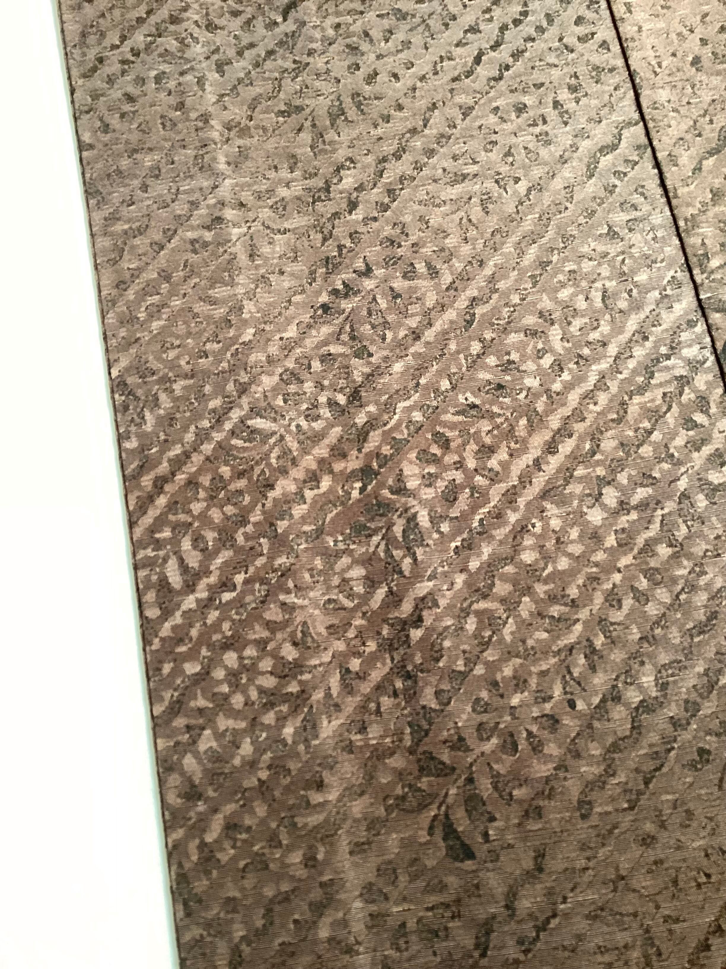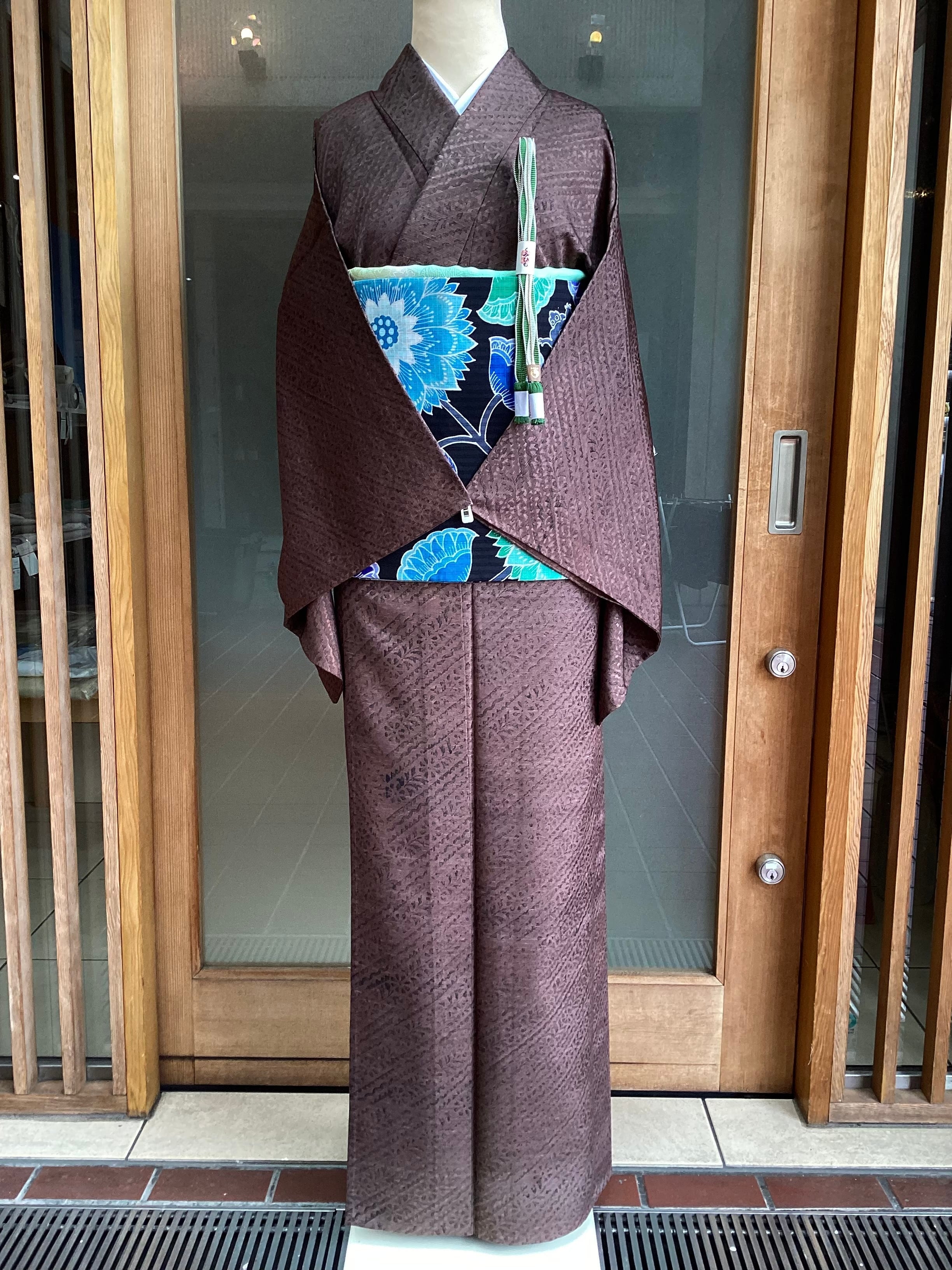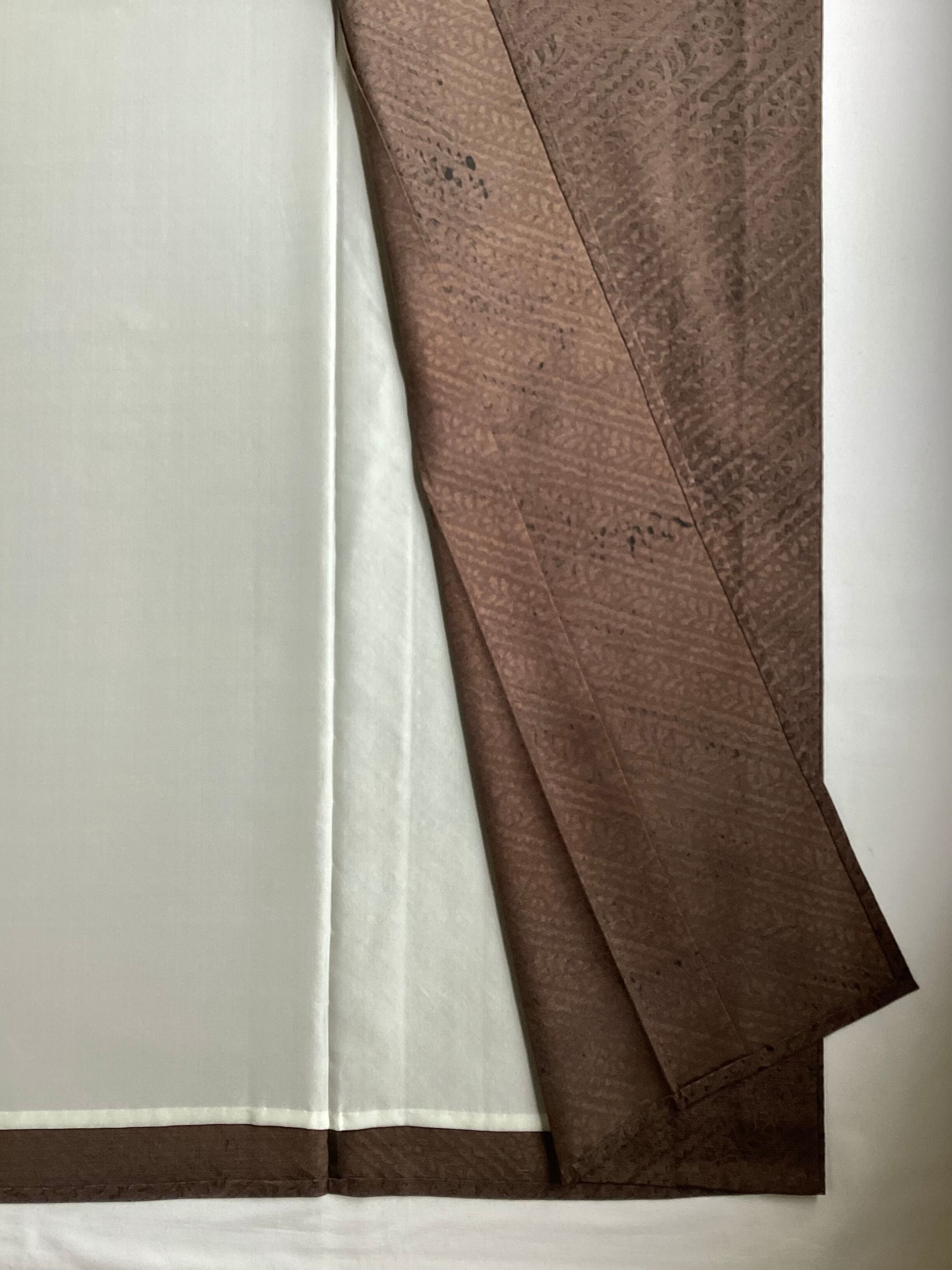 染色の起源である古代印度更紗の研究のため、10年にわたりインドを歴訪し古代の文様の版木を入手し、古代印度木版更紗の復元に成功した【川端美朝】作の紬きもののご紹介です。更紗の原点とされる木版による古代インド更紗。こちらのおきものは、こっくりとした焦茶色に染められた上質な紬地の上に斜め縞の更紗文様が木版で押されております。型染めとは違う独特のかすれ具合がなんとも味わい深い逸品です。手で版木を直に押し重ねる技法は、そのときどきに出来る顔料の濃淡や色のたまり、版木の合わせのずれなど、手仕事の温かみや面白みを感じます。【銀座もとじ】扱いの通好みな上質なおきものは、カジュアルなお出掛けをランクアップしてくれます。