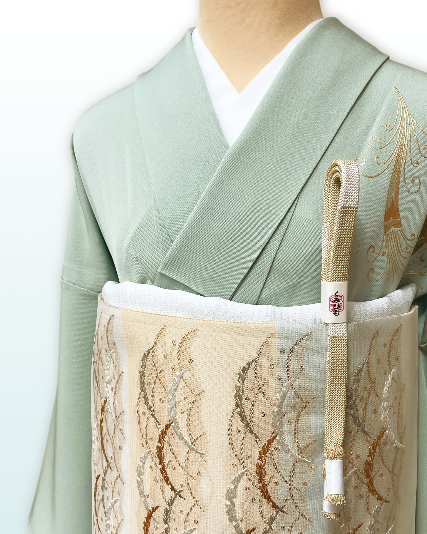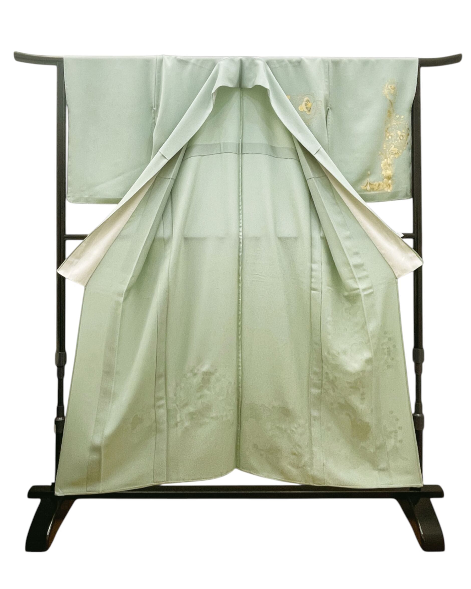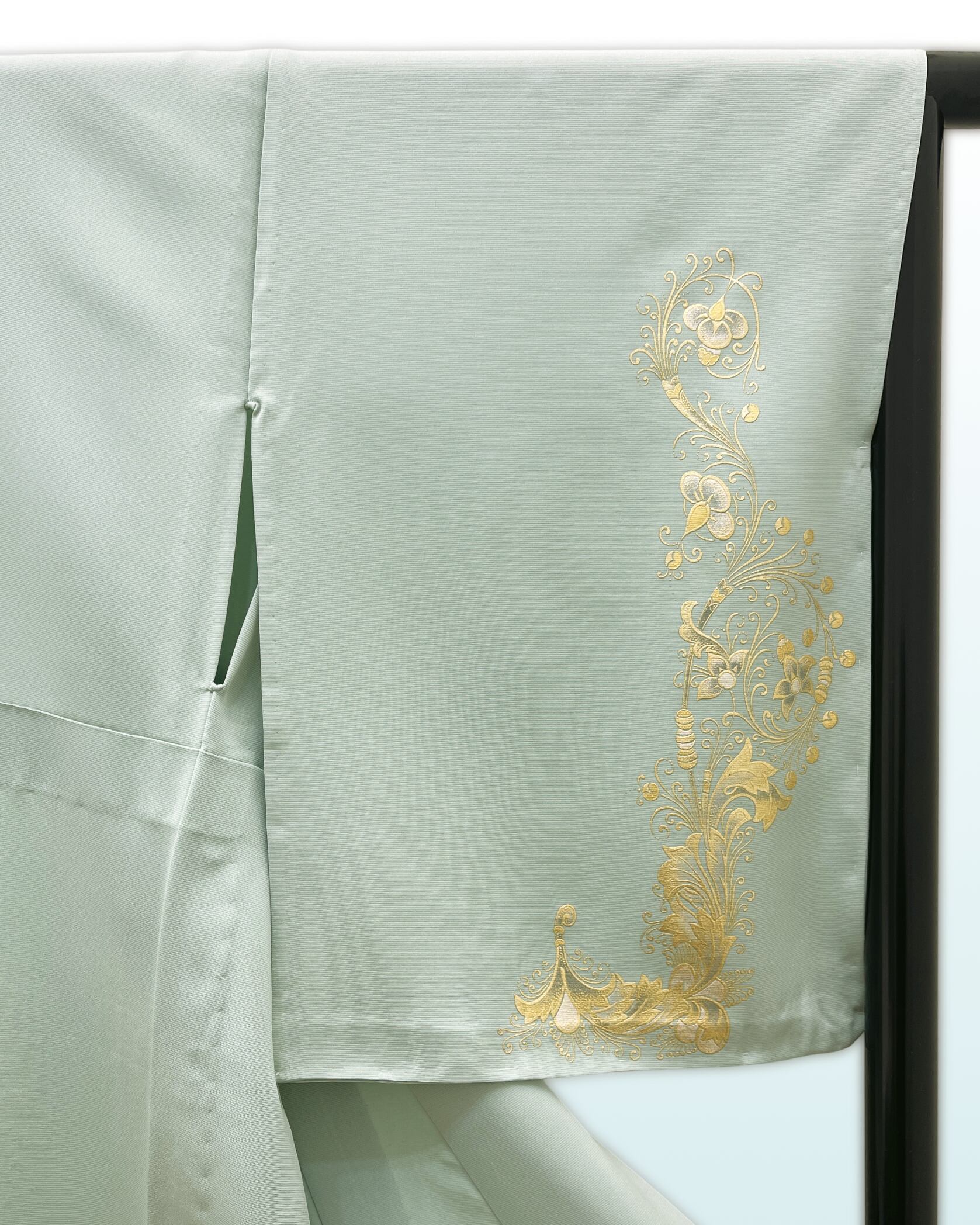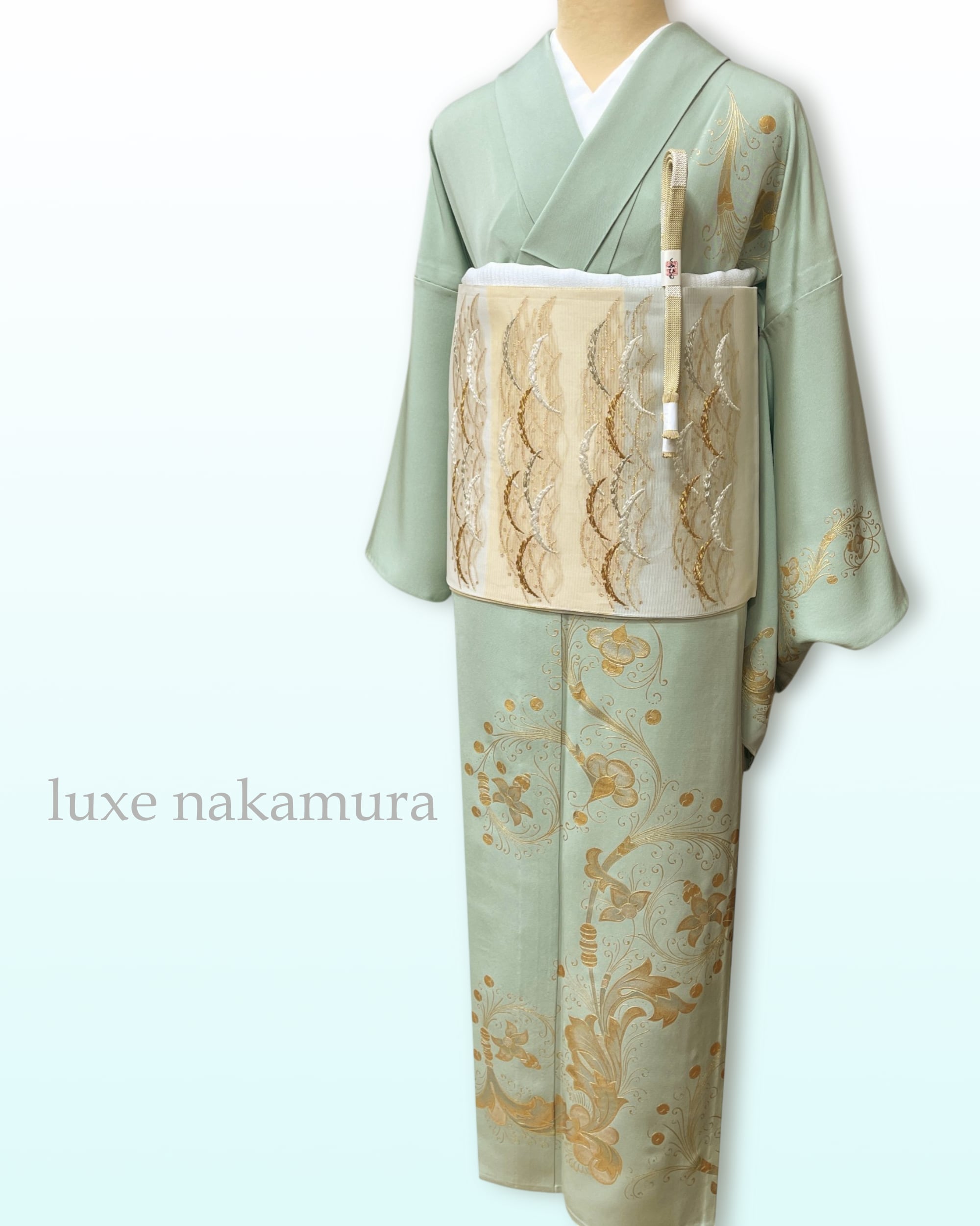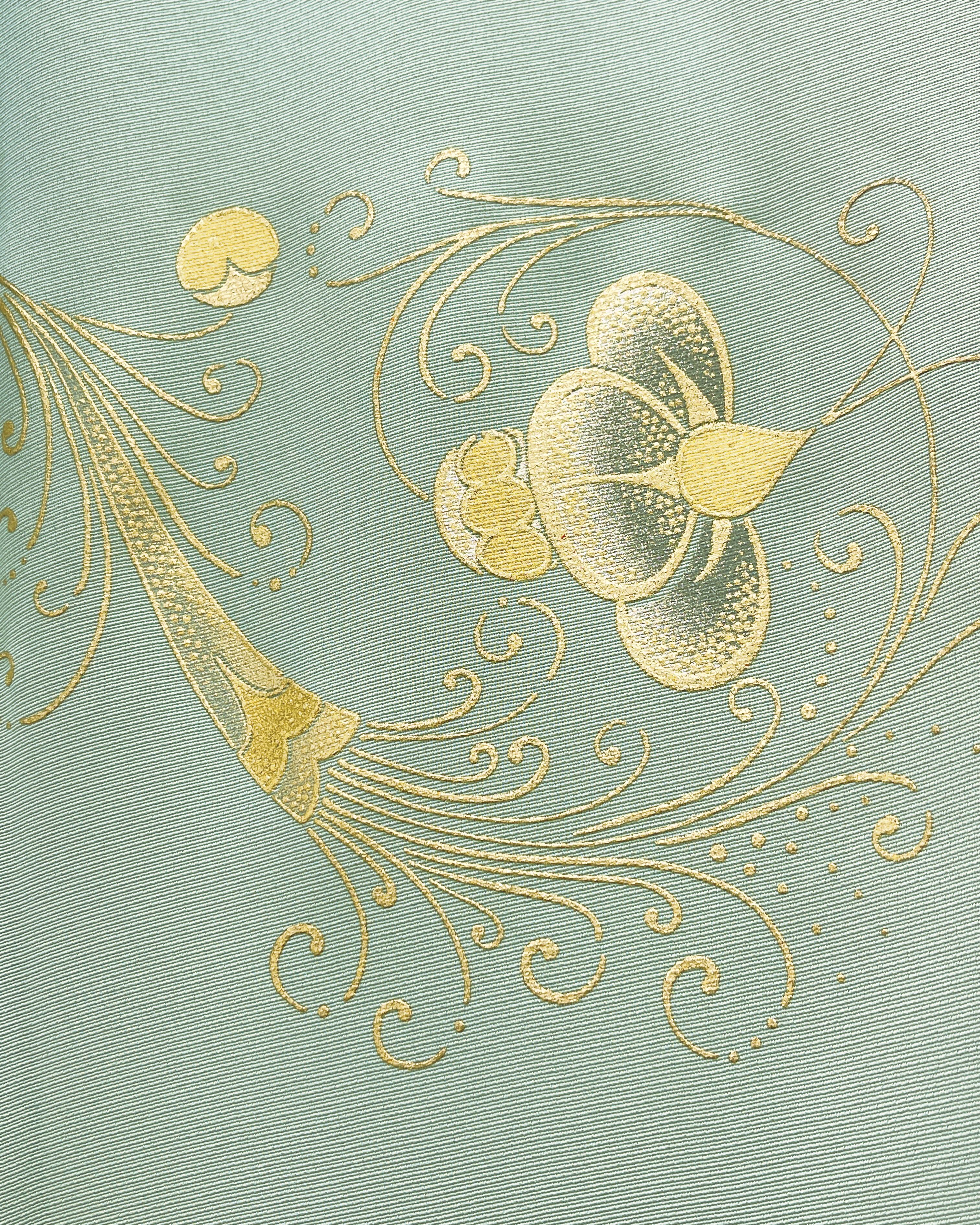 その青磁の色をベースに金彩で描かれた唐花は、季節を限ることもなく優雅な柄ゆきでセミフォーマルからフォーマルのお席にお召しいただけます。