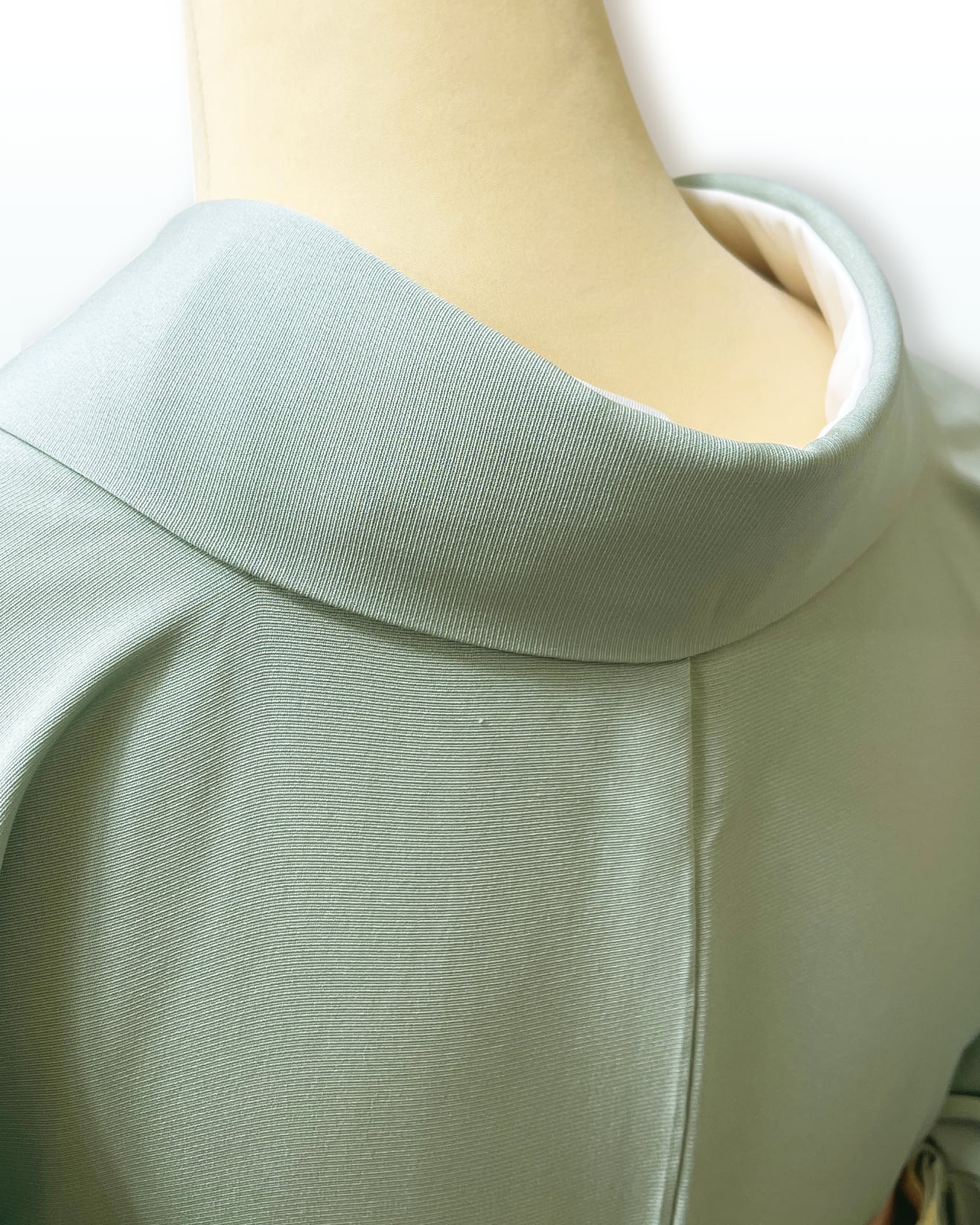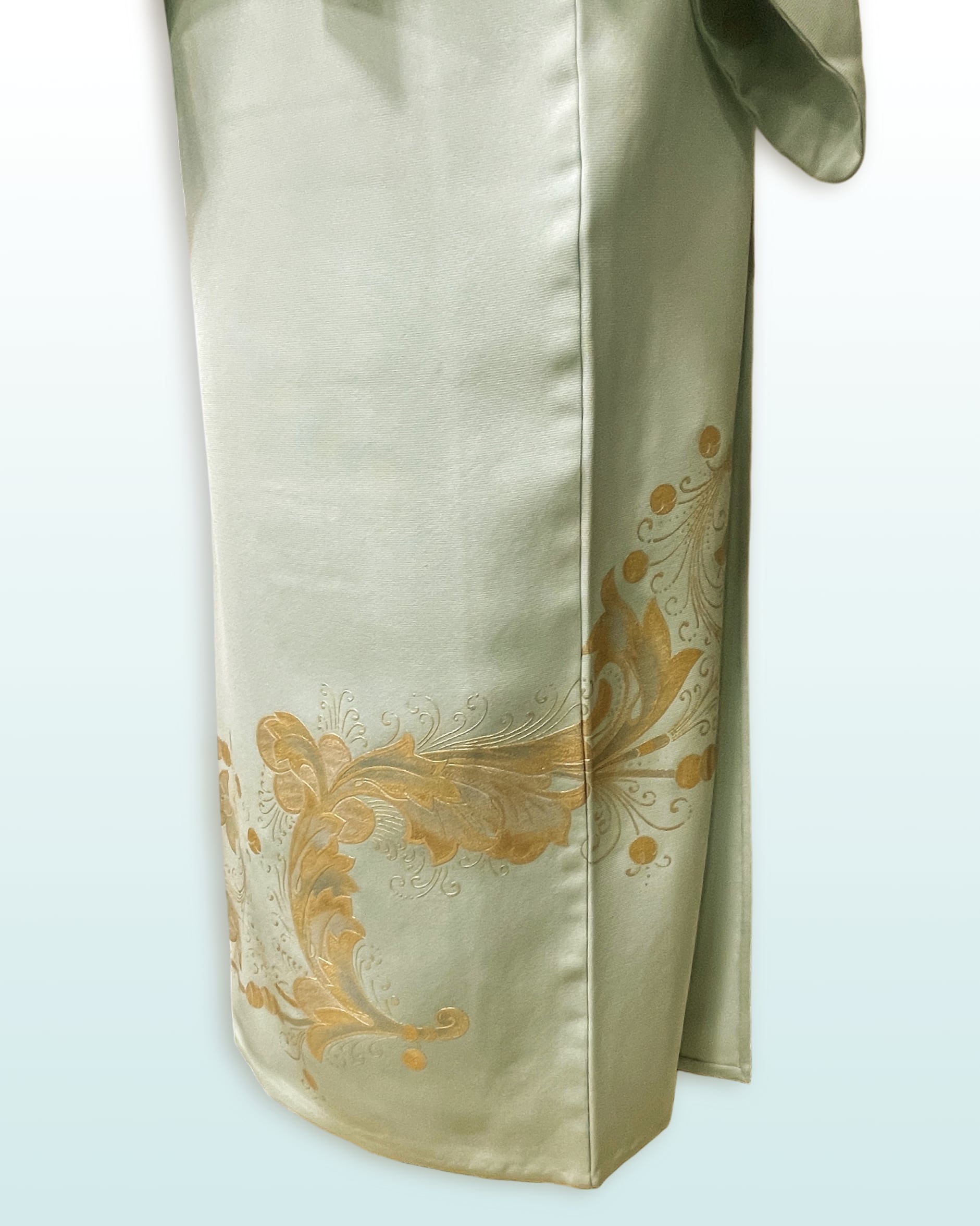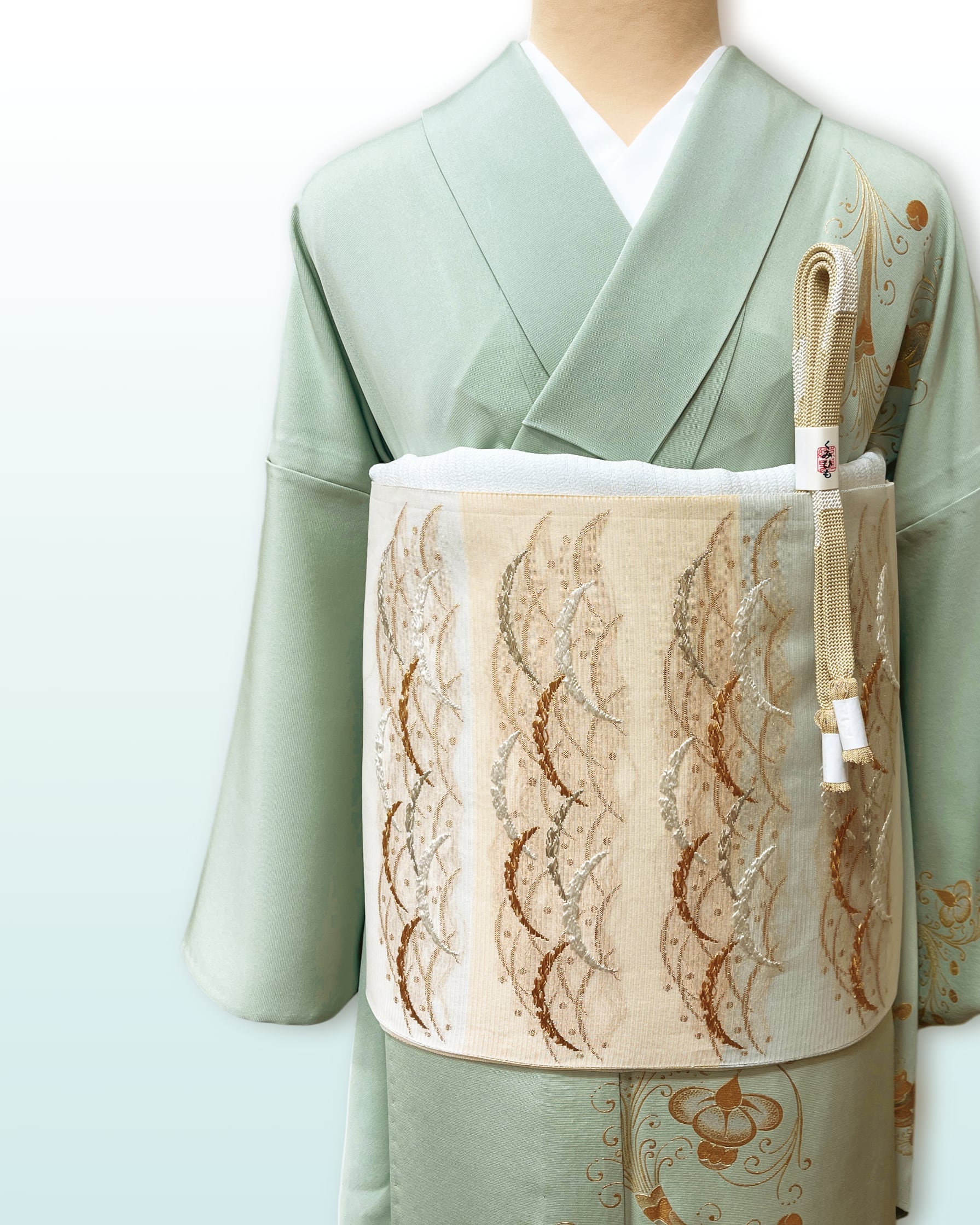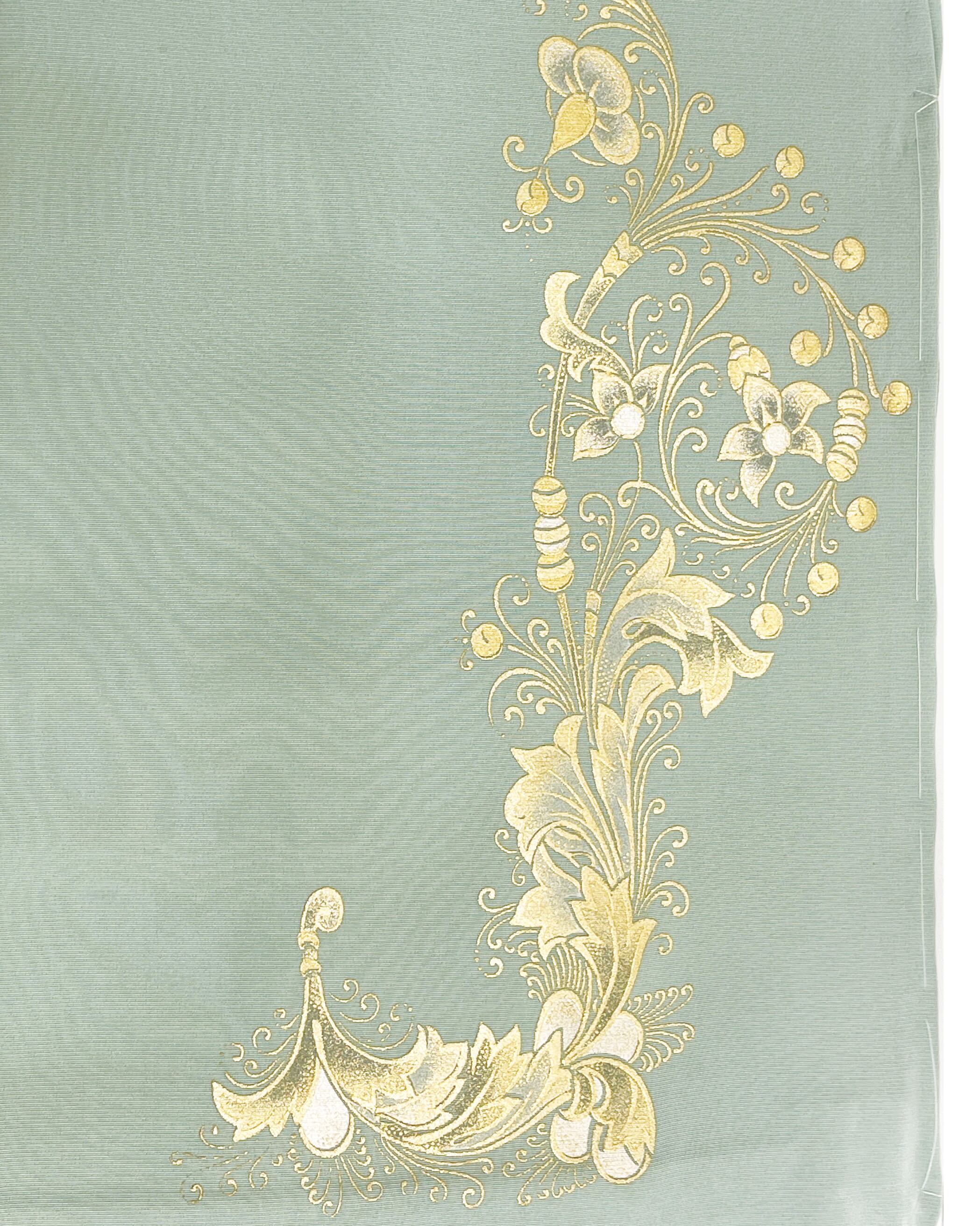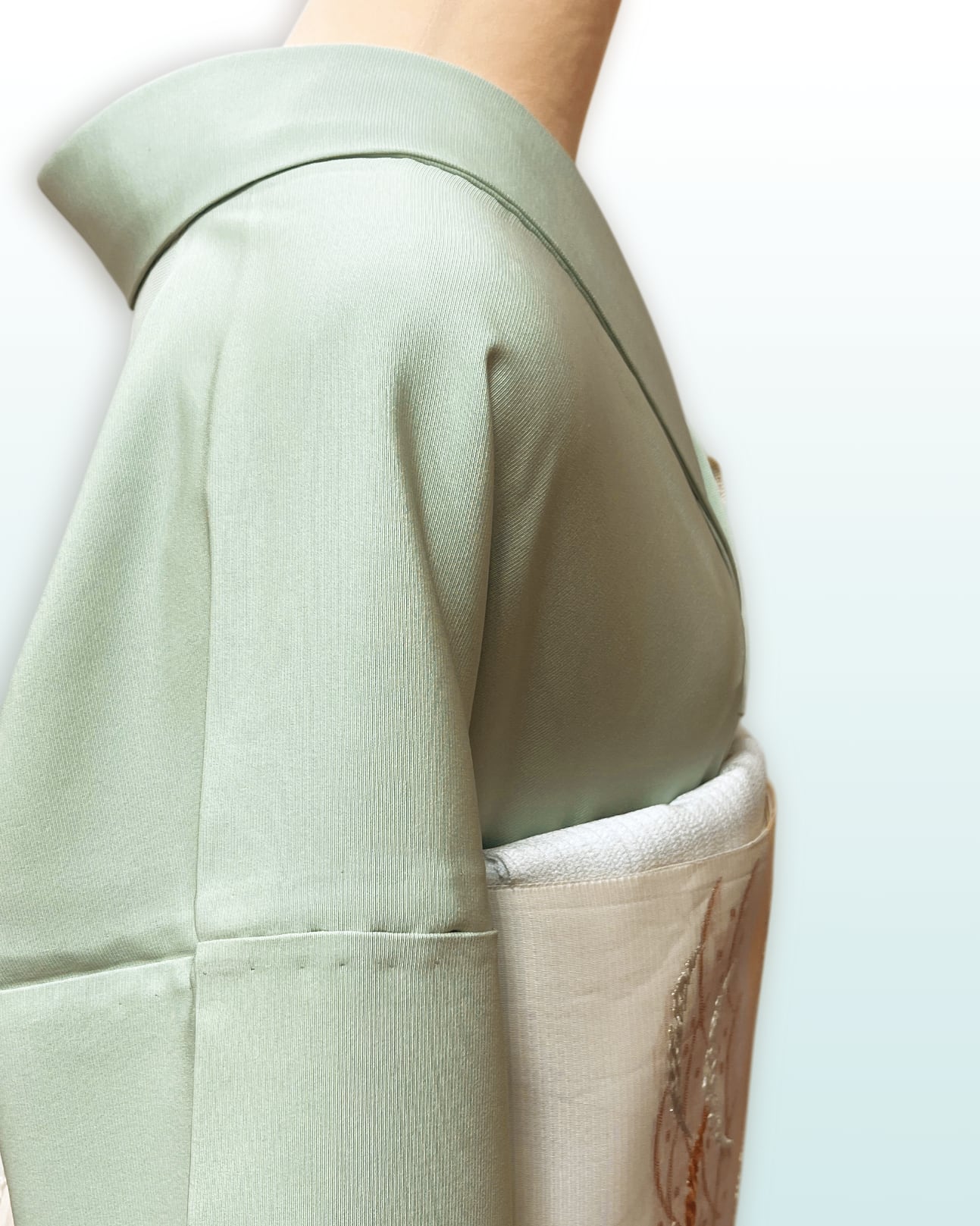 その青磁の色をベースに金彩で描かれた唐花は、季節を限ることもなく優雅な柄ゆきでセミフォーマルからフォーマルのお席にお召しいただけます。