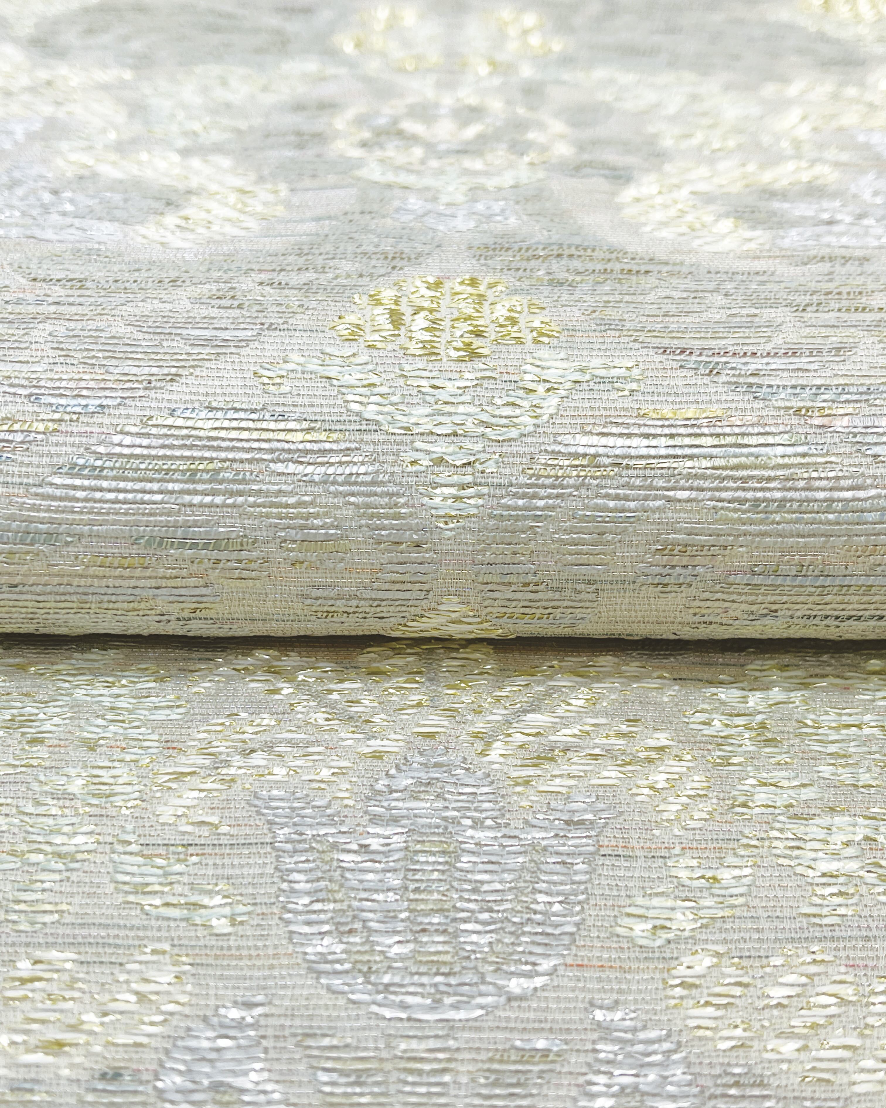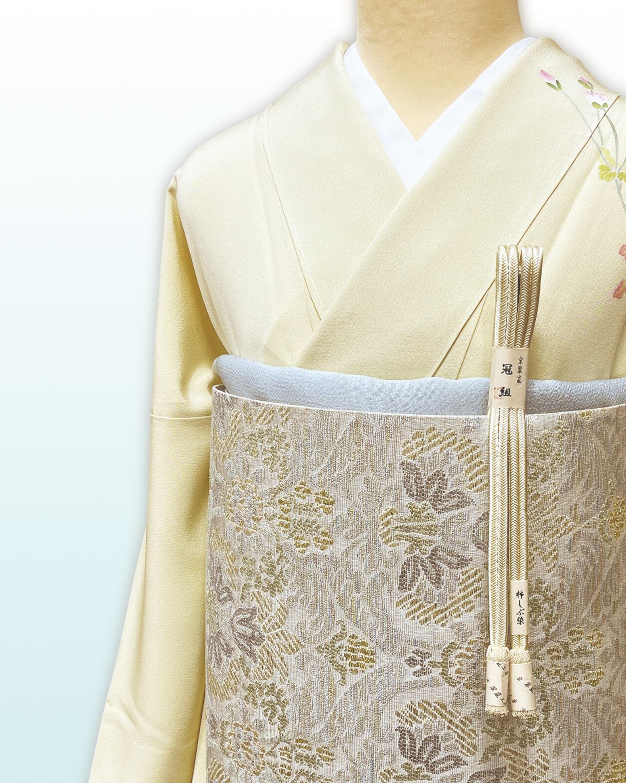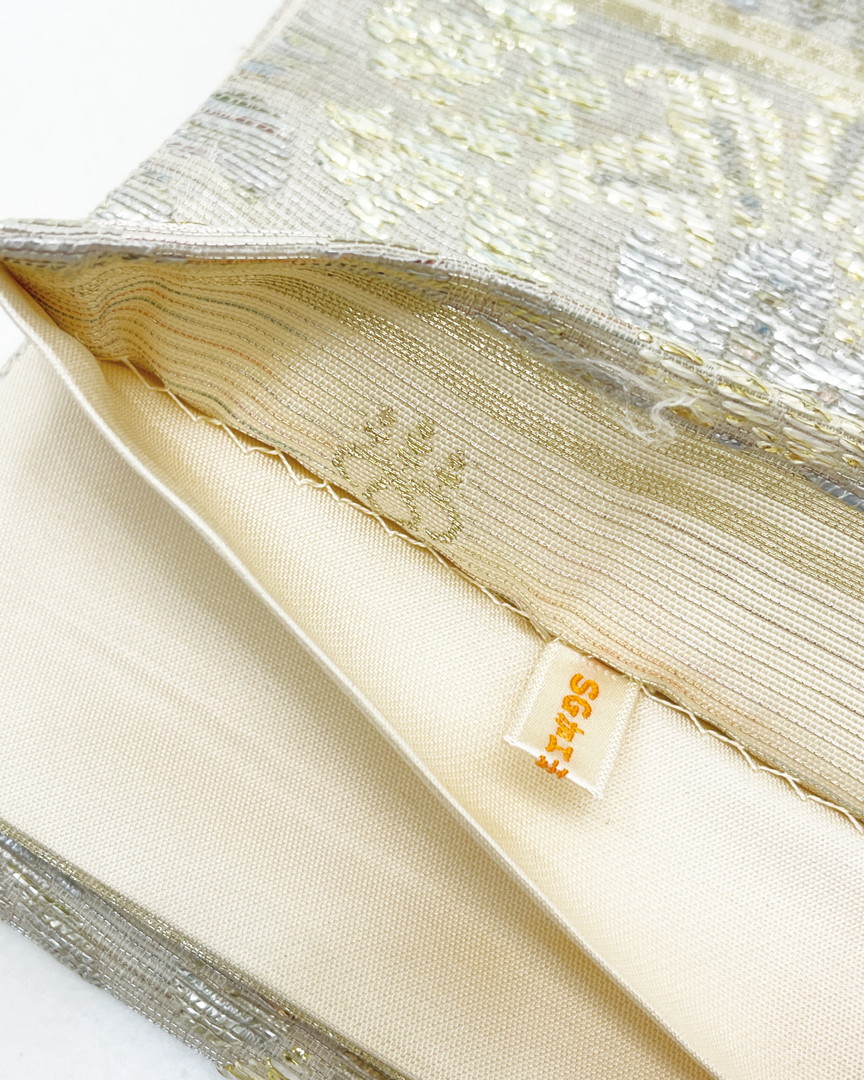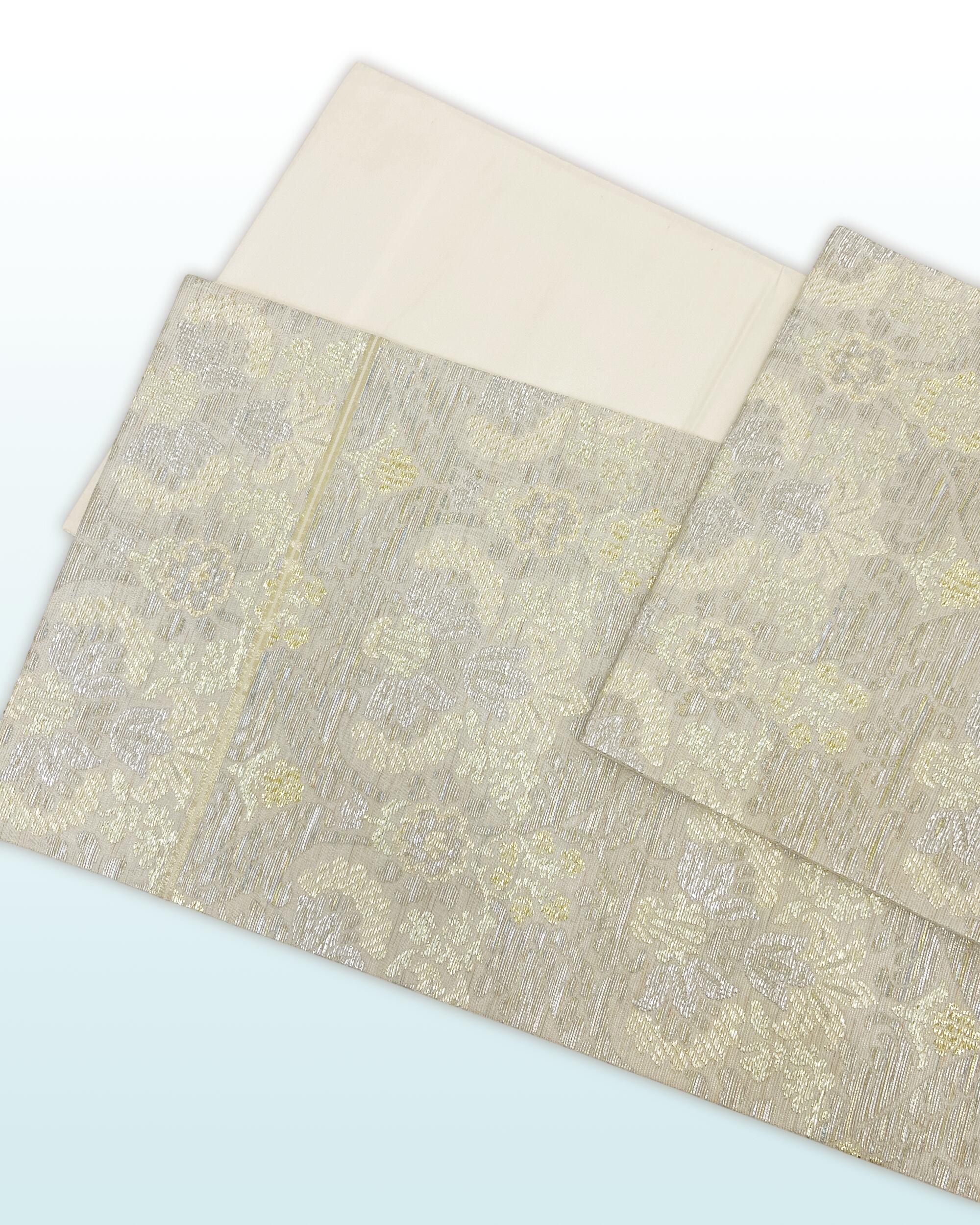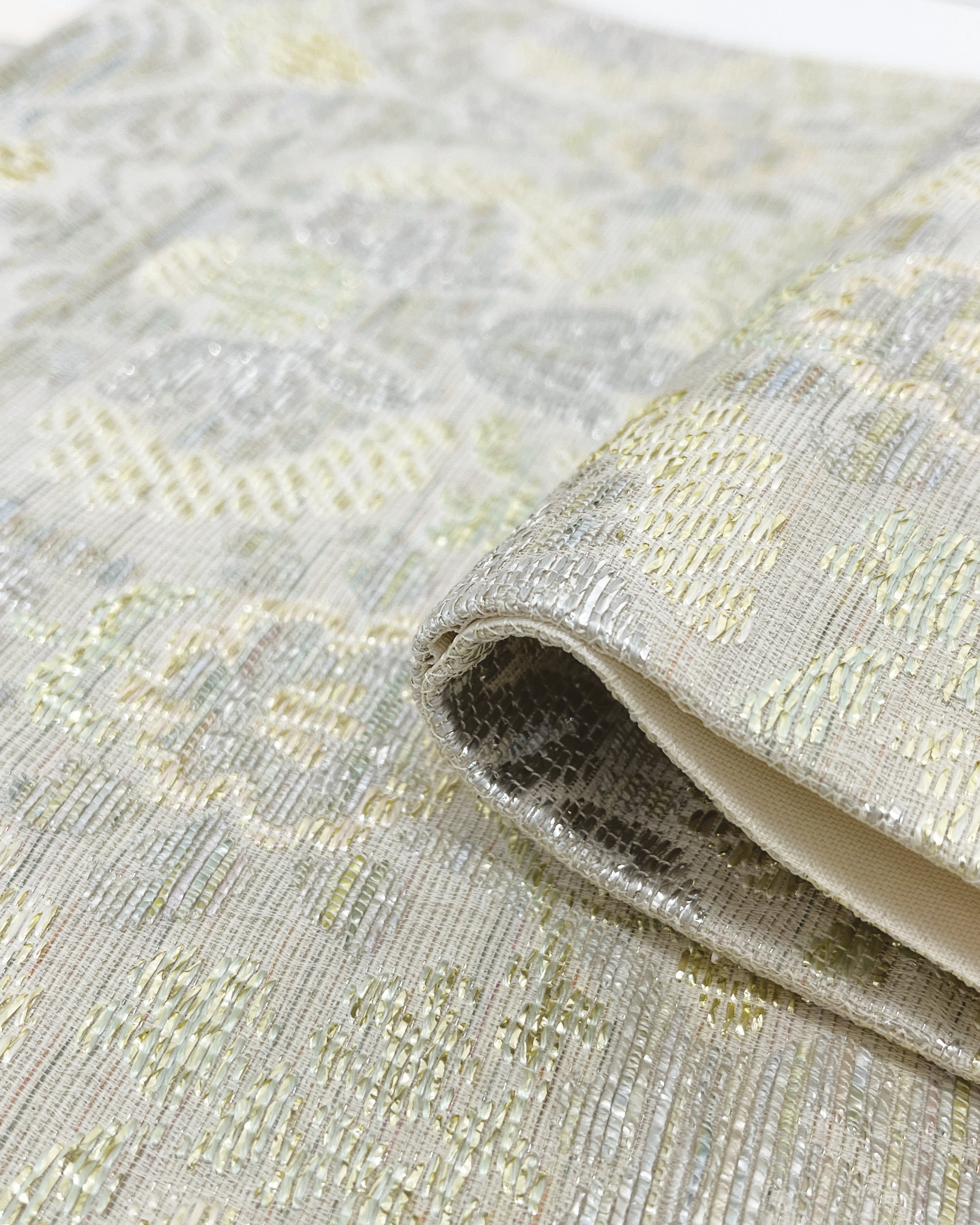 金糸銀糸やラメ糸を淡いベースのお色にあわせ、色数をおさえた気品あふれる袋帯です。