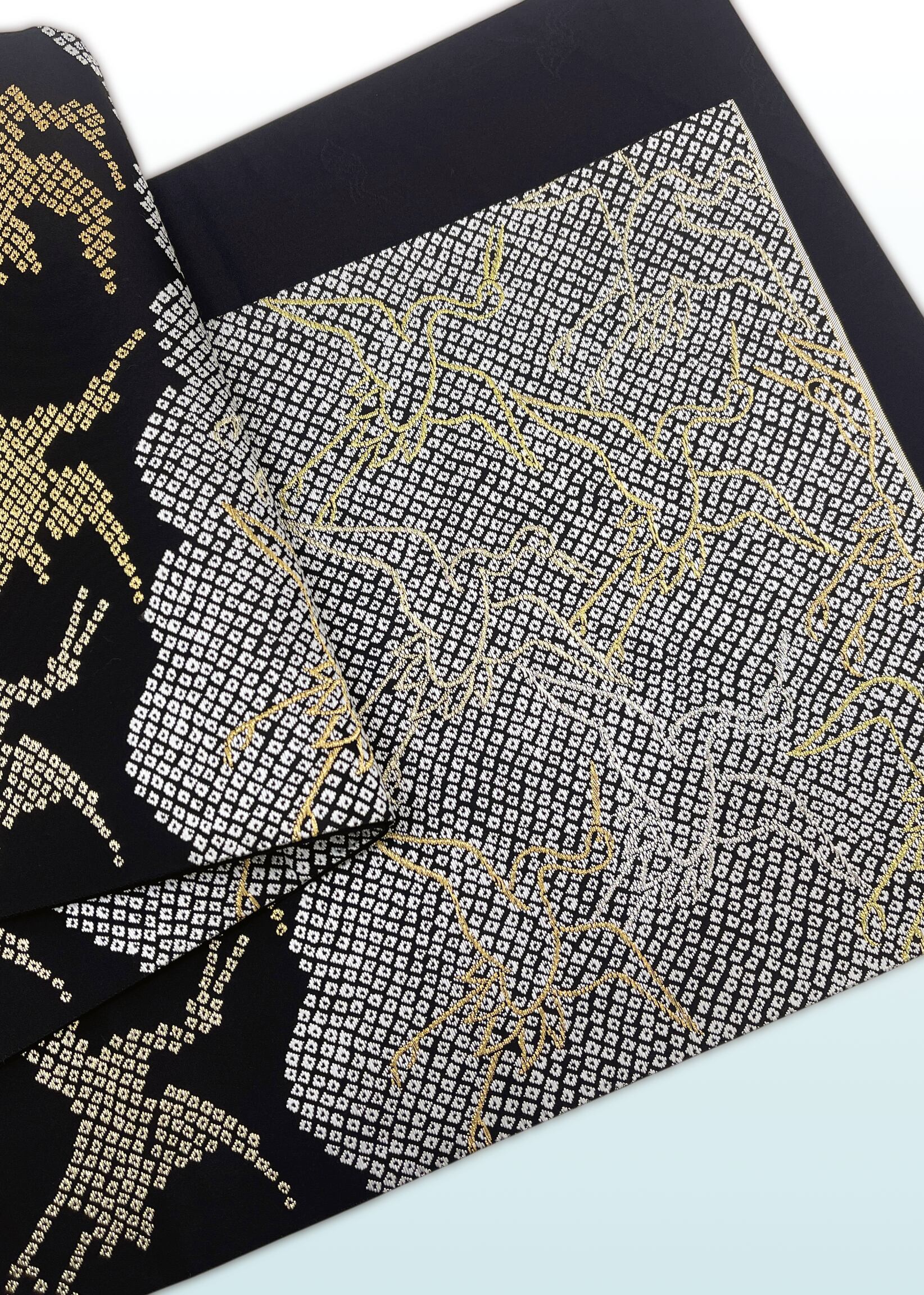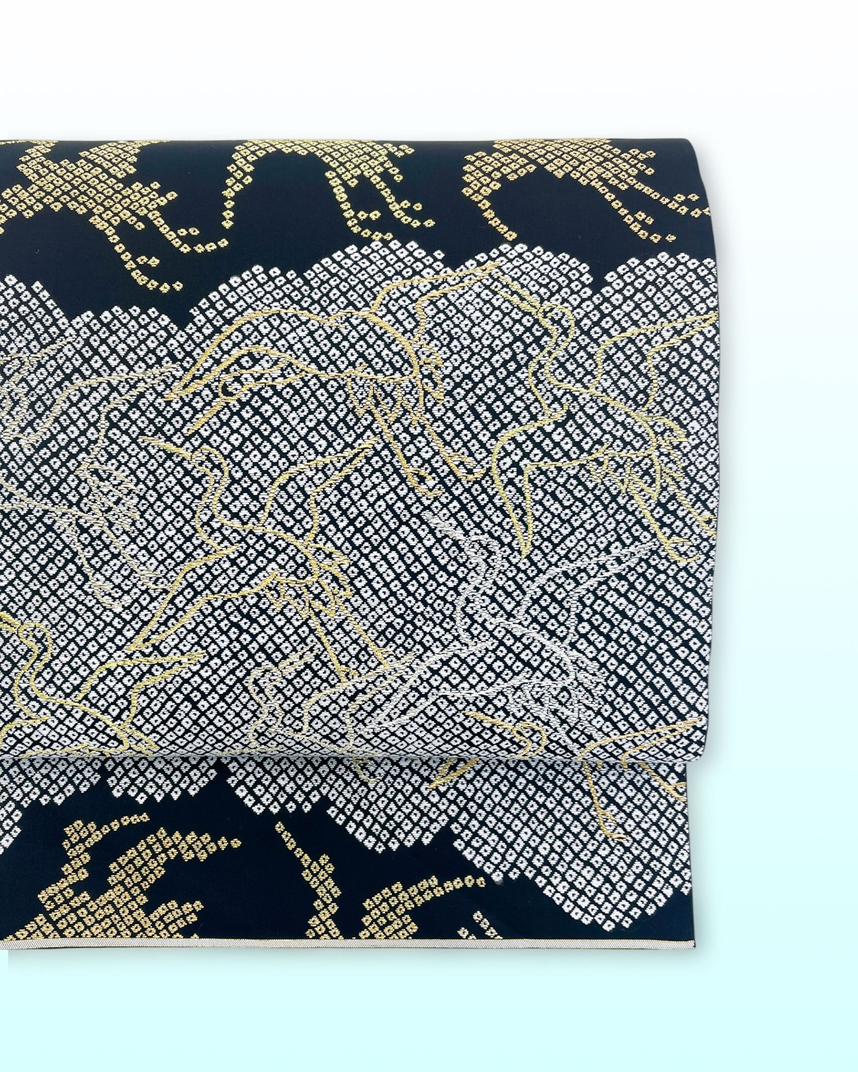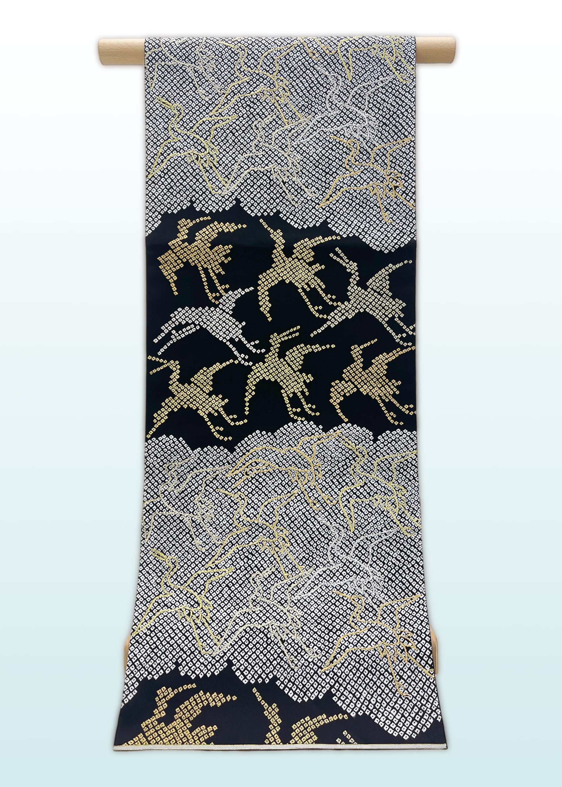 濡羽色としましたがなんとも黒色が艶やかで 金銀糸で表現された千羽鶴が見事な袋帯です。