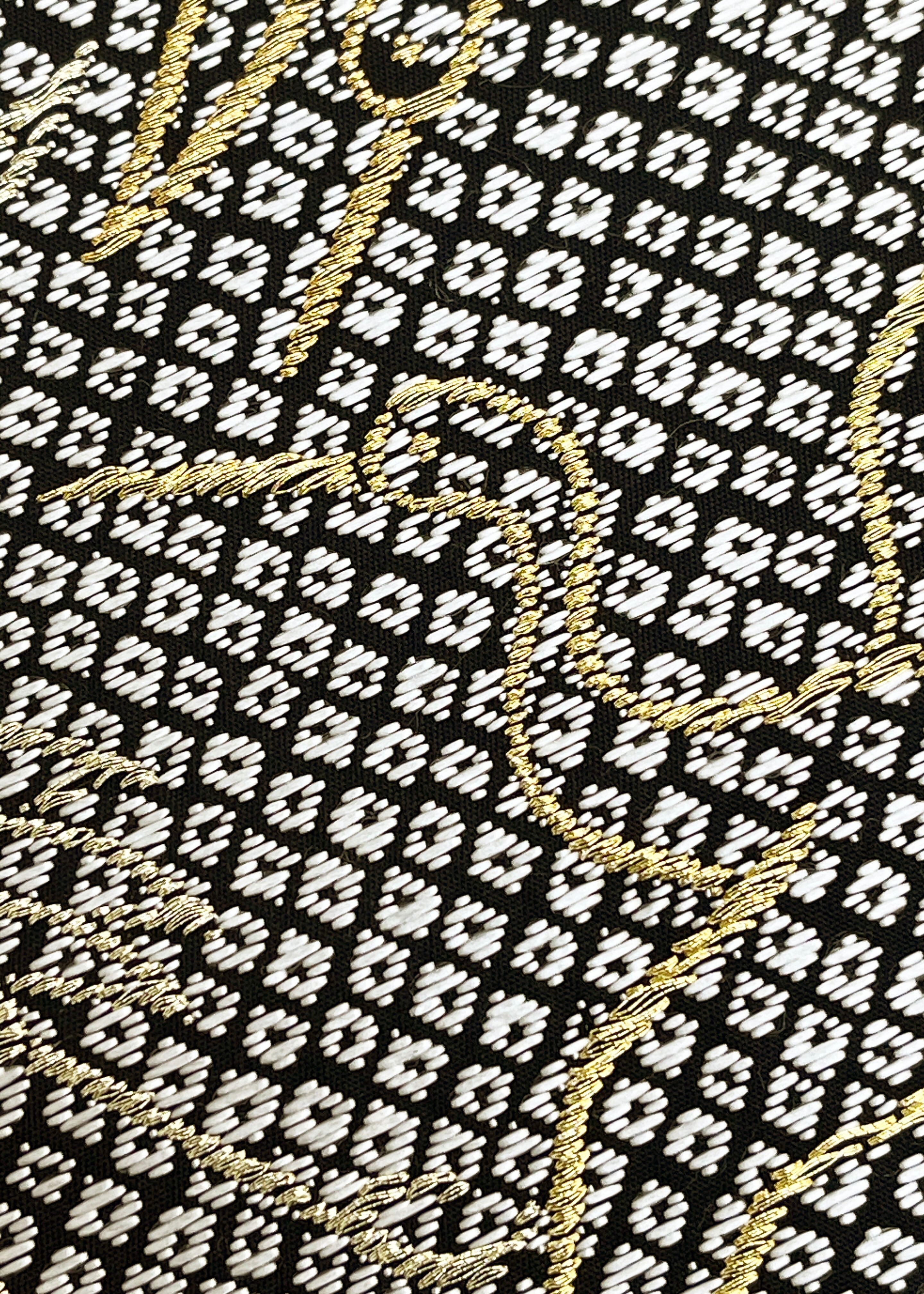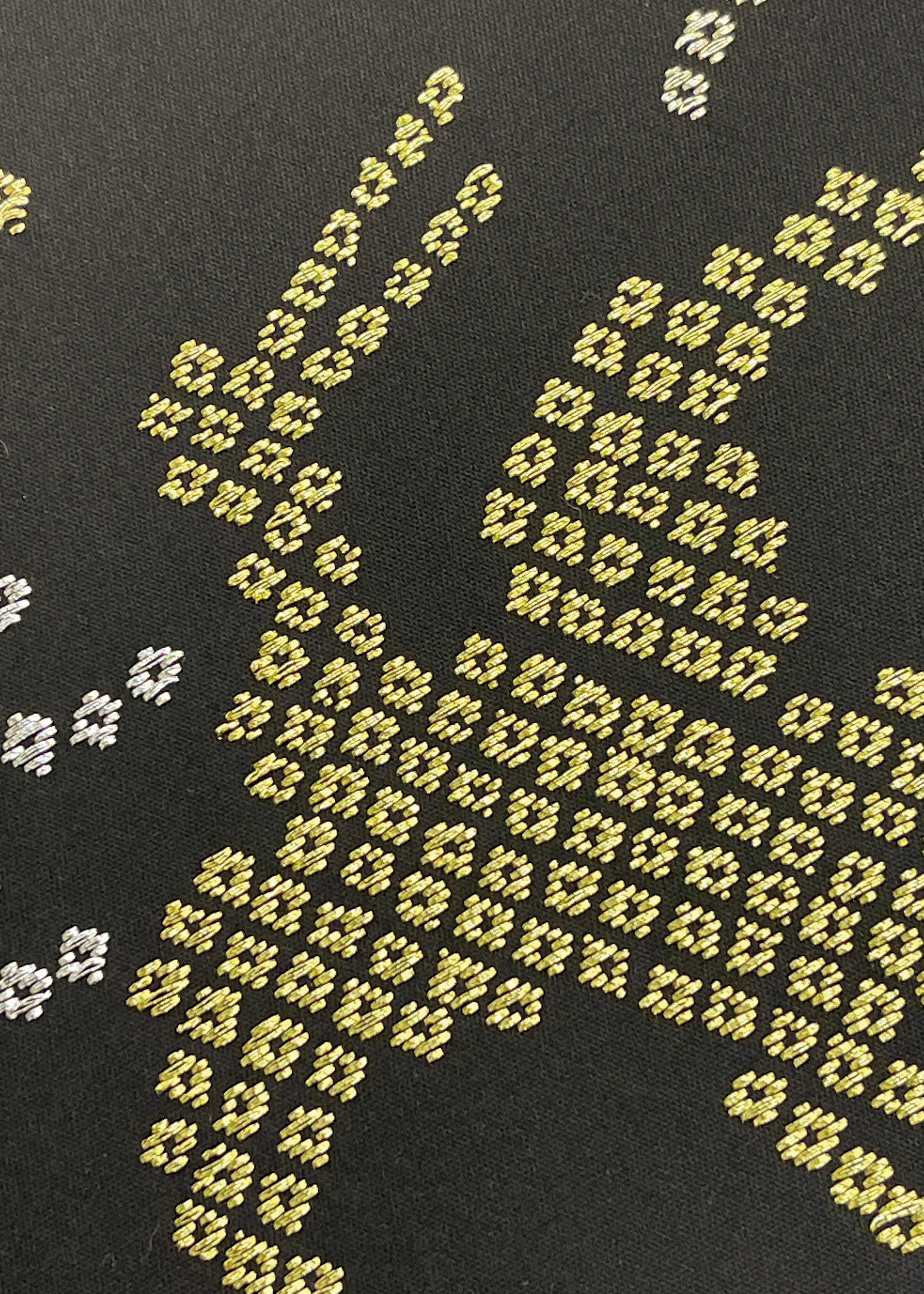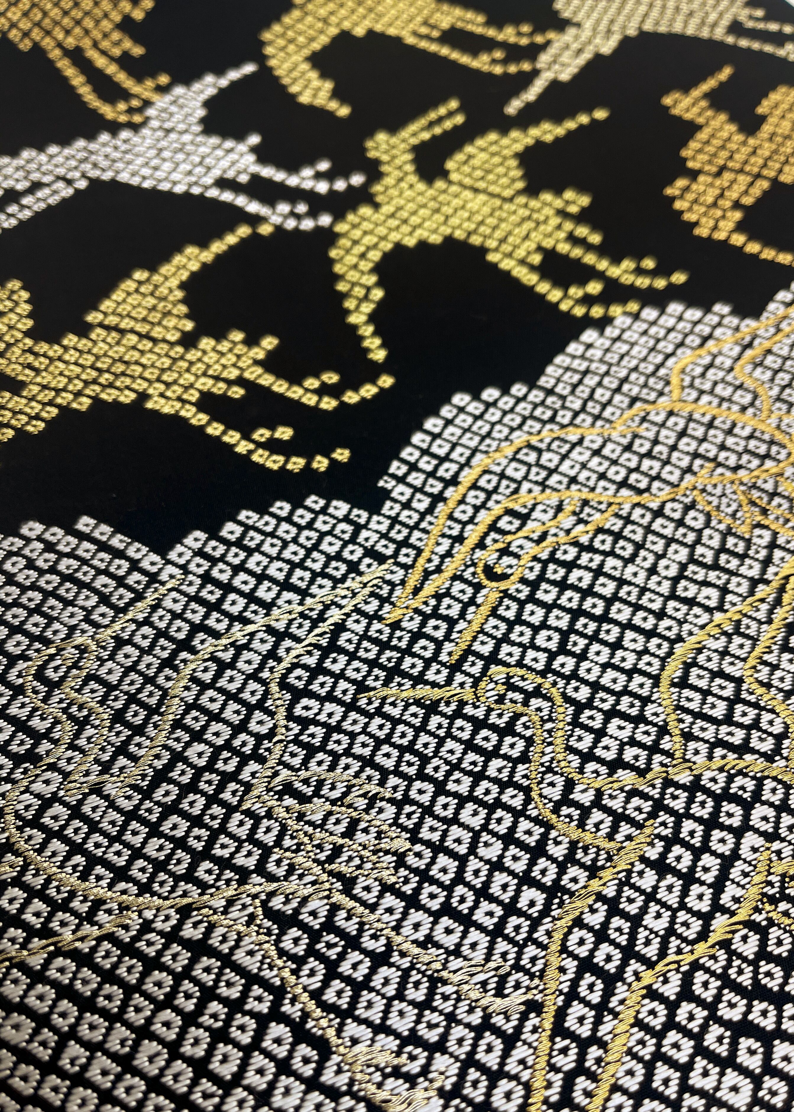 濡羽色としましたがなんとも黒色が艶やかで 金銀糸で表現された千羽鶴が見事な袋帯です。