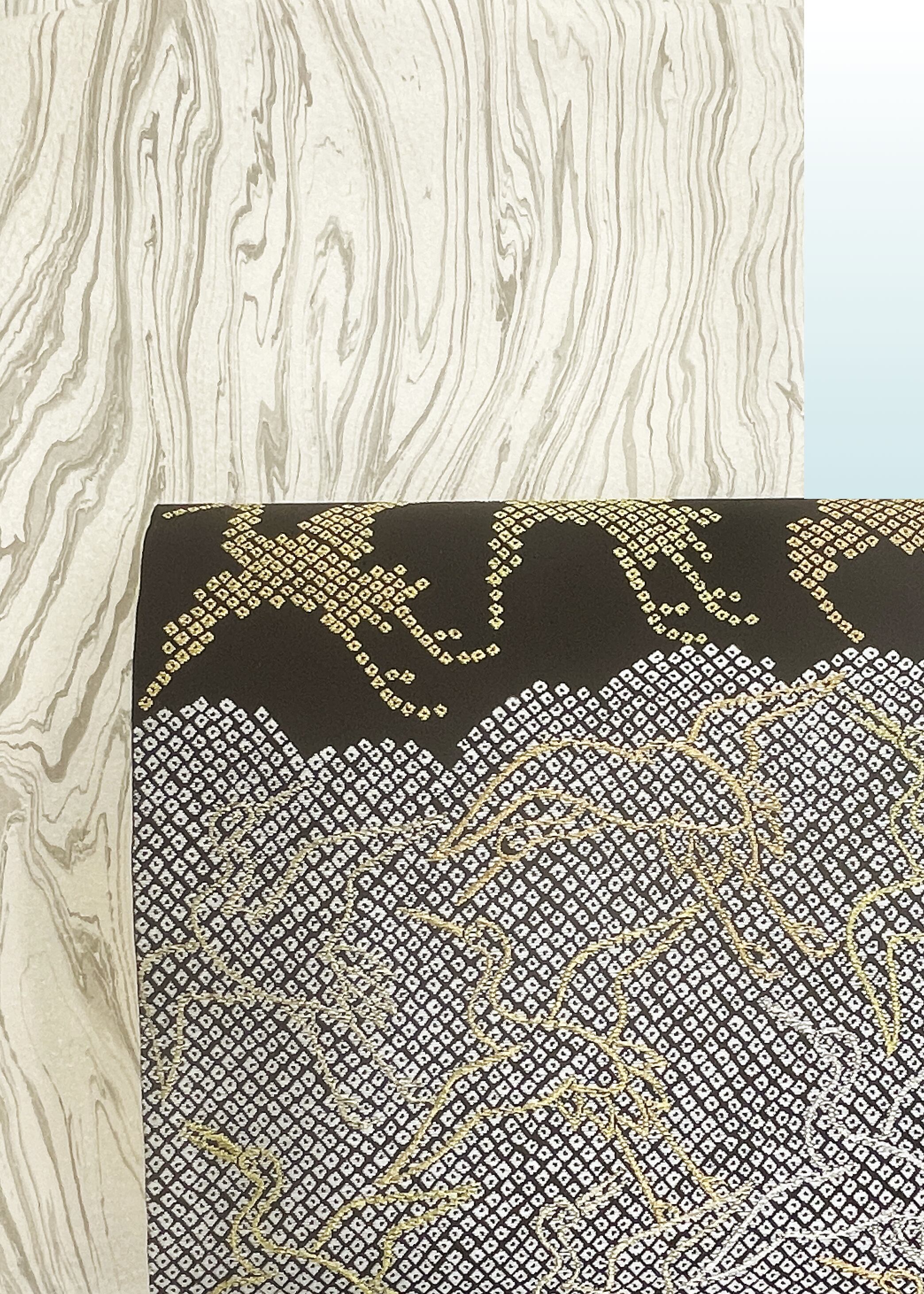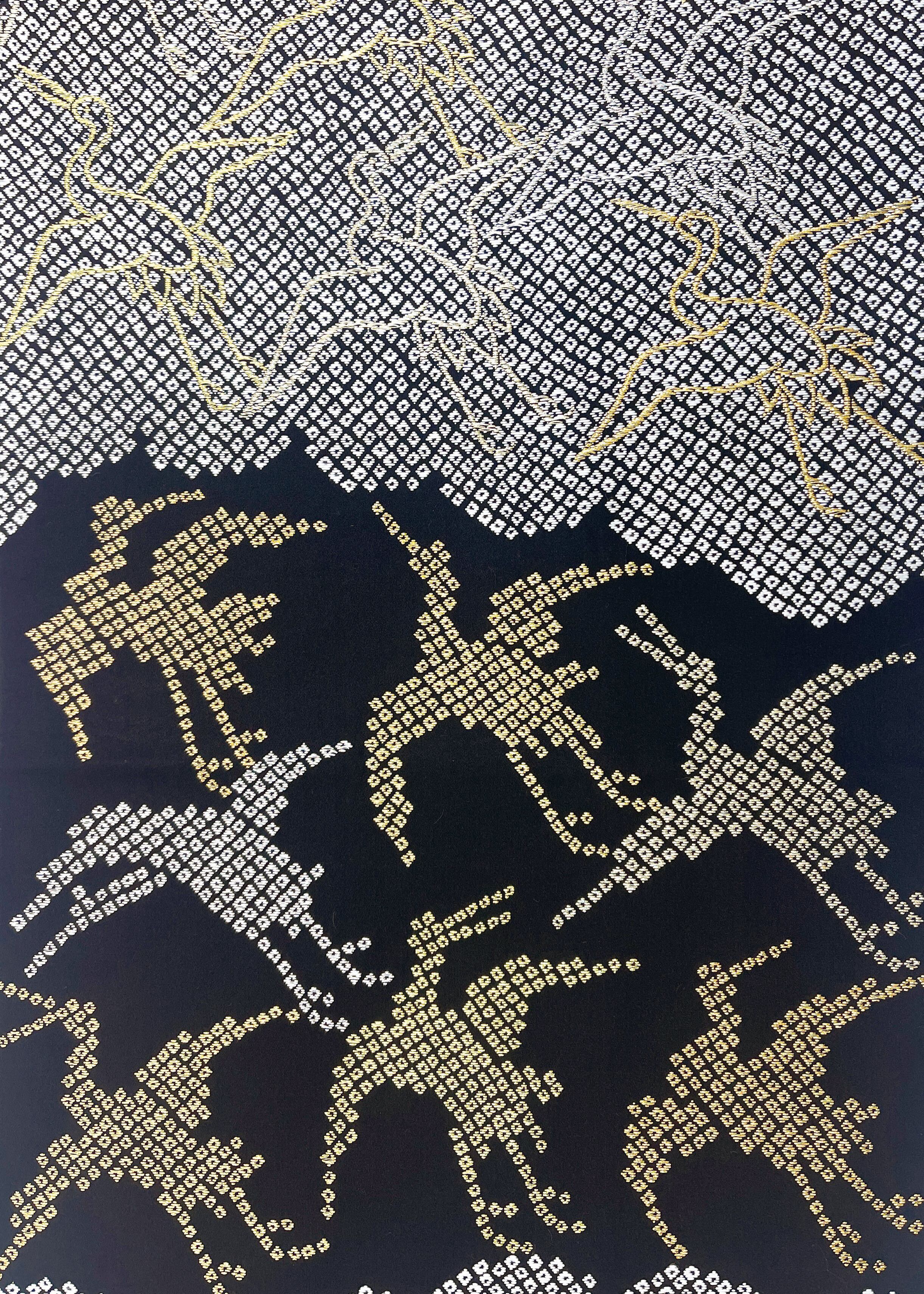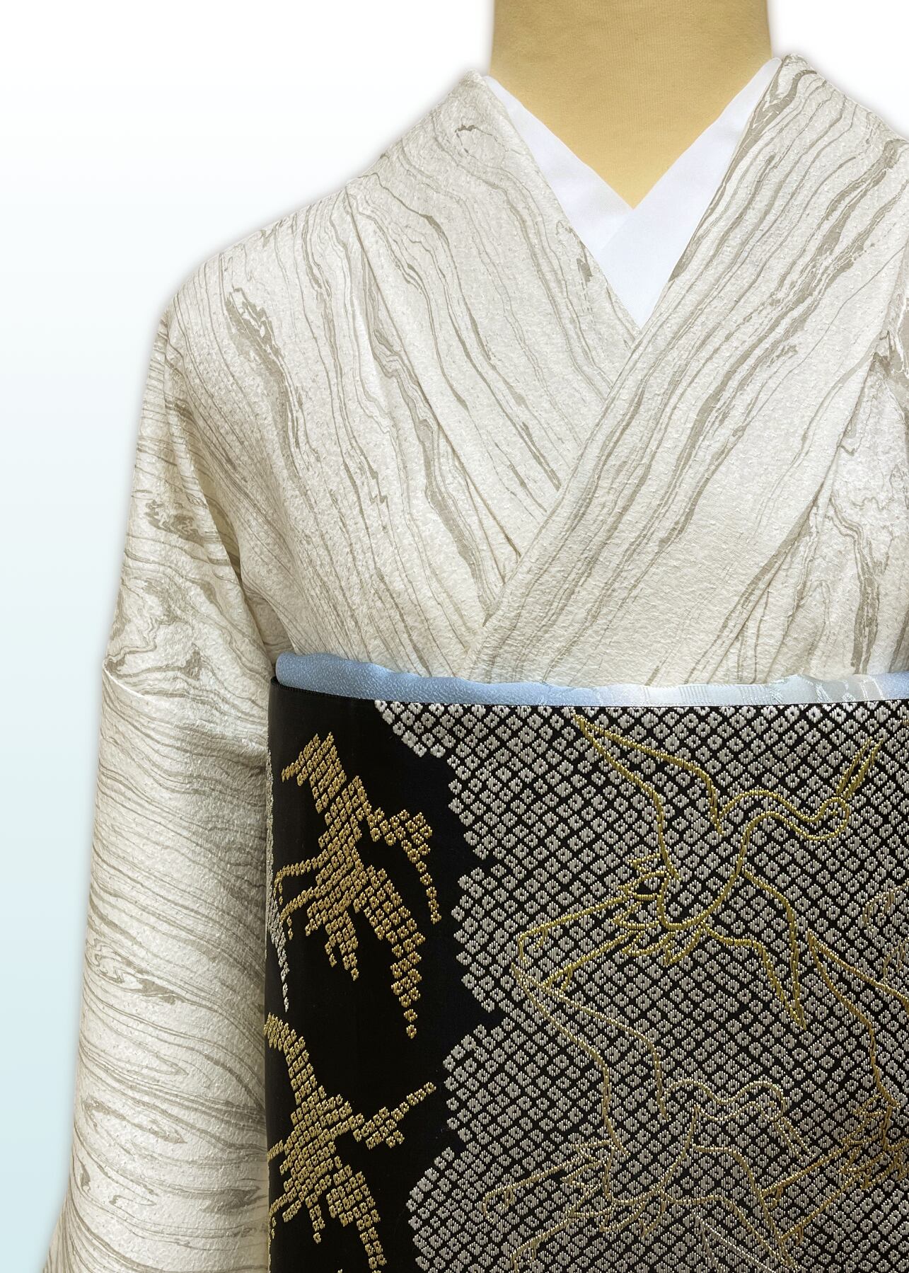 小袖千羽鶴文(こそでせんばづるもん)は、長寿や吉祥の象徴である「鶴」を多数配した、おめでたい文様です。千羽鶴は心願成就の願いを込めた日本伝統の図柄であり平和や健康への祈りが込められています。第一礼装から今回のようなセミフォーマルの場面まで幅広くお召しいただけます。