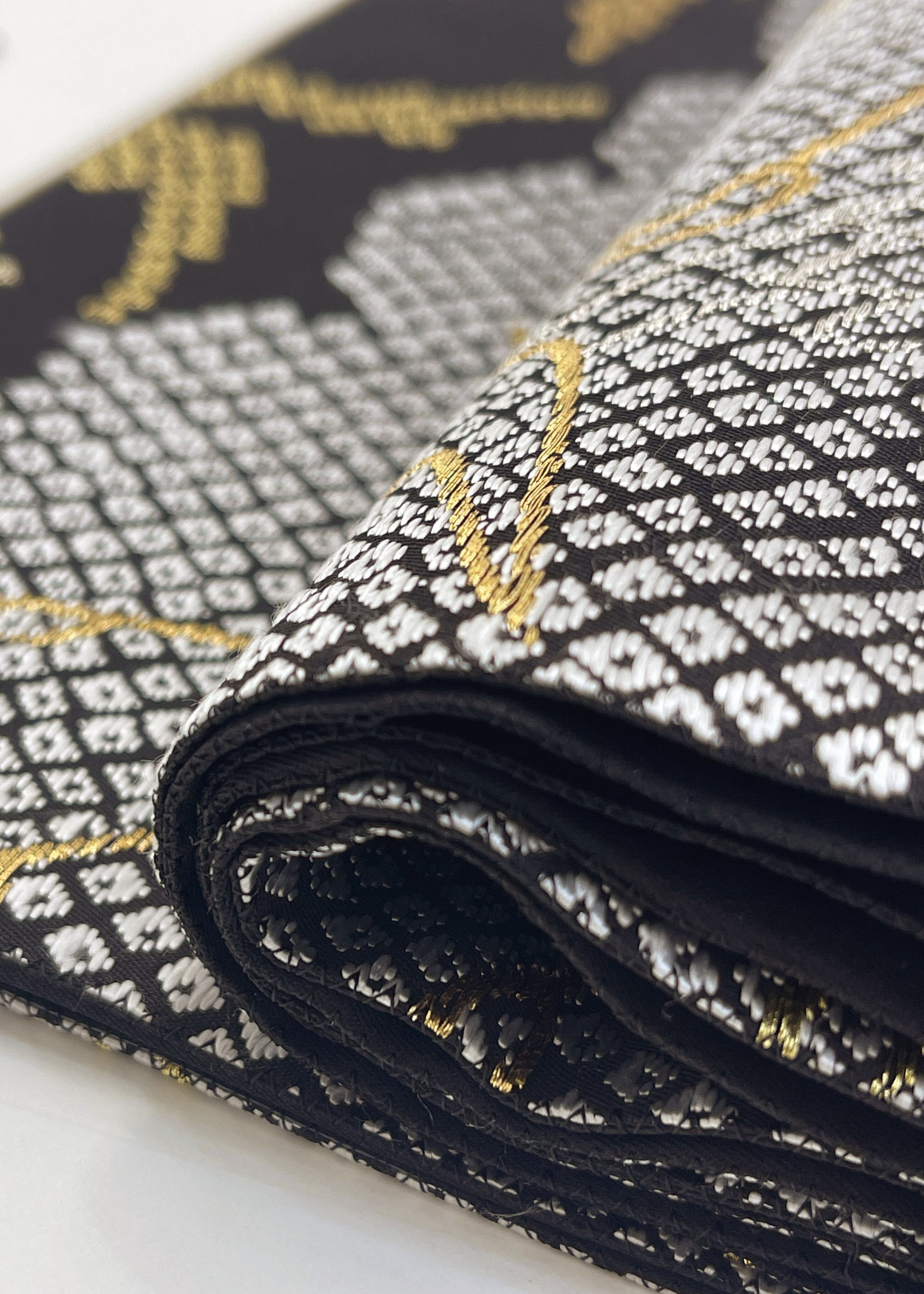 (袋帯)濡羽地 小袖千羽鶴文 山口美術織物 LUOHM−062(リユース品)