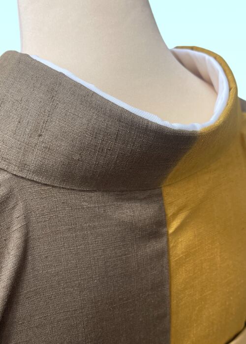 なんとも手触りのよい、柔らかでしっとりとした染紬です。枯茶色と山吹茶色の2色に染め分け、それぞれの色の配置や分量が絶妙なかっこよくモダンな一枚です。