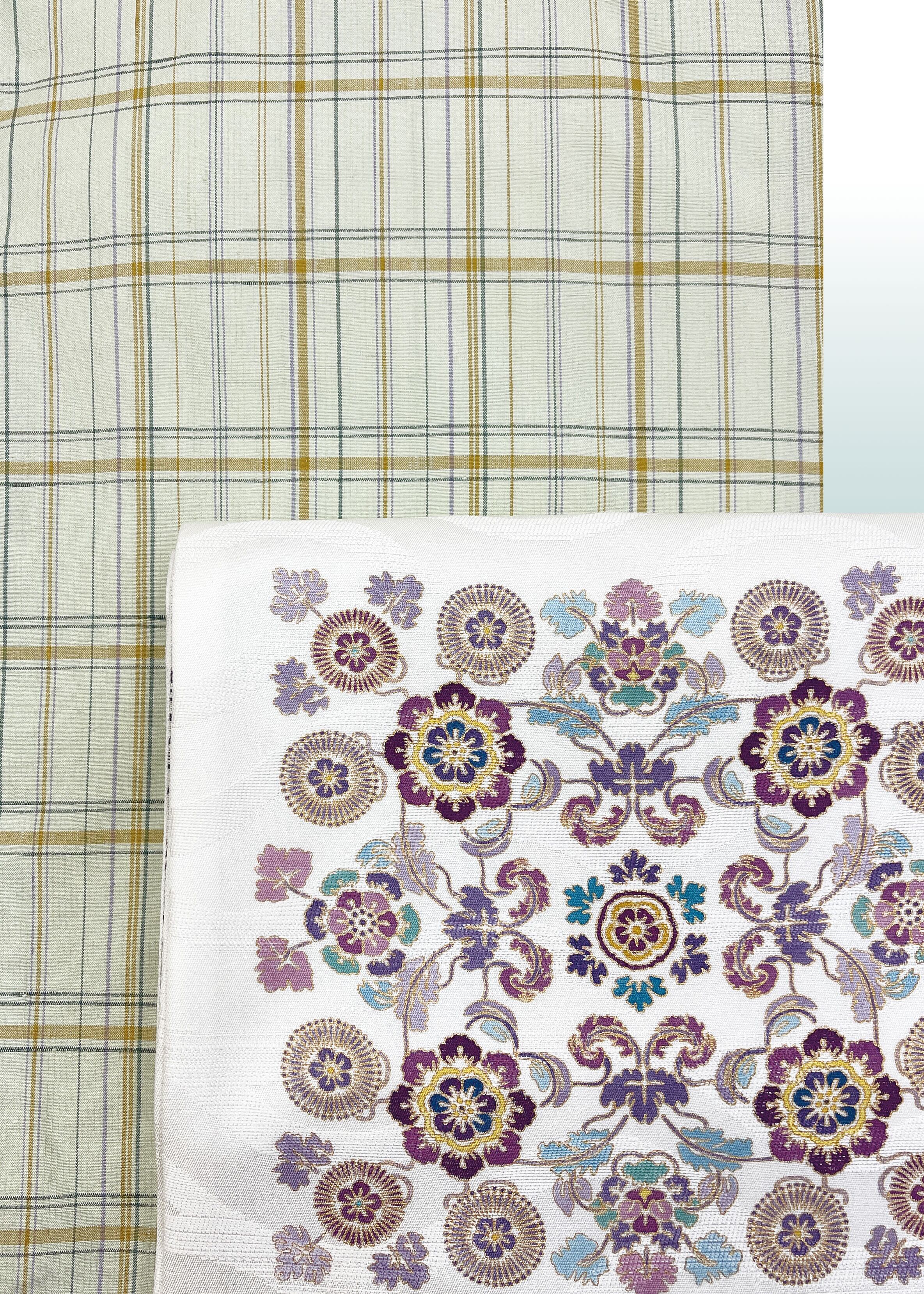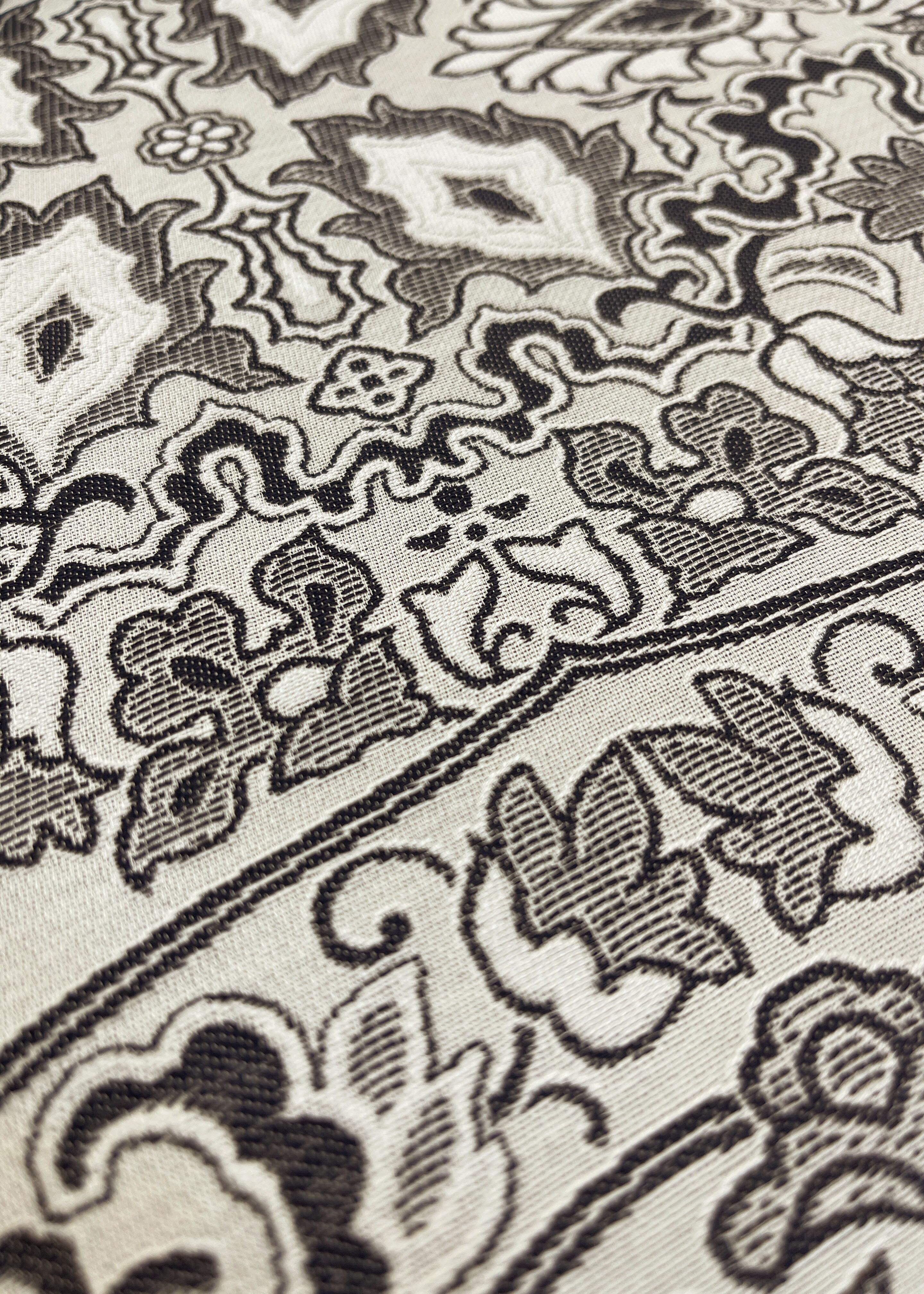 リバーシブルの一方は、西洋更紗文様をモノトーンで織り出した、上品で落ち着いたものです。こちらも合わせるお着物によってクラスアップの装いができそうです。