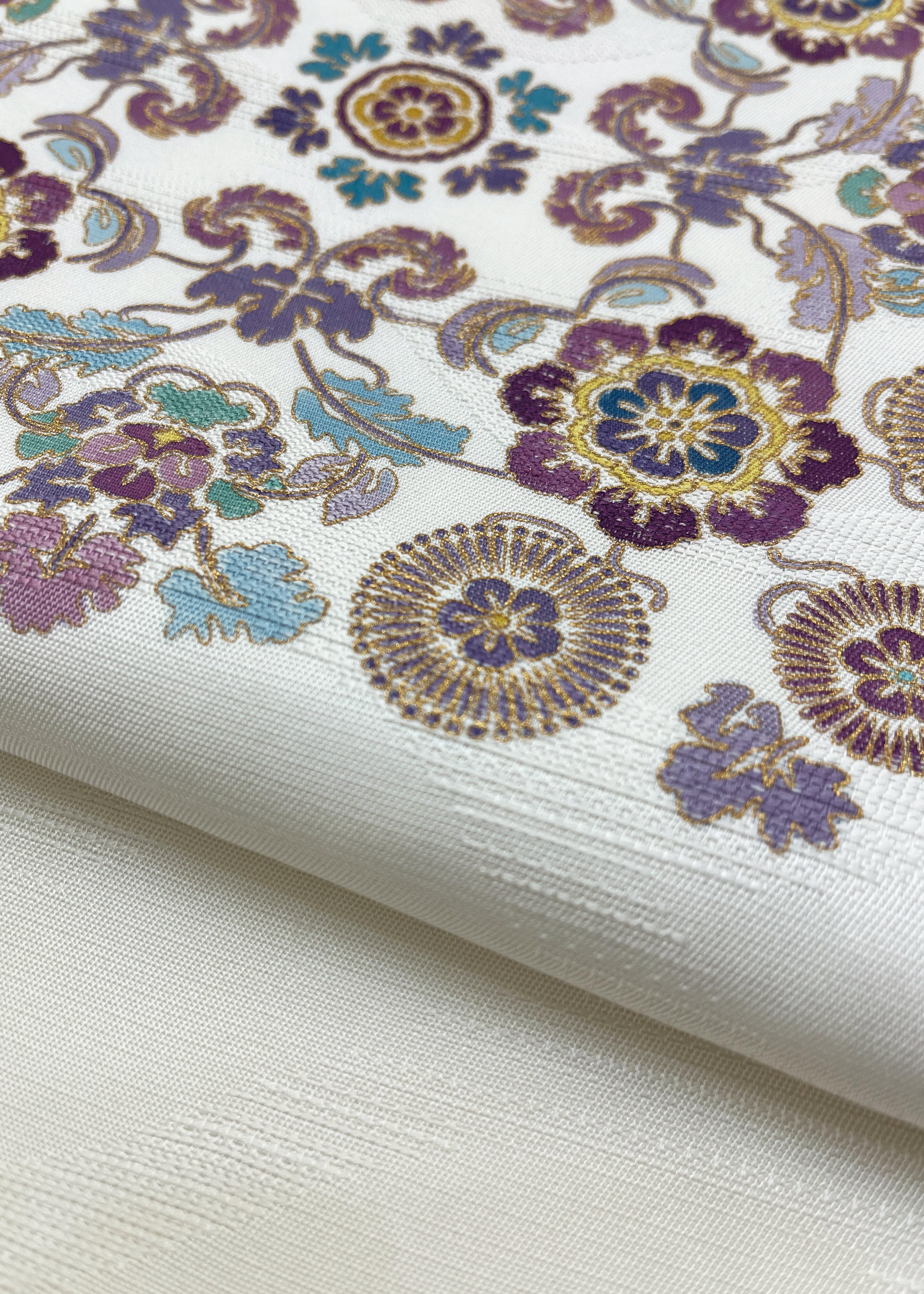 白地に波の地模様が織り出され、更紗のお柄が染めだされた袋帯です。染られた柄の輪郭を金で描き出しています。紬ではなく、色無地などに合わせていただけば、クラスアップの装いとなります。