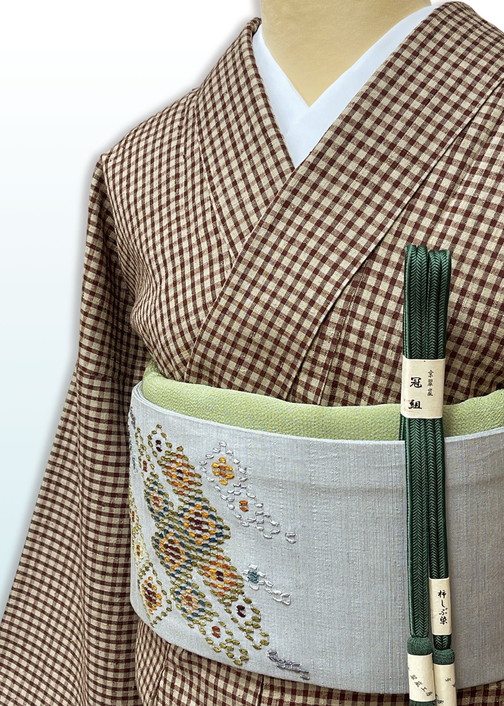 ざっくりとした花織の表情を引き立て、また落ち着いたやさしさを感じさせてくれる紬きもののコーディネートです。
