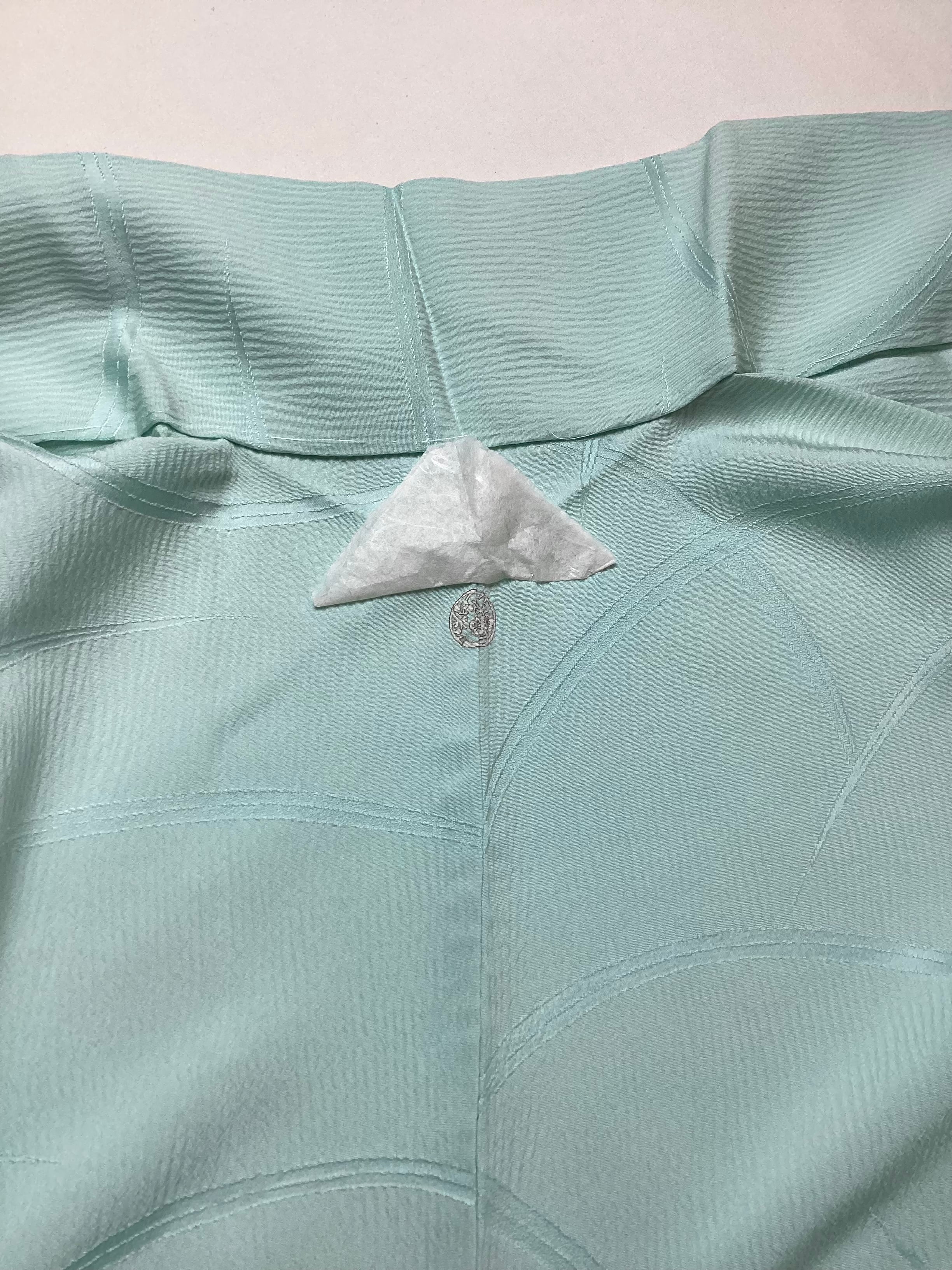 しつけ付きの未使用品ですが、衿裏などにやや経年感が感じられます。また、左後ろ身頃の揚げ下あたりに糸の飛び出しがございます(画像13)。表生地に響くものではございませんが、気にされる方はご購入をお控え下さい。