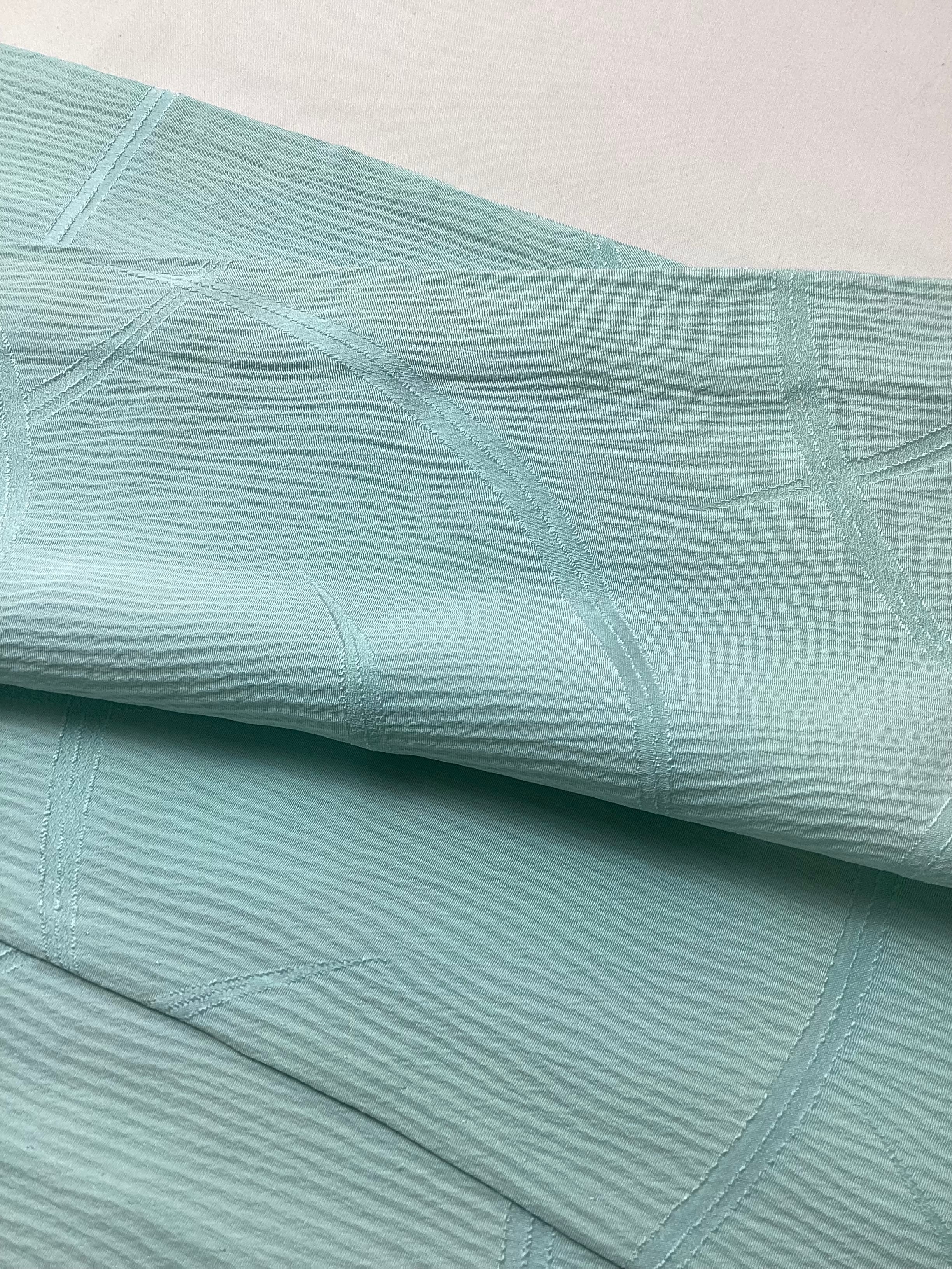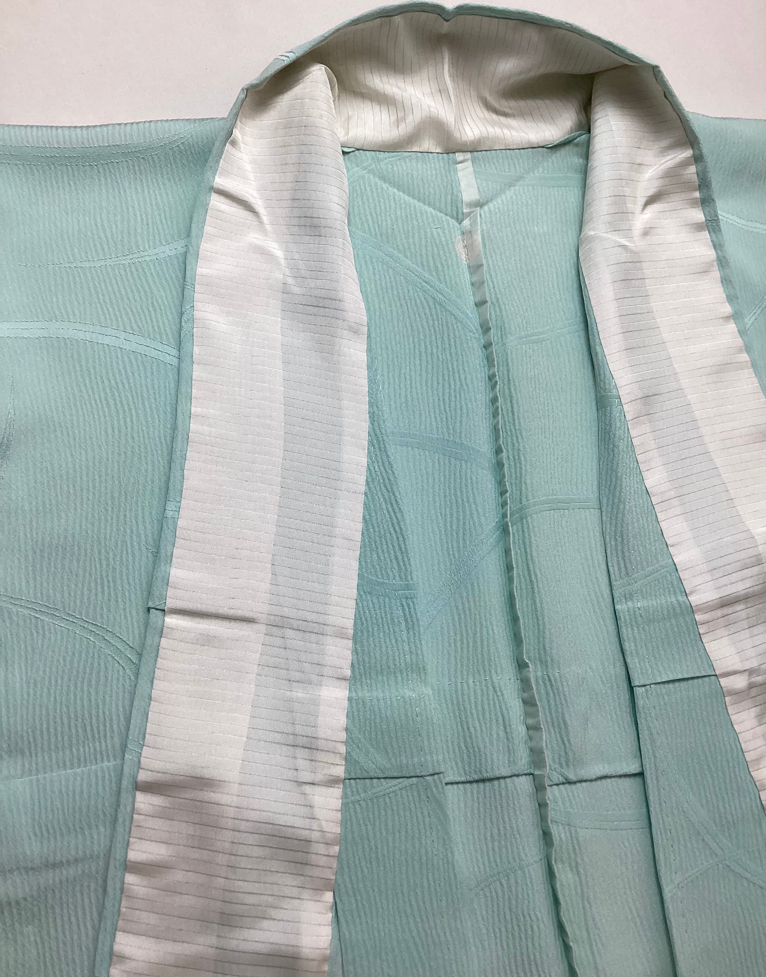 お単衣の季節に映える爽やかな水色の色無地です。楊柳の縦のポコポコとしたシボが肌に貼り付かず、さらりとしております。立体感のある生地の中に芝草の地紋のラインが涼しげです。お稽古ごとや、お茶席、初夏のお慶びごとに爽やかなお色目の色無地はいかがでしょうか。帯のコーディネート次第であらゆるシーンに活躍してくれるお品です。