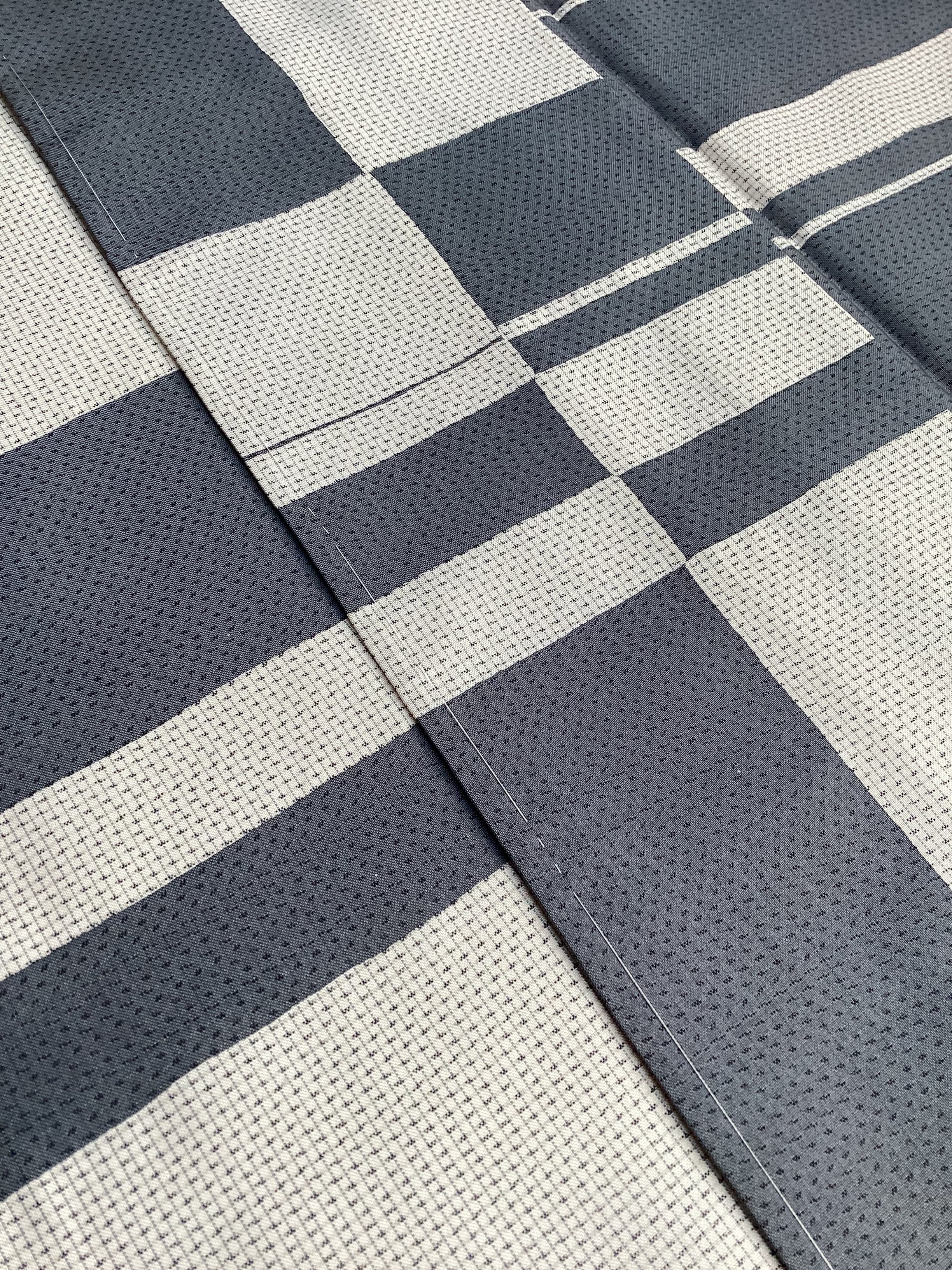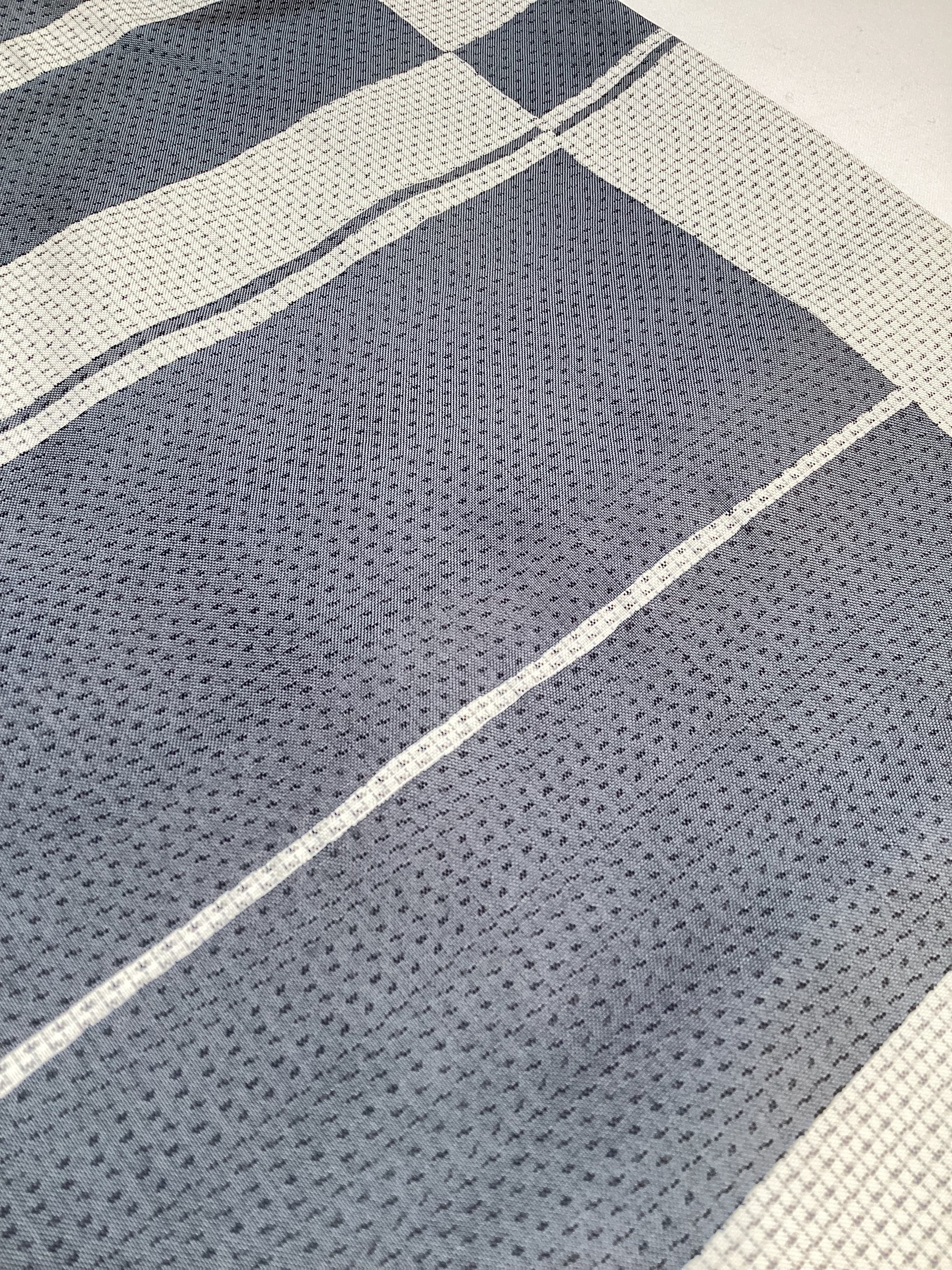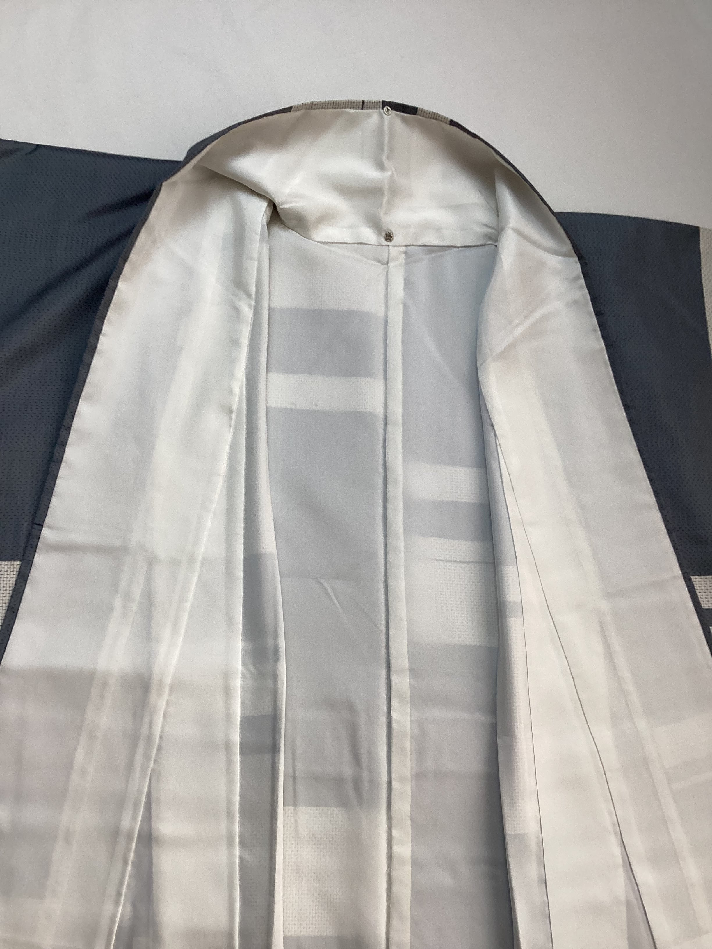 ①【袷】白×鉛色大格子に蚊絣文紬(しつけ付き)(リユース品)