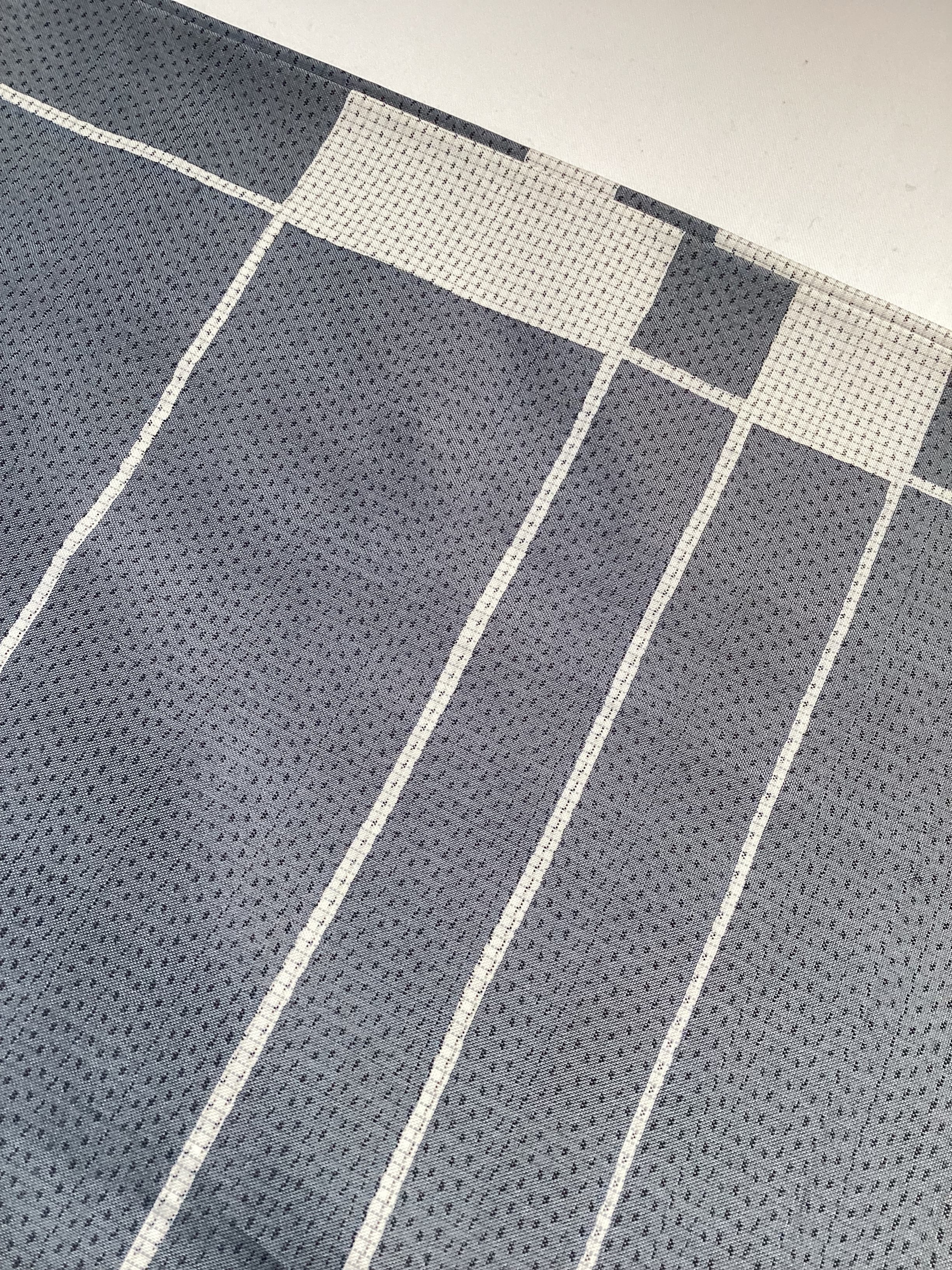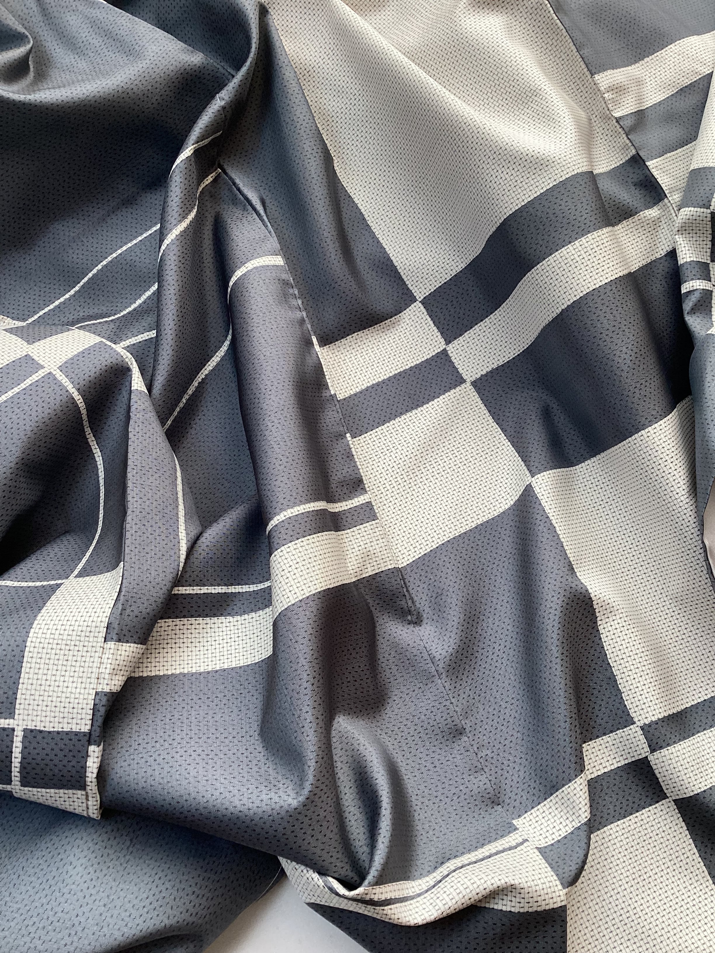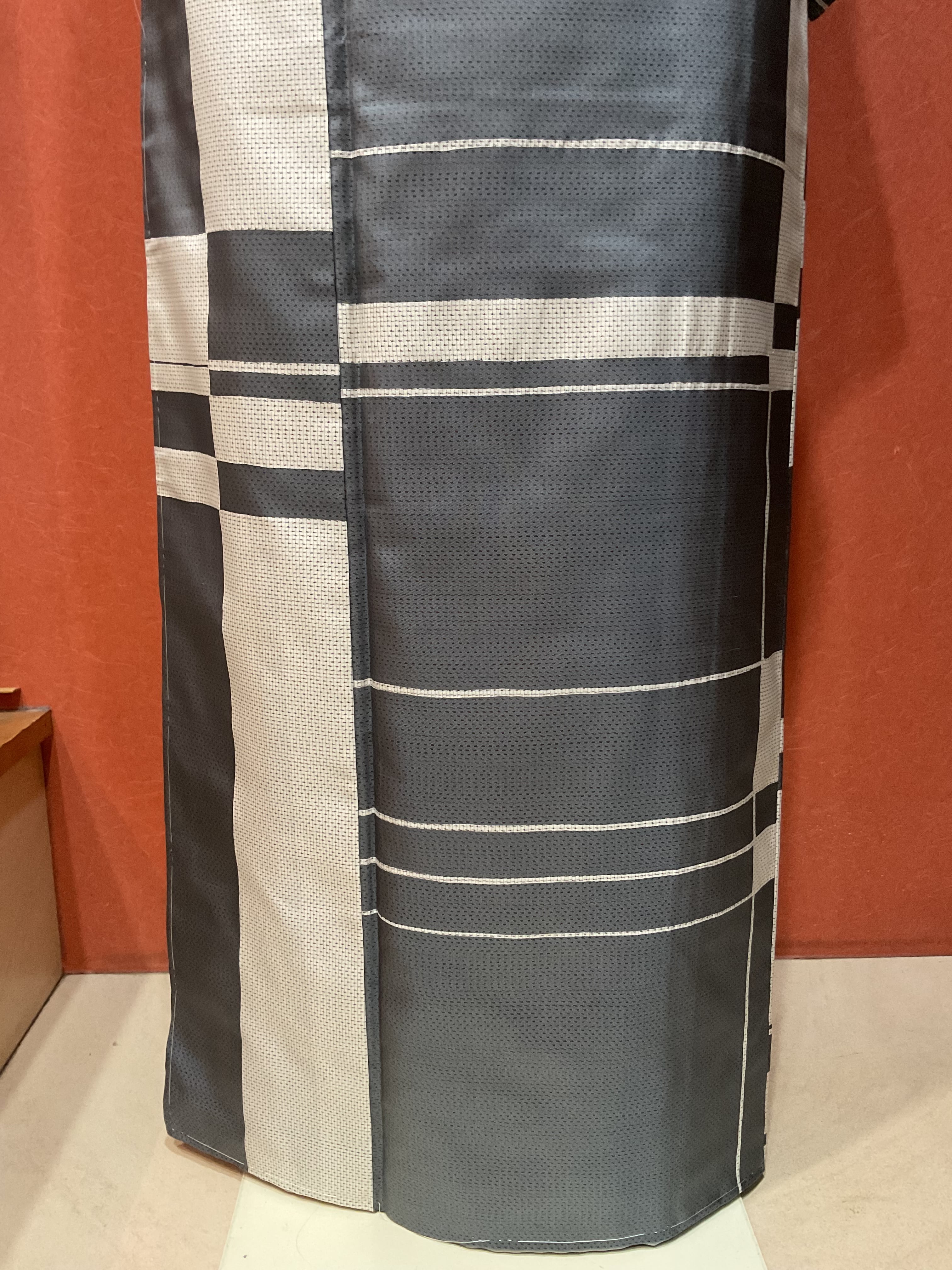①【袷】白×鉛色大格子に蚊絣文紬(しつけ付き)(リユース品)