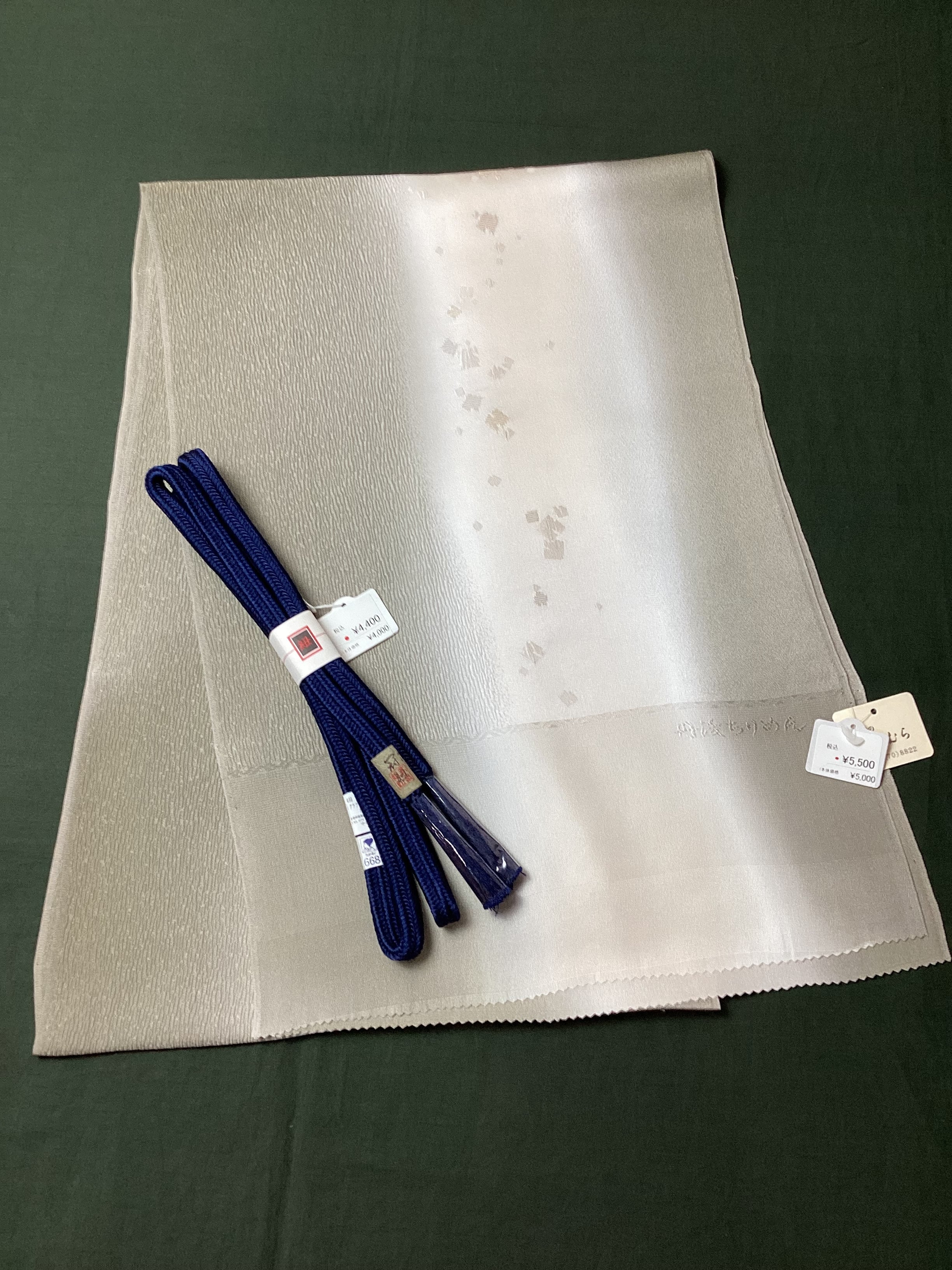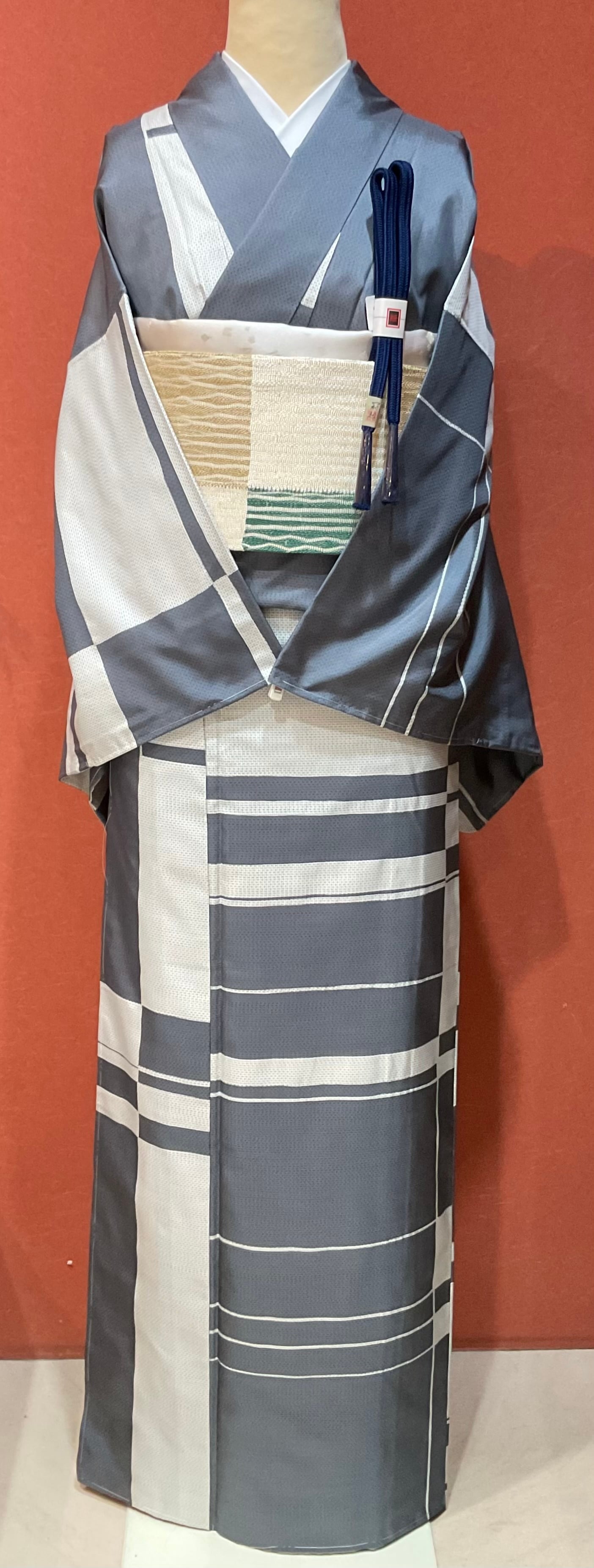 ★19周年福袋55,000円★白×鉛色大格子に蚊絣文紬(しつけ付き)コーデ4点セット(袷)260508-2