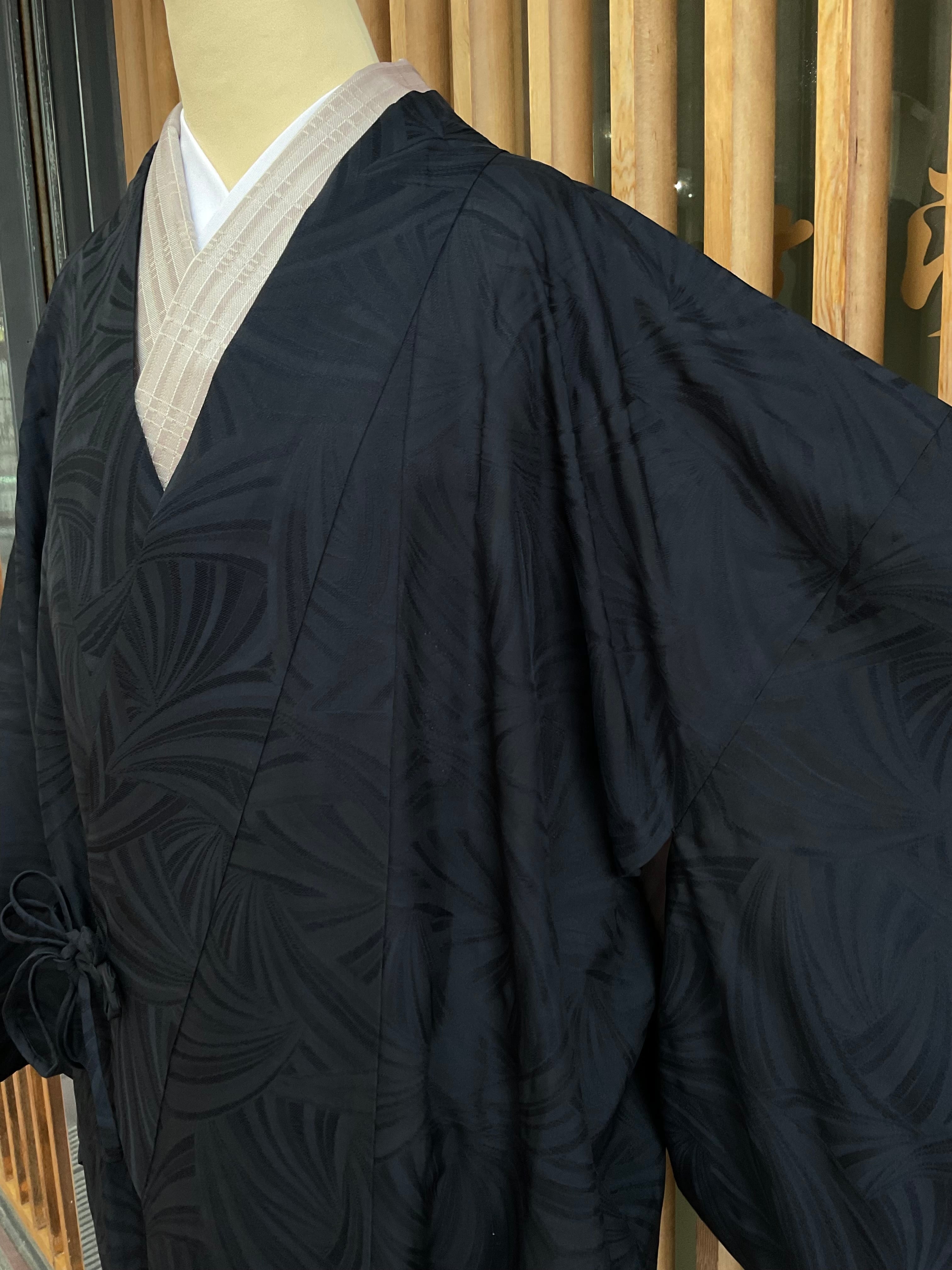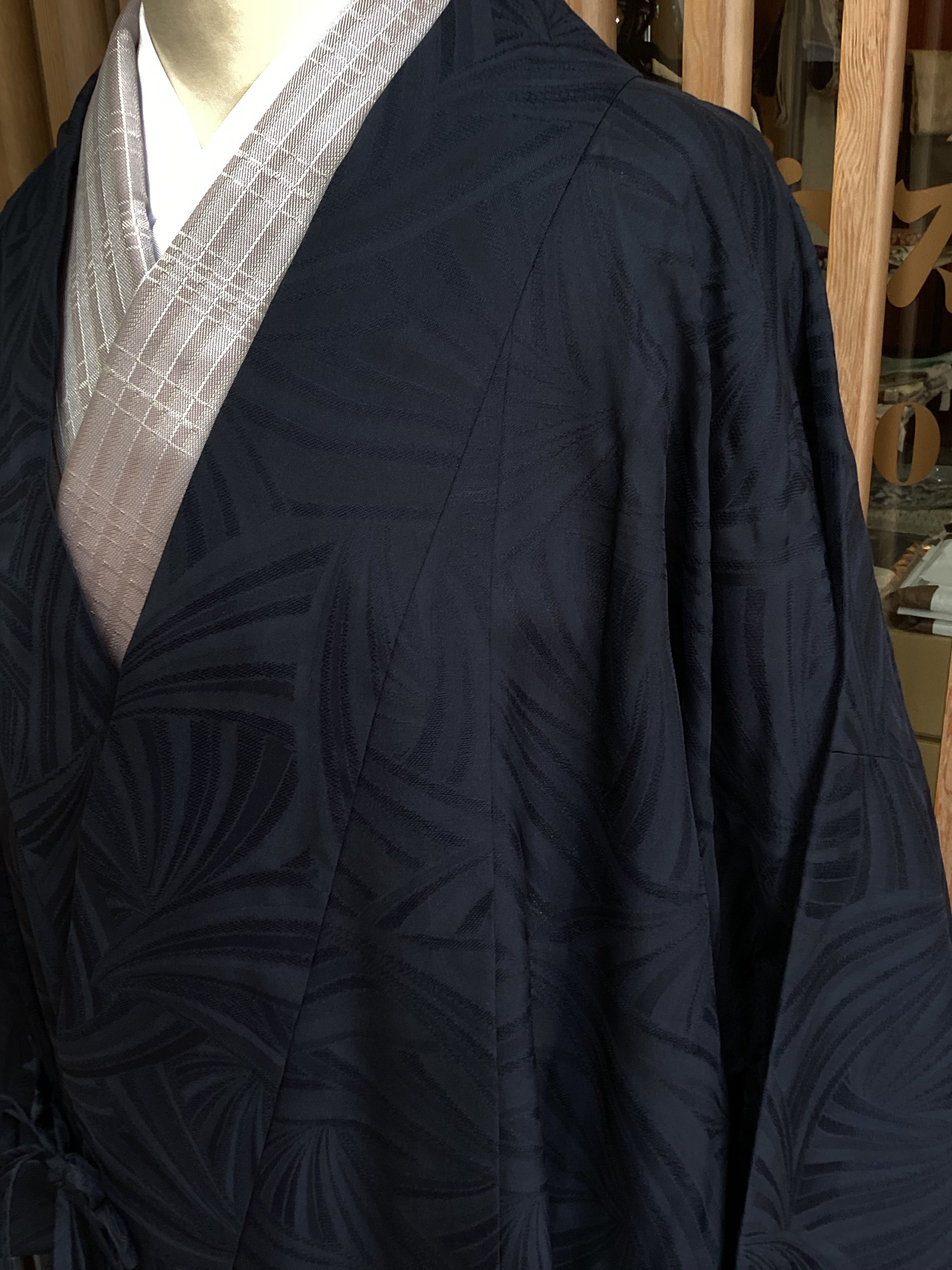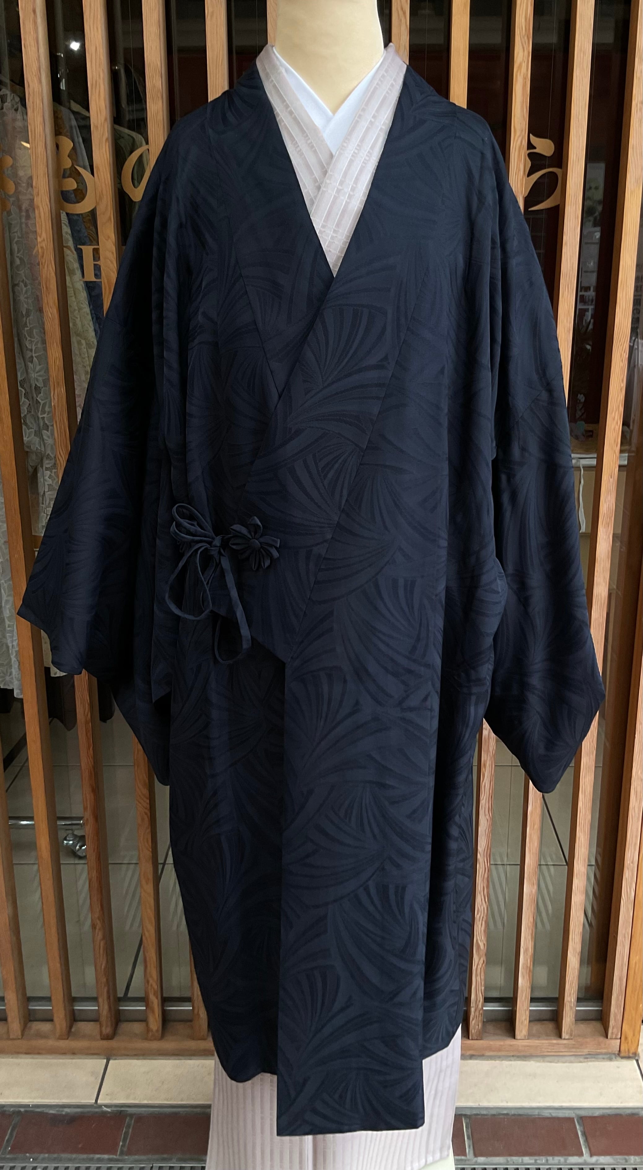 黒に近い濃い紺色の紋紗の道中着です。ほどよい透け感があり、銀杏の葉のような幾何学文様の地紋が織り込まれております。ベーシックな落ち着いた紺色なので、コーディネートしやすく、一枚持っておかれると、お出掛けの際にチリよけや気温調整用として重宝いたします。年齢を問わず、幅広いシーンで活躍してくれるお品です。