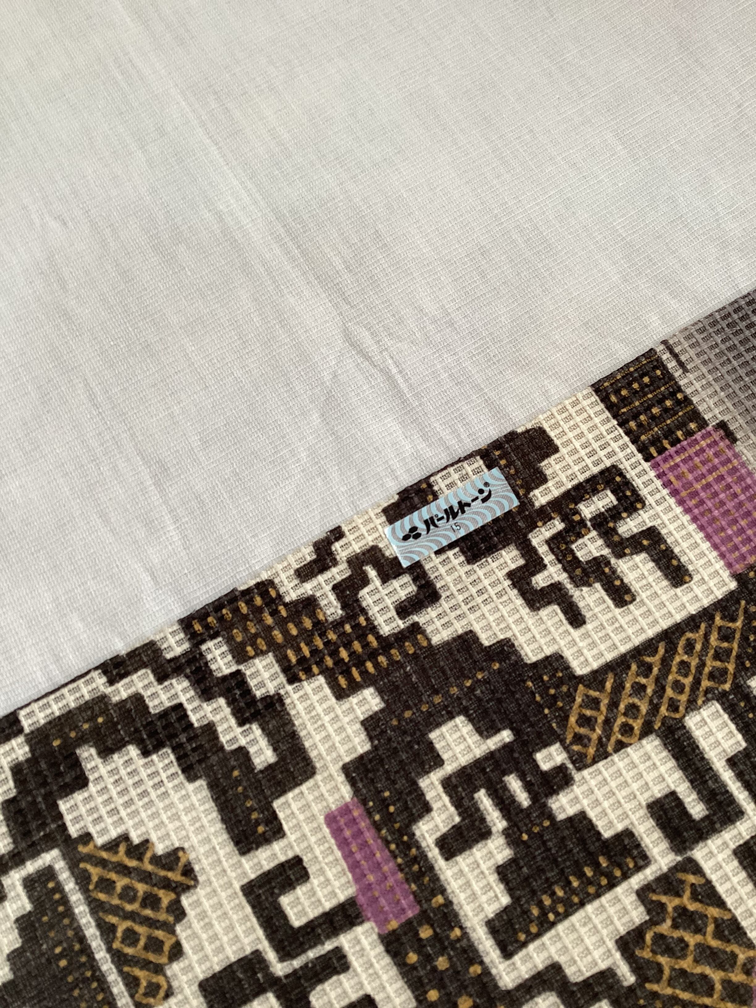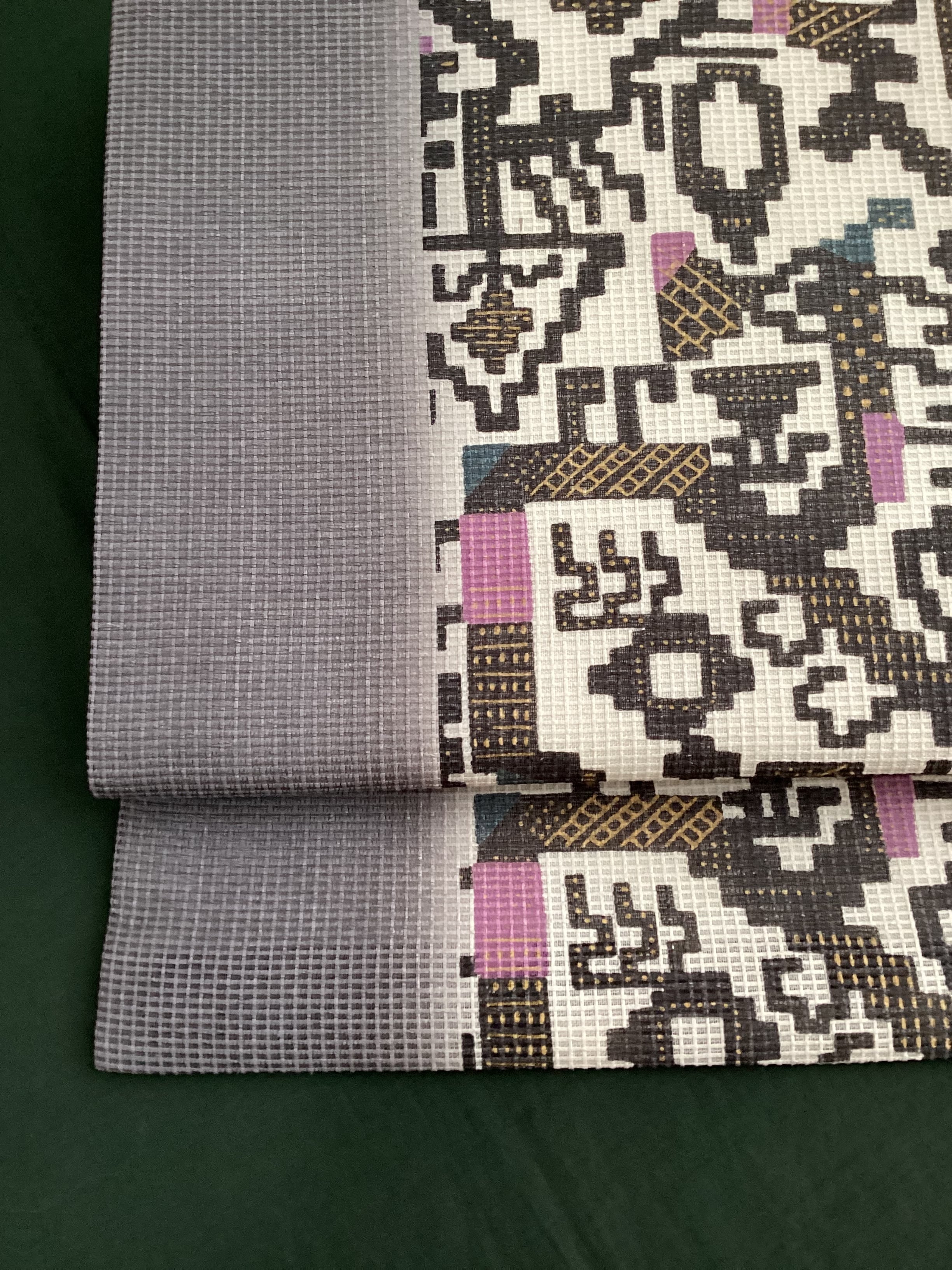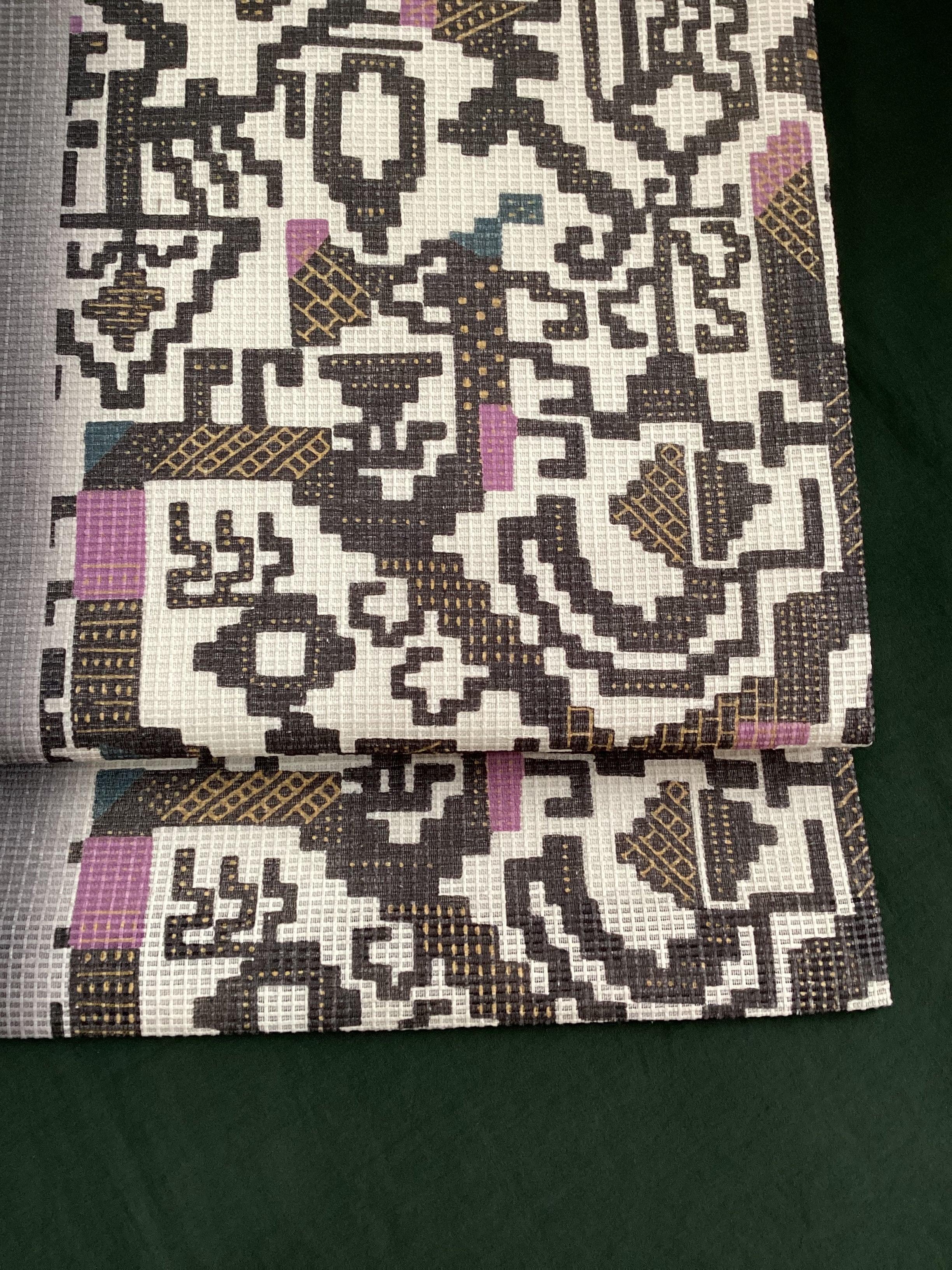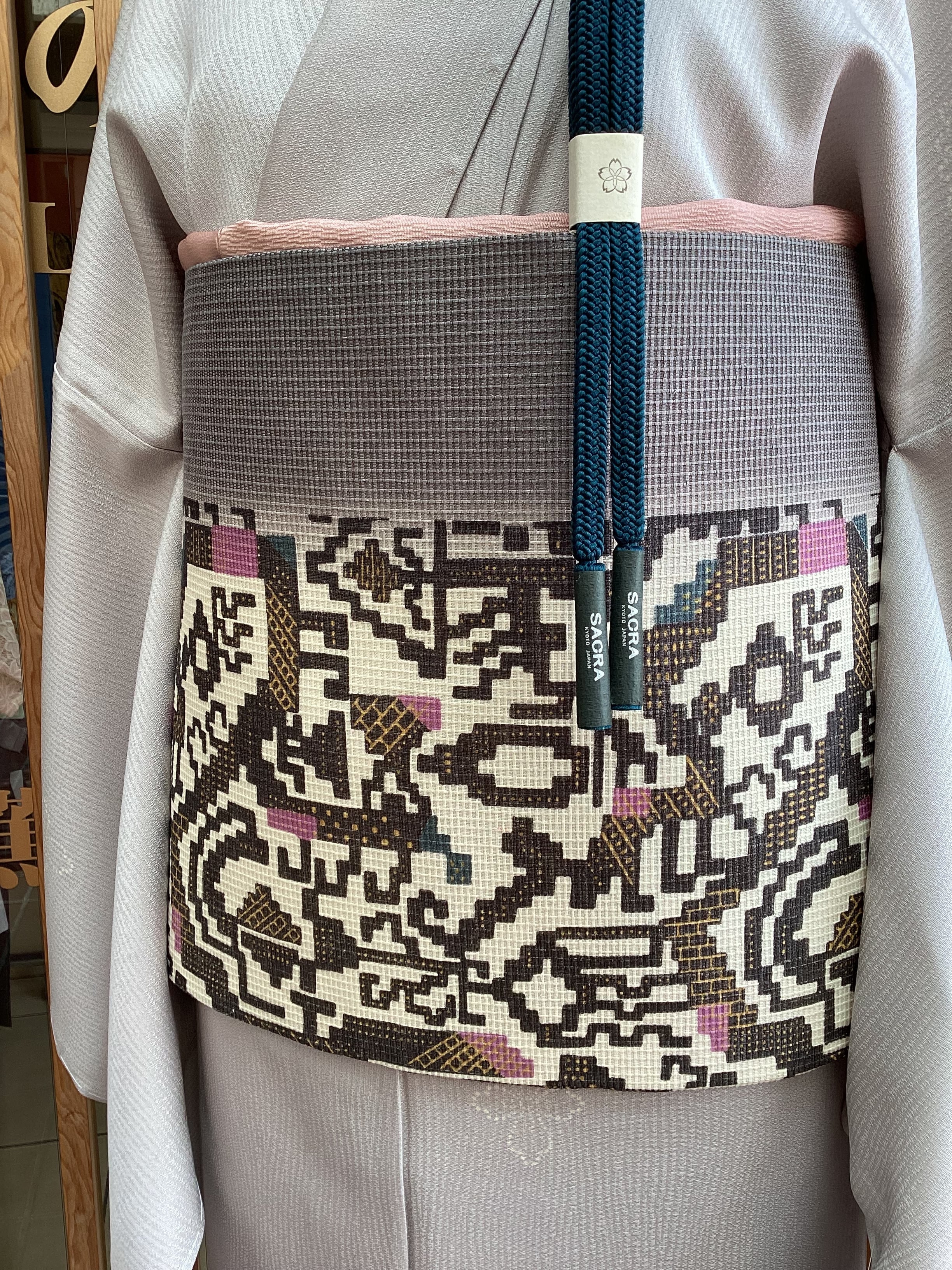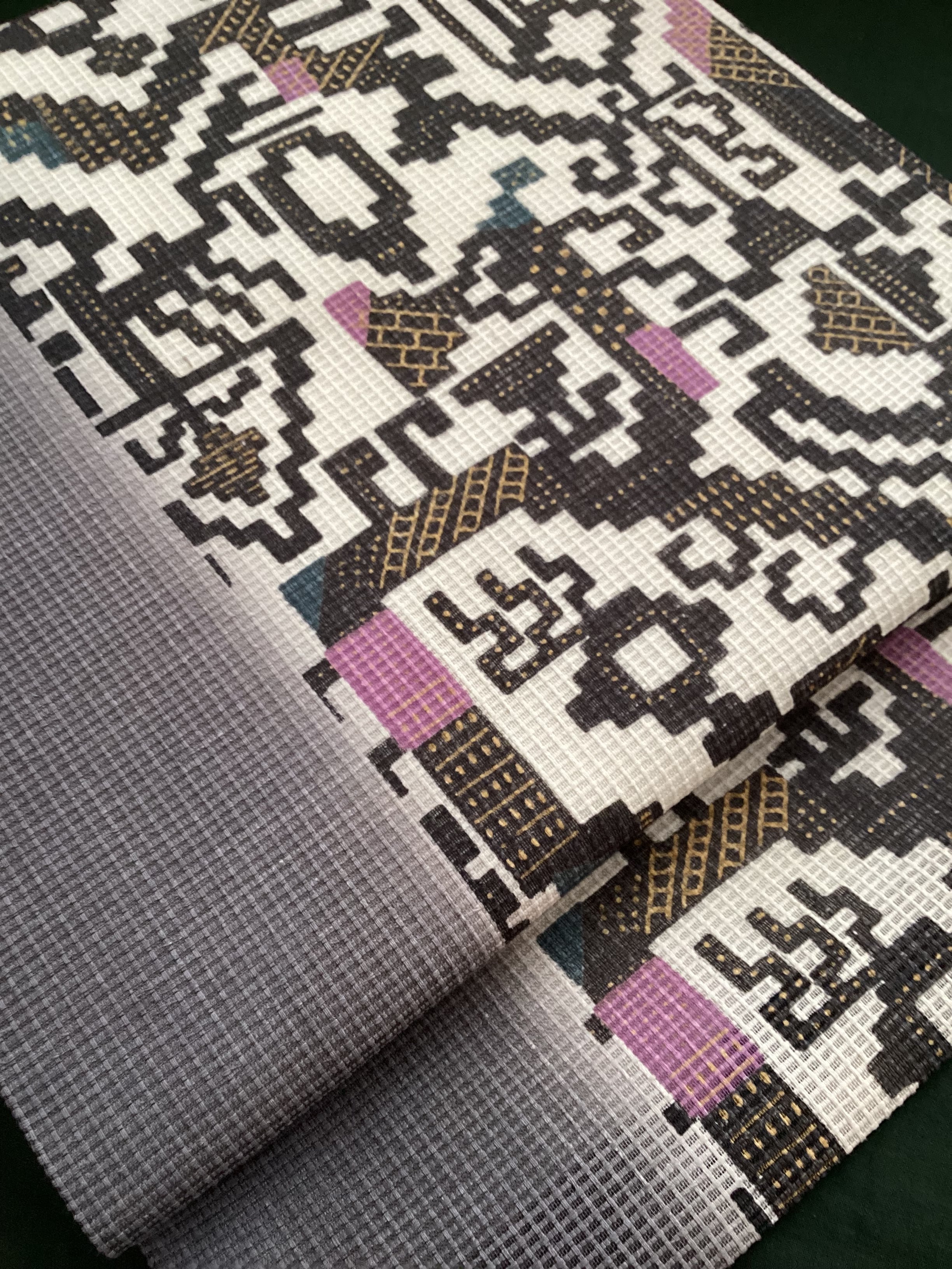 縦横格子状に織られた絹紅梅地のなごや帯です。帯芯が入っているので、全体的な透け感は無く、お単衣のシーズンから締めていただける軽やかな風合いです。消墨色の縦ラインと楽しい連続した抽象的な幾何学文様で、締める方向を変えると2パターンの前柄をお楽しみいただけます。カジュアルなお出掛けに遊び心あるなごや帯はいかがでしょうか?