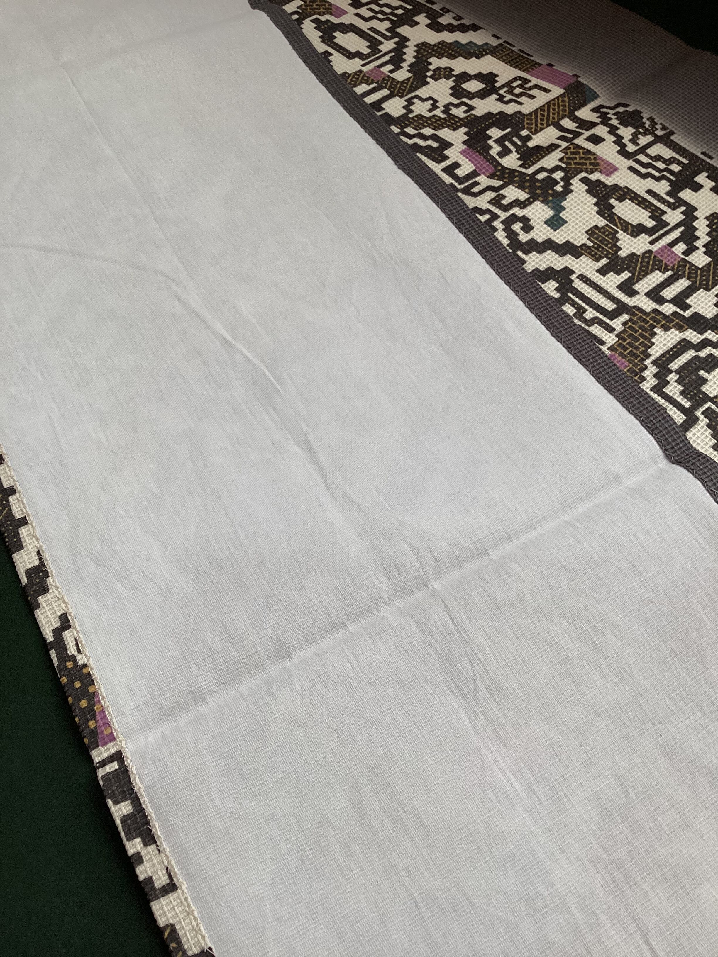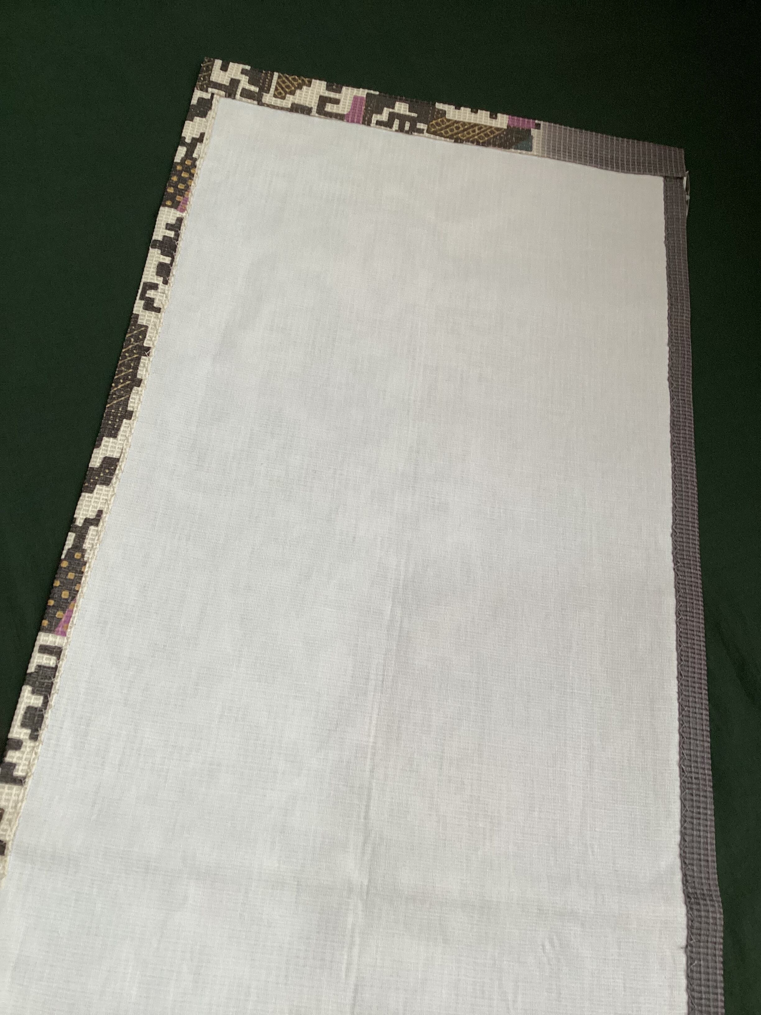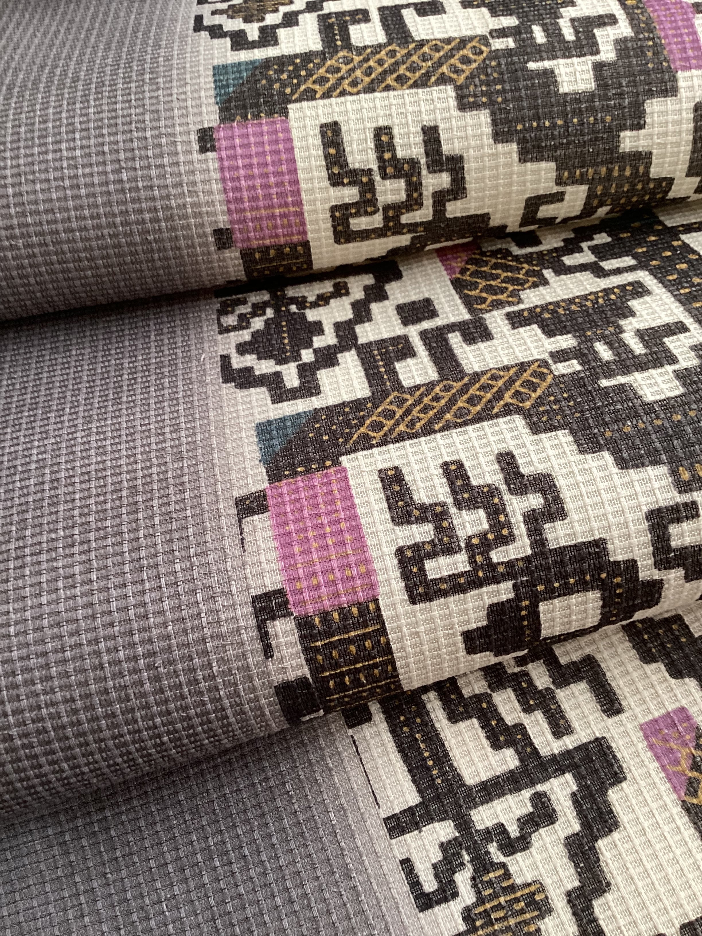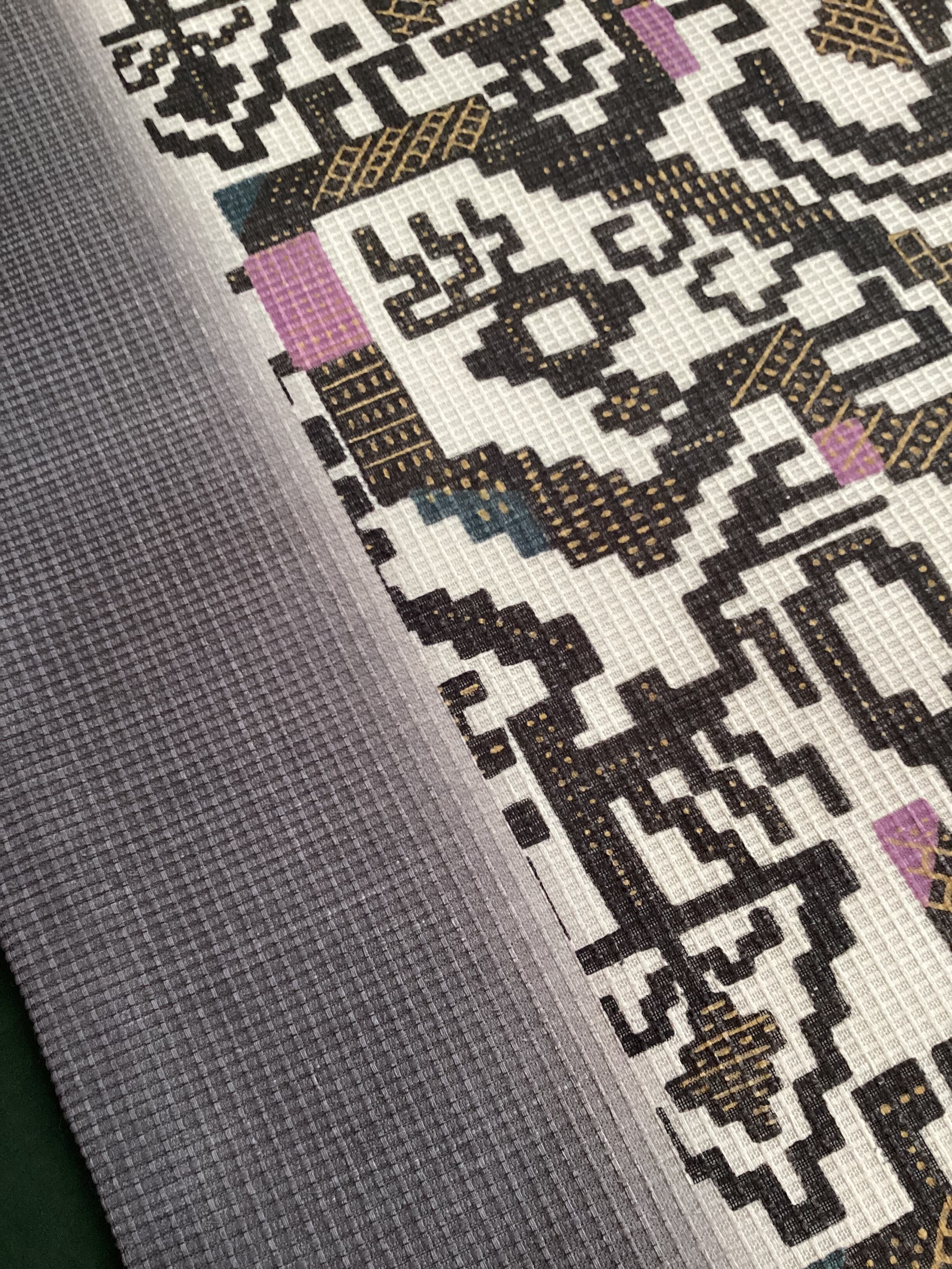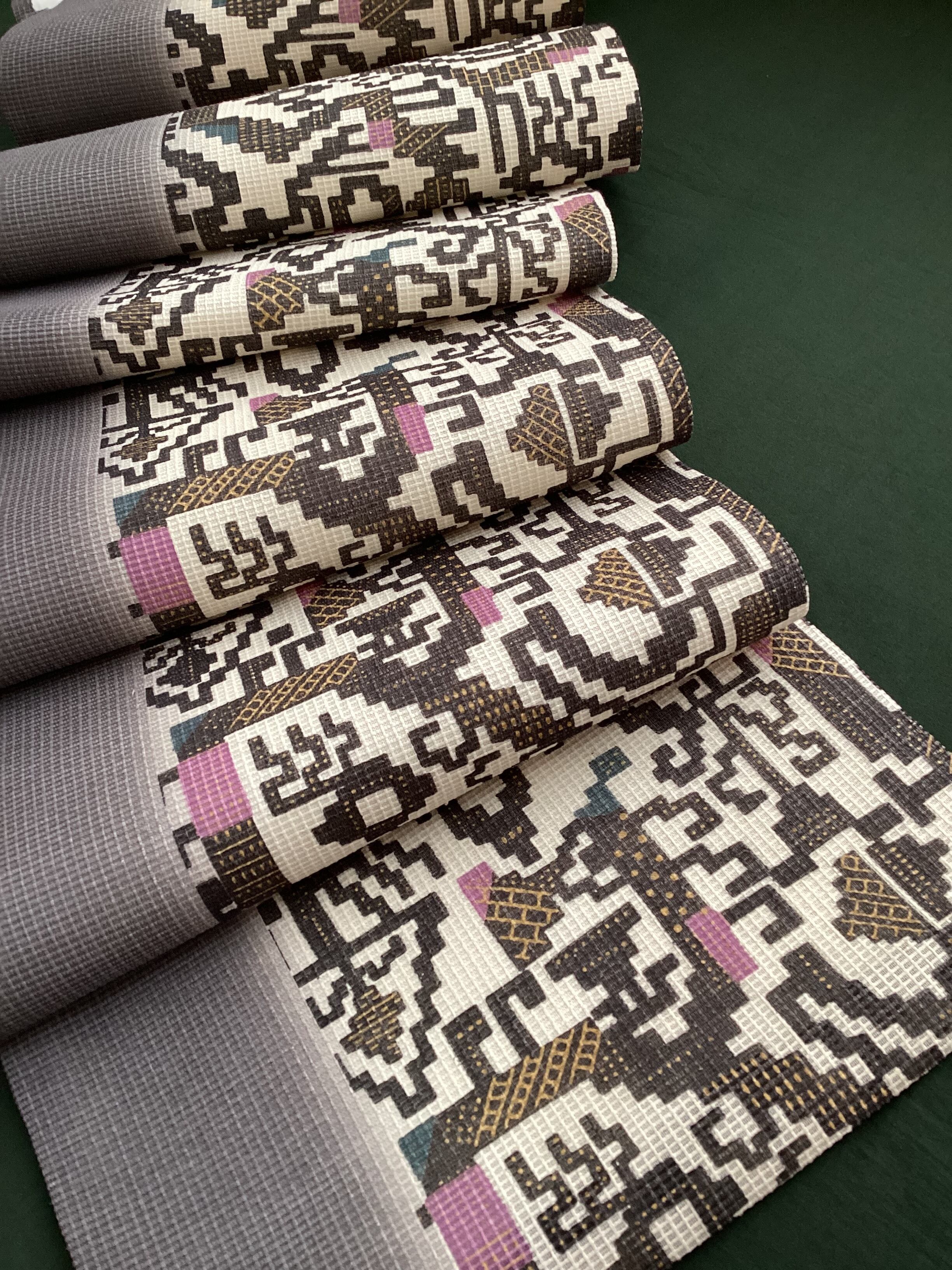 縦横格子状に織られた絹紅梅地のなごや帯です。帯芯が入っているので、全体的な透け感は無く、お単衣のシーズンから締めていただける軽やかな風合いです。消墨色の縦ラインと楽しい連続した抽象的な幾何学文様で、締める方向を変えると2パターンの前柄をお楽しみいただけます。カジュアルなお出掛けに遊び心あるなごや帯はいかがでしょうか?
