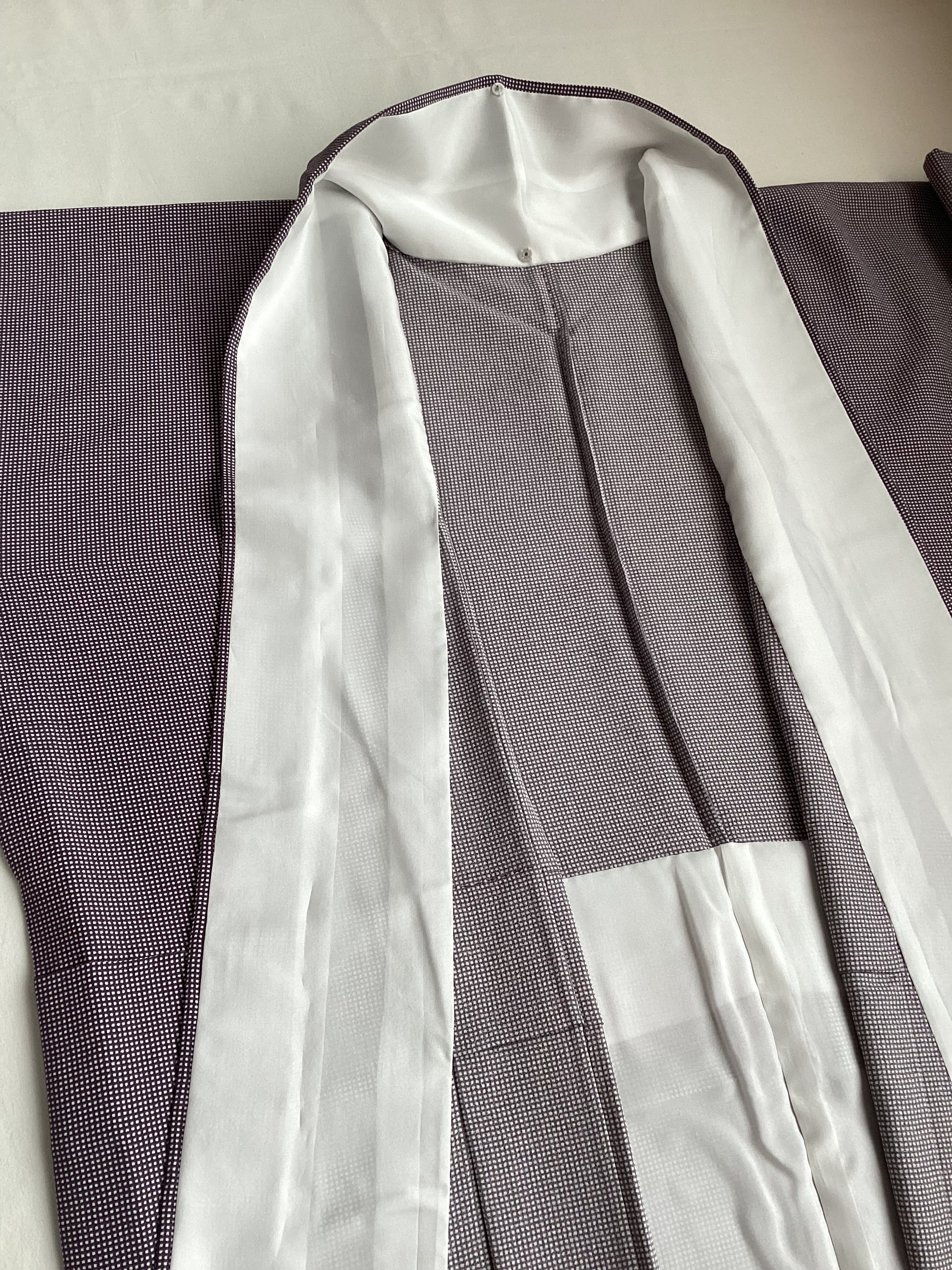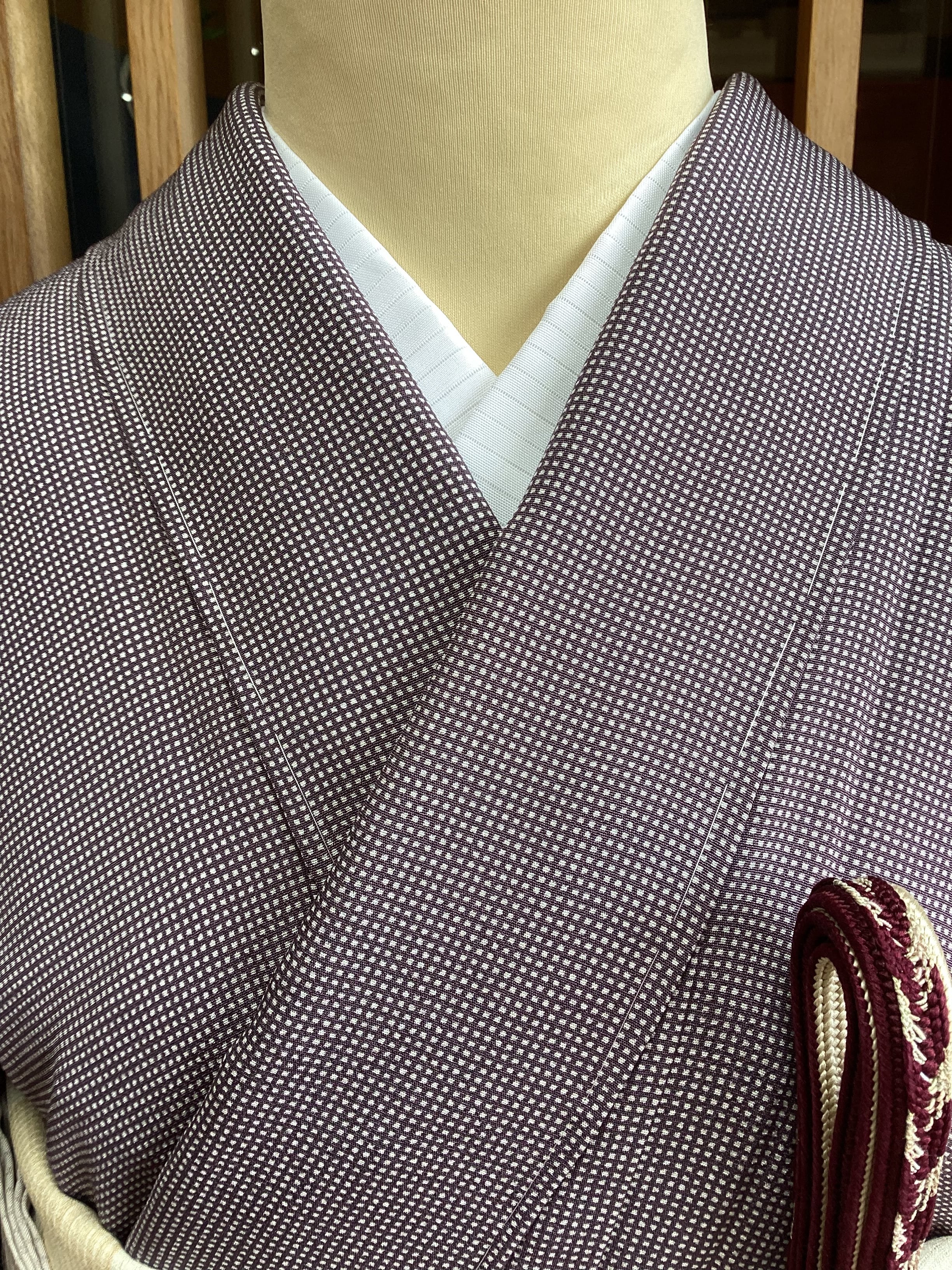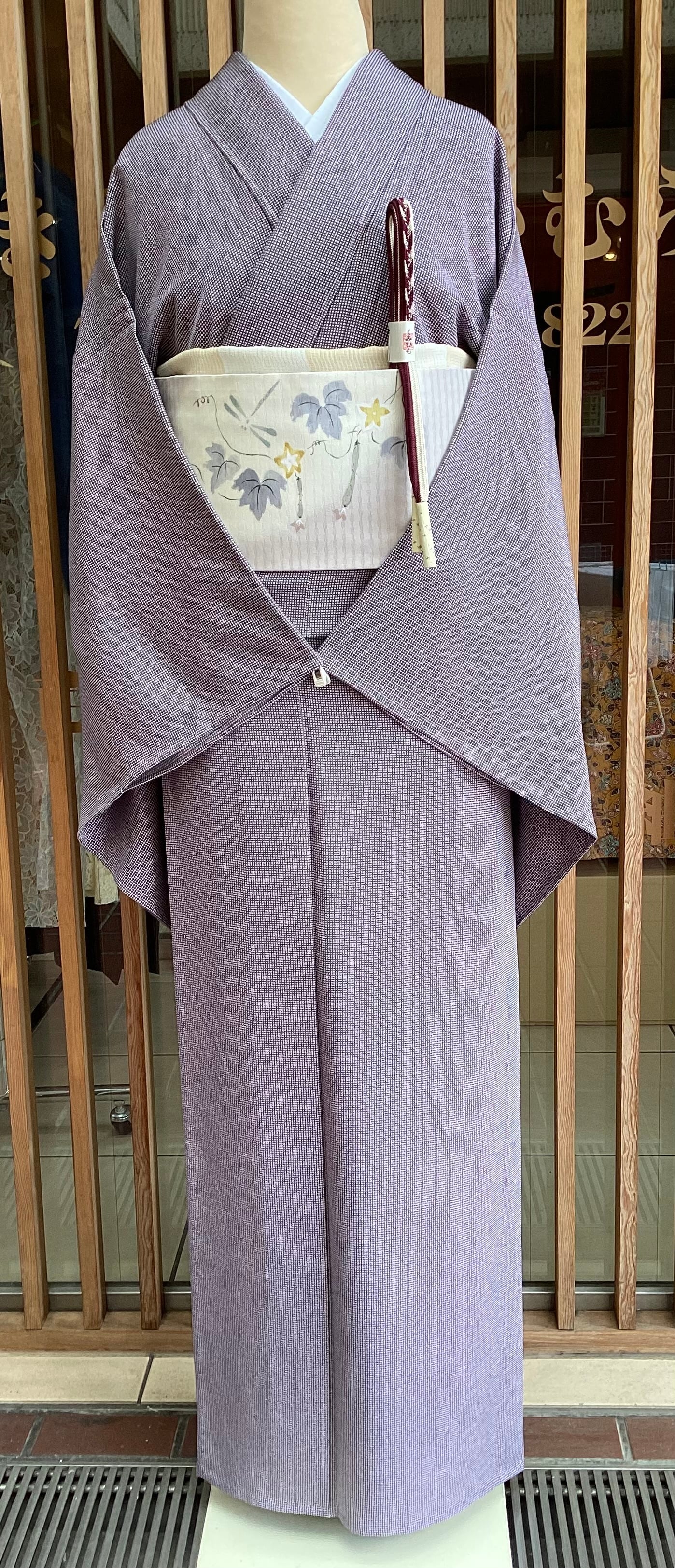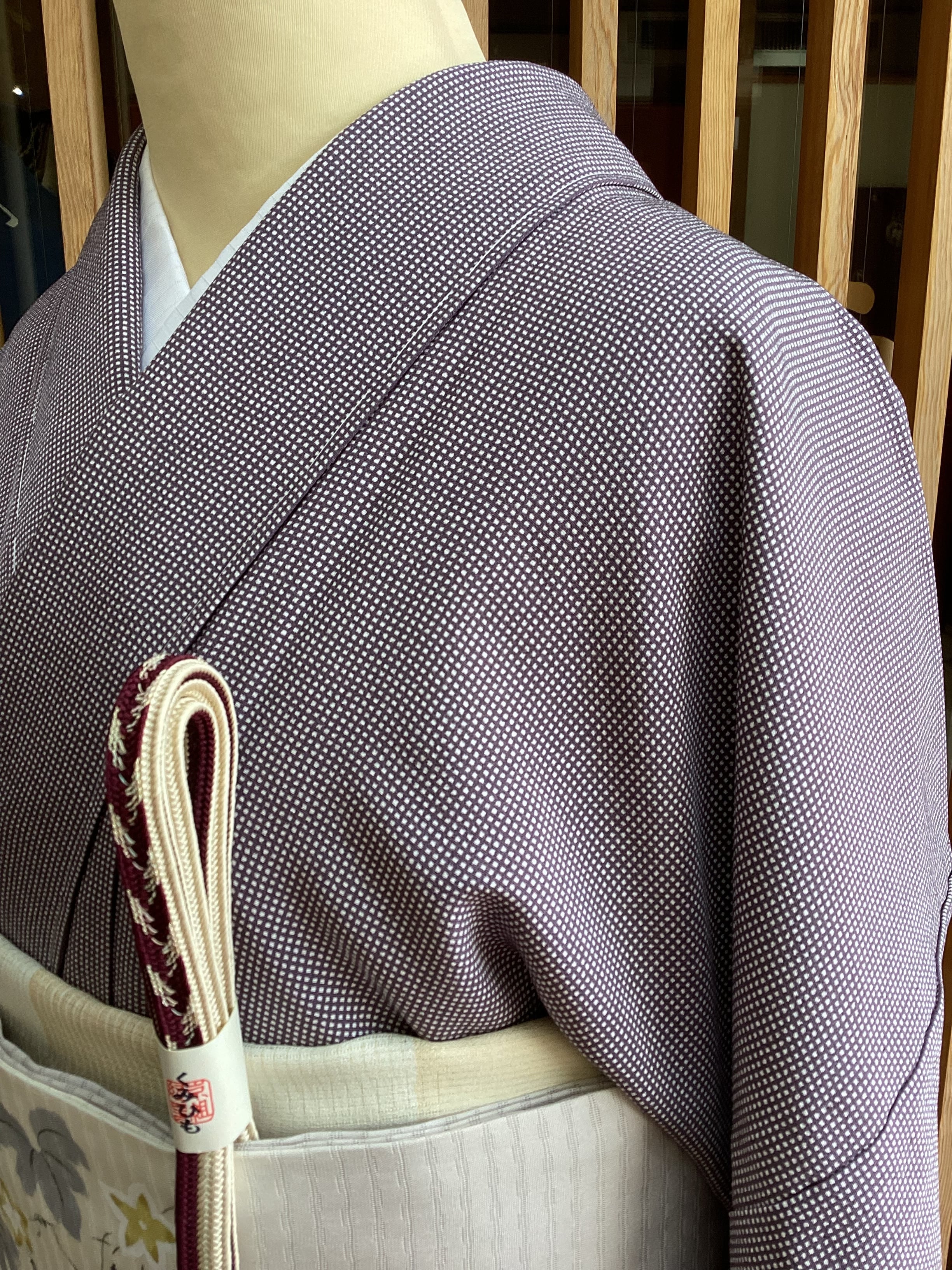 紫のラインの角通し文様の江戸小紋きものです。江戸小紋3役のひとつに数えられる角通し文様なので、帯合わせ次第で少しきちんとした装いが必要な場面から、カジュアルなお出掛けまで、またはこちらのお色味ですと、お悔やみの席にもご着用いただける対応範囲の広い一枚です。あると便利な江戸小紋は、特に着物ビギナーさんにおすすめしたいおきものです。身丈、裄、身巾のサイズ十分に反物から仕立てた新品のお品でございます。お単衣でも一枚持っておかれると、心強い江戸小紋、いかがでしょうか。