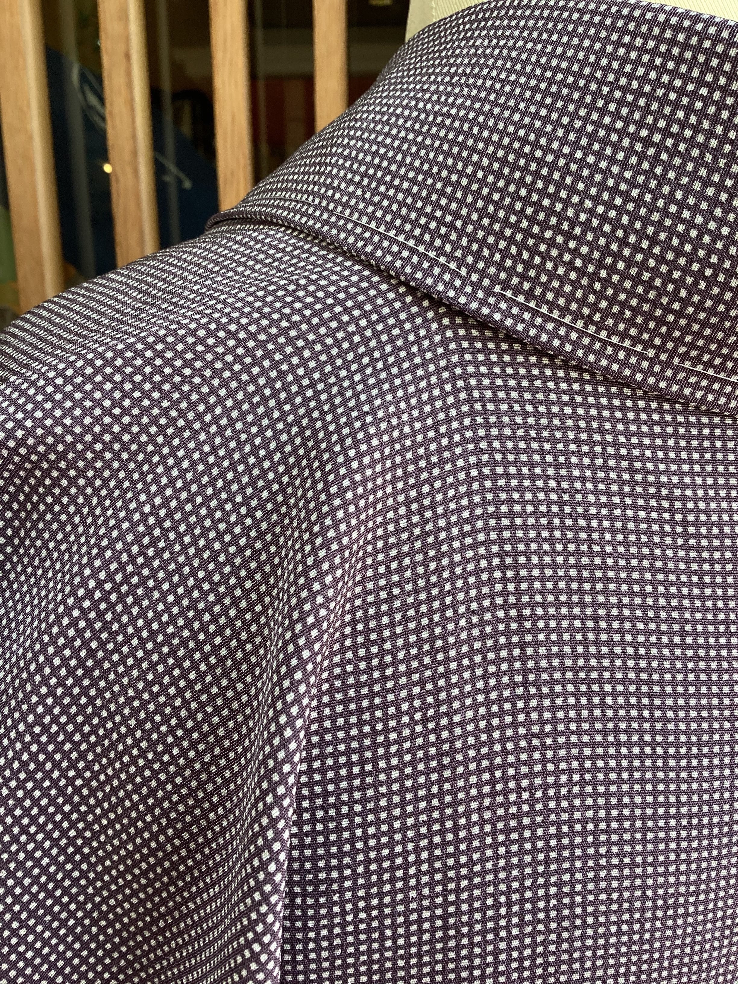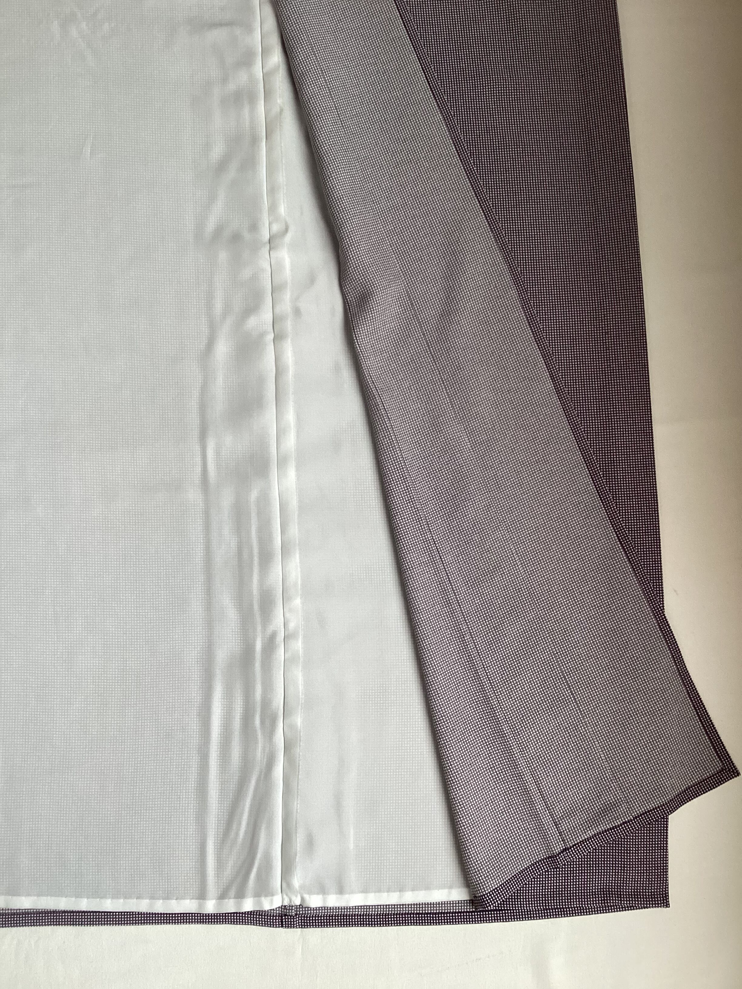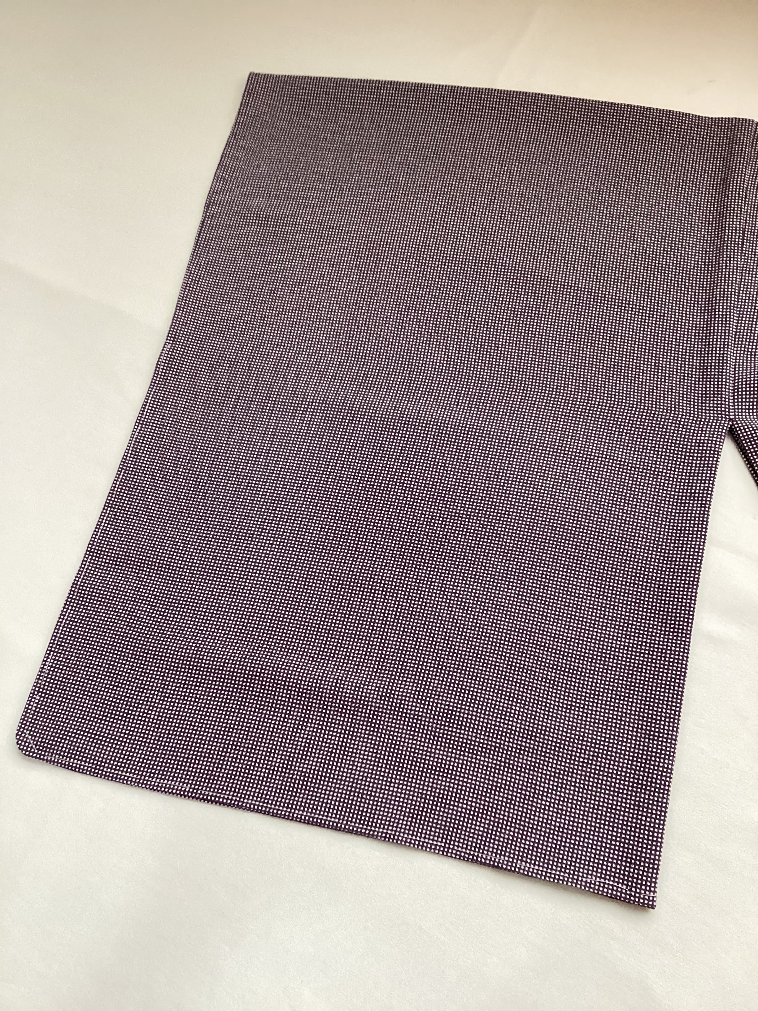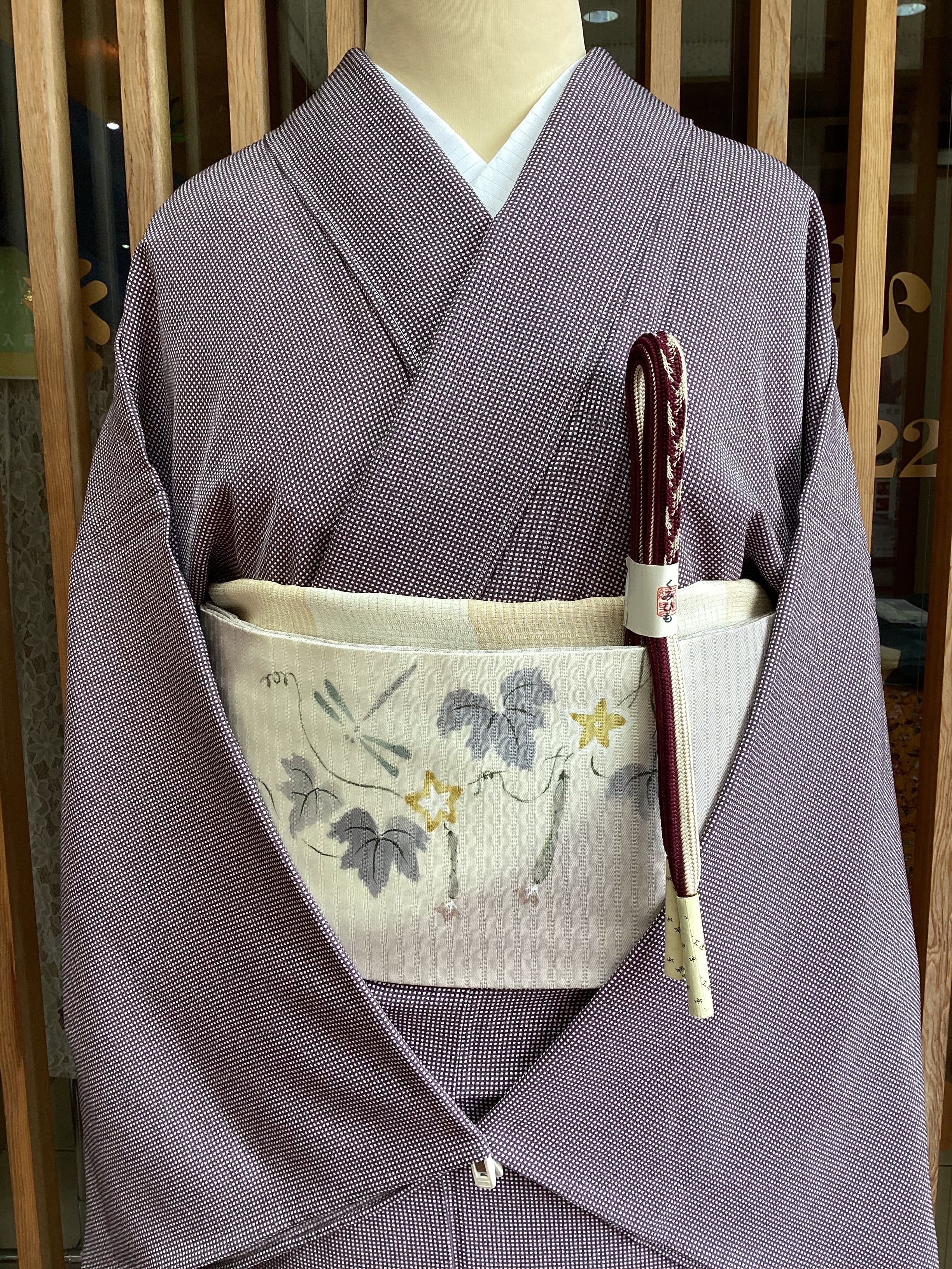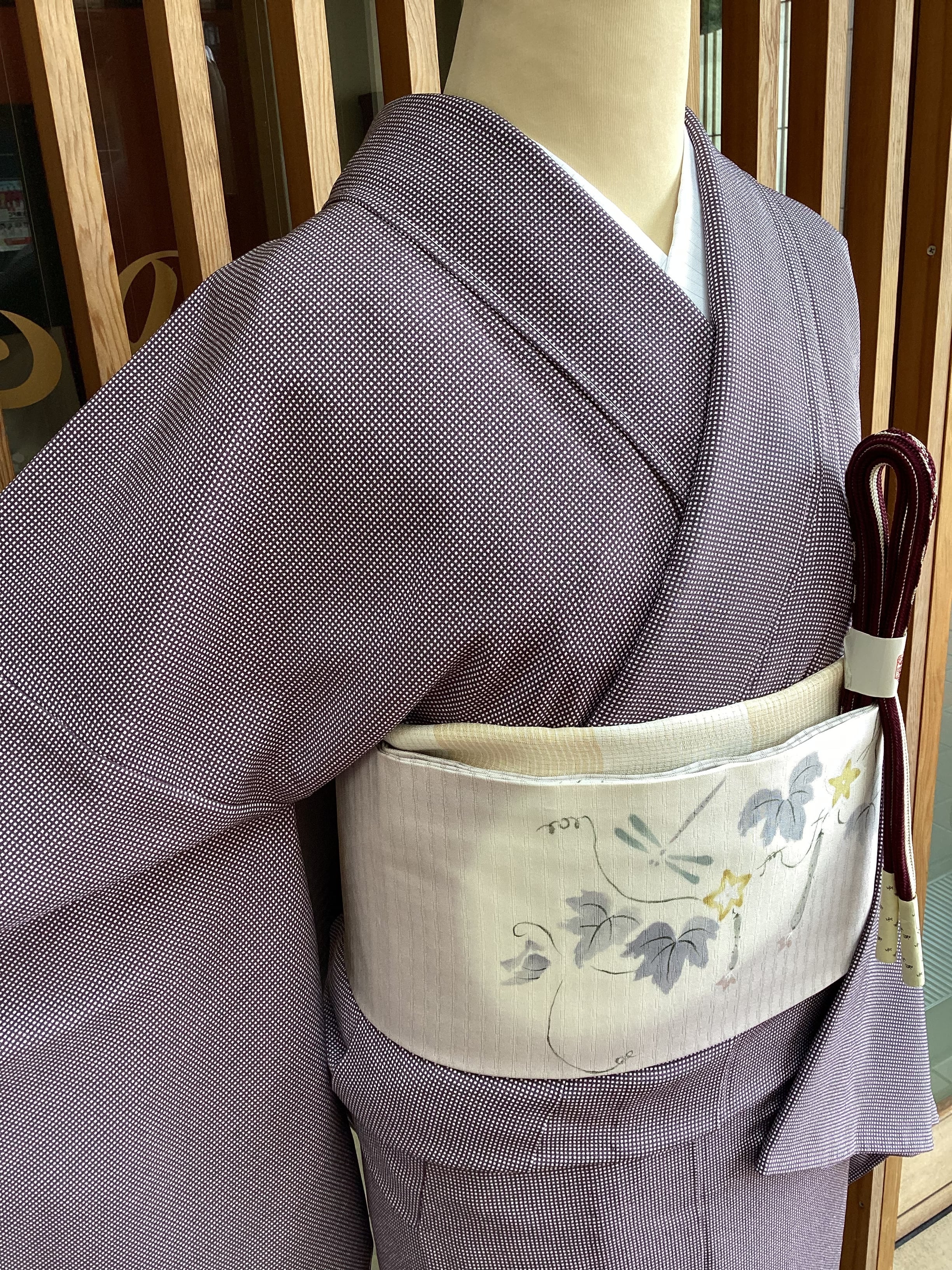 紫のラインの角通し文様の江戸小紋きものです。江戸小紋3役のひとつに数えられる角通し文様なので、帯合わせ次第で少しきちんとした装いが必要な場面から、カジュアルなお出掛けまで、またはこちらのお色味ですと、お悔やみの席にもご着用いただける対応範囲の広い一枚です。あると便利な江戸小紋は、特に着物ビギナーさんにおすすめしたいおきものです。身丈、裄、身巾のサイズ十分に反物から仕立てた新品のお品でございます。お単衣でも一枚持っておかれると、心強い江戸小紋、いかがでしょうか。