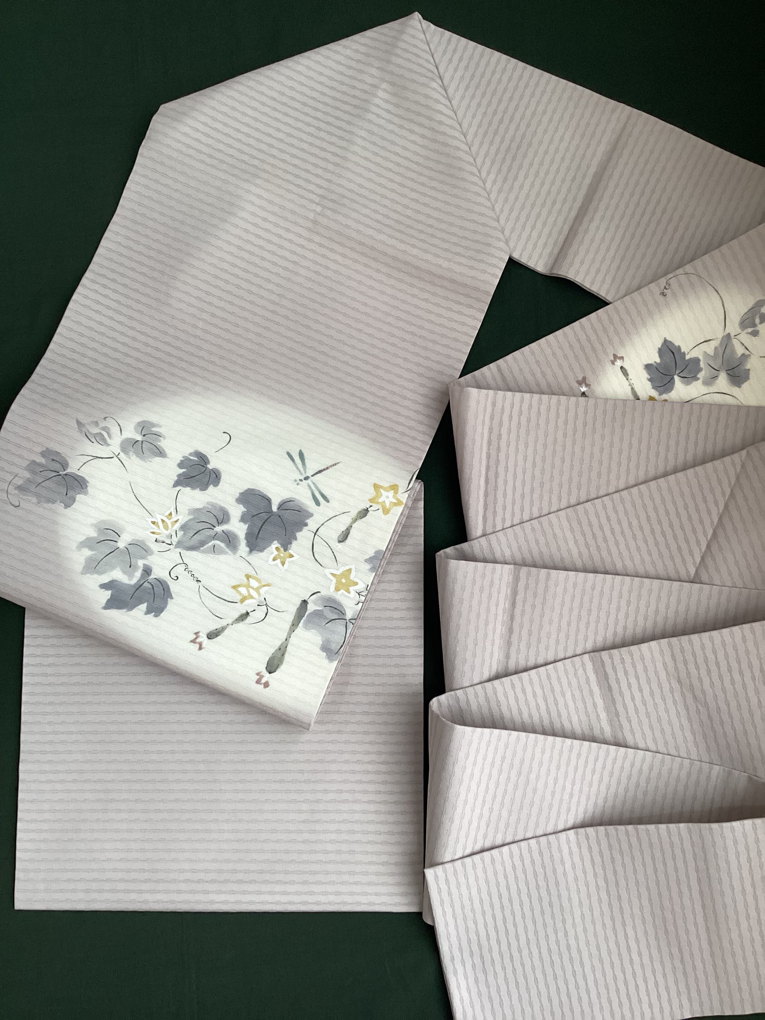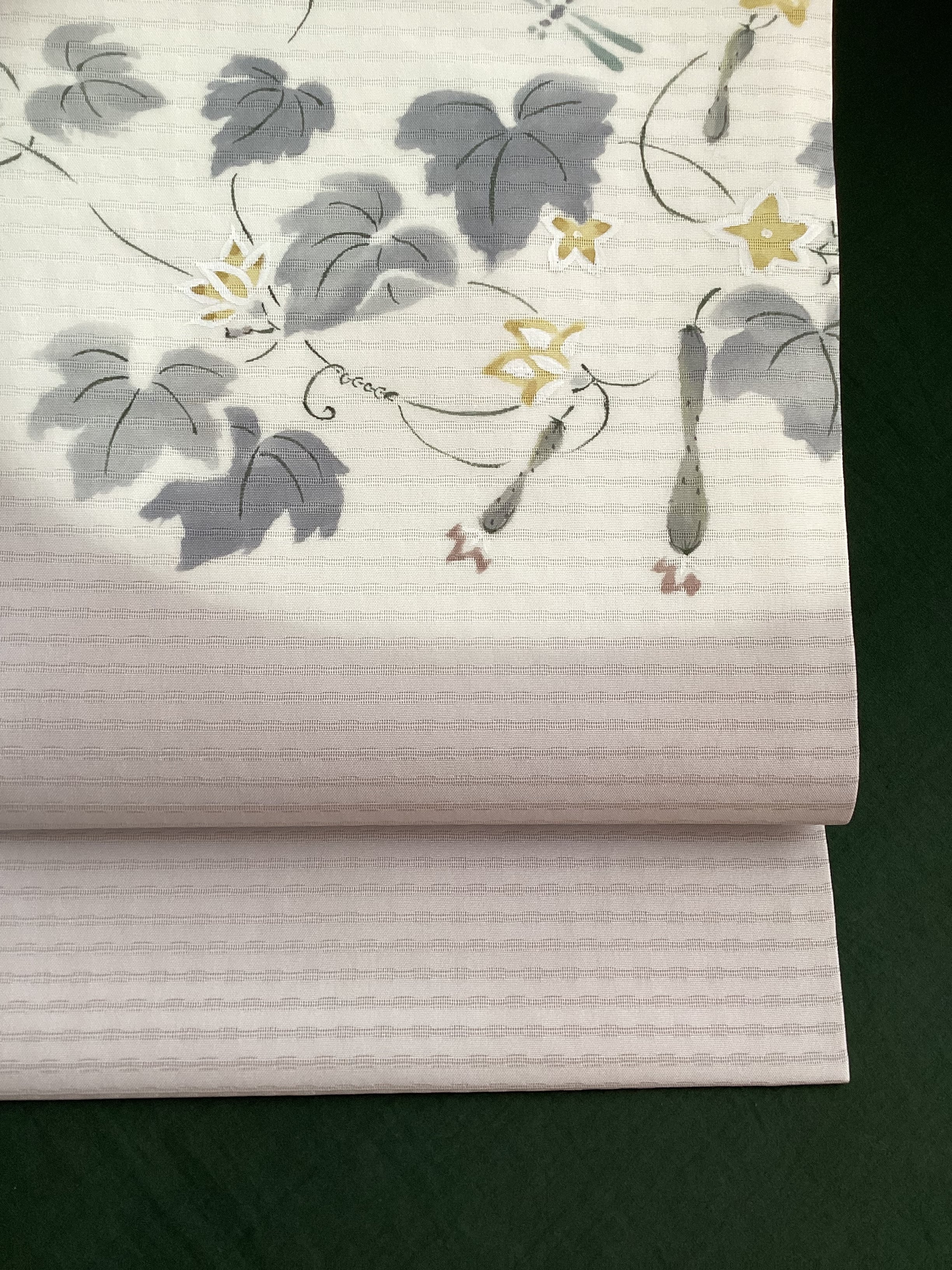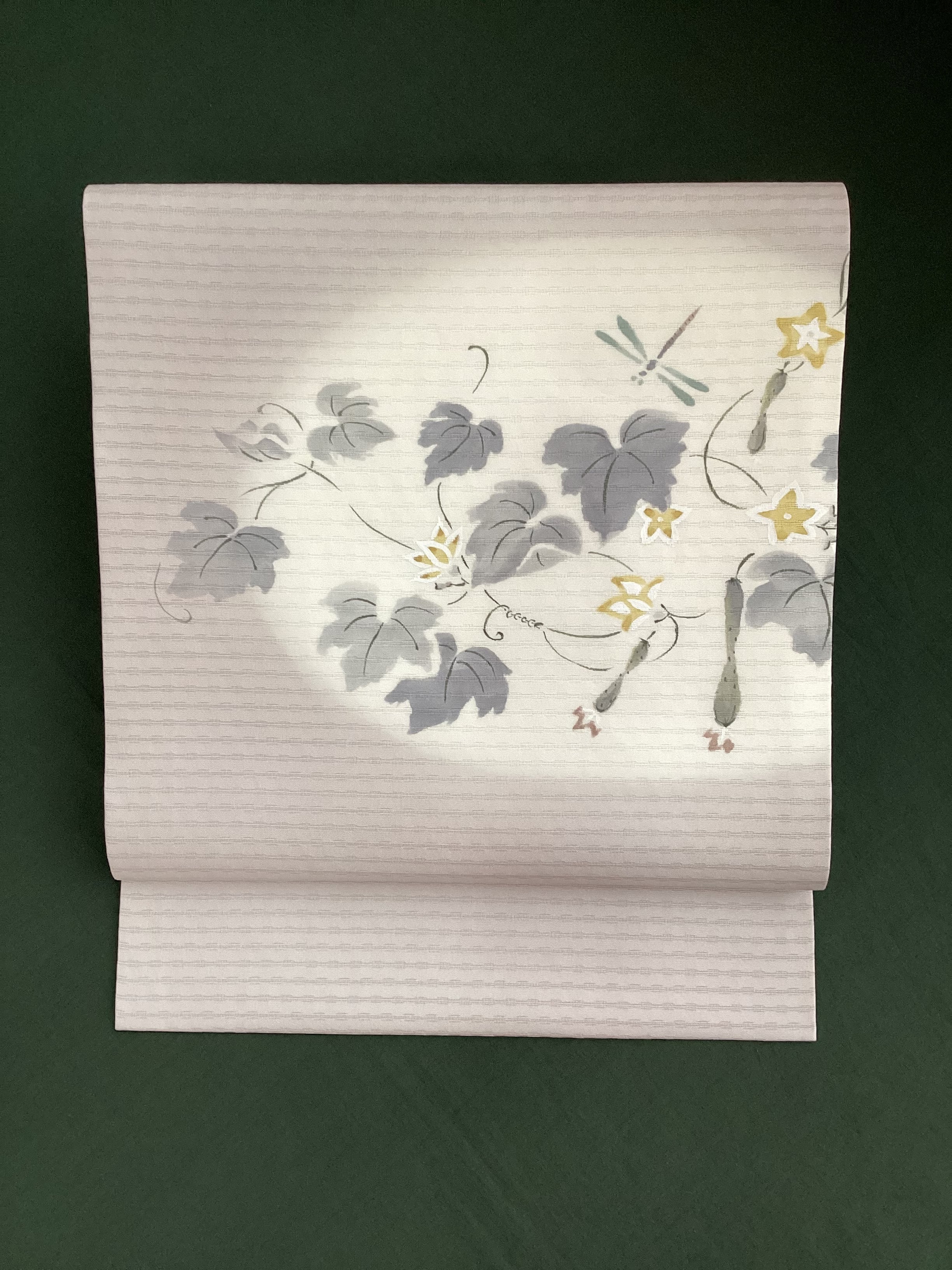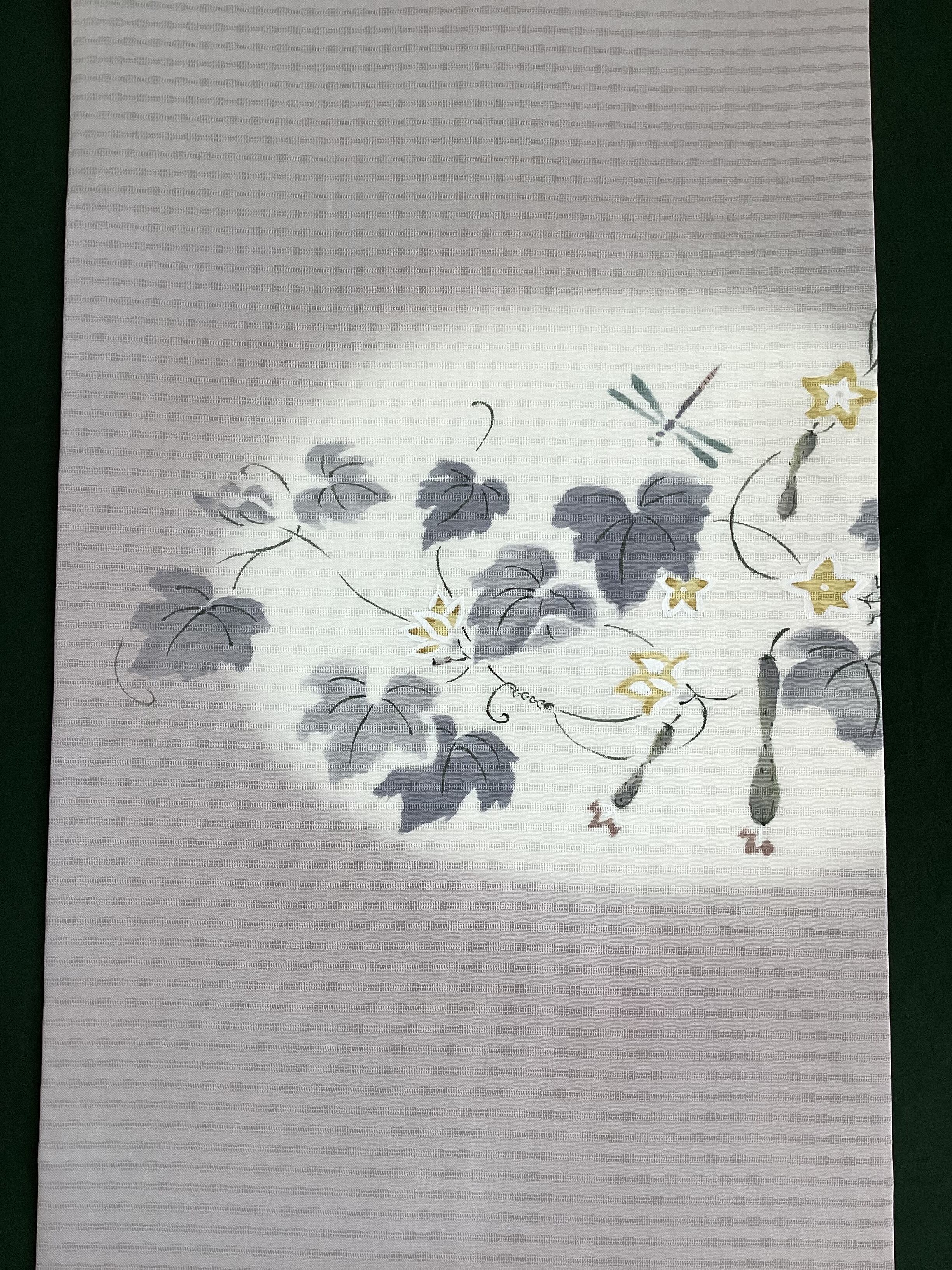 季節を感じさせる素敵な夏帯のご紹介です。墨絵のタッチでみずみずしい胡瓜や可愛い黄色い胡瓜の花が描かれており、蜻蛉たちも飛んでいます。暑い夏の日の装いにひんやりと涼をプラスして、見る側にも夏の実りや自然の豊かさを感じさせてくれ、ホッと和みを与えてくれるなごや帯です。変わり絽目で織られた涼やかな九寸なごや帯はいかがでしょうか。