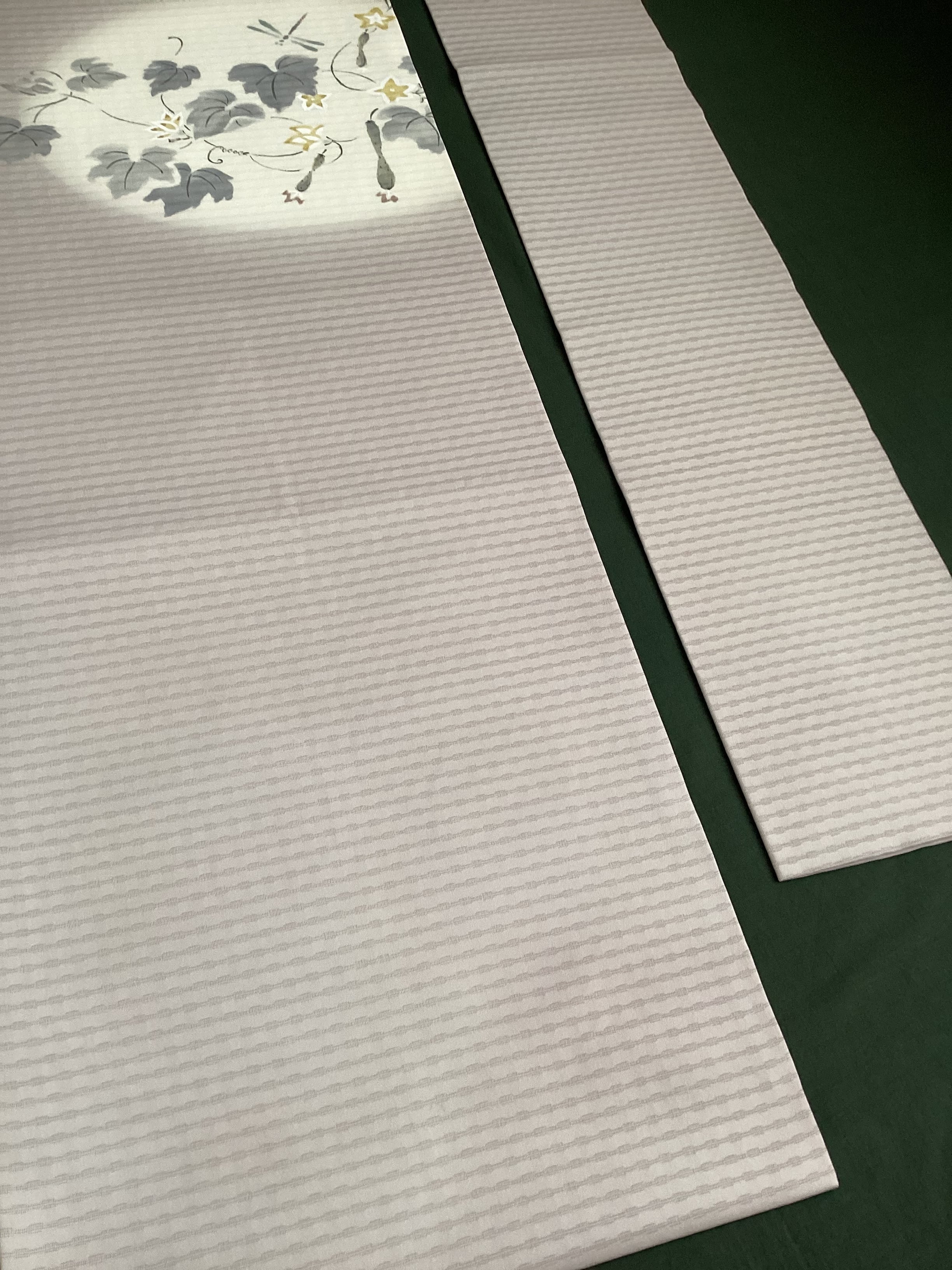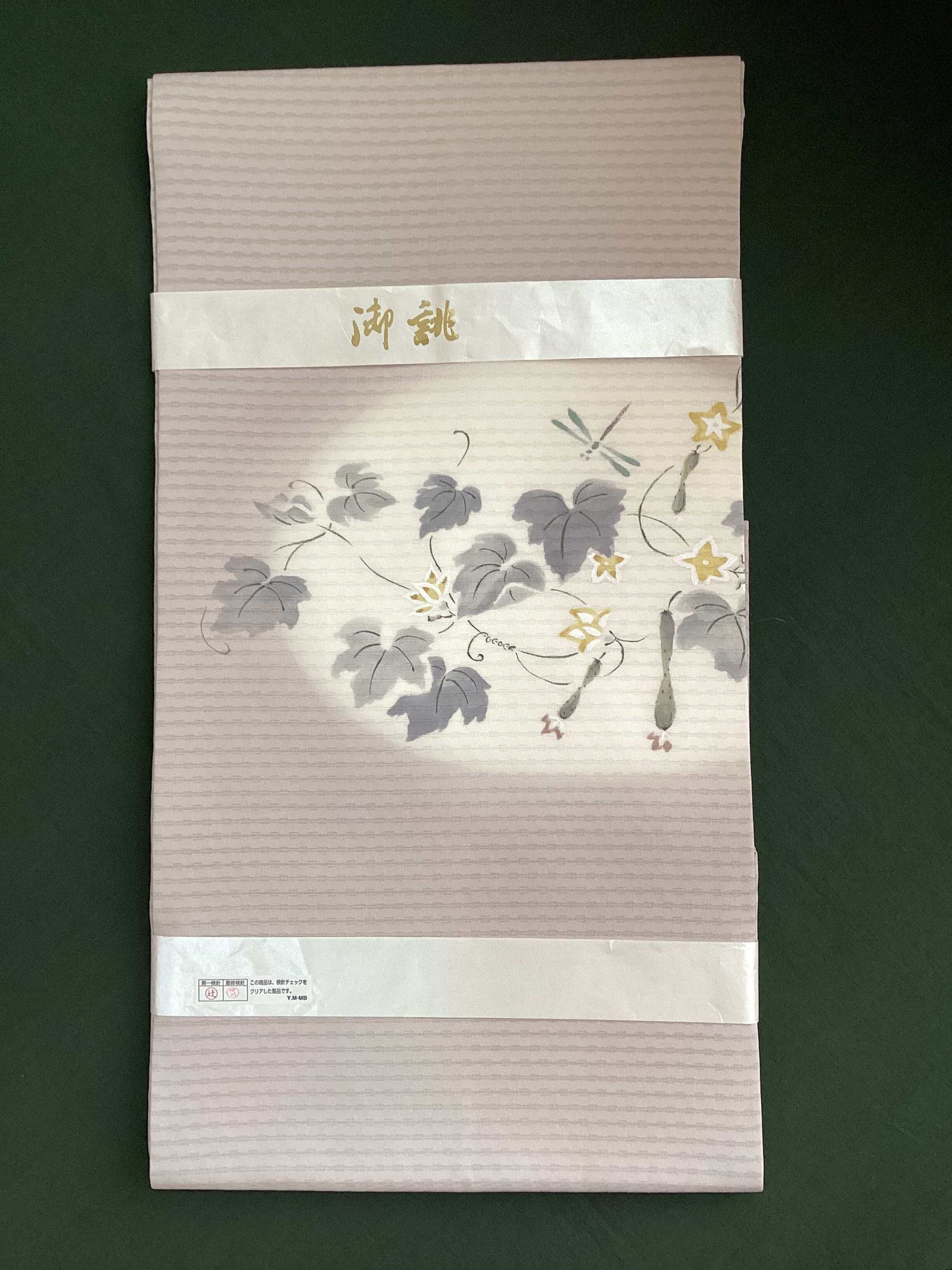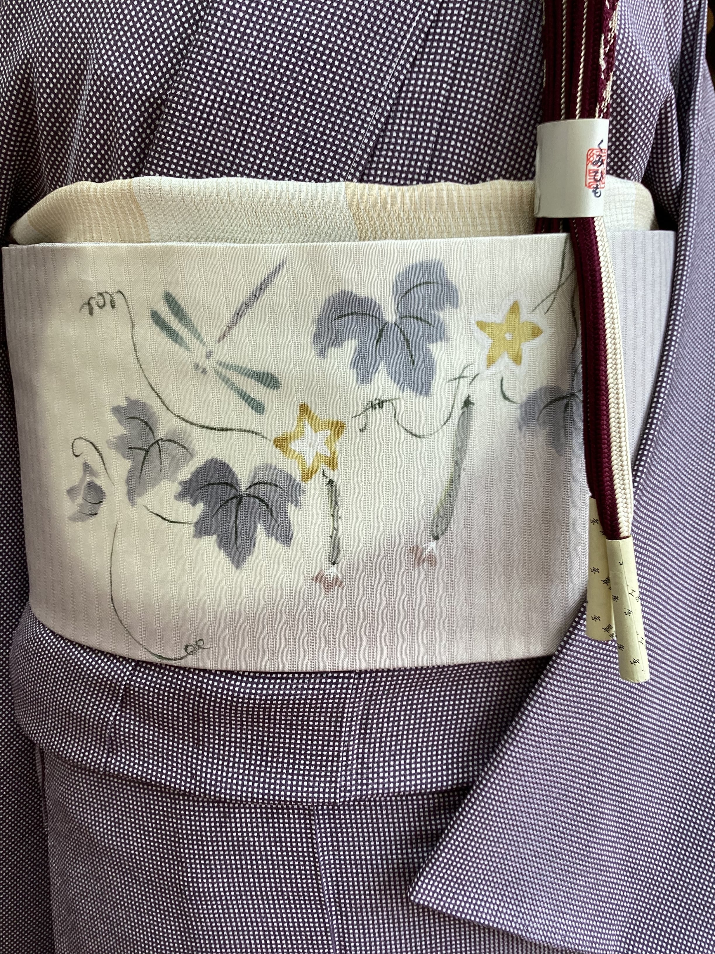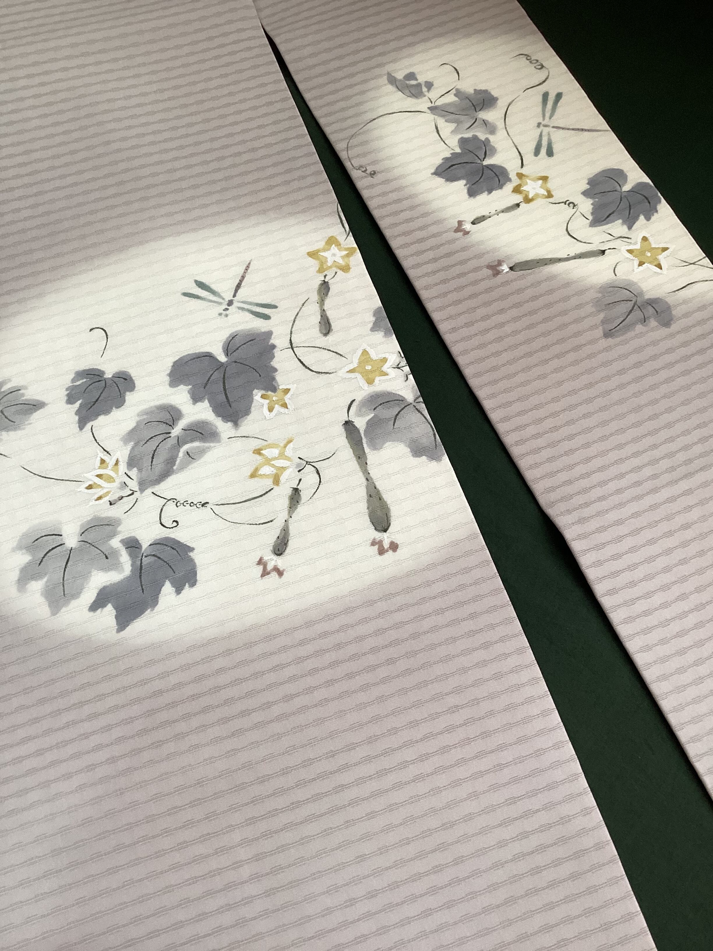 季節を感じさせる素敵な夏帯のご紹介です。墨絵のタッチでみずみずしい胡瓜や可愛い黄色い胡瓜の花が描かれており、蜻蛉たちも飛んでいます。暑い夏の日の装いにひんやりと涼をプラスして、見る側にも夏の実りや自然の豊かさを感じさせてくれ、ホッと和みを与えてくれるなごや帯です。変わり絽目で織られた涼やかな九寸なごや帯はいかがでしょうか。