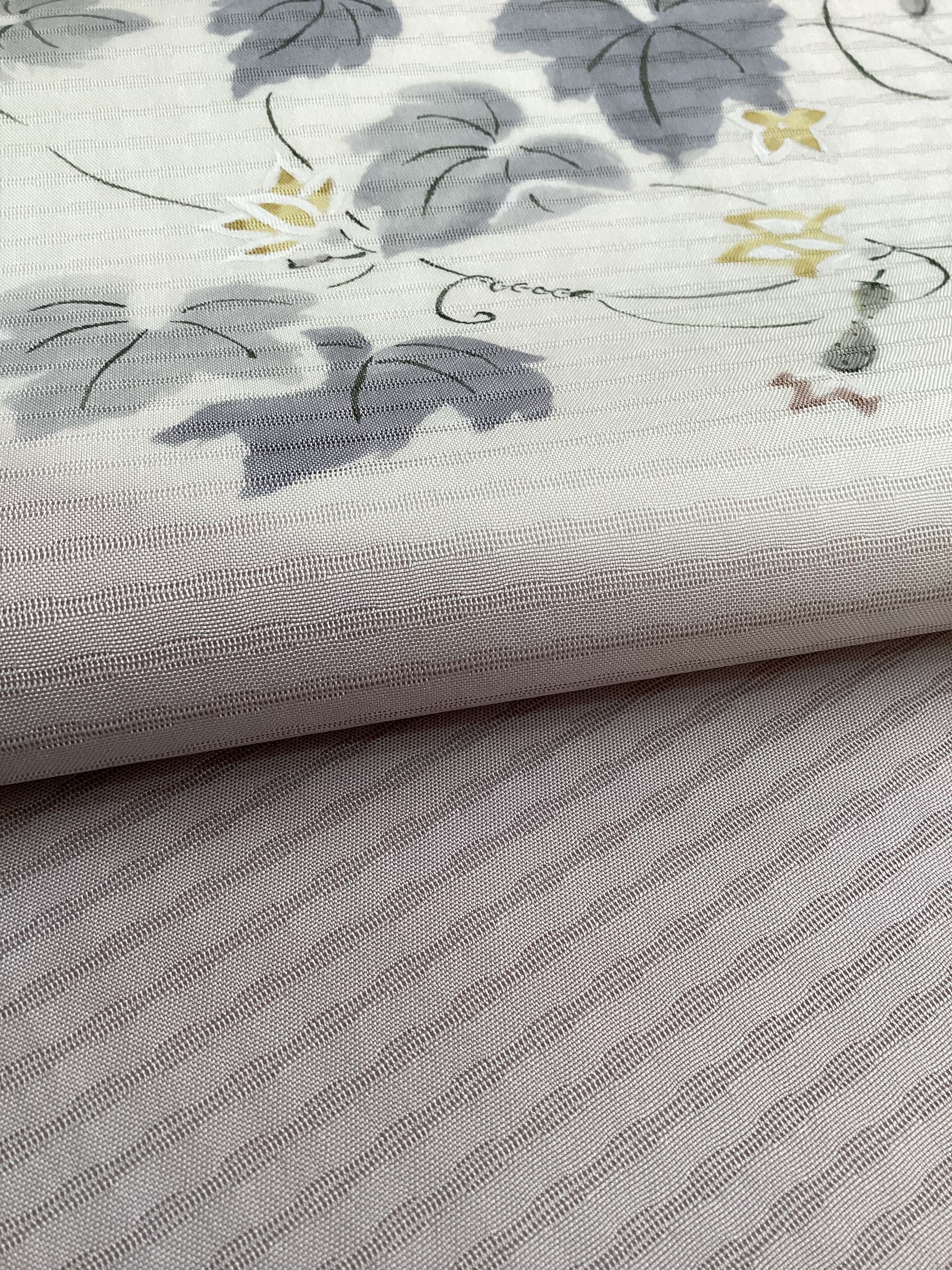 薄梅鼠色地勝虫と胡瓜文絽なごや帯(反端付き)260429-2(リユース品)