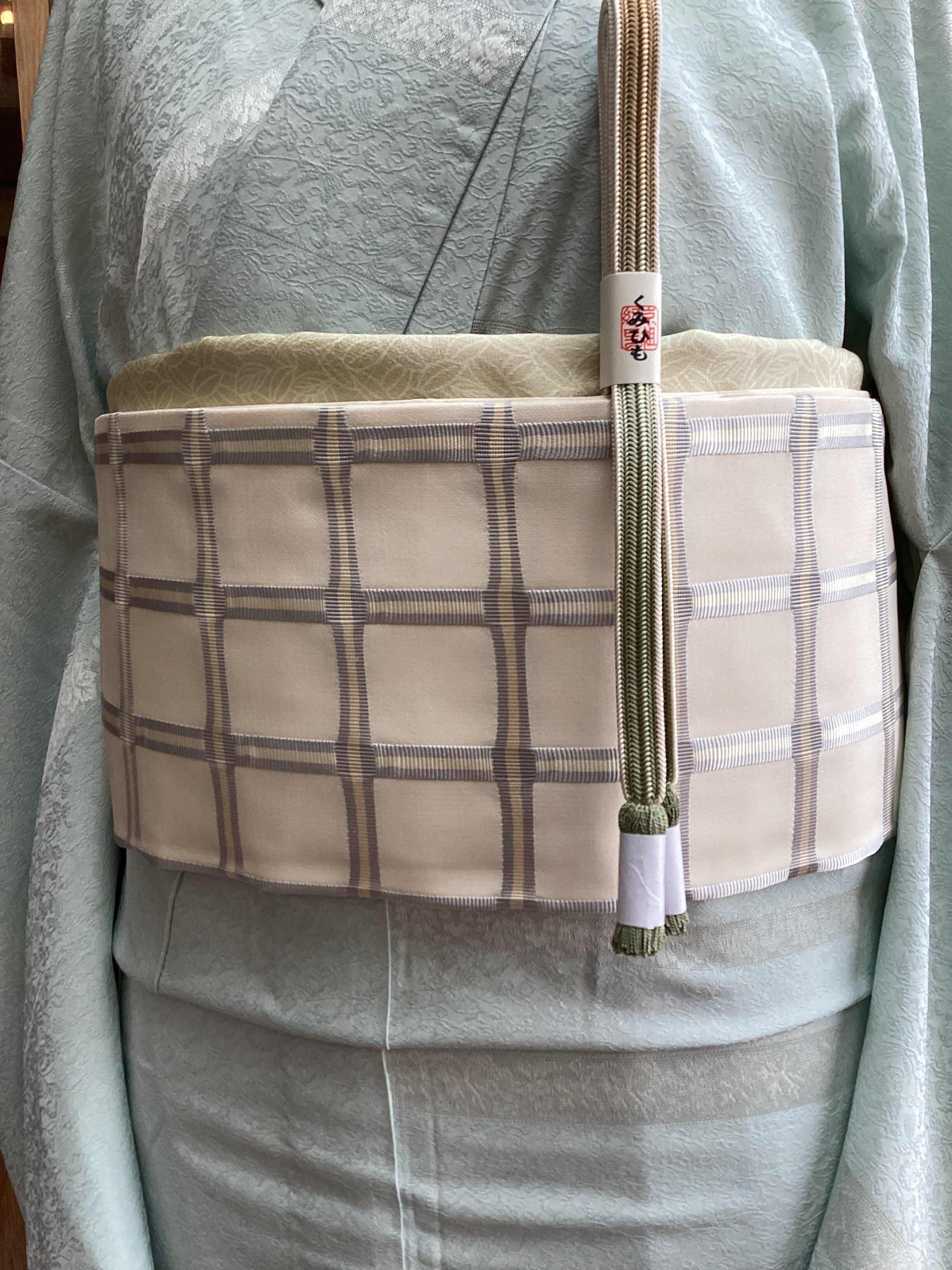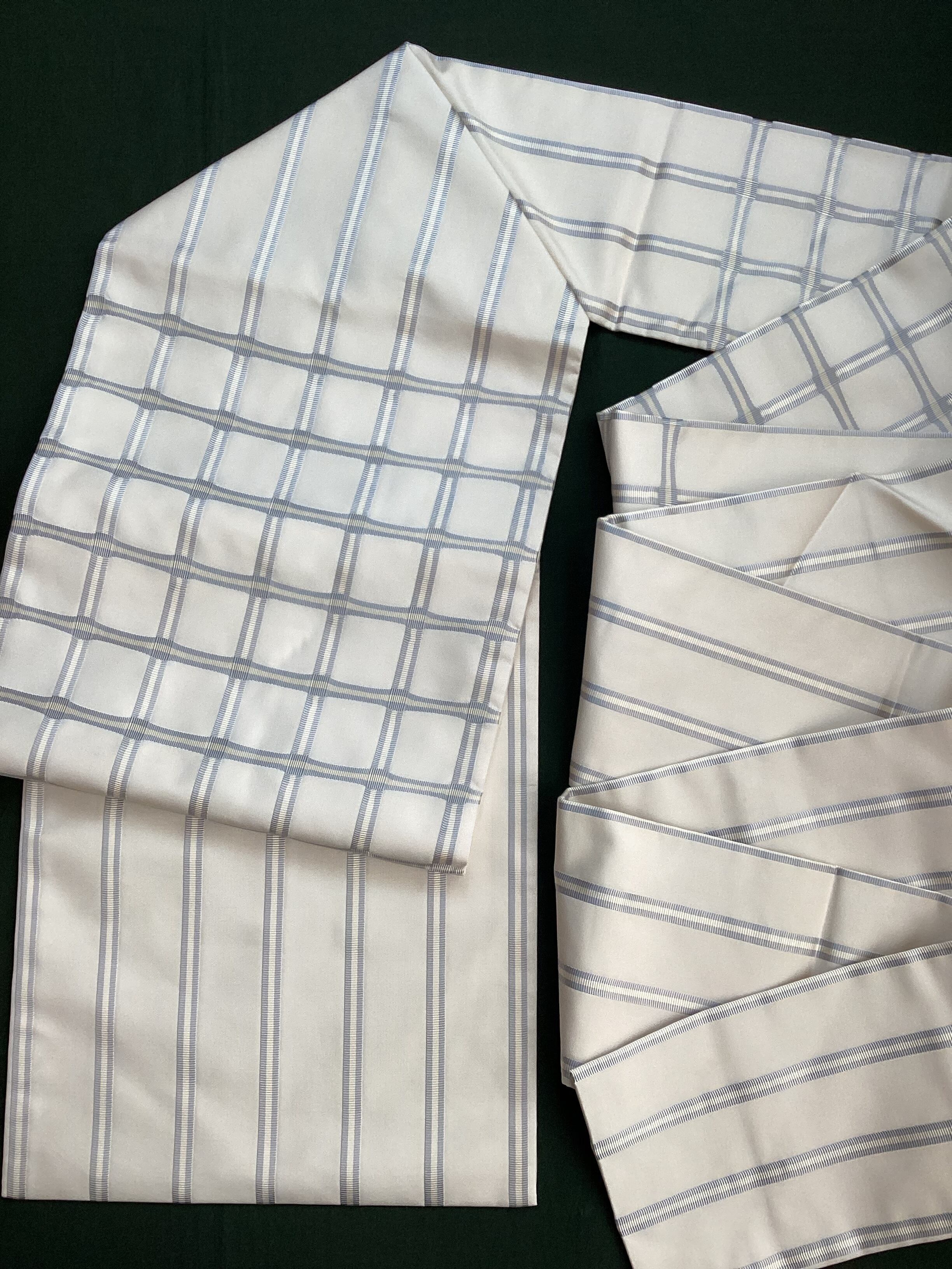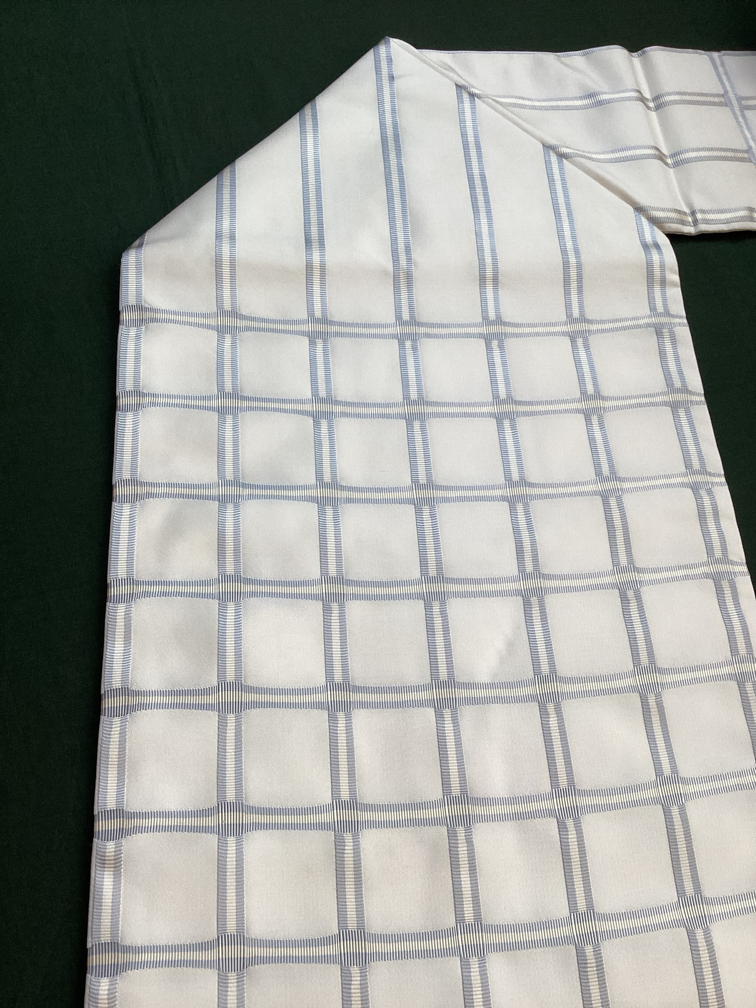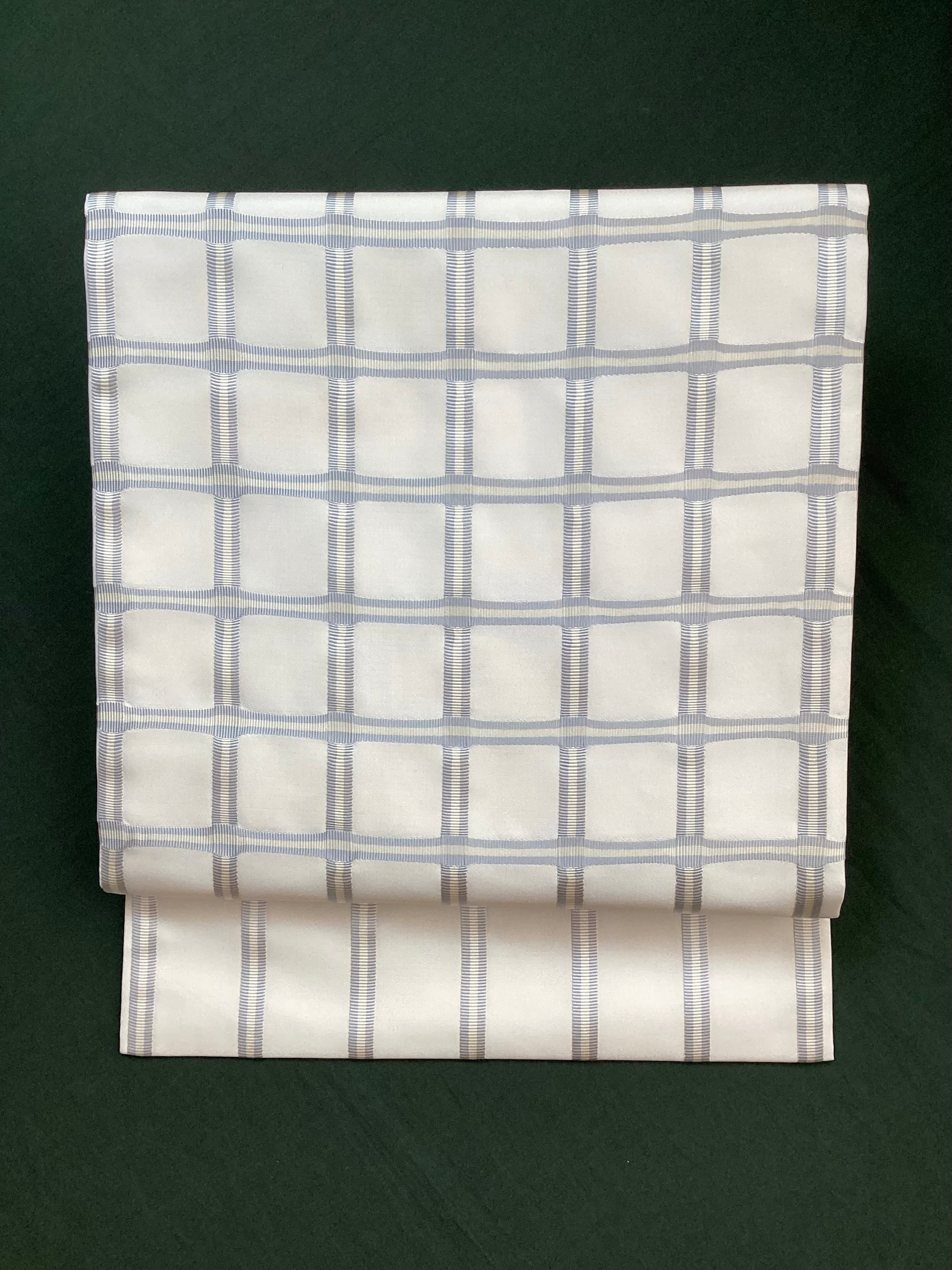 艶のあるしなやかで滑らかな乳白色の織地に銀鼠色とクリーム色の浮き織りで格子や間道文様が織り込まれた九寸なごや帯です。絹糸の持つ光沢感が美しい織地で上質で上品さがございます。柔らかものから紬までパステル調からモノトーンまで幅広く合わせていただけます。また、附下や色無地や江戸小紋などをややカジュアルダウンして気軽なコーディネートにまとめたい時にいかがでしょうか。カジュアルな中にも上品さを添えてくれます。白地で爽やかに、お柄の立ったおきものにもコーディネートしやすい九寸帯です。