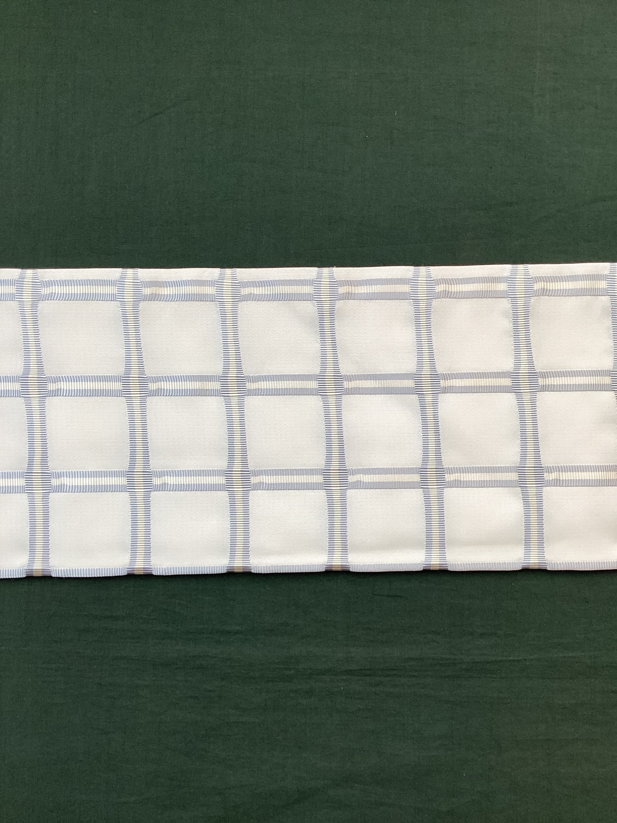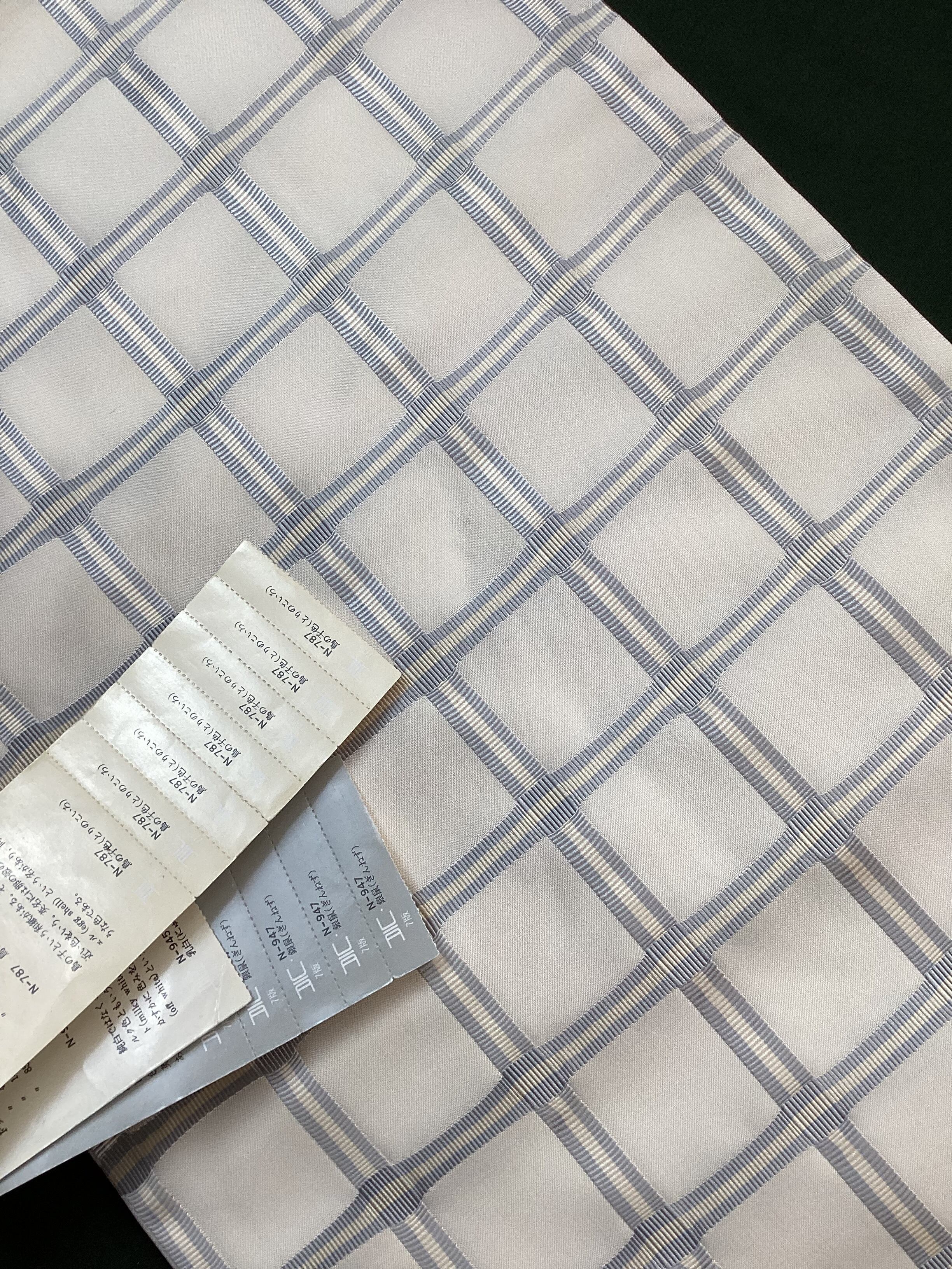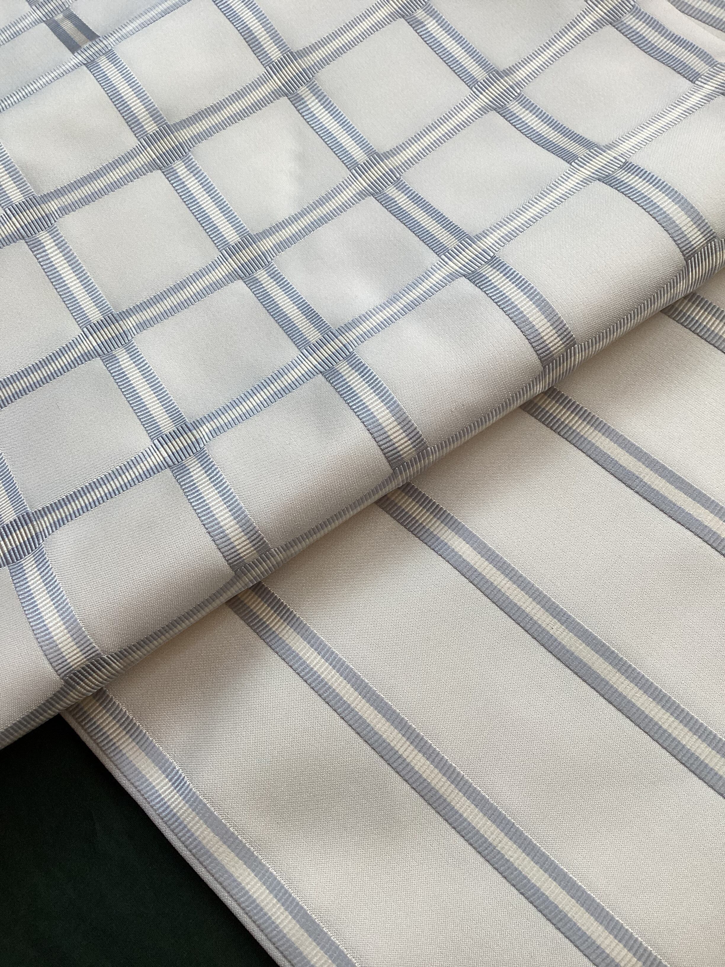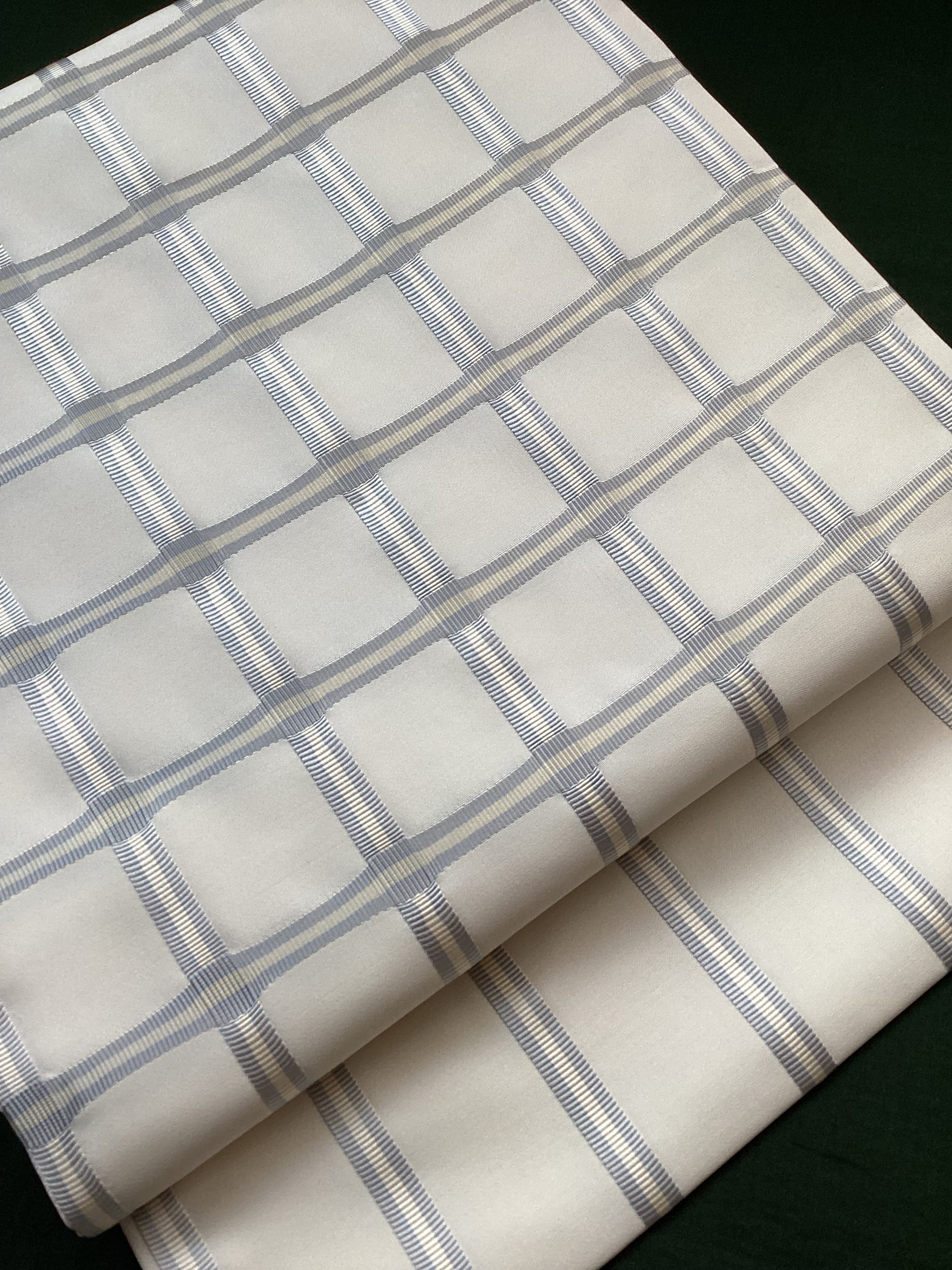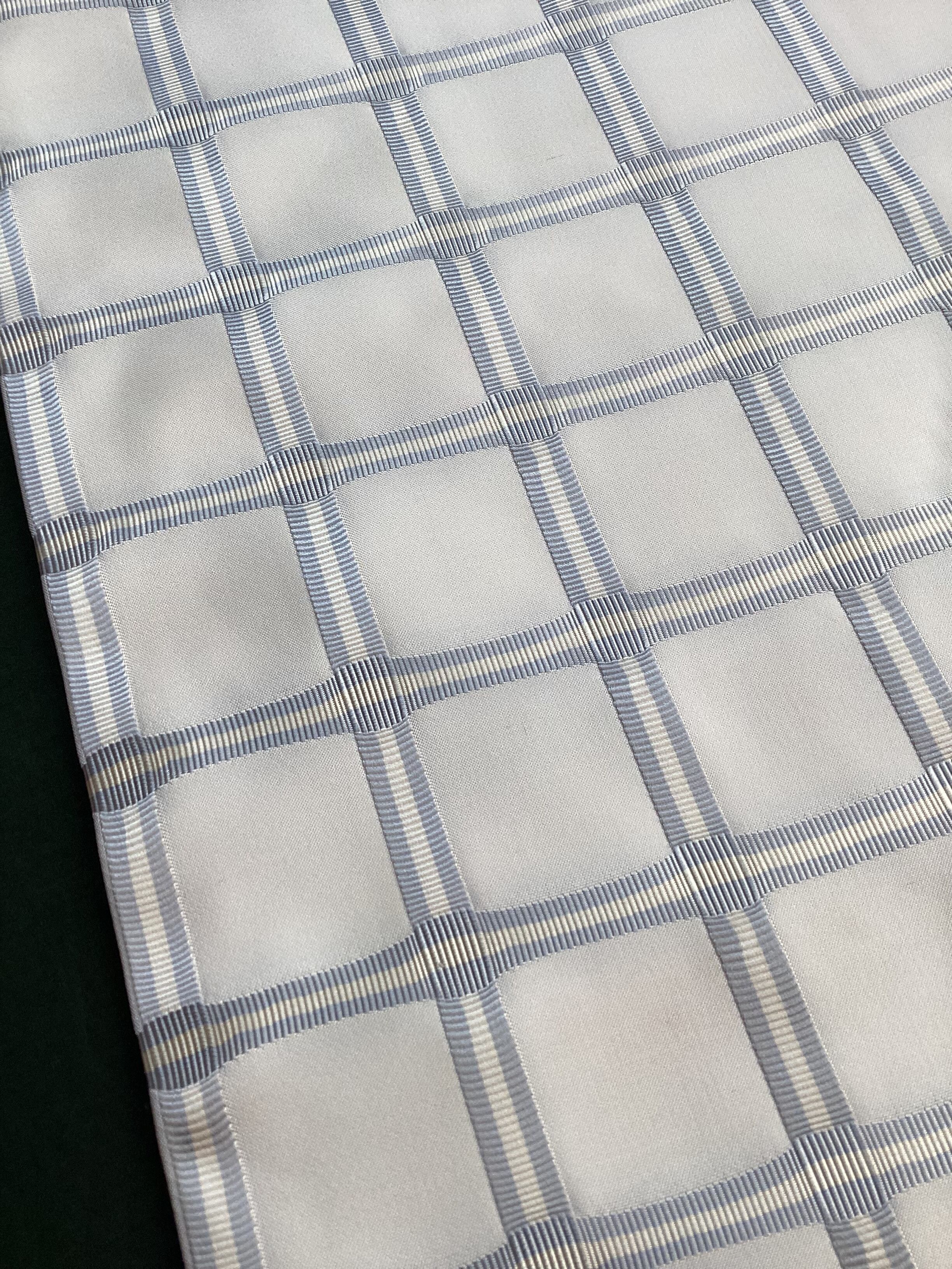 艶のあるしなやかで滑らかな乳白色の織地に銀鼠色とクリーム色の浮き織りで格子や間道文様が織り込まれた九寸なごや帯です。絹糸の持つ光沢感が美しい織地で上質で上品さがございます。柔らかものから紬までパステル調からモノトーンまで幅広く合わせていただけます。また、附下や色無地や江戸小紋などをややカジュアルダウンして気軽なコーディネートにまとめたい時にいかがでしょうか。カジュアルな中にも上品さを添えてくれます。白地で爽やかに、お柄の立ったおきものにもコーディネートしやすい九寸帯です。