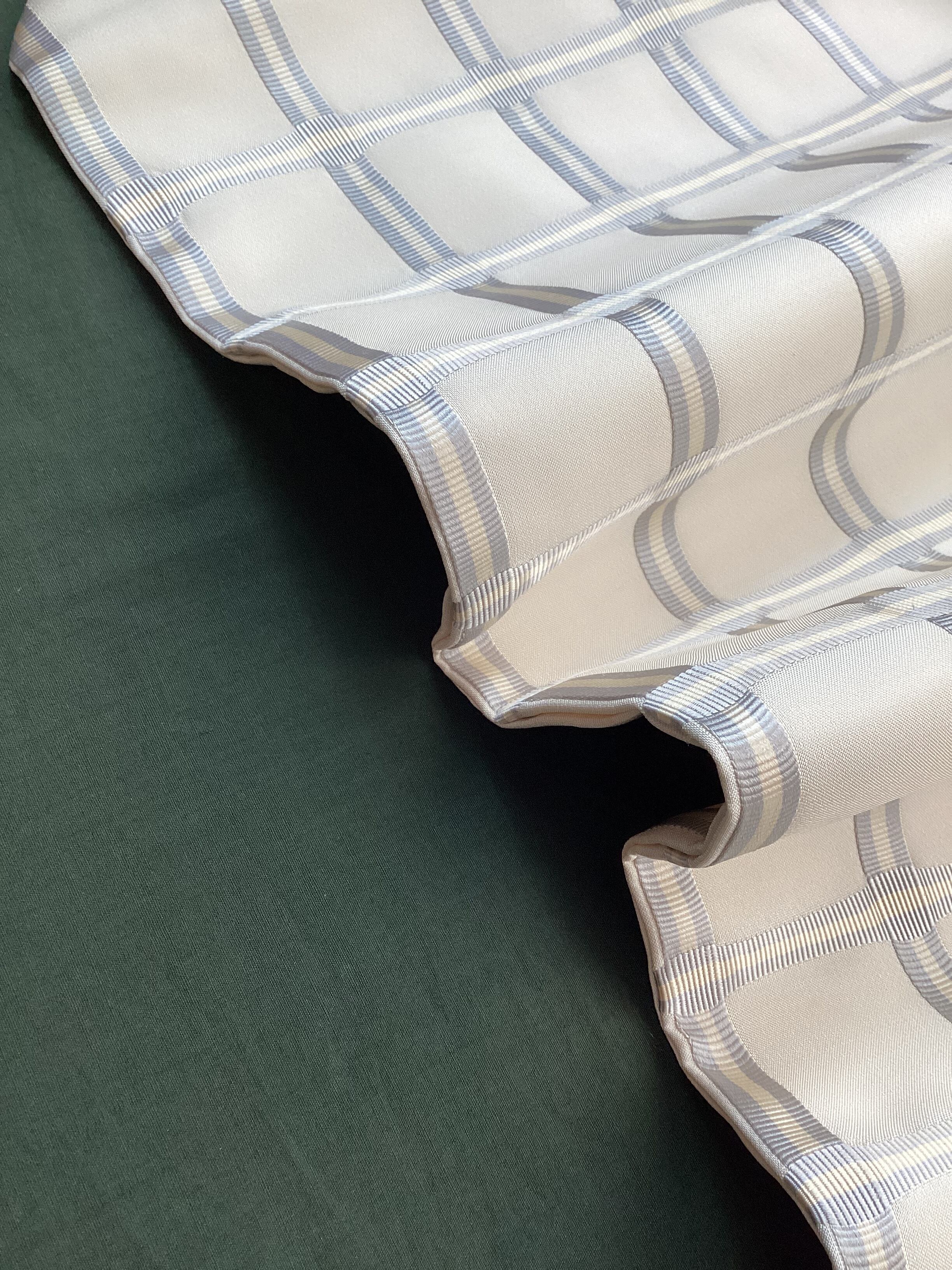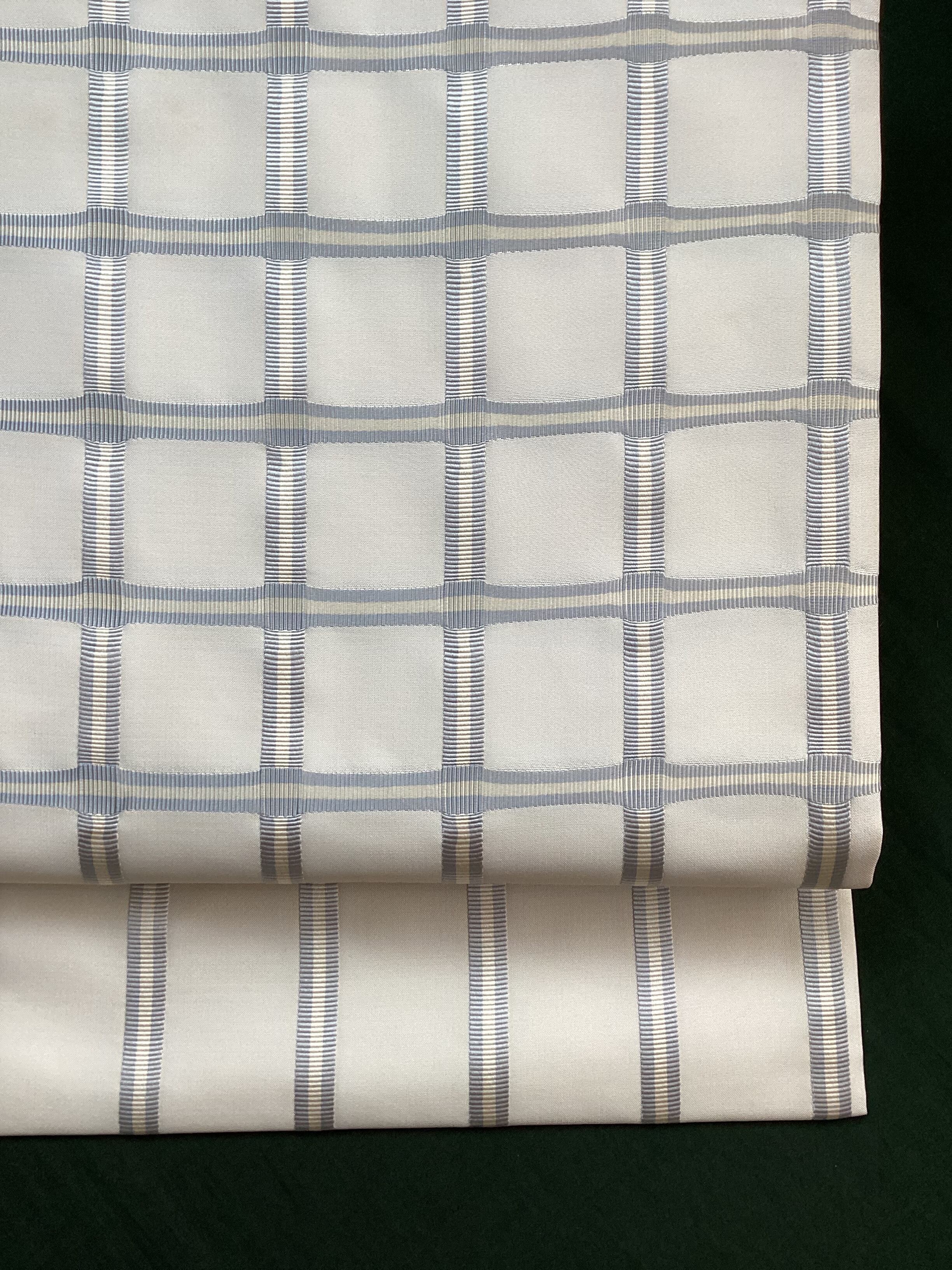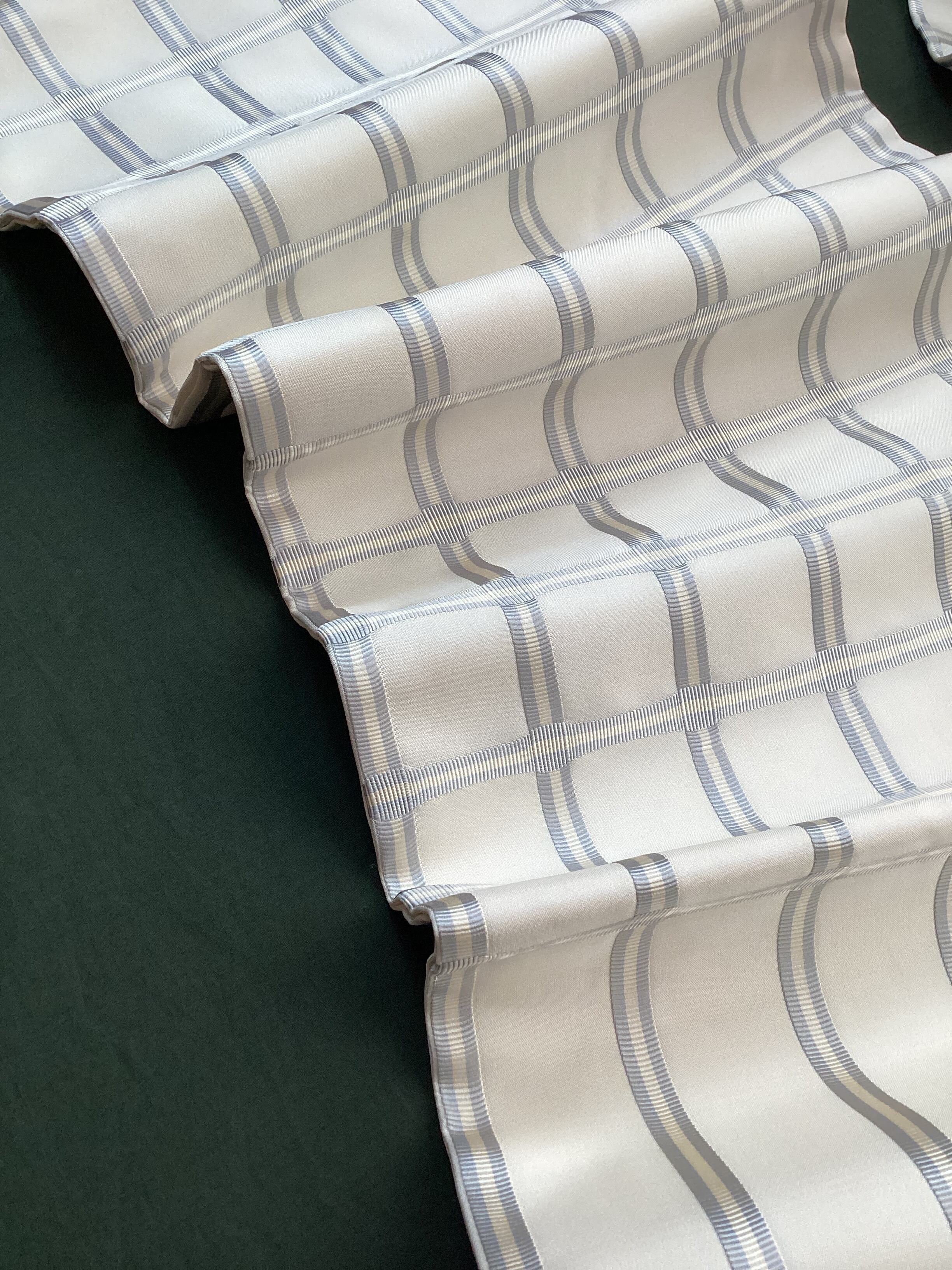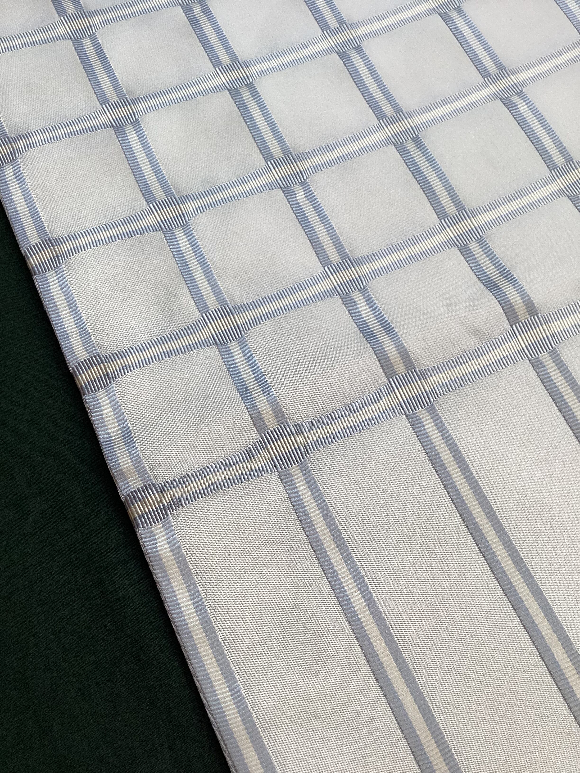 艶のあるしなやかで滑らかな乳白色の織地に銀鼠色とクリーム色の浮き織りで格子や間道文様が織り込まれた九寸なごや帯です。絹糸の持つ光沢感が美しい織地で上質で上品さがございます。柔らかものから紬までパステル調からモノトーンまで幅広く合わせていただけます。また、附下や色無地や江戸小紋などをややカジュアルダウンして気軽なコーディネートにまとめたい時にいかがでしょうか。カジュアルな中にも上品さを添えてくれます。白地で爽やかに、お柄の立ったおきものにもコーディネートしやすい九寸帯です。