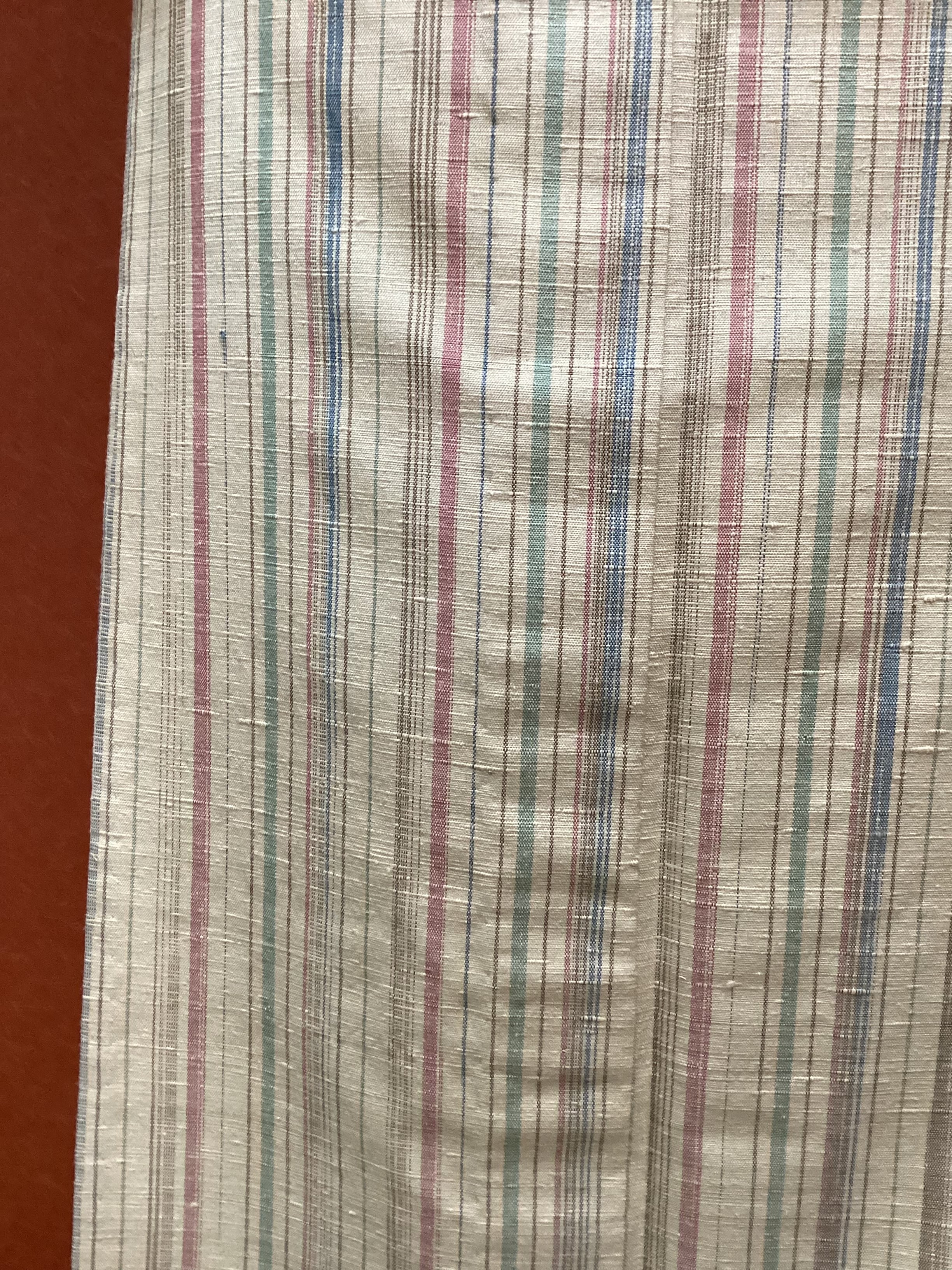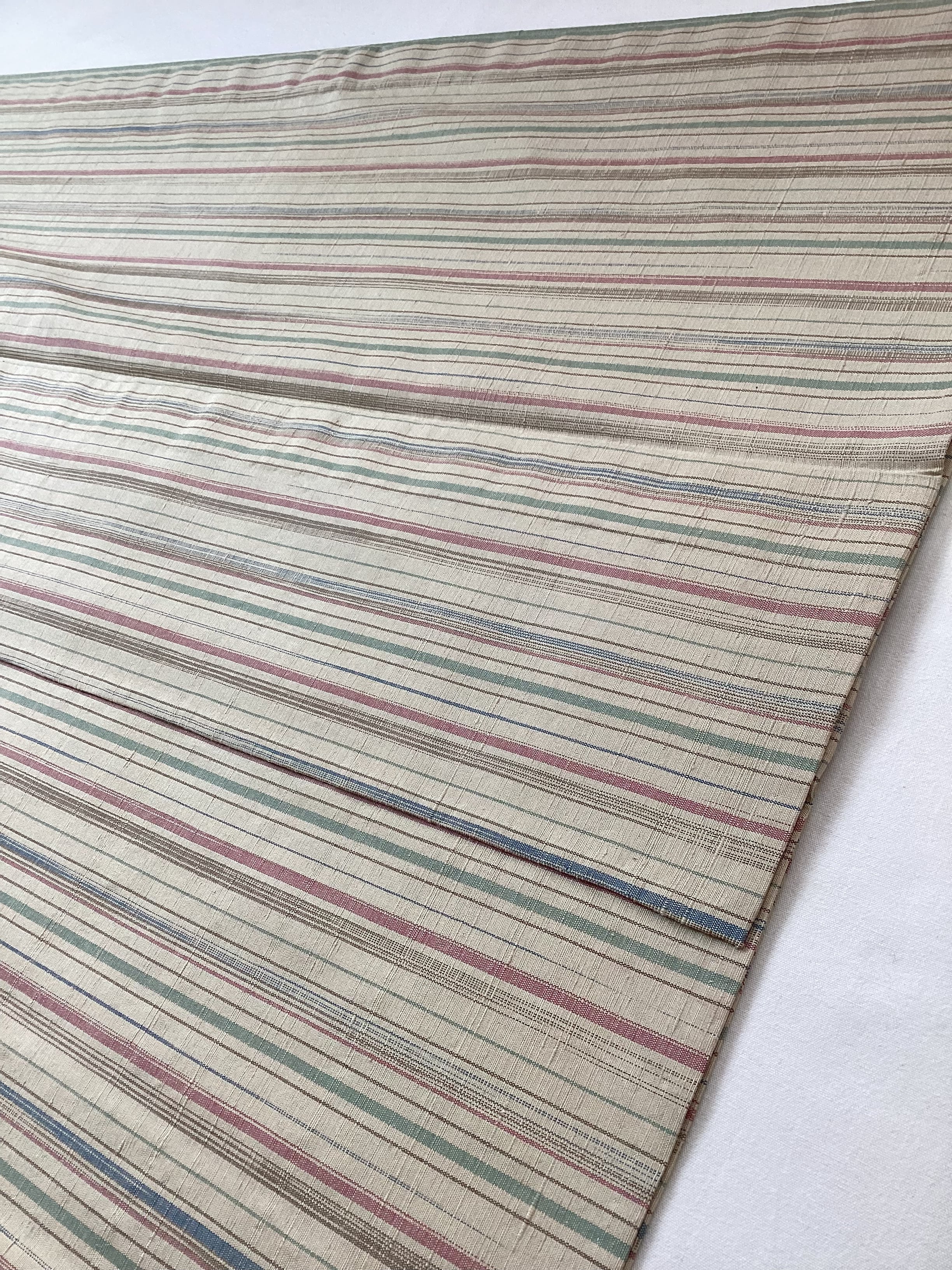 信州紬は、草木で染める手紡ぎ糸が織りなす温かで渋い光沢が魅力の織物です。こちらのおきものも自然が生み出す優しいカラーで縦縞文様が織り出されており、ほっこりとした風合いが魅力の単衣の紬です。秋の始めに手仕事が生み出す紬を纏ってお出掛けしませんか?