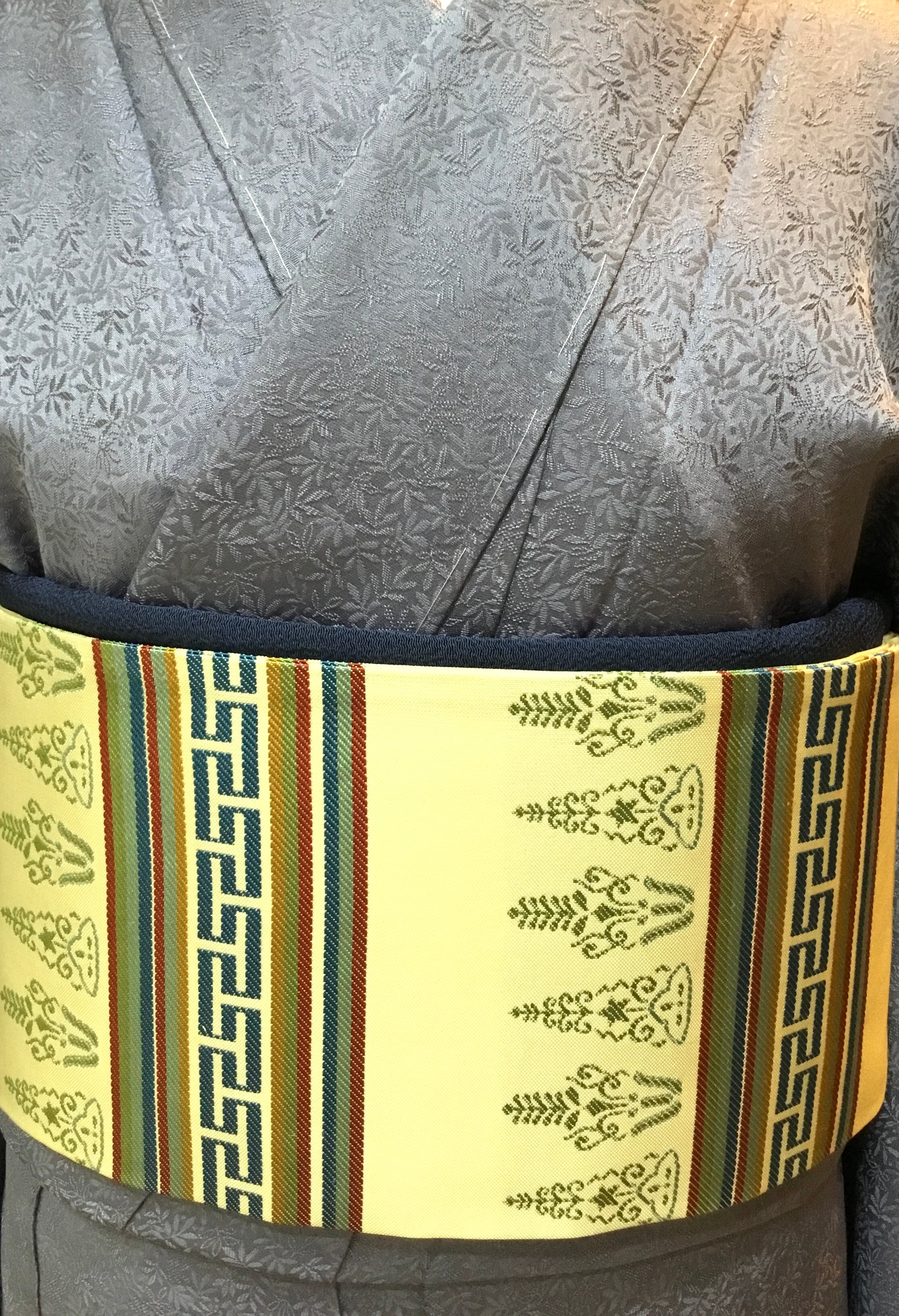 クリーム色地段にモダンな花が並んだ織の九寸なごや帯です。