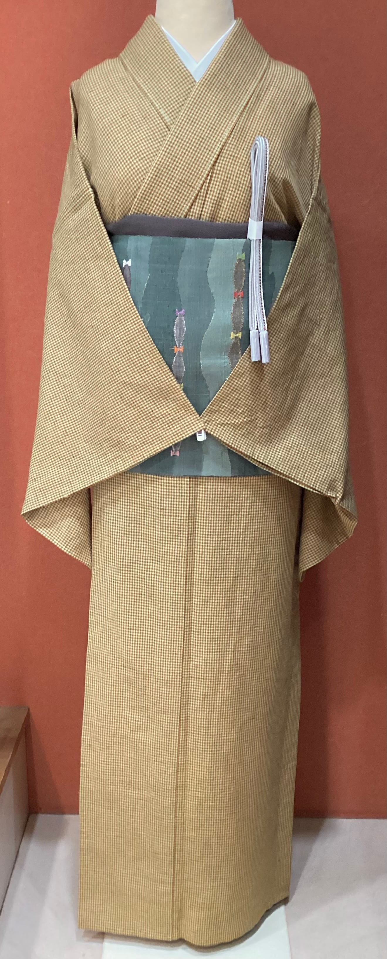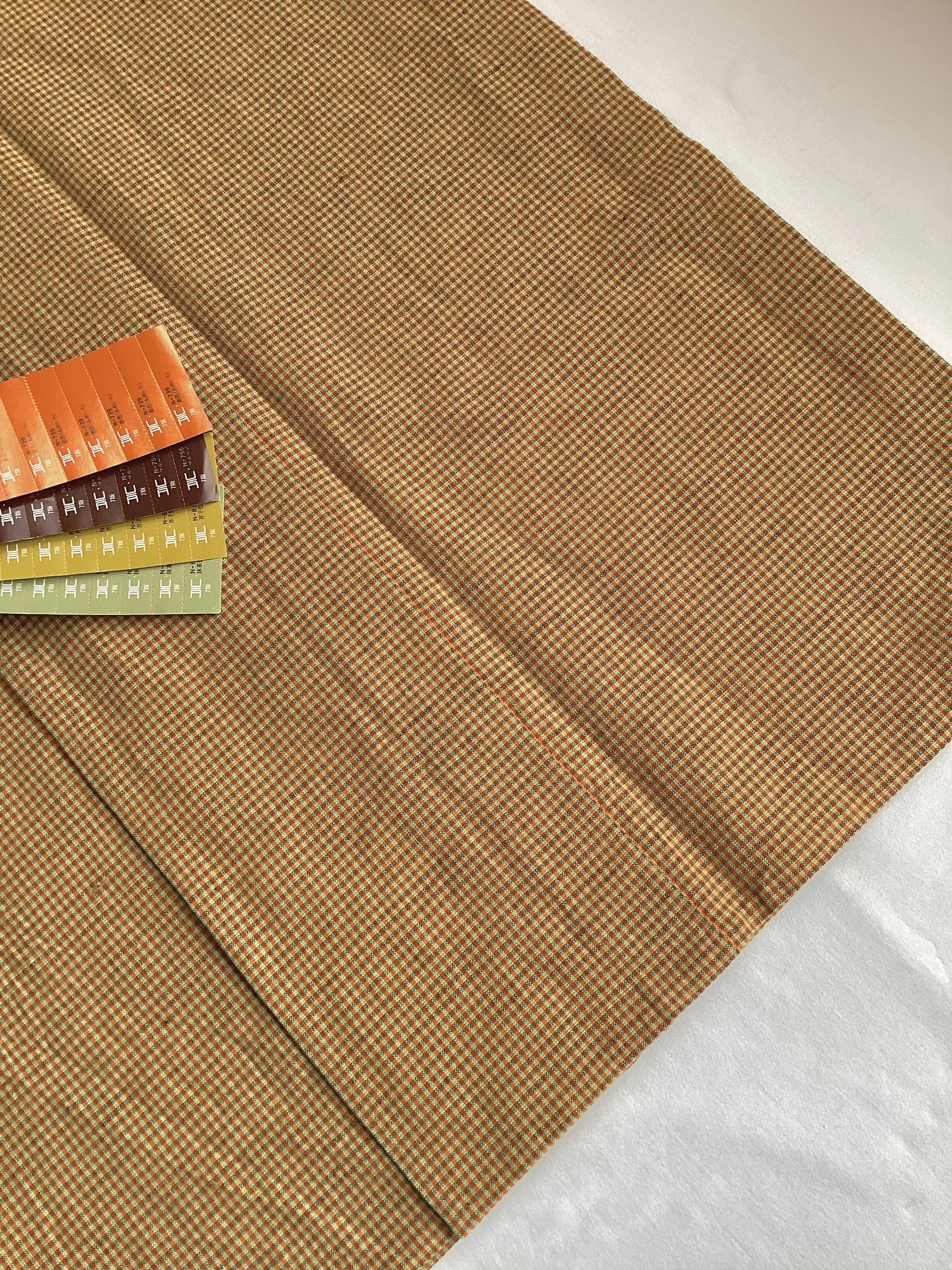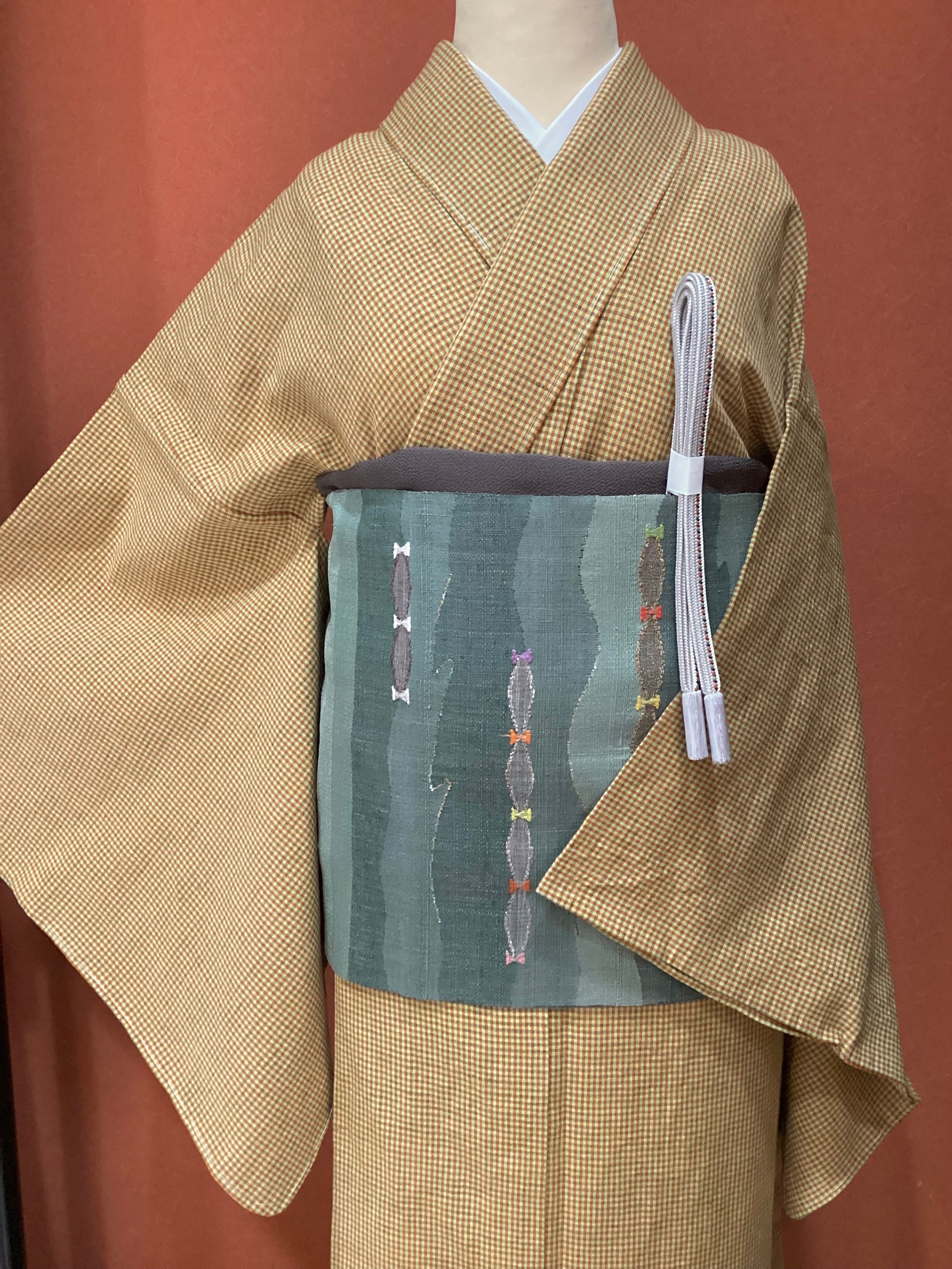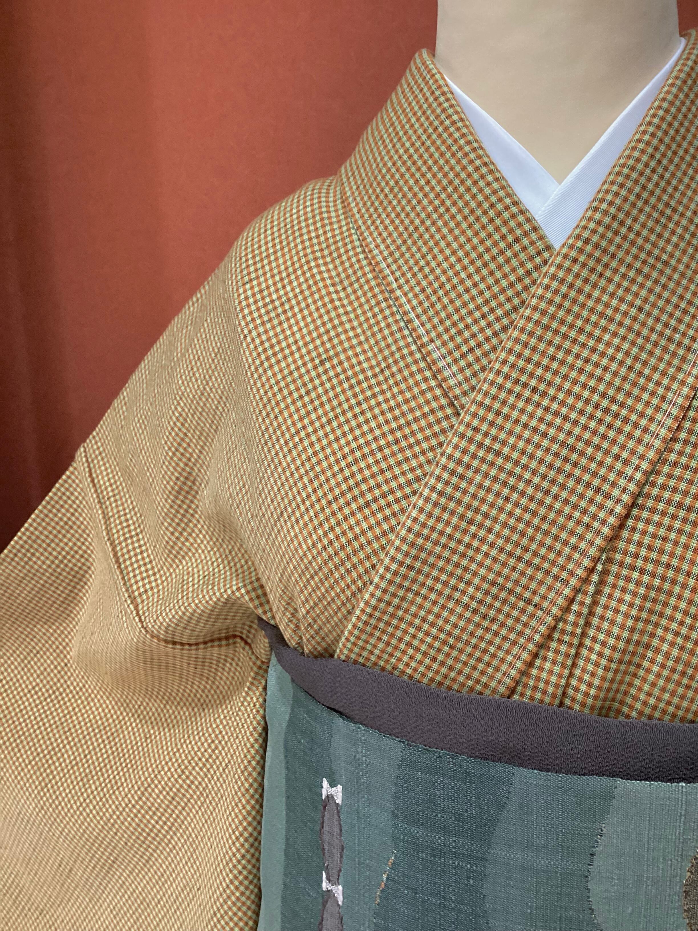 黄茶色微塵格子文綿麻きもの(新品お仕立て上がり)260312-1