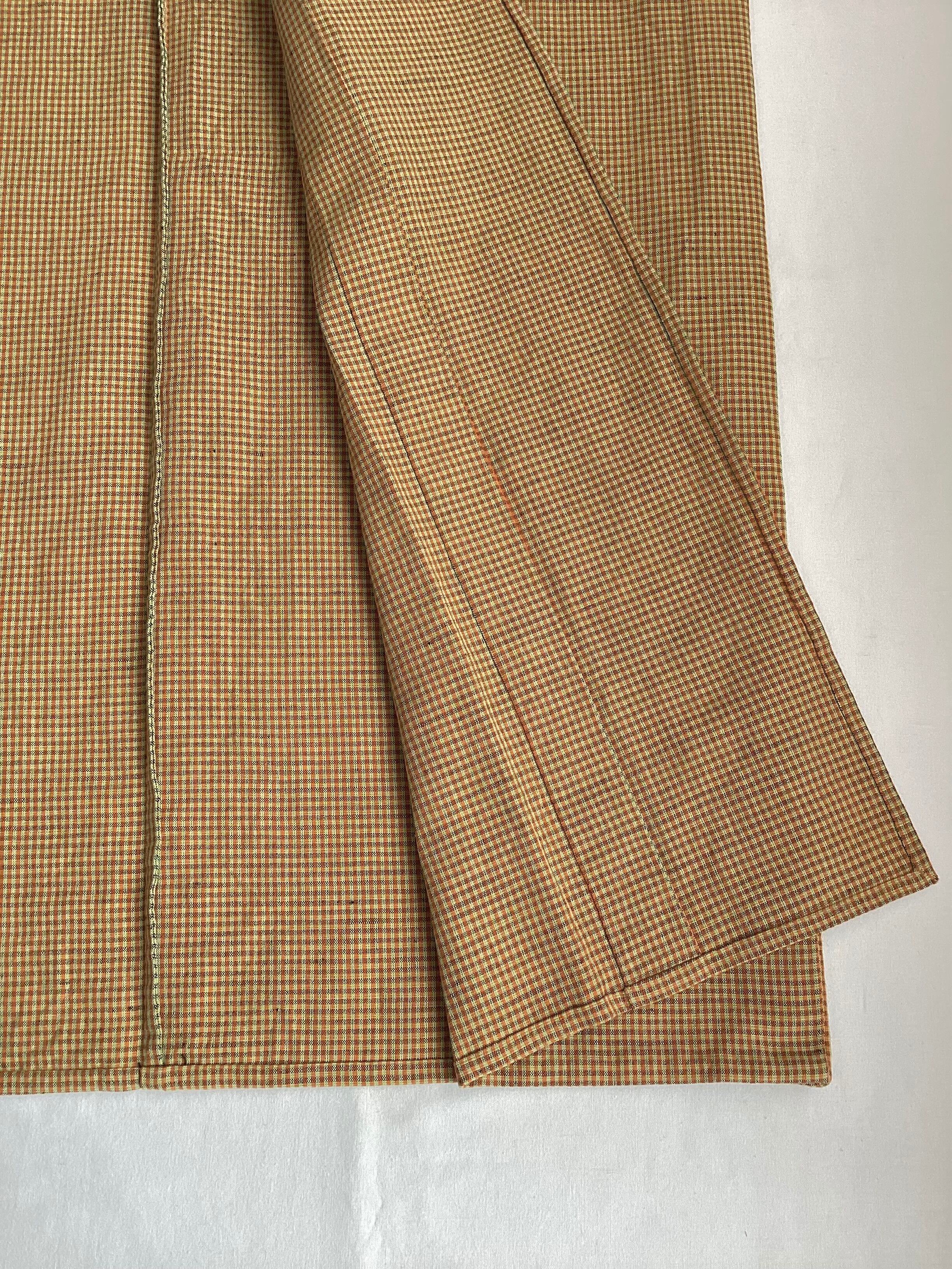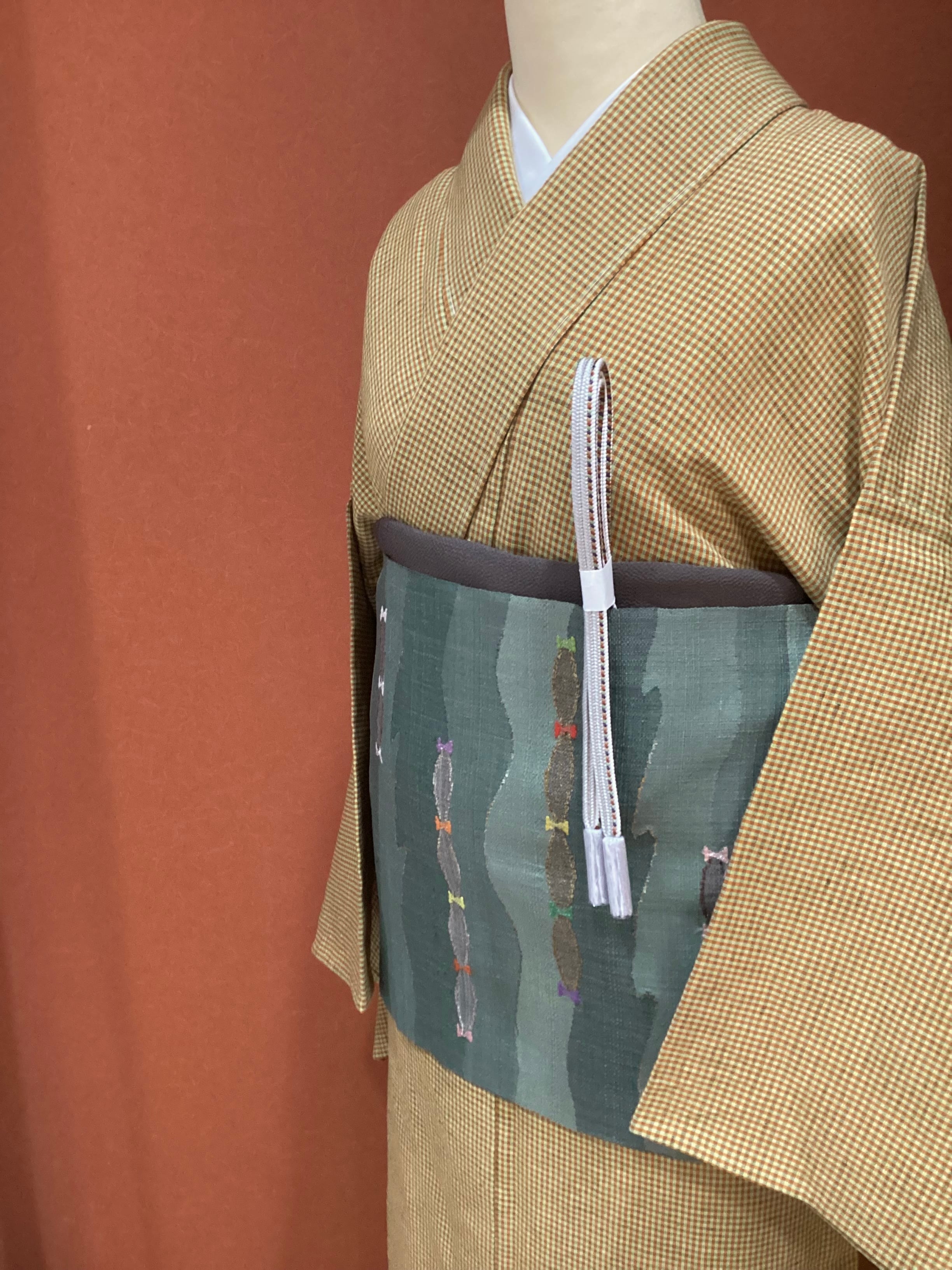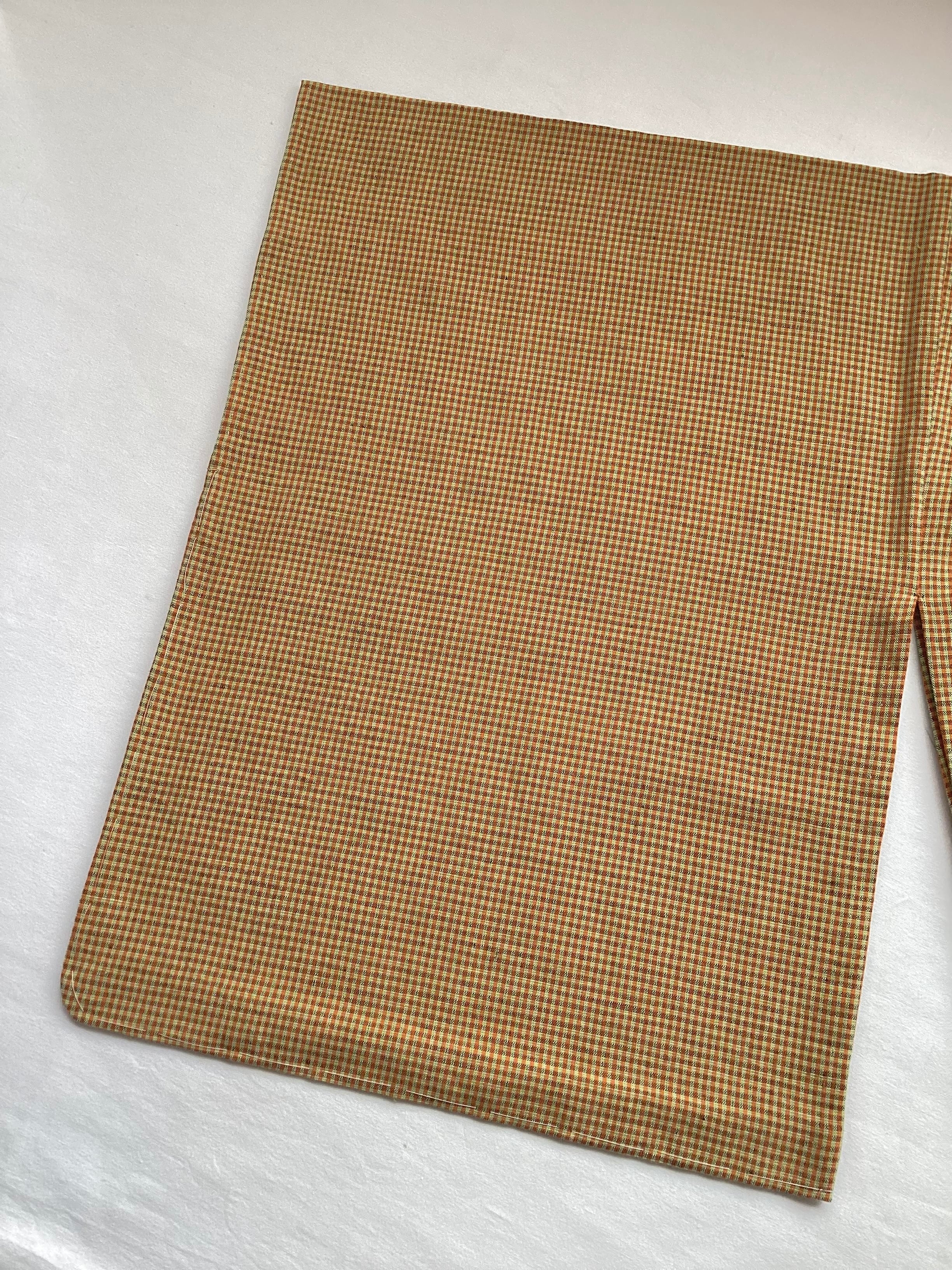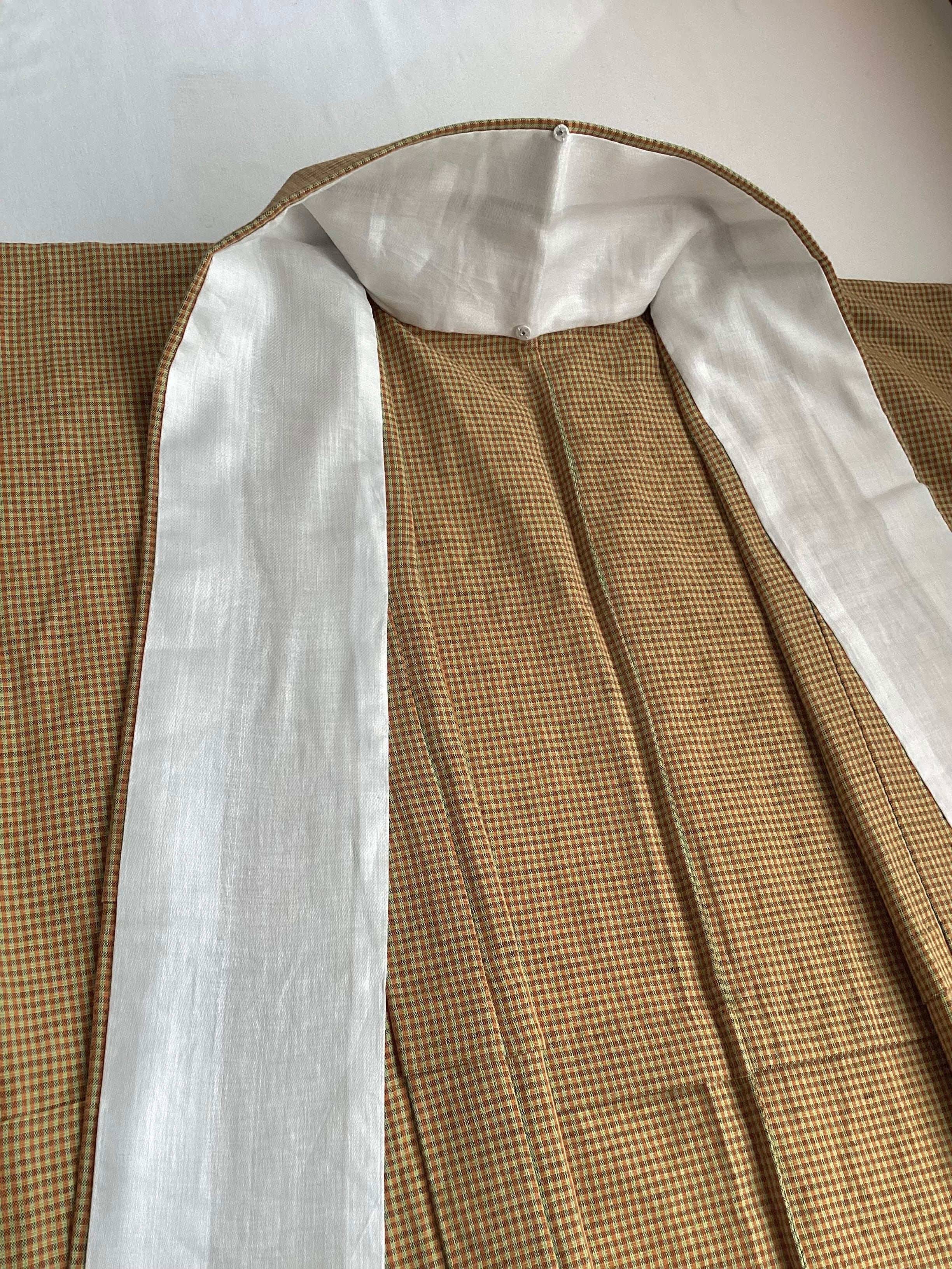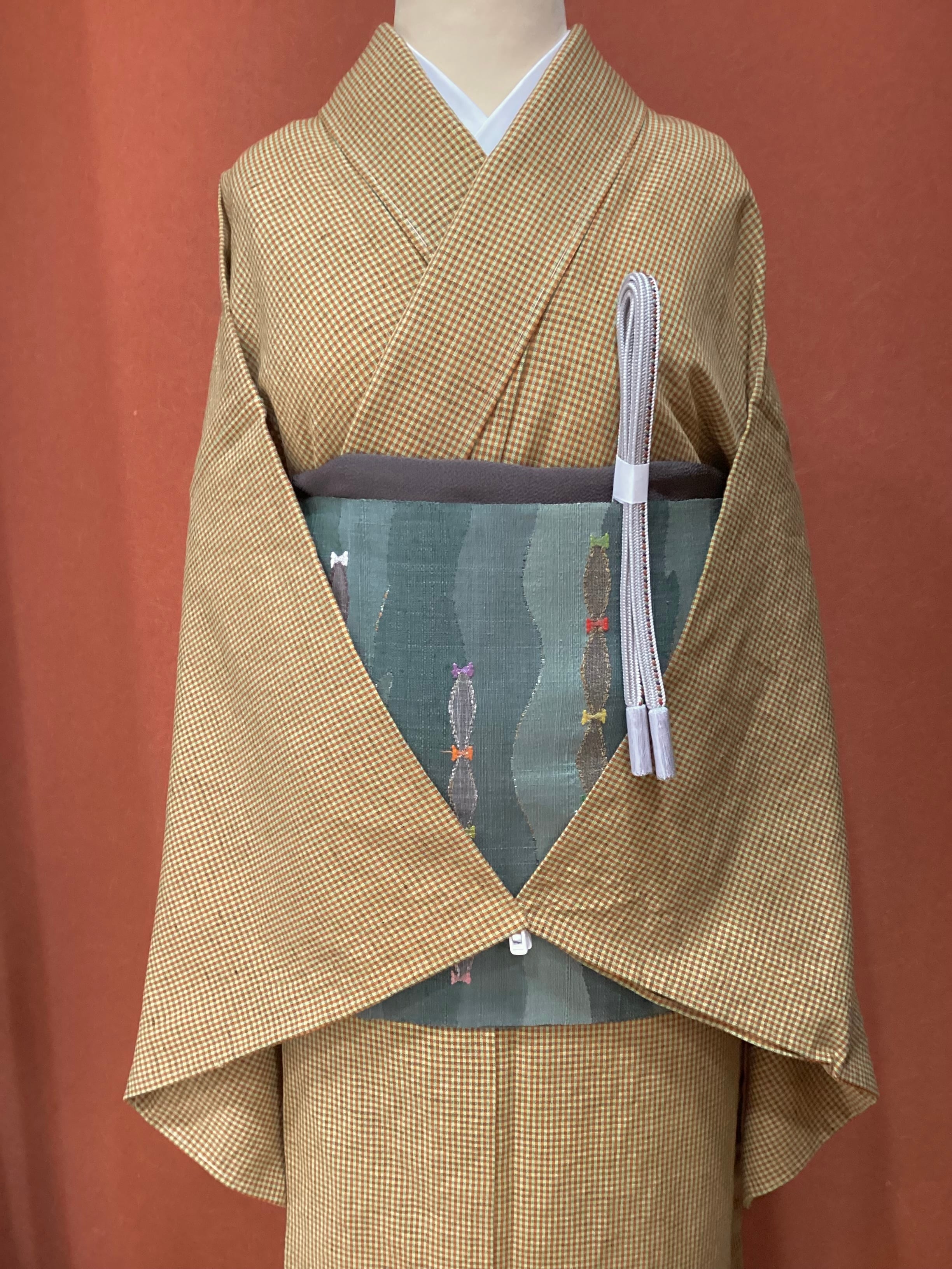 黄茶色微塵格子文綿麻きもの(新品お仕立て上がり)260312-1