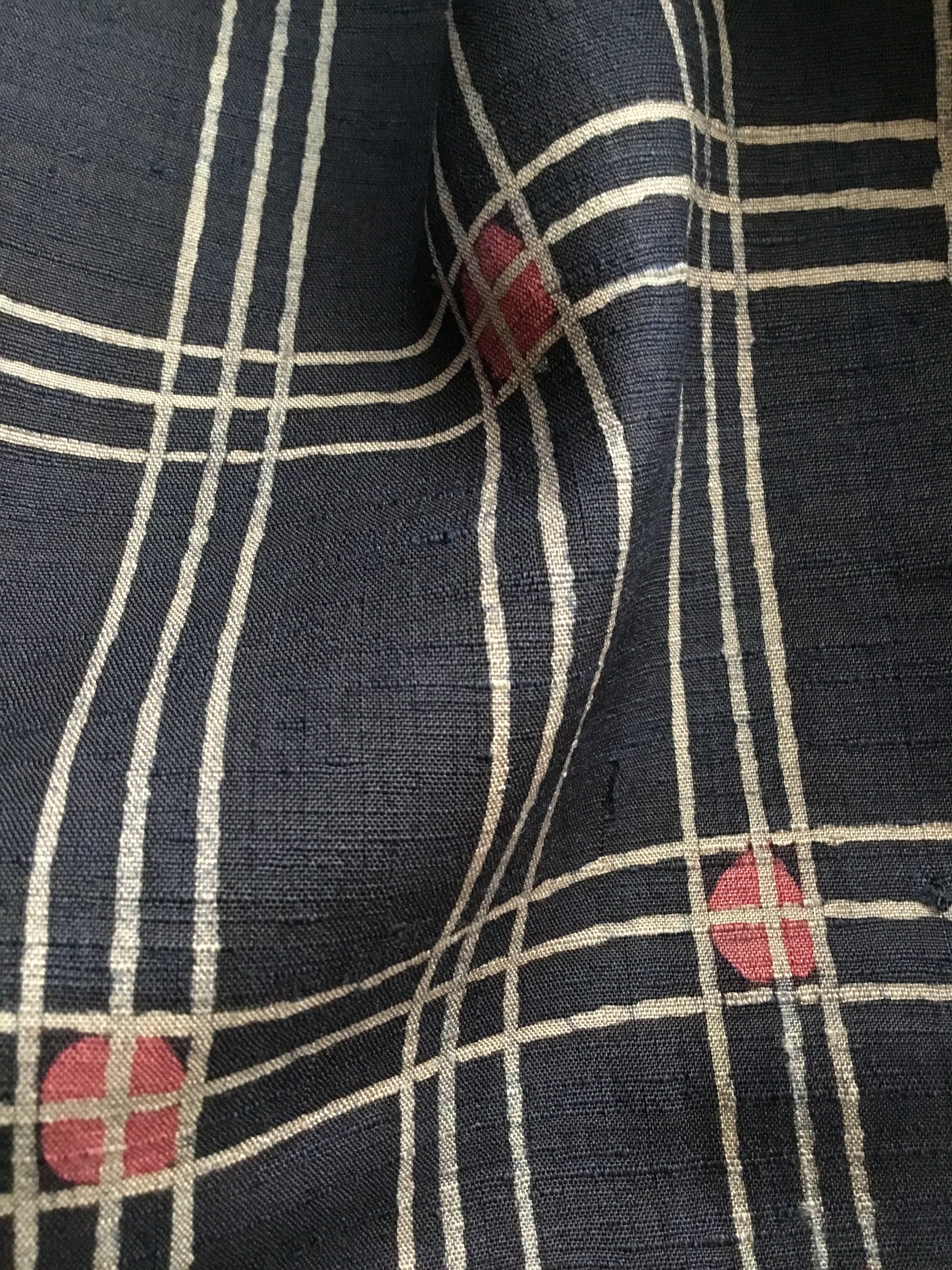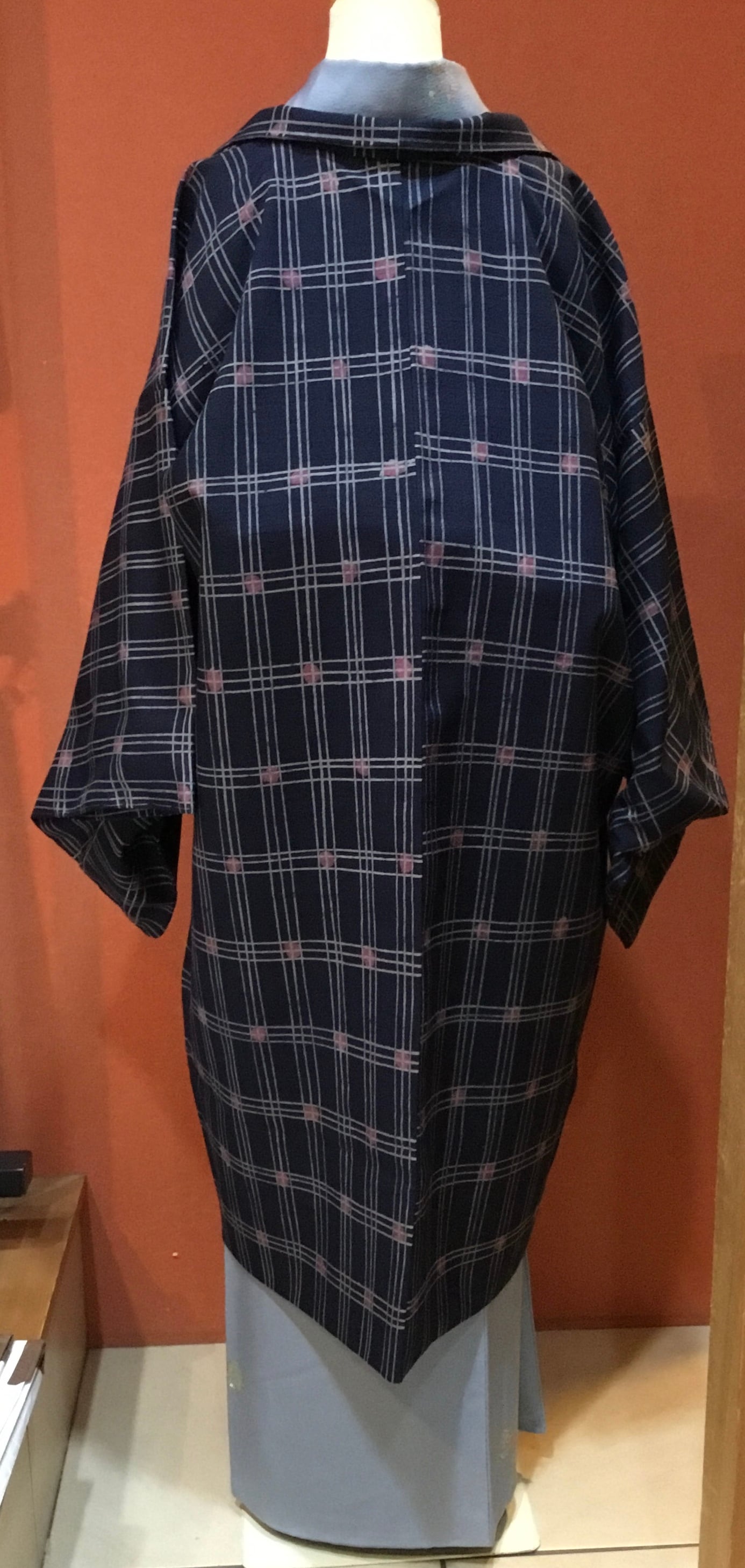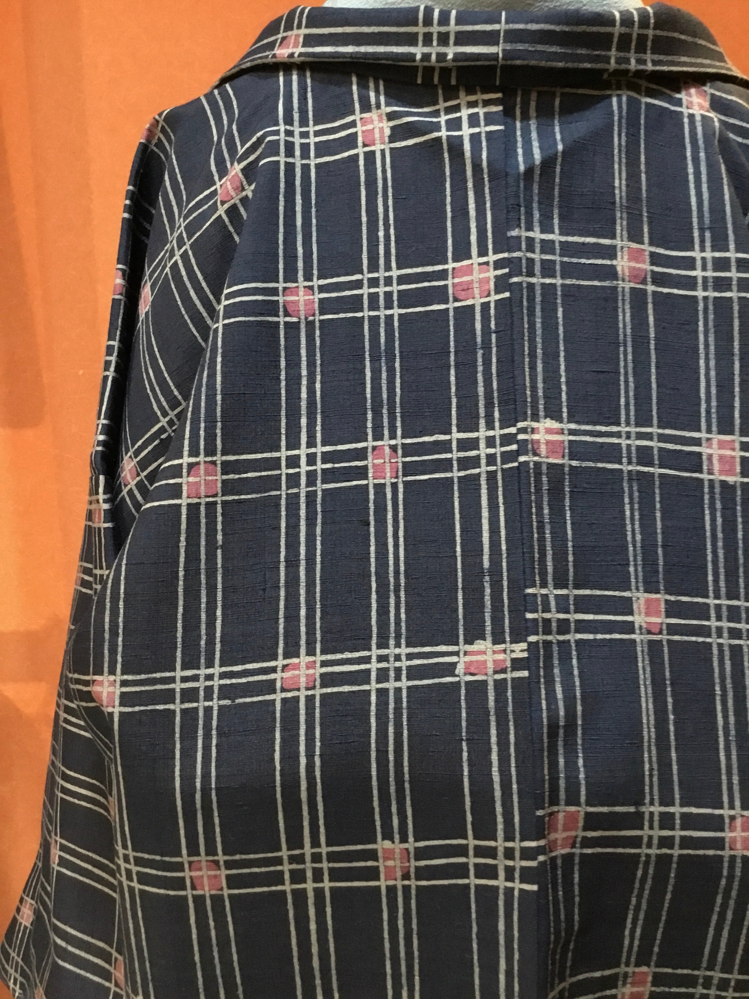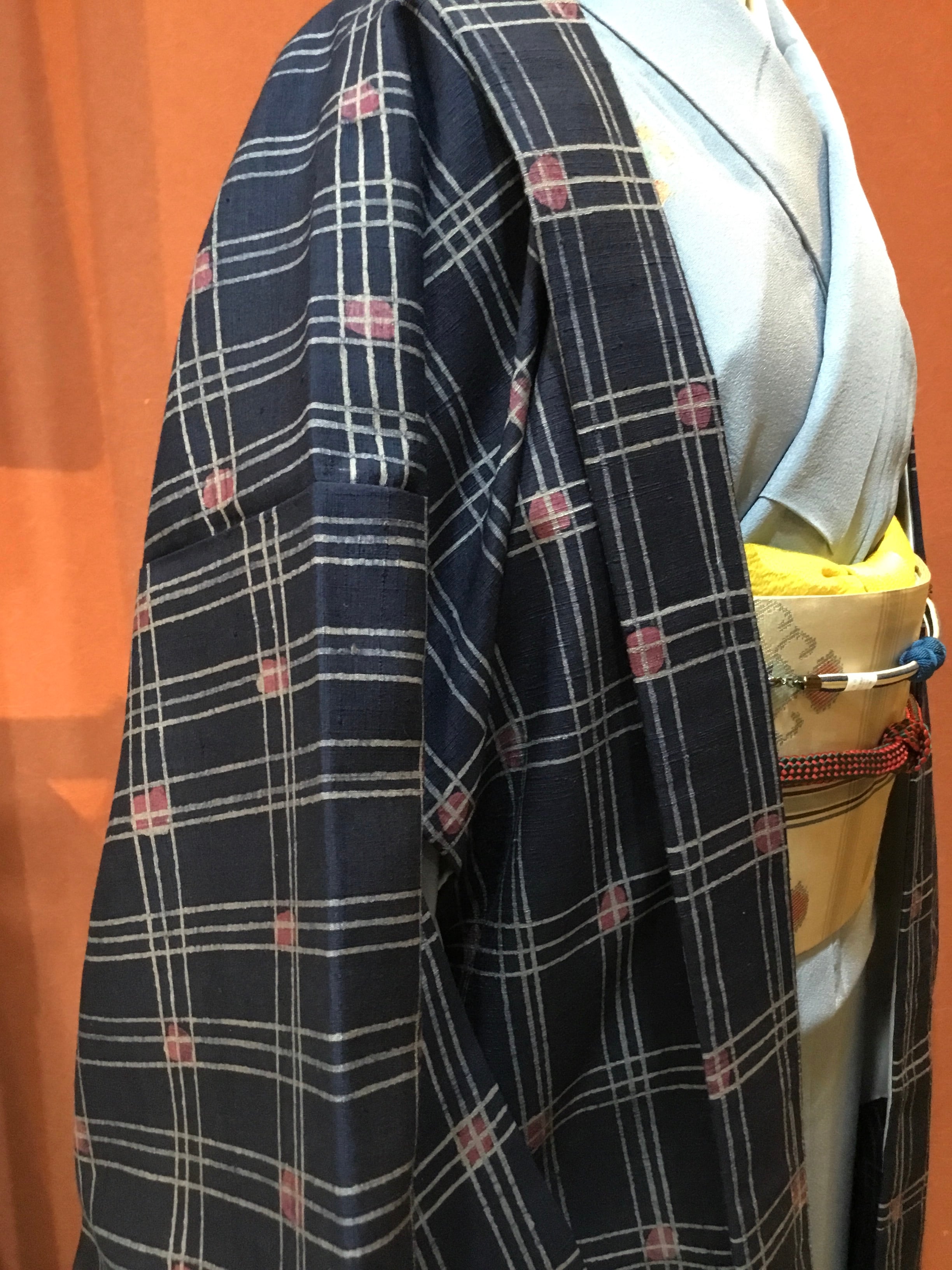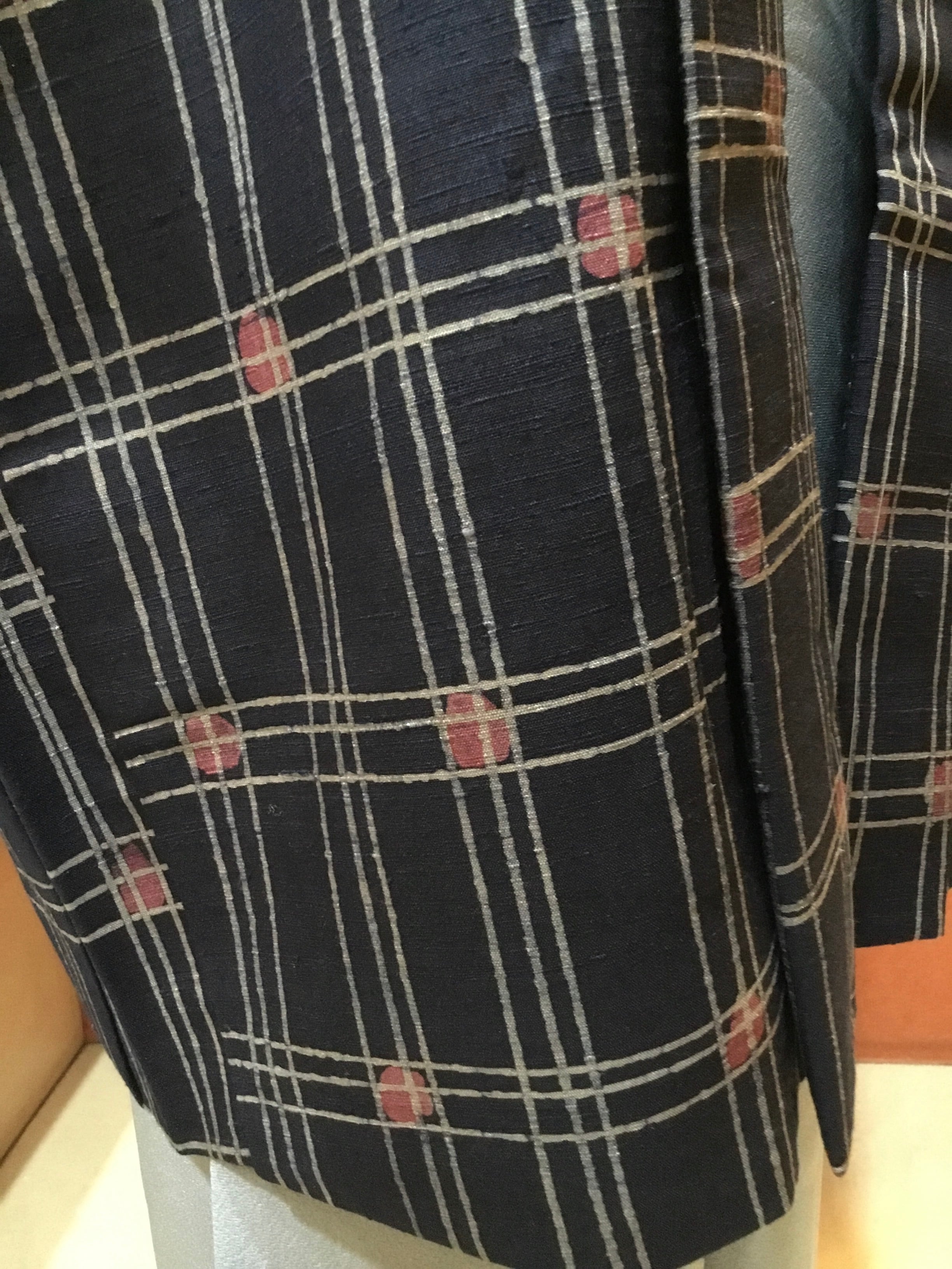 手描きの味わいのある格子に梅紫色の丸文を組み合わせた染紬の羽織です。状態の良い着物地を当店にて羽織にお仕立て替えをしたお品です。鉄紺地のサラリとした薄手の紬地は軽やかな風合い、合わせやすいお色目でカジュアルな装いの気軽な羽織モノとして活躍しそうです。